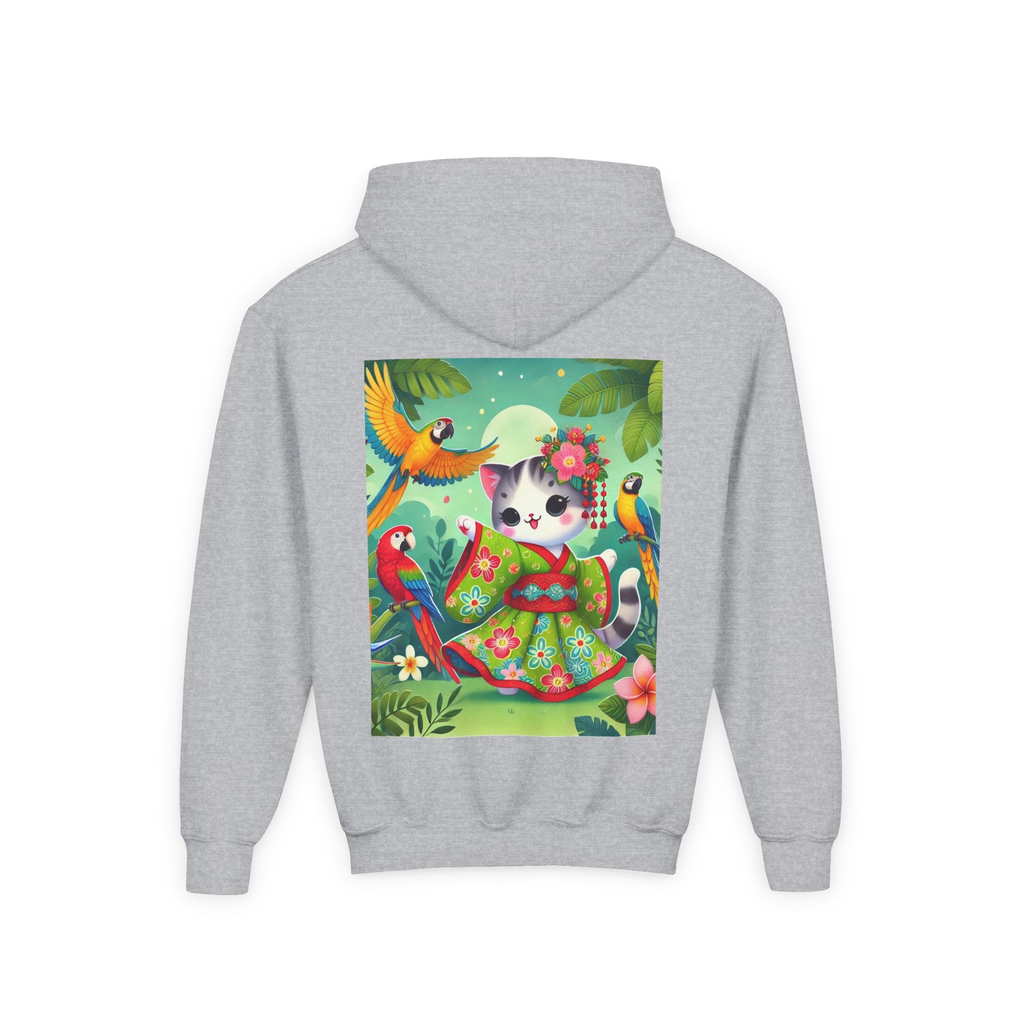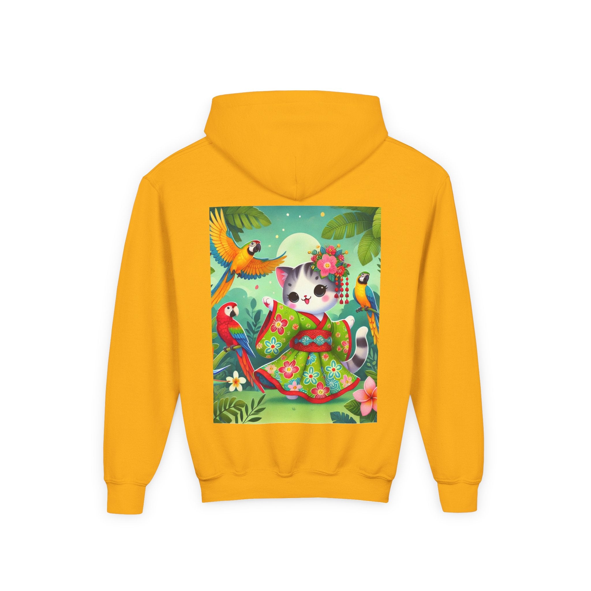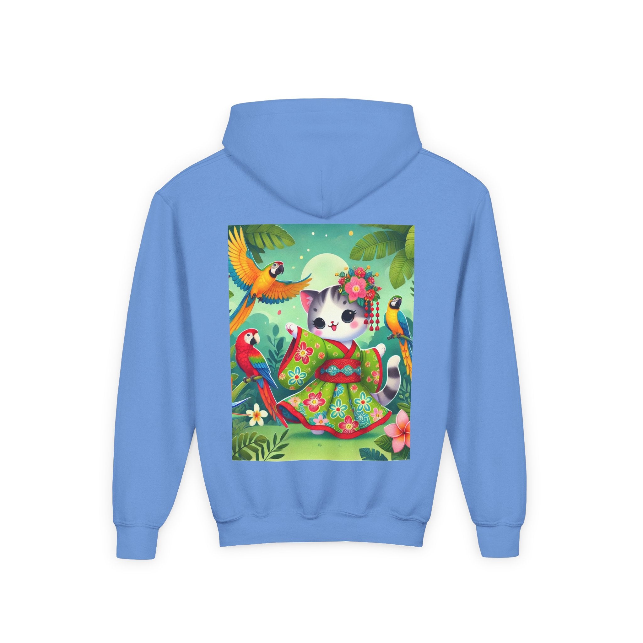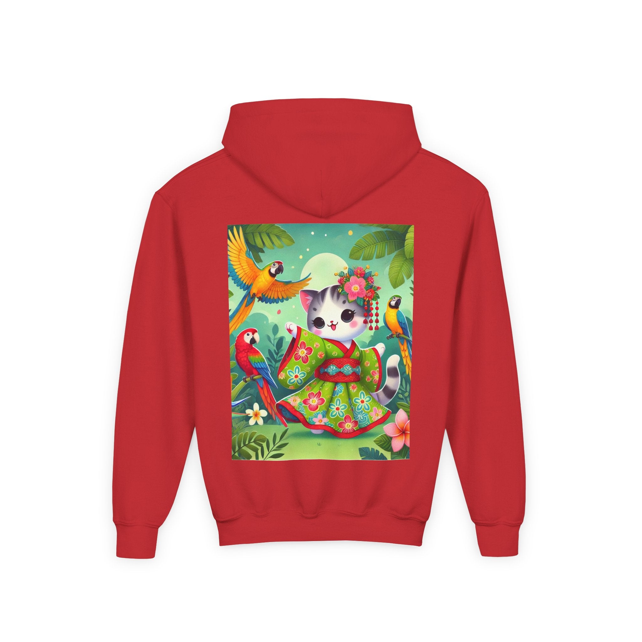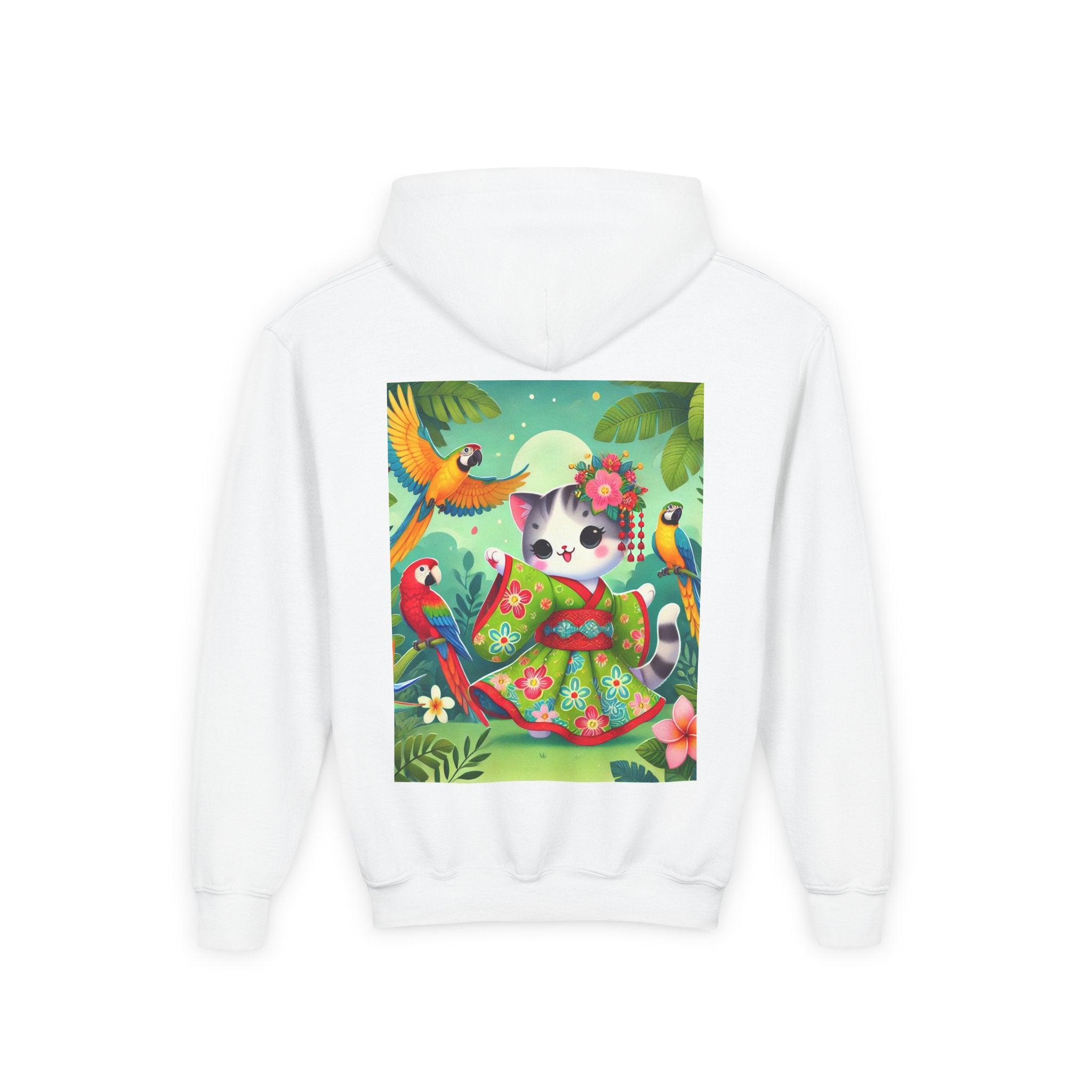 Parrot Dance of the Geisha Kitten Youth Heavy Blend Hooded Sweatshirt blends cozy comfort with vibrant, storybook charm. Made from ultra-soft, preshrunk fleece, this hoodie feels smooth and warm while minimizing lint buildup for lasting quality. The 50/50 cotton-polyester fabric ensures durability and softness, and thoughtful features like a roomy kangaroo pocket and twill-reinforced neck make it perfect for everyday wear. Please note: due to fabric properties, the White color variant may appear slightly off-white.