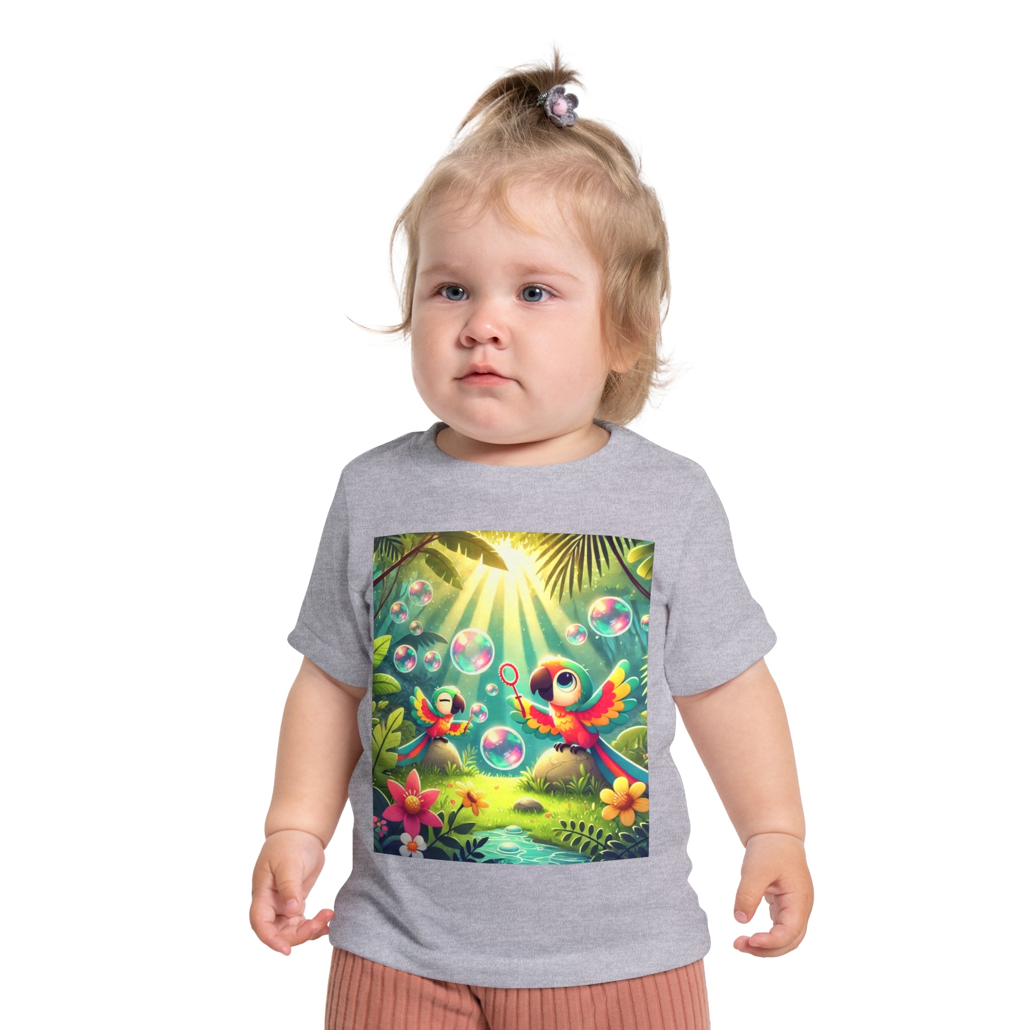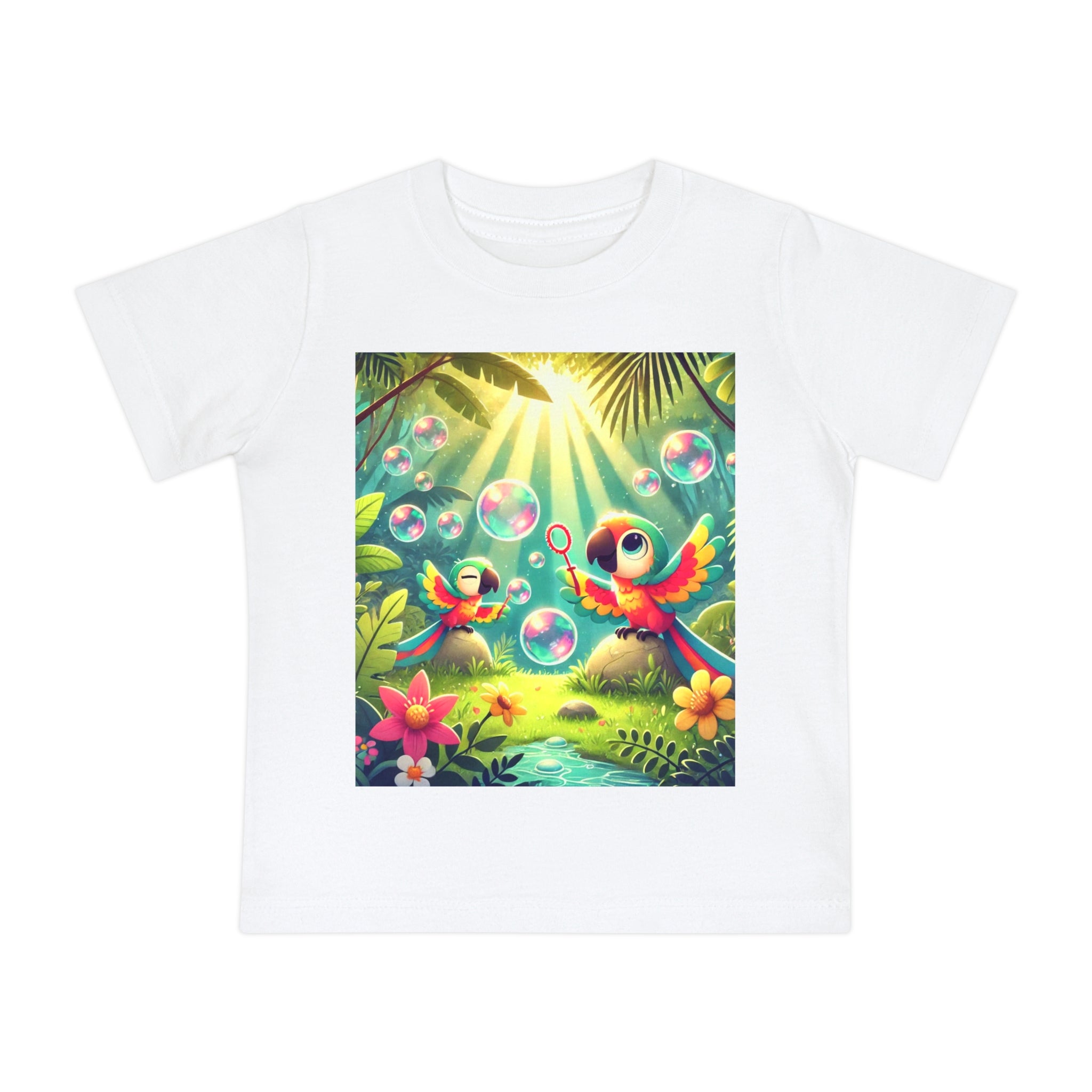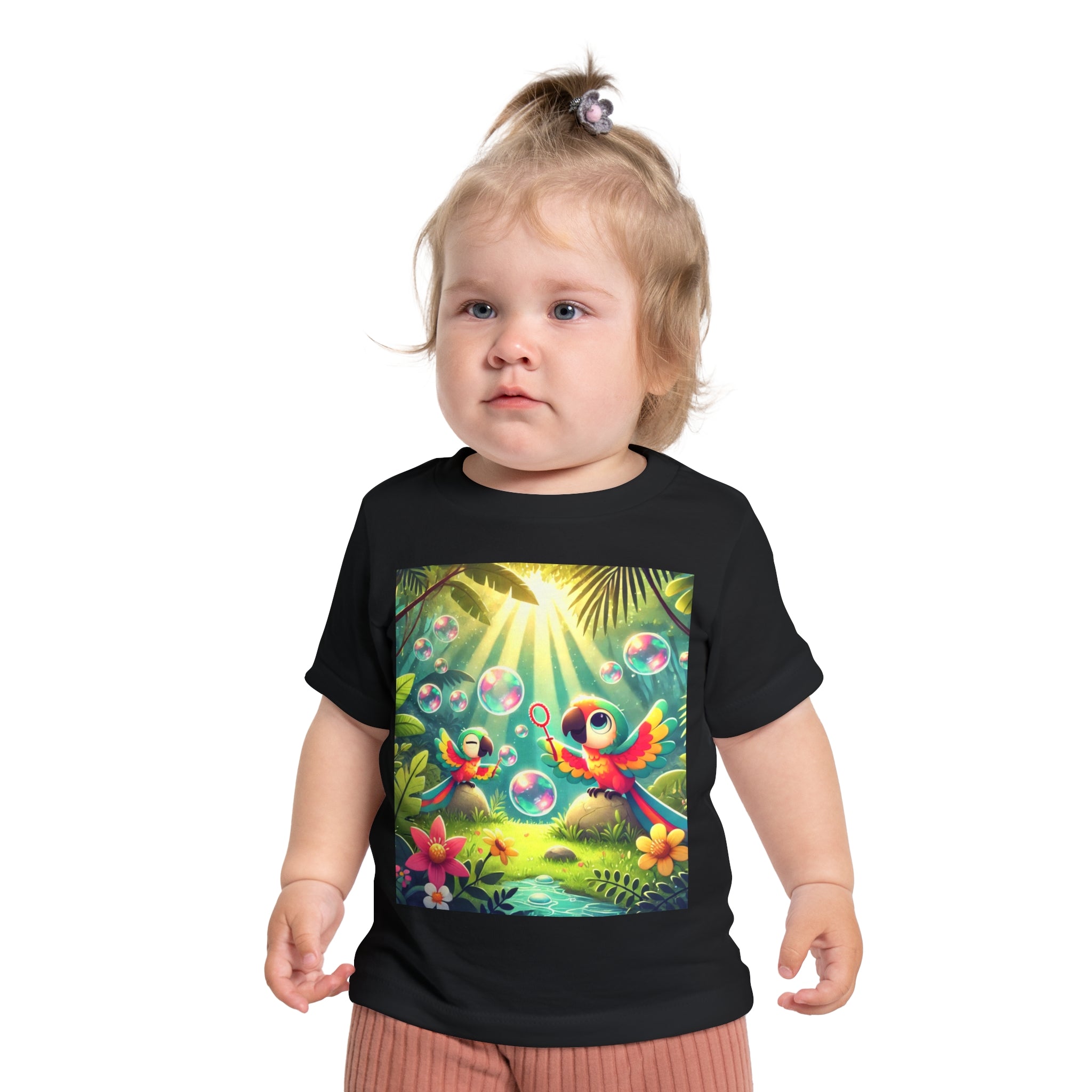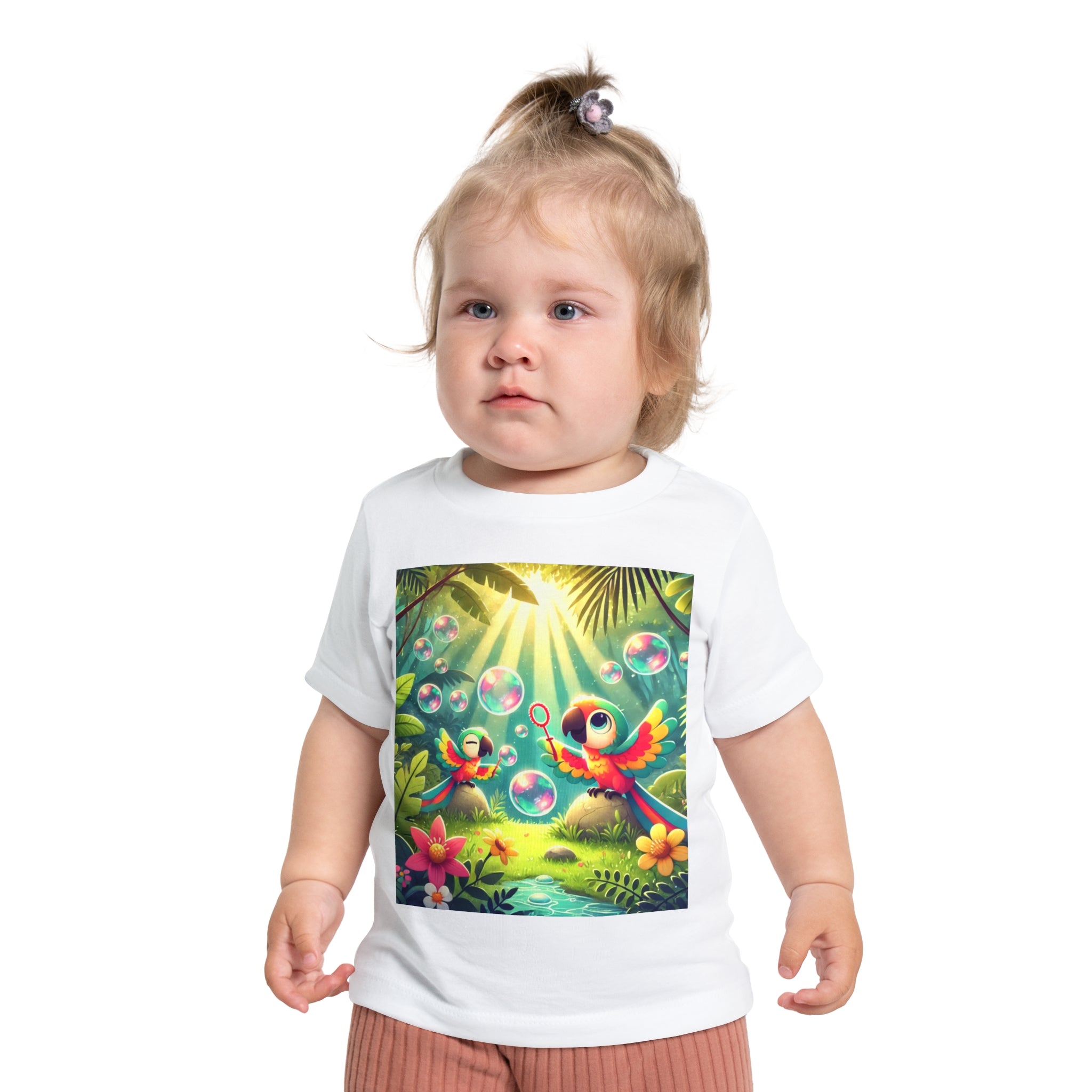 Parrots and Bubbles bursts with tropical color and playful energy, bringing a touch of paradise to your little one’s wardrobe. Beneath a golden canopy of sunlight filtering through lush jungle leaves, two cheerful parrots delight in blowing bubbles. Perched on smooth stones among bright tropical flowers, their feathers—shimmering in shades of scarlet, turquoise, emerald, and gold—glow brilliantly in the dappled light. Iridescent bubbles drift lazily upward, reflecting glimpses of the forest and sky, while a gentle stream winds through the background. Rendered in flat, storybook-style colors with radiant highlights and joyful detail, this charming artwork captures the innocence of play, the beauty of light, and the vivid life of the tropics.
