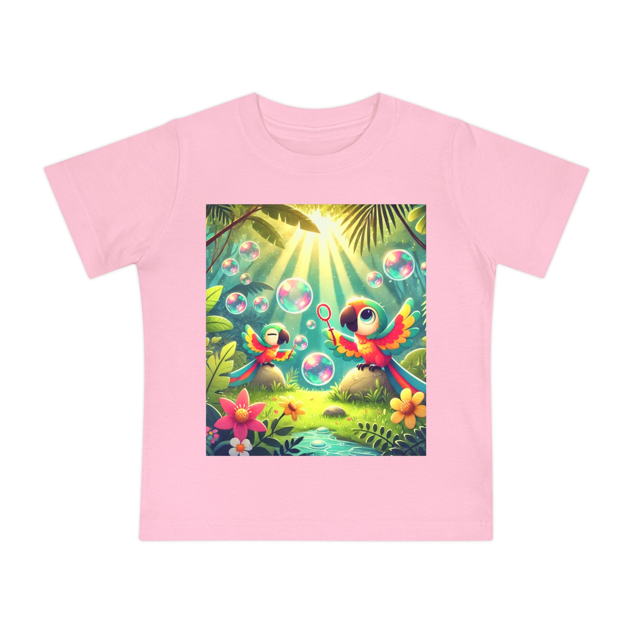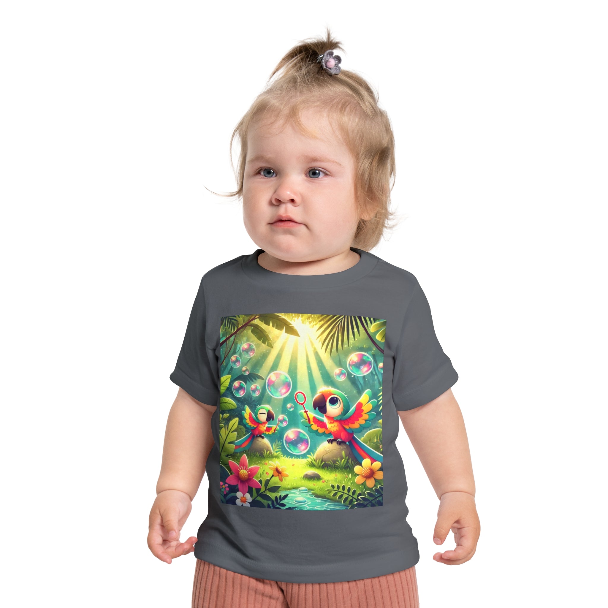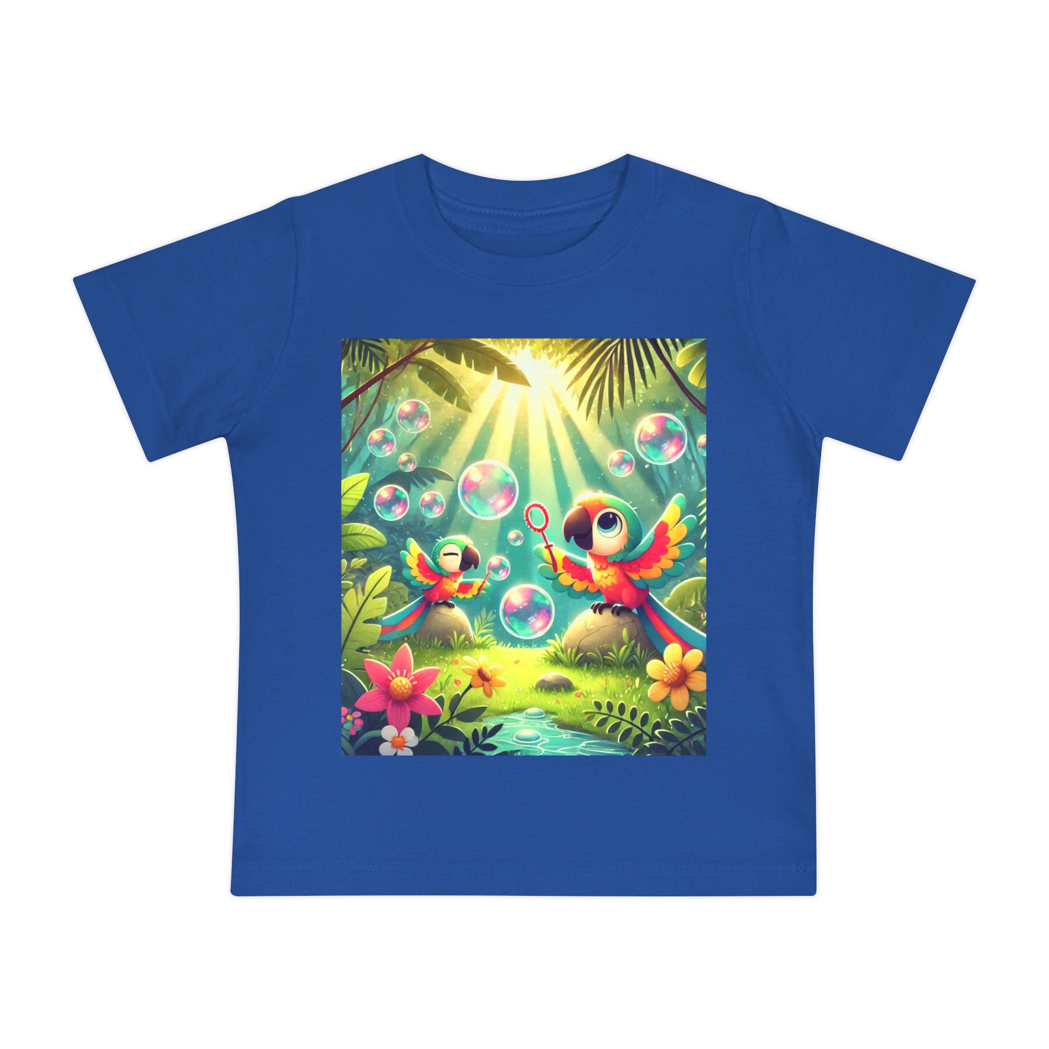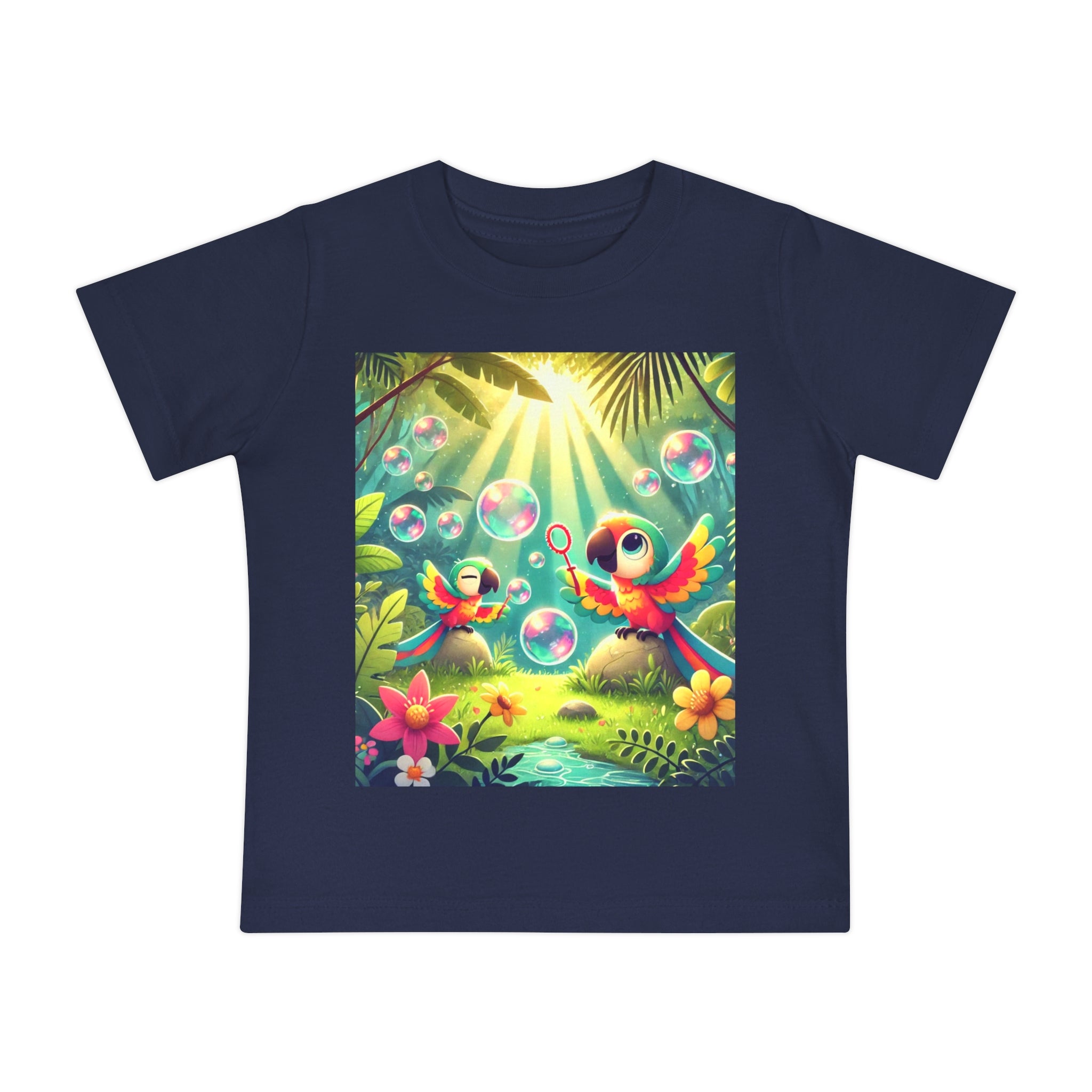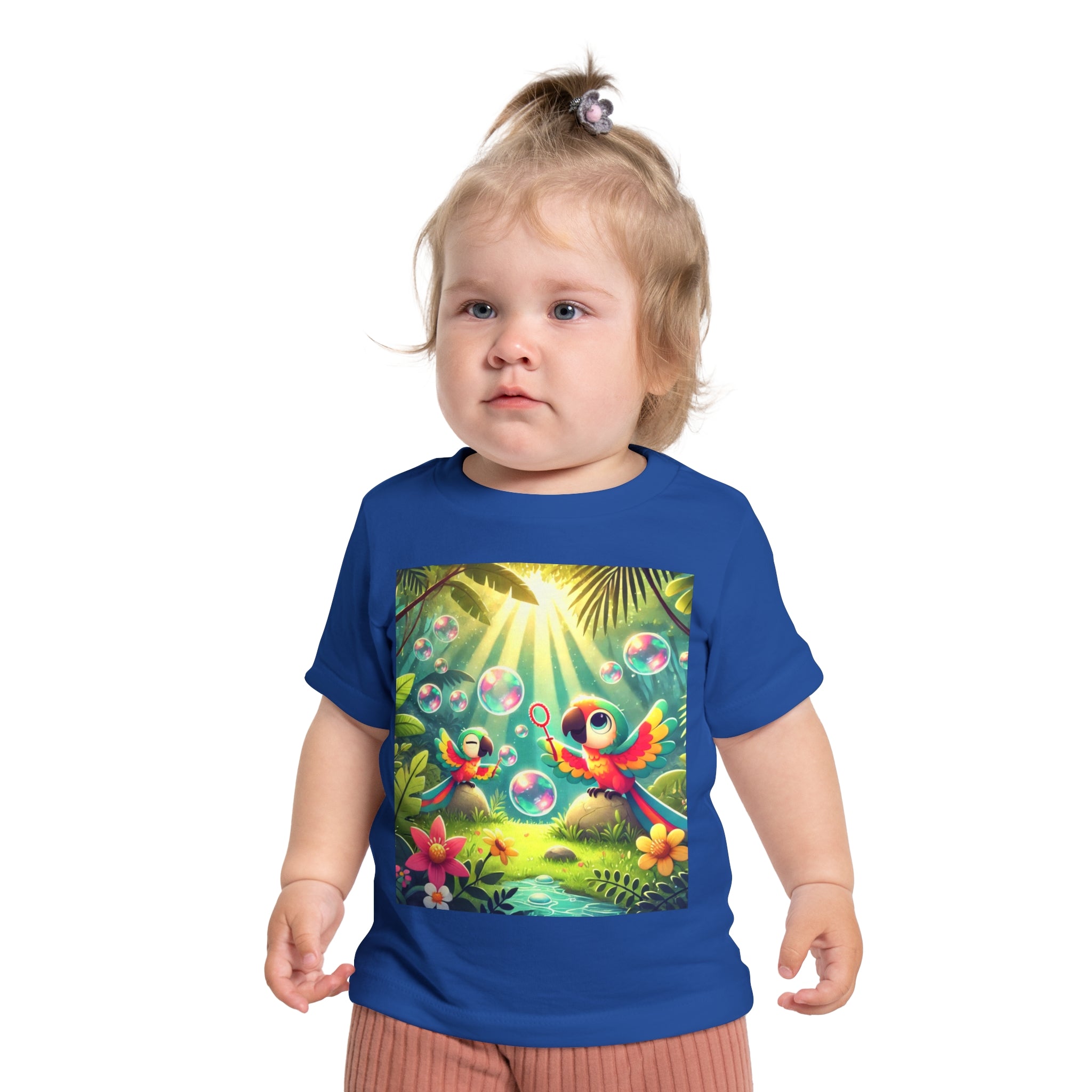 Parrots and Bubbles bursts with tropical color and playful energy, bringing a touch of paradise to your little one’s wardrobe. Beneath a golden canopy of sunlight filtering through lush jungle leaves, two cheerful parrots delight in blowing bubbles. Perched on smooth stones among bright tropical flowers, their feathers—shimmering in shades of scarlet, turquoise, emerald, and gold—glow brilliantly in the dappled light. Iridescent bubbles drift lazily upward, reflecting glimpses of the forest and sky, while a gentle stream winds through the background. Rendered in flat, storybook-style colors with radiant highlights and joyful detail, this charming artwork captures the innocence of play, the beauty of light, and the vivid life of the tropics.