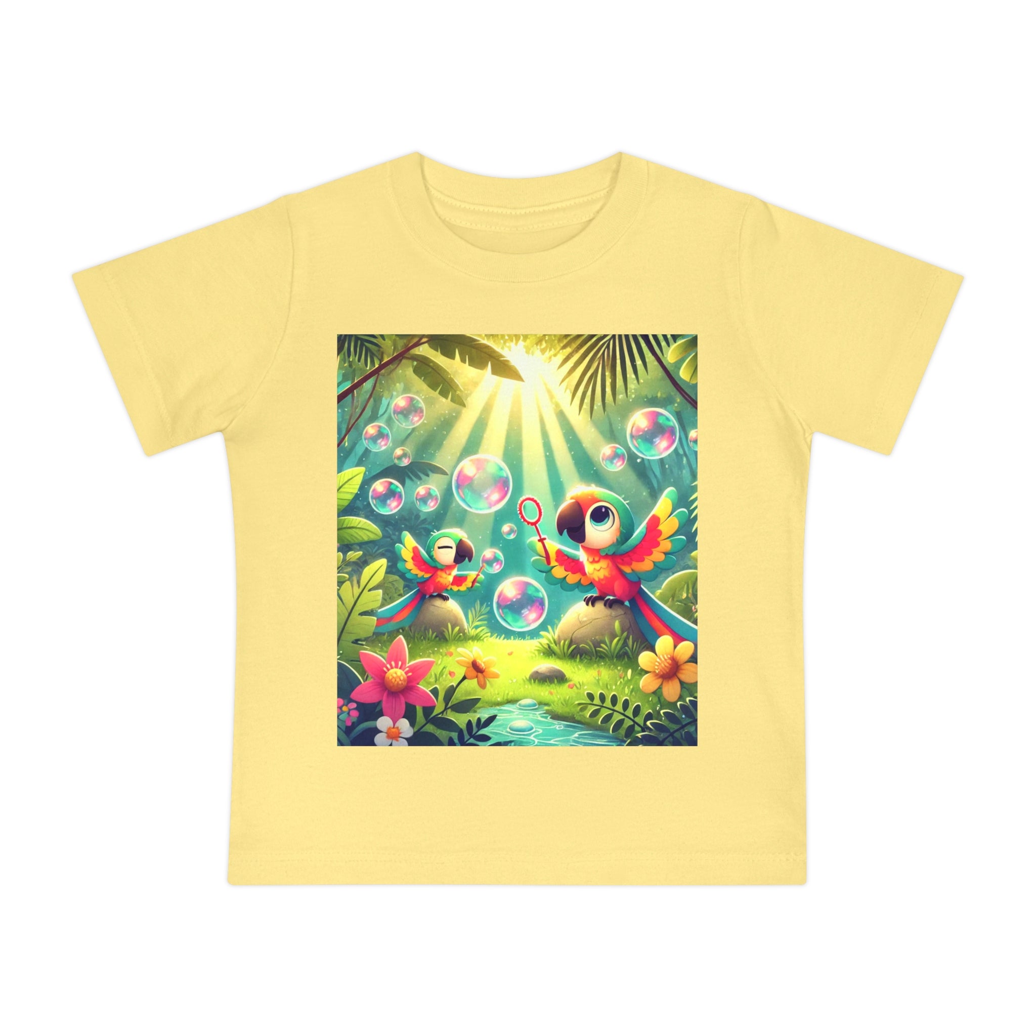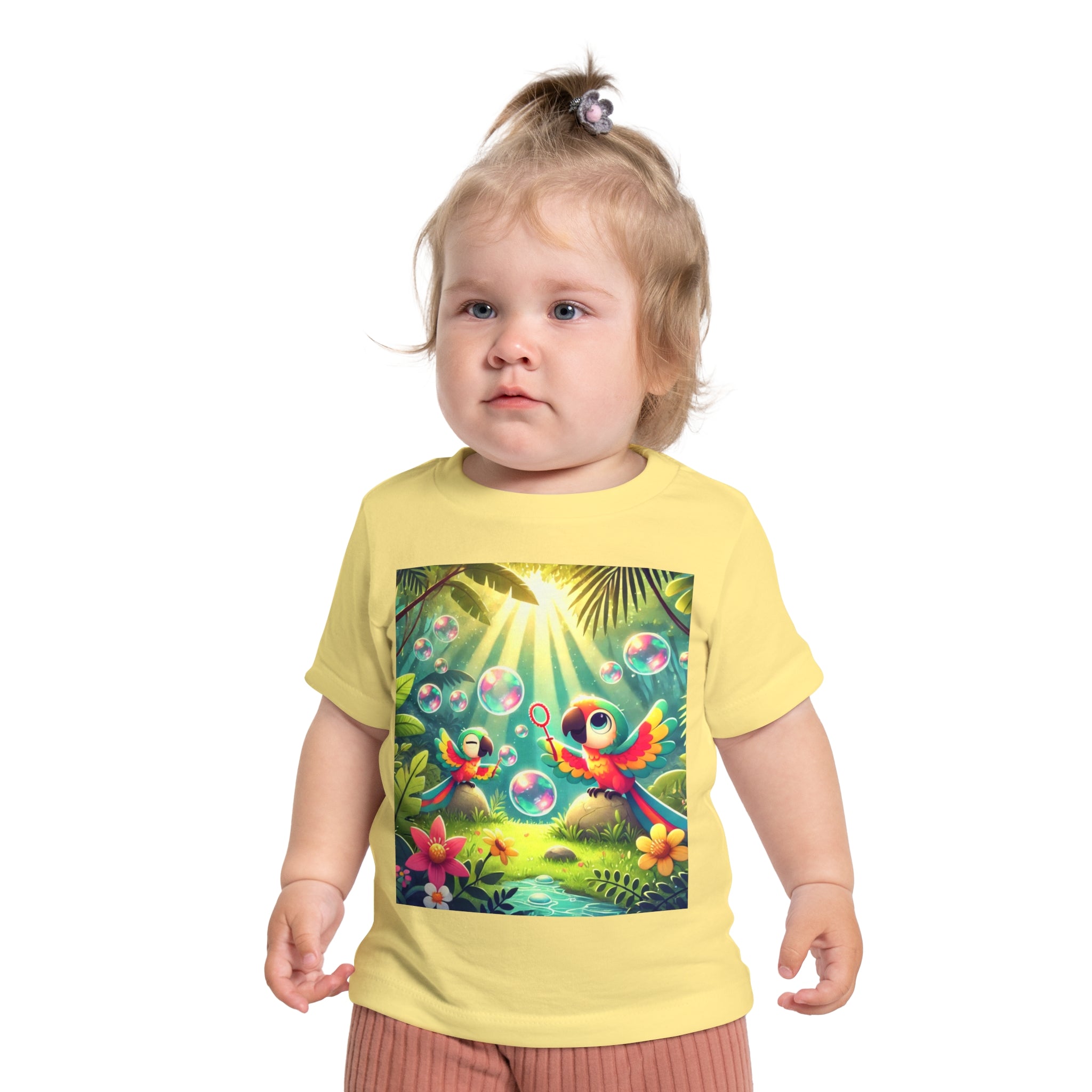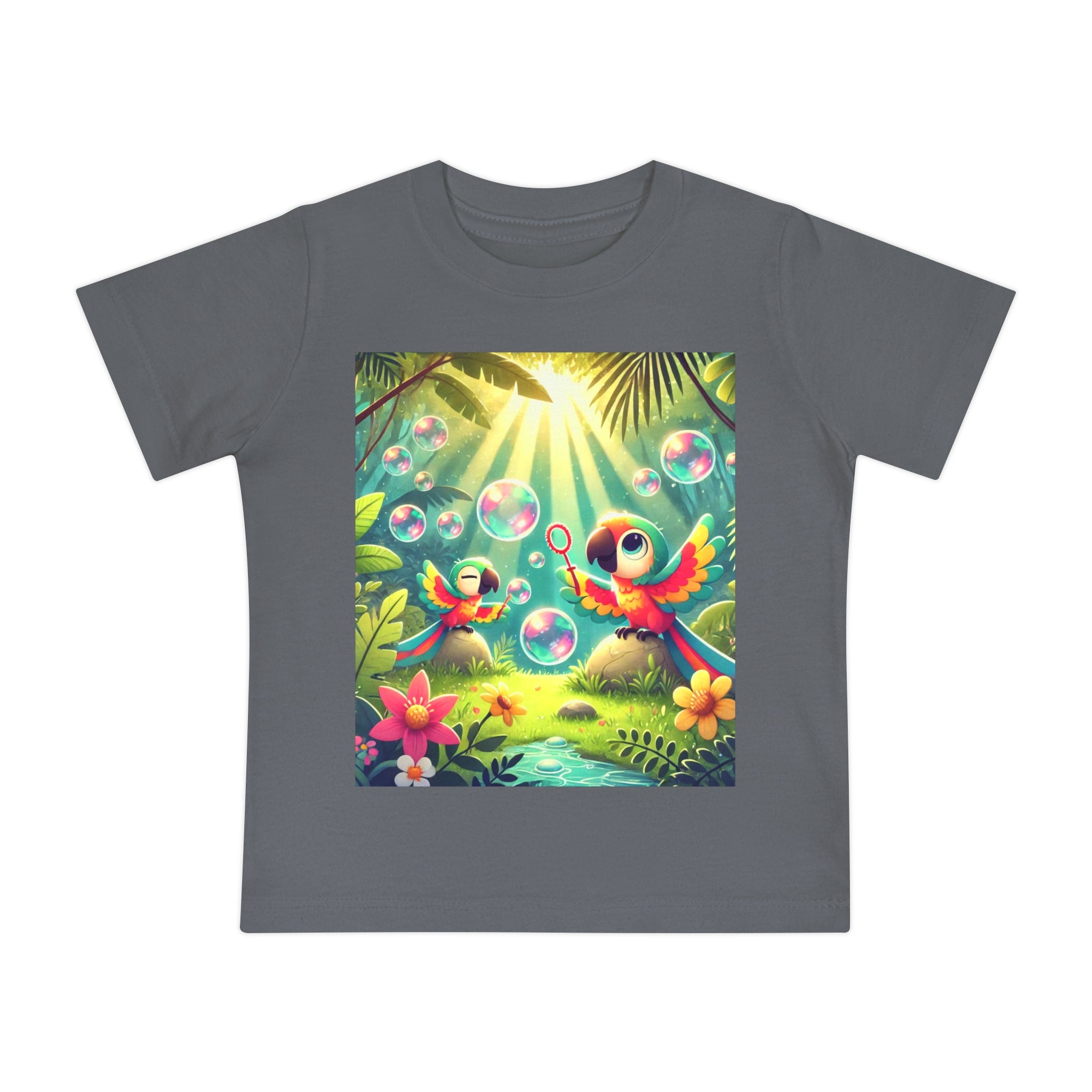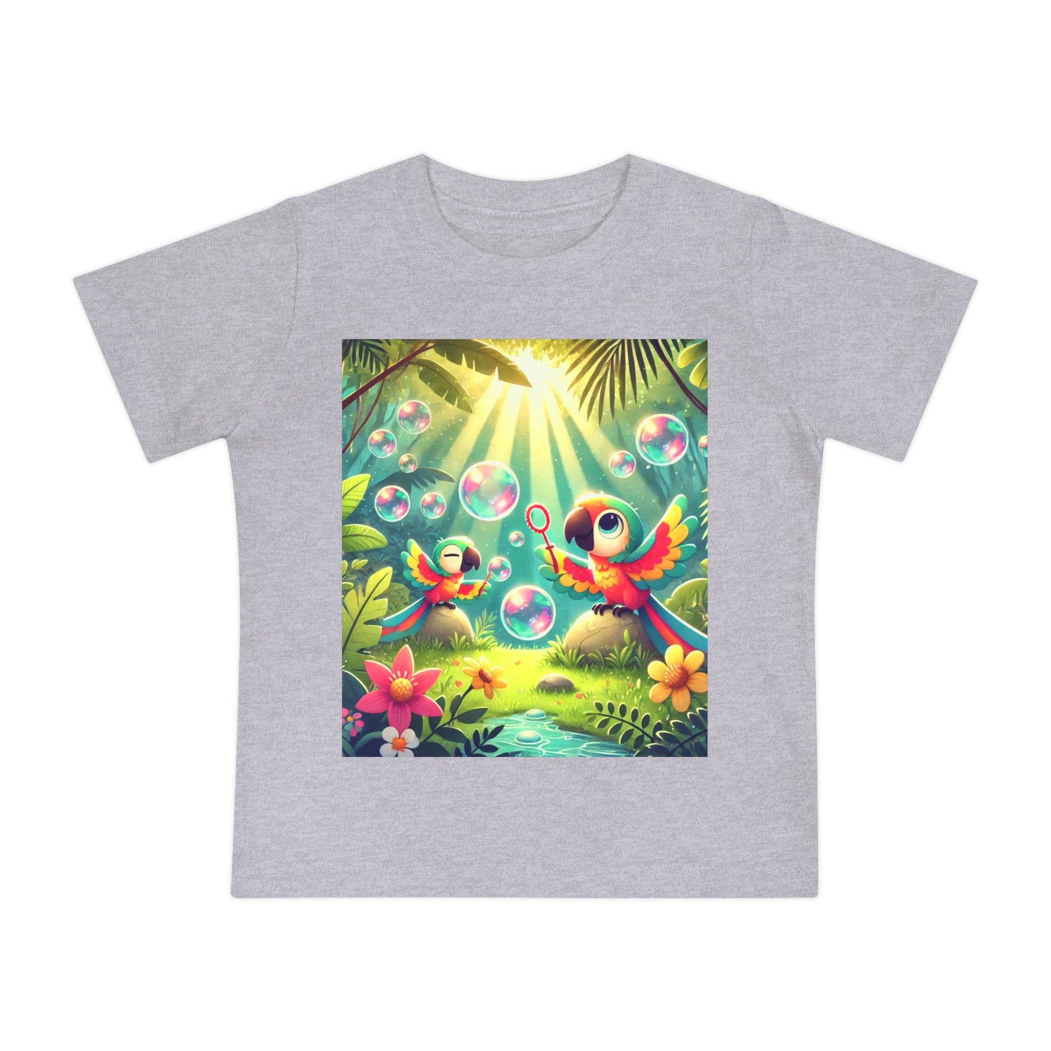 Parrots and Bubbles bursts with tropical color and playful energy, bringing a touch of paradise to your little one’s wardrobe. Beneath a golden canopy of sunlight filtering through lush jungle leaves, two cheerful parrots delight in blowing bubbles. Perched on smooth stones among bright tropical flowers, their feathers—shimmering in shades of scarlet, turquoise, emerald, and gold—glow brilliantly in the dappled light. Iridescent bubbles drift lazily upward, reflecting glimpses of the forest and sky, while a gentle stream winds through the background. Rendered in flat, storybook-style colors with radiant highlights and joyful detail, this charming artwork captures the innocence of play, the beauty of light, and the vivid life of the tropics.