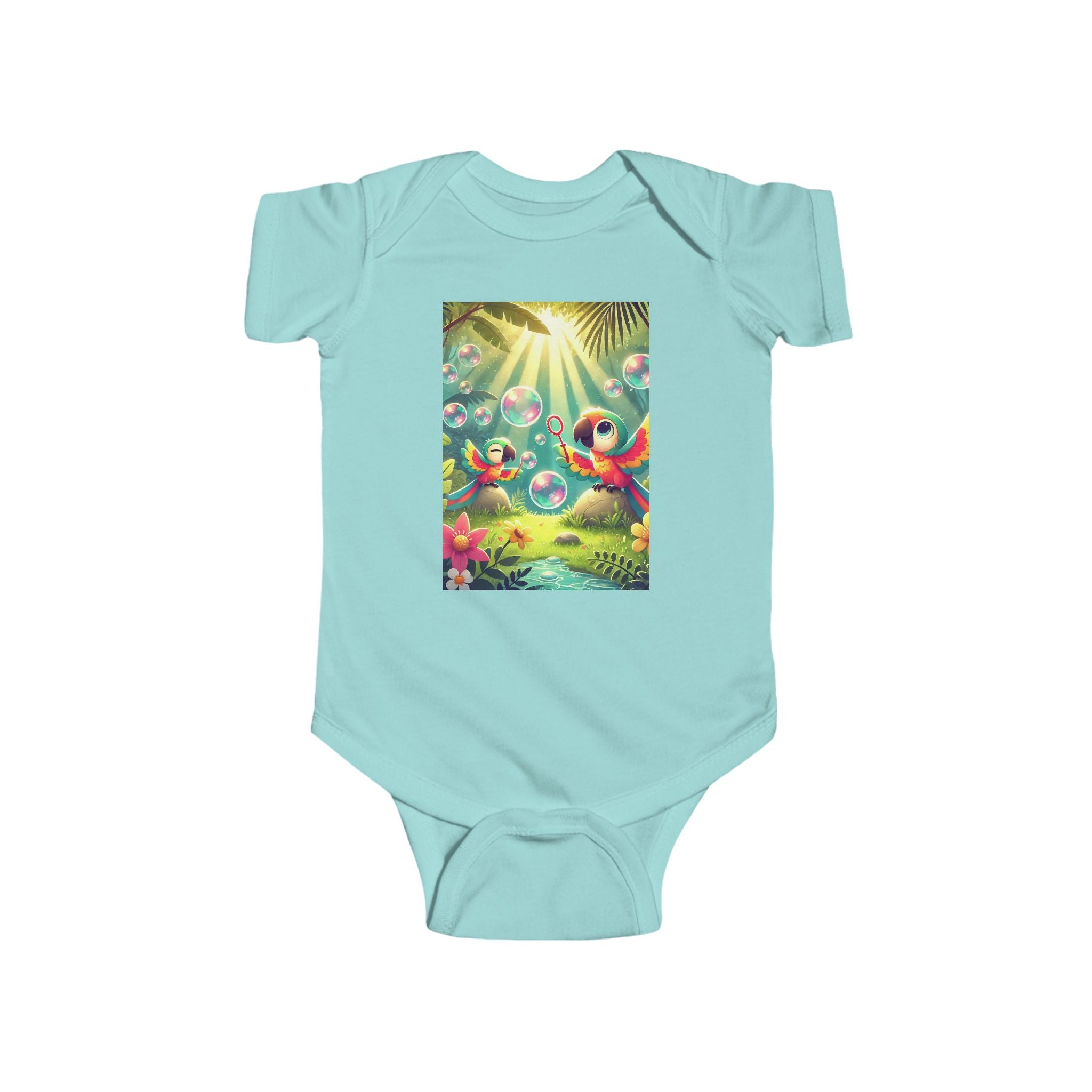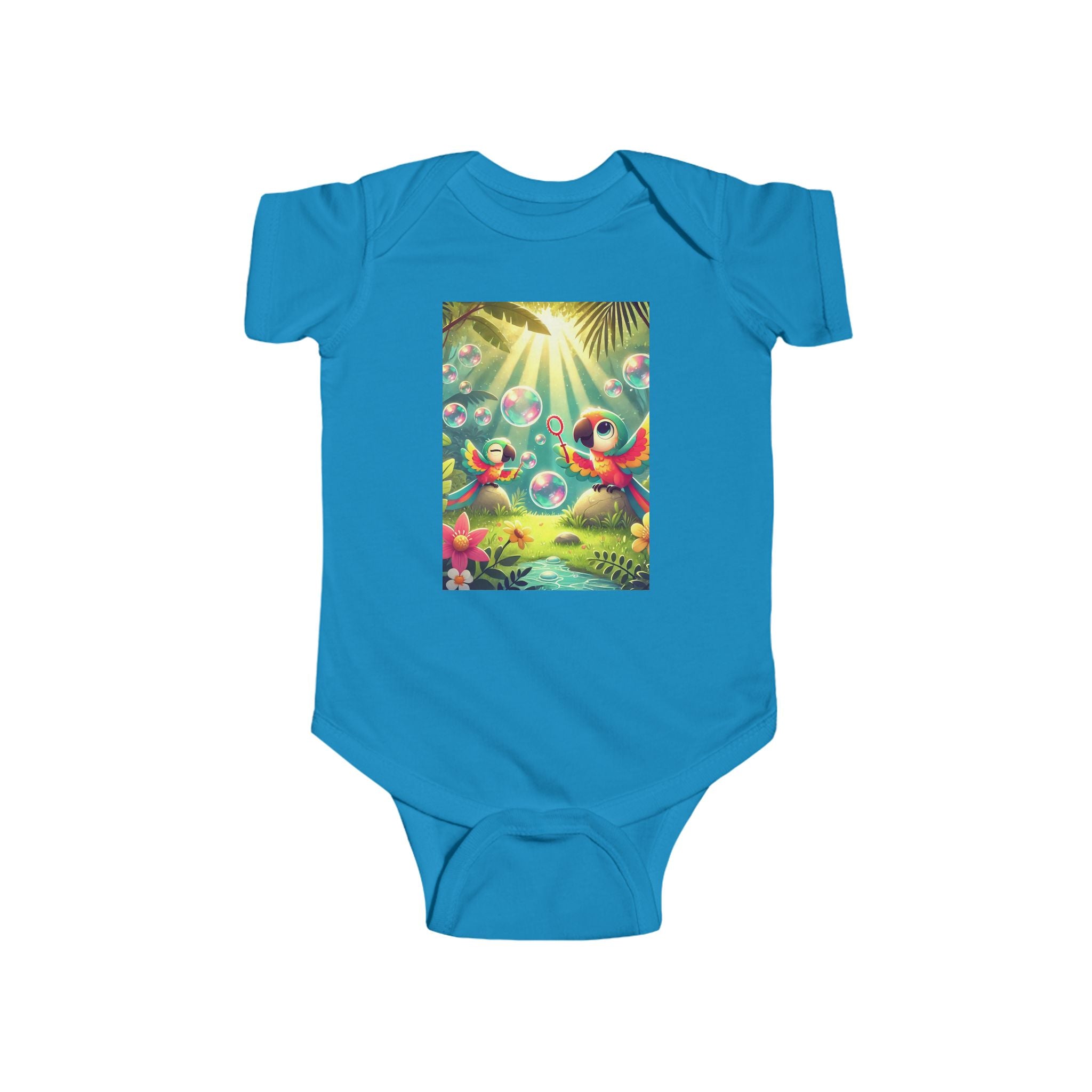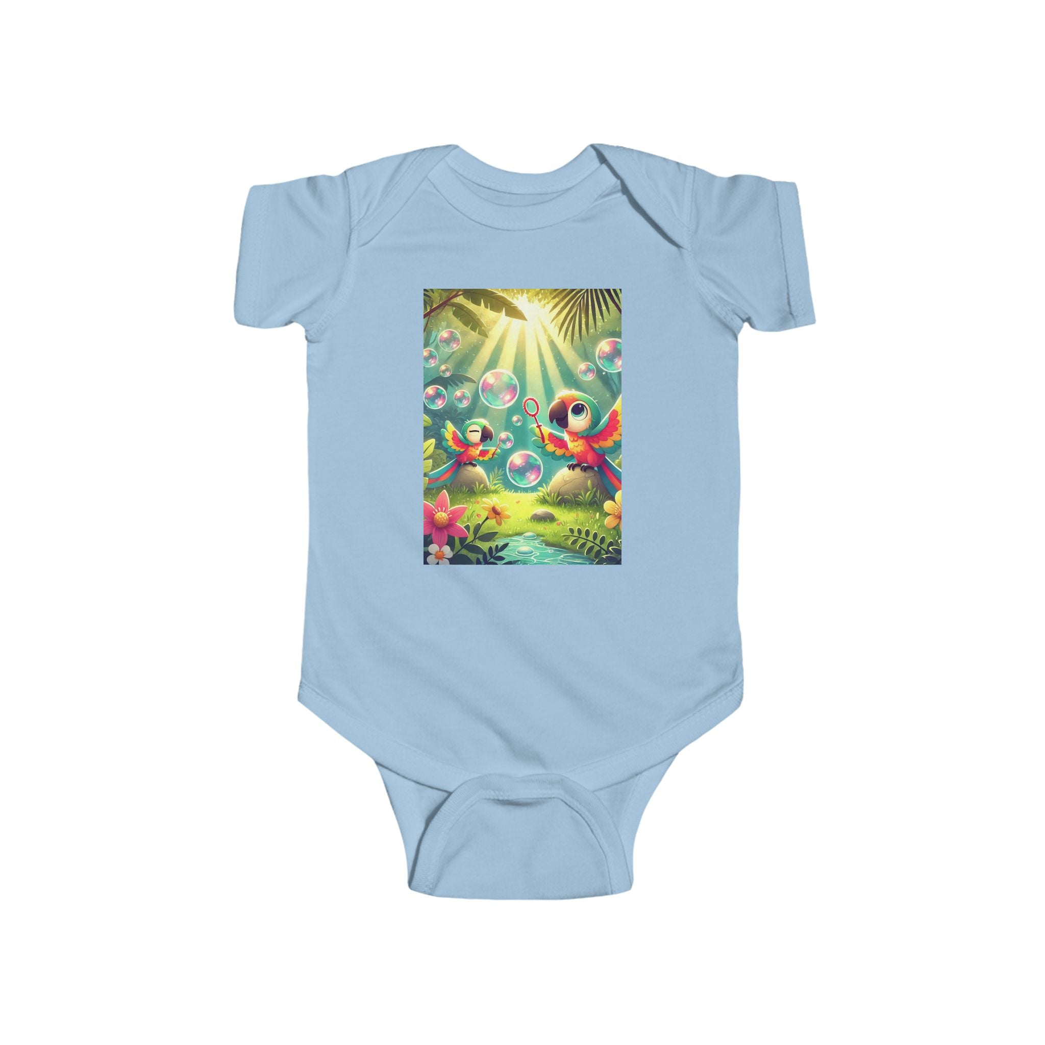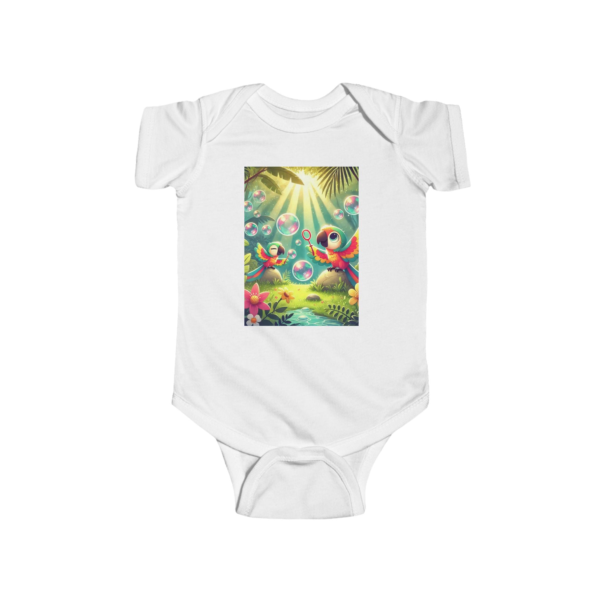 Parrots and Bubbles brings a touch of tropical delight and playful charm to babywear. Beneath a golden canopy of sunlight filtering through lush green leaves, two cheerful parrots blow shimmering bubbles that glisten in the warm jungle air. Perched on smooth stones surrounded by vivid flowers, their feathers—shades of scarlet, turquoise, emerald, and gold—shine brilliantly in the dappled light. Iridescent bubbles float gently upward, catching reflections of the forest and sky as they drift. A tiny stream winds through the scene, adding serenity to the joyful playfulness. Rendered in flat, storybook-style colors with radiant highlights and charming detail, this artwork captures the innocence of discovery, the warmth of light, and the vibrant spirit of the tropics.