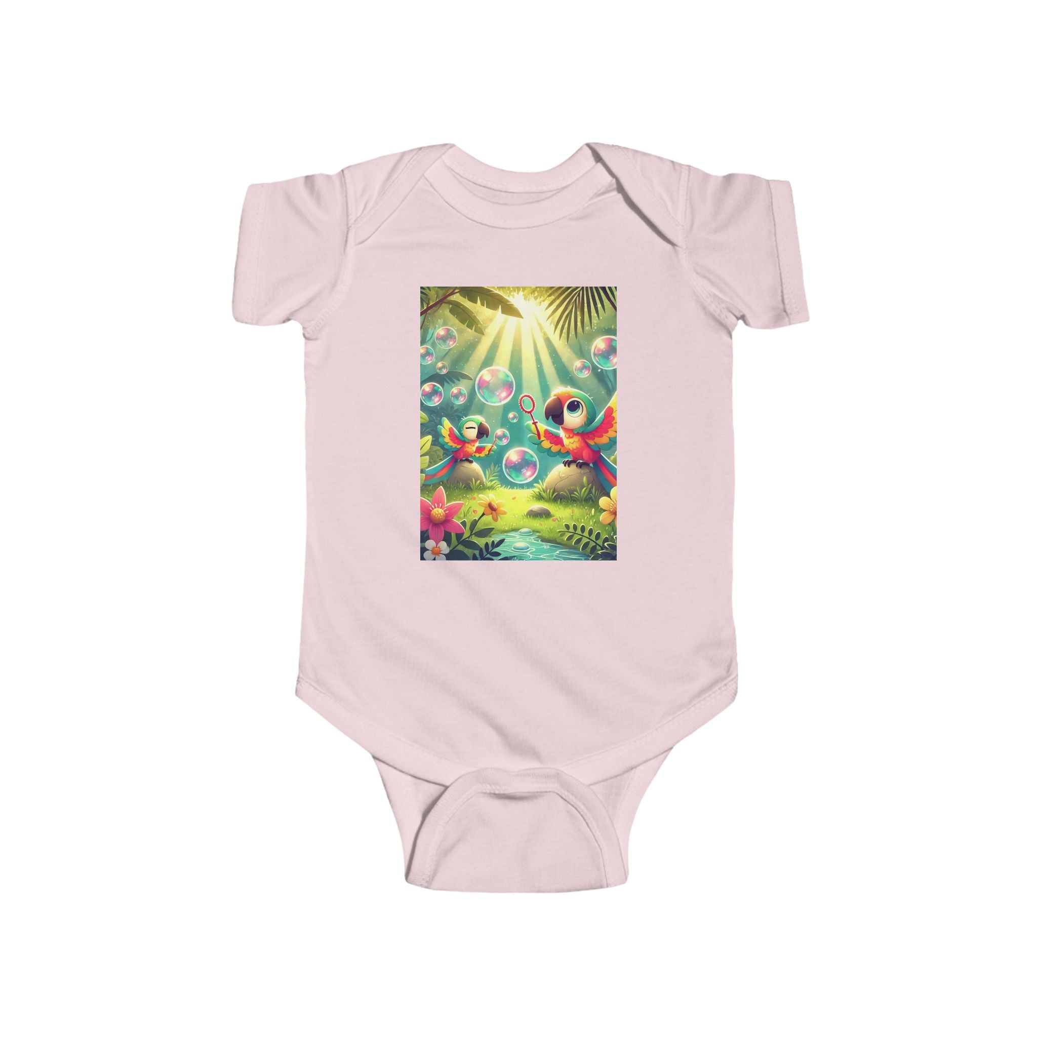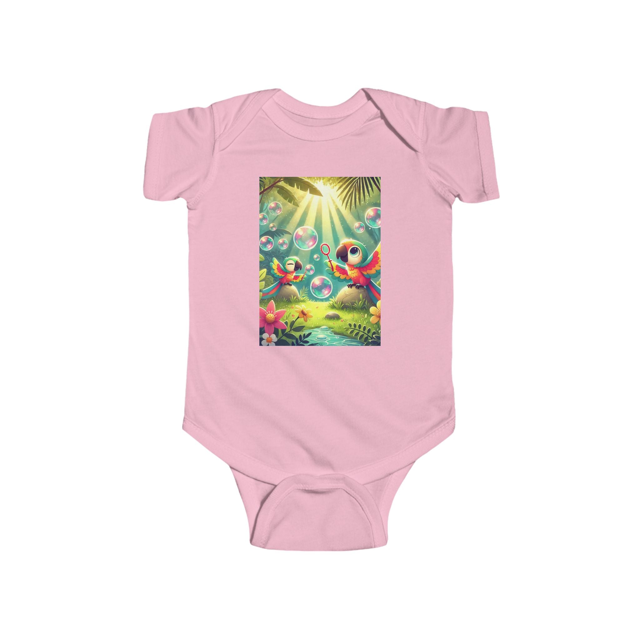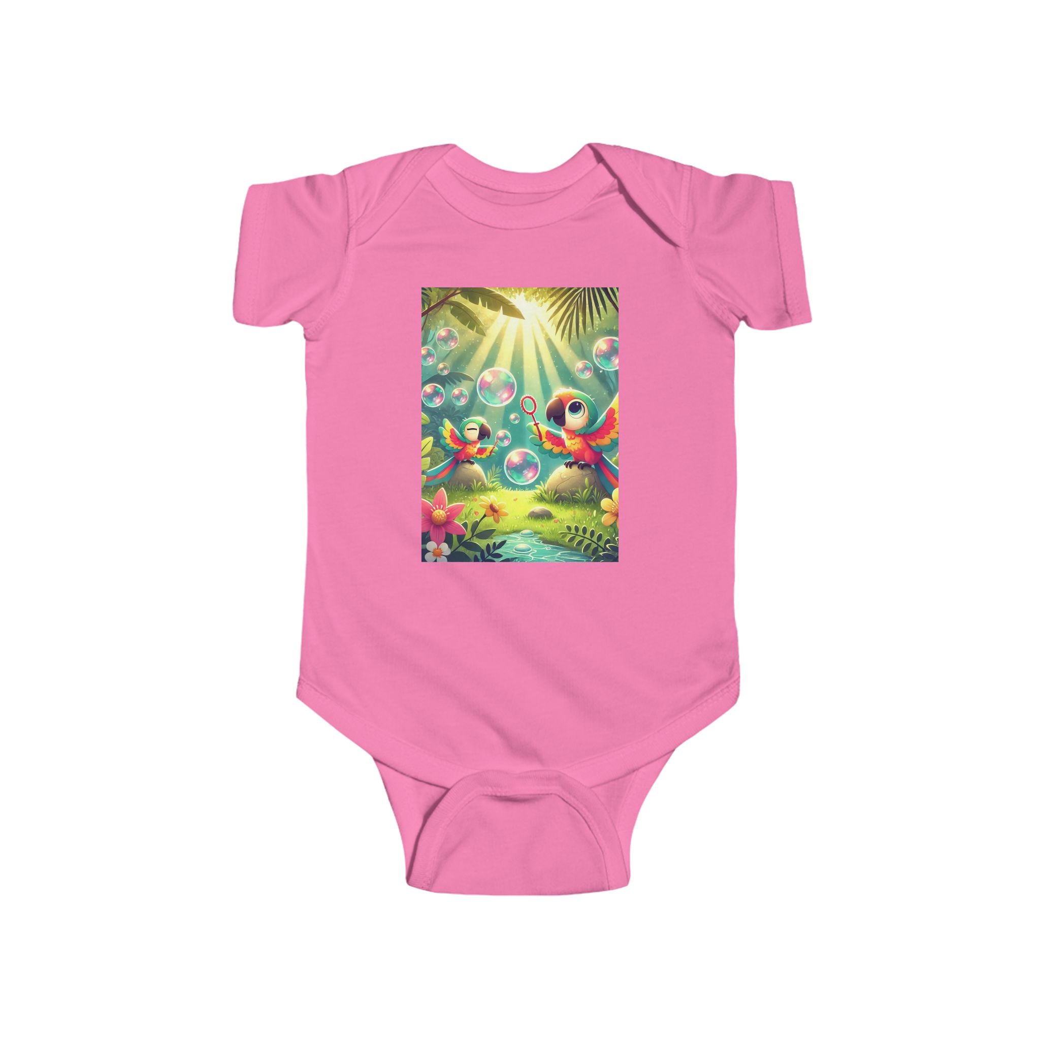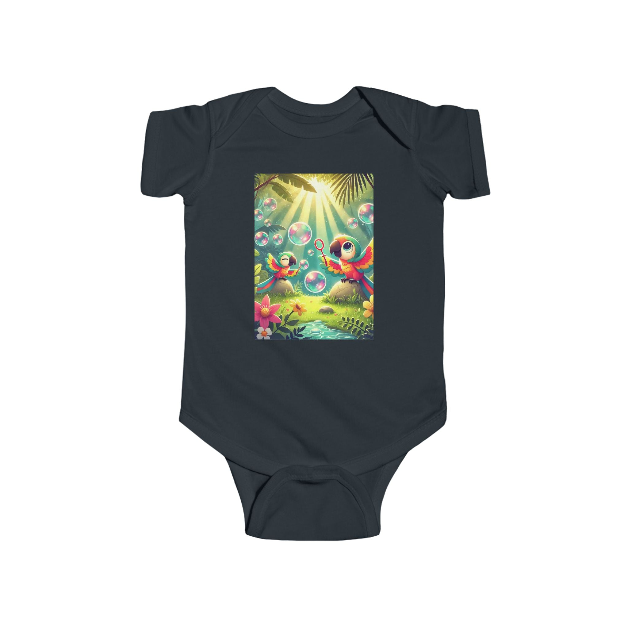 Parrots and Bubbles brings a touch of tropical delight and playful charm to babywear. Beneath a golden canopy of sunlight filtering through lush green leaves, two cheerful parrots blow shimmering bubbles that glisten in the warm jungle air. Perched on smooth stones surrounded by vivid flowers, their feathers—shades of scarlet, turquoise, emerald, and gold—shine brilliantly in the dappled light. Iridescent bubbles float gently upward, catching reflections of the forest and sky as they drift. A tiny stream winds through the scene, adding serenity to the joyful playfulness. Rendered in flat, storybook-style colors with radiant highlights and charming detail, this artwork captures the innocence of discovery, the warmth of light, and the vibrant spirit of the tropics.