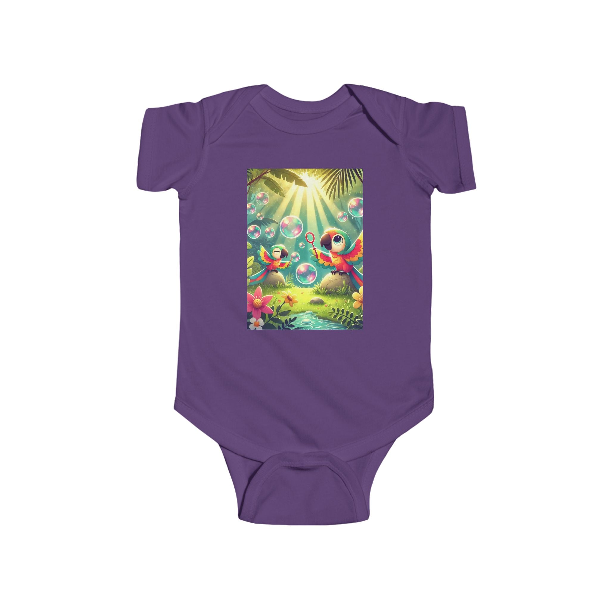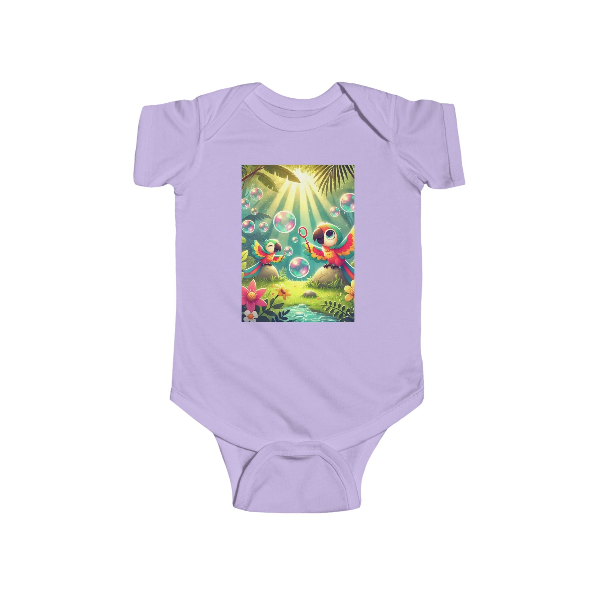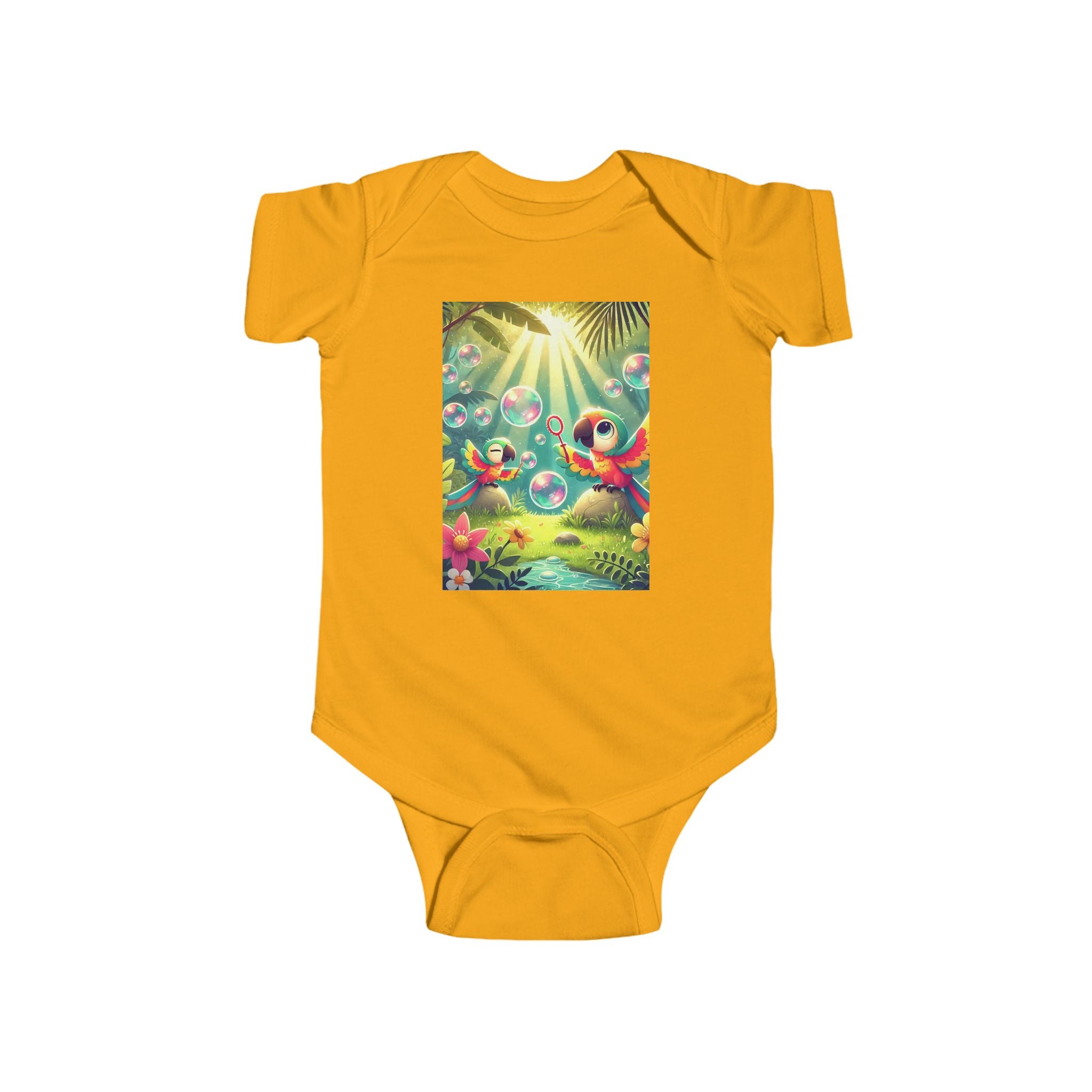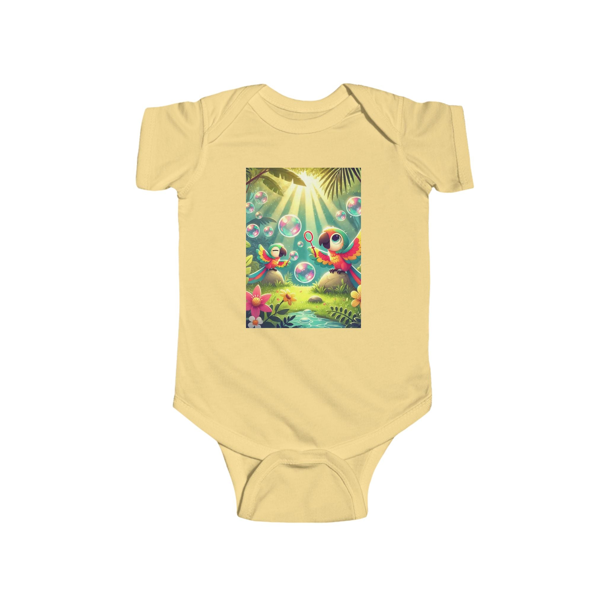 Parrots and Bubbles brings a touch of tropical delight and playful charm to babywear. Beneath a golden canopy of sunlight filtering through lush green leaves, two cheerful parrots blow shimmering bubbles that glisten in the warm jungle air. Perched on smooth stones surrounded by vivid flowers, their feathers—shades of scarlet, turquoise, emerald, and gold—shine brilliantly in the dappled light. Iridescent bubbles float gently upward, catching reflections of the forest and sky as they drift. A tiny stream winds through the scene, adding serenity to the joyful playfulness. Rendered in flat, storybook-style colors with radiant highlights and charming detail, this artwork captures the innocence of discovery, the warmth of light, and the vibrant spirit of the tropics.