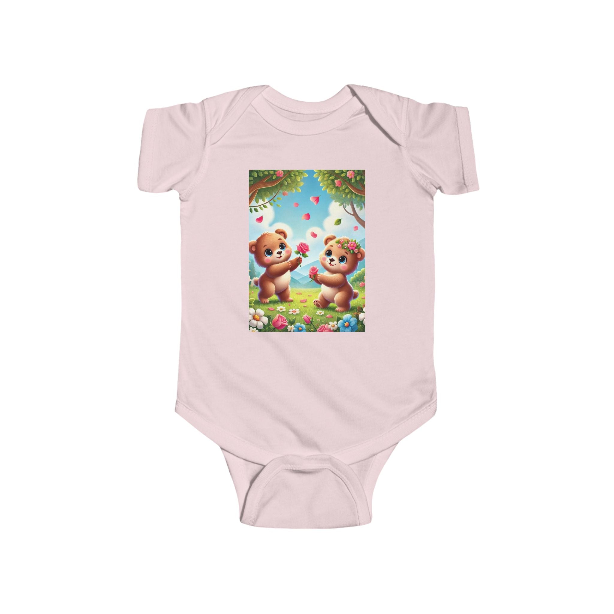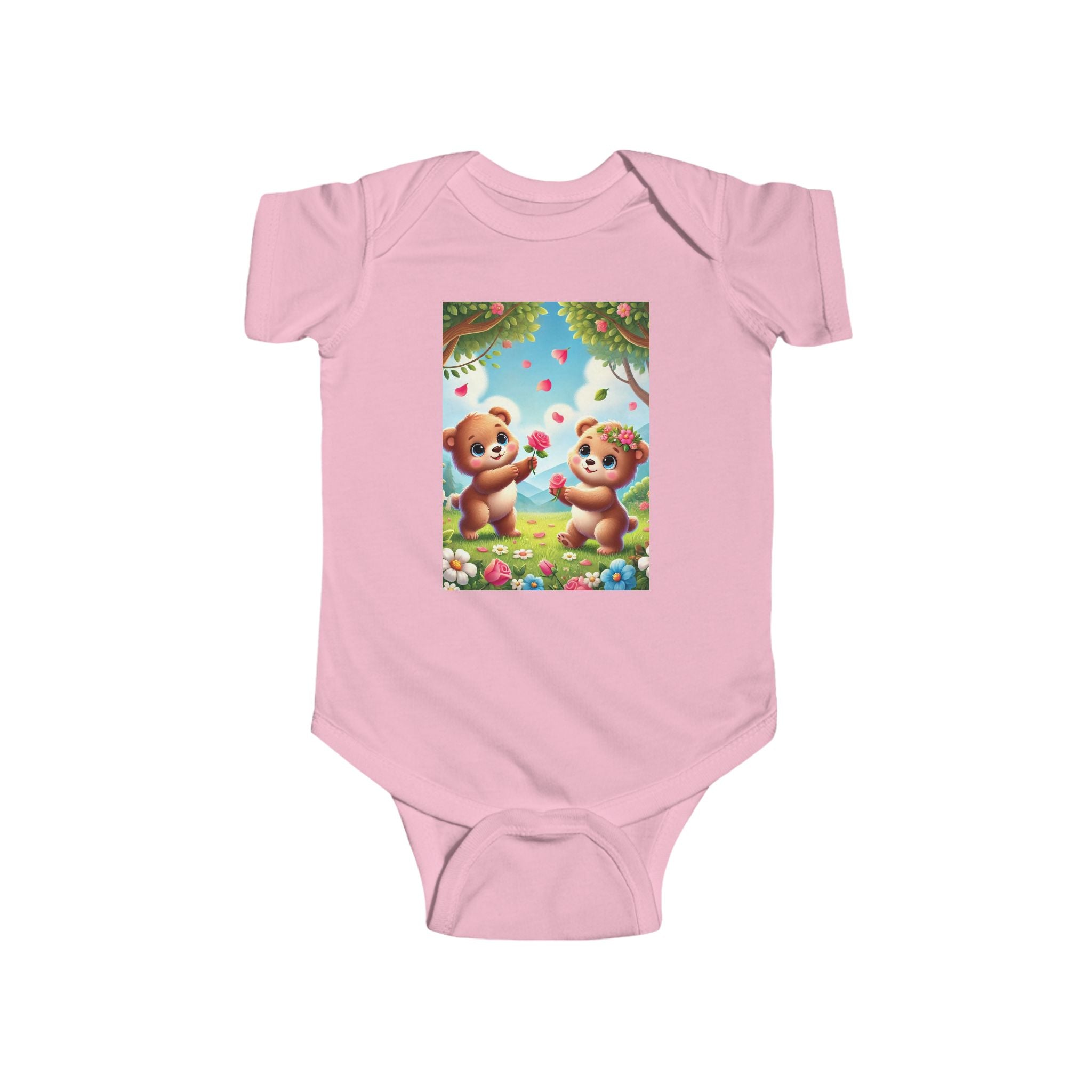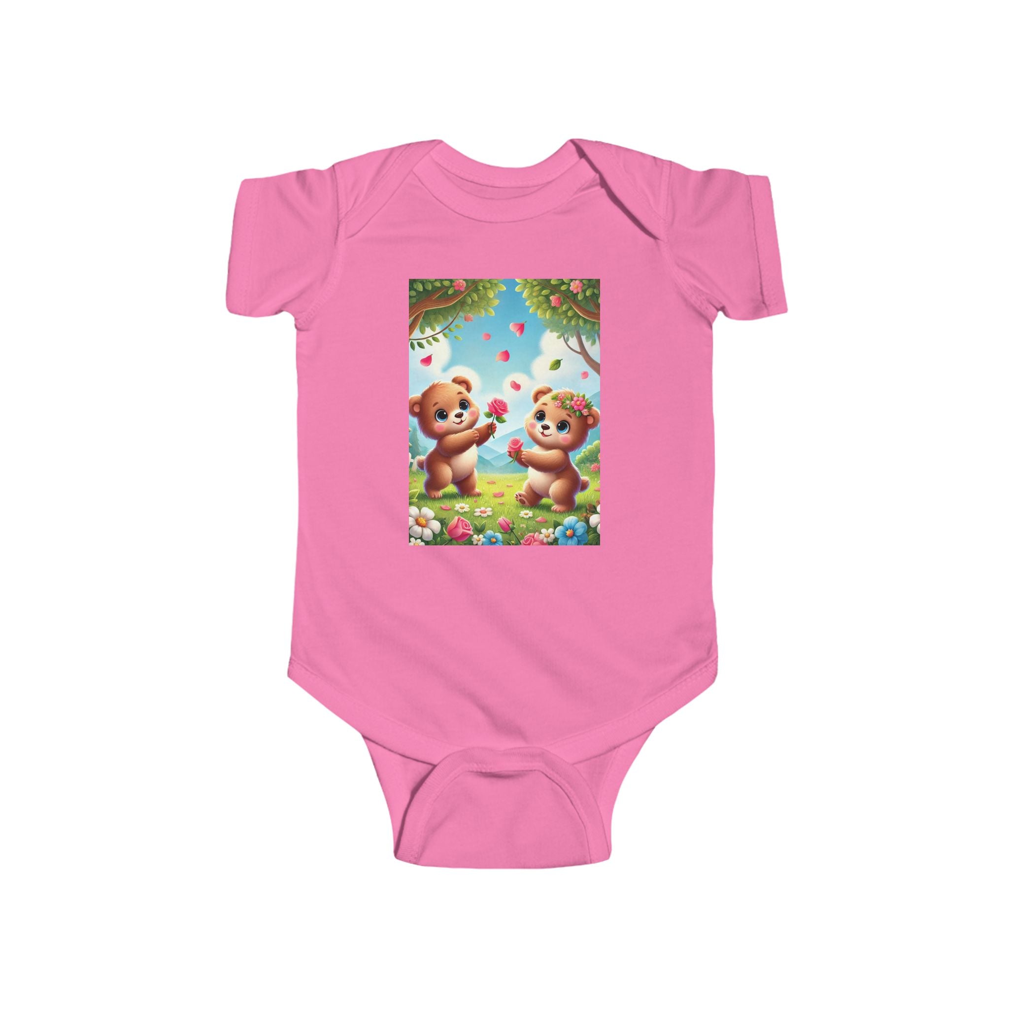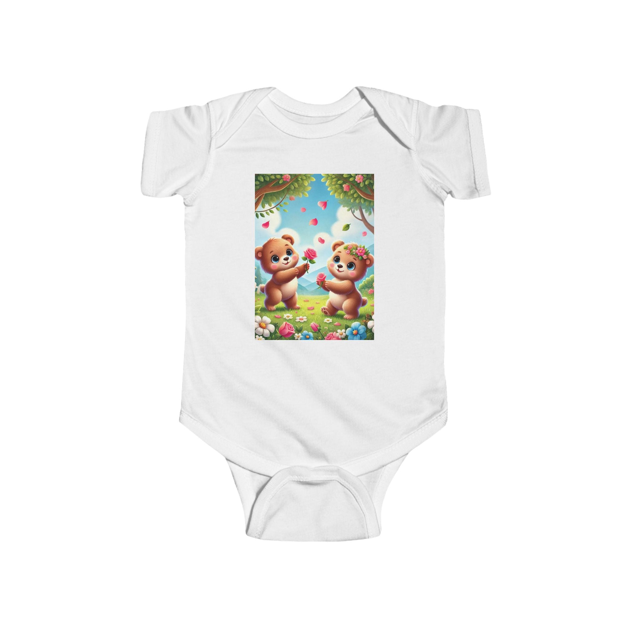 Petals and Paws Infant Fine Jersey Bodysuit wraps baby in soft, everyday comfort with a sweet garden scene that feels calm, cheerful, and full of gentle affection. In the artwork, two cuddly teddy bear friends share a quiet moment in the sunshine, exchanging pink roses beneath softly arching trees. Petals drift through the air as daisies and bright blossoms dot the green grass, while rosy cheeks, sparkling eyes, and playful floral details keep the mood warm and baby-friendly—celebrating friendship, sharing, and simple springtime joy. Designed to be both durable and soft, this fine jersey bodysuit includes easy snaps for quick changes and a smooth feel for all-day snuggles.