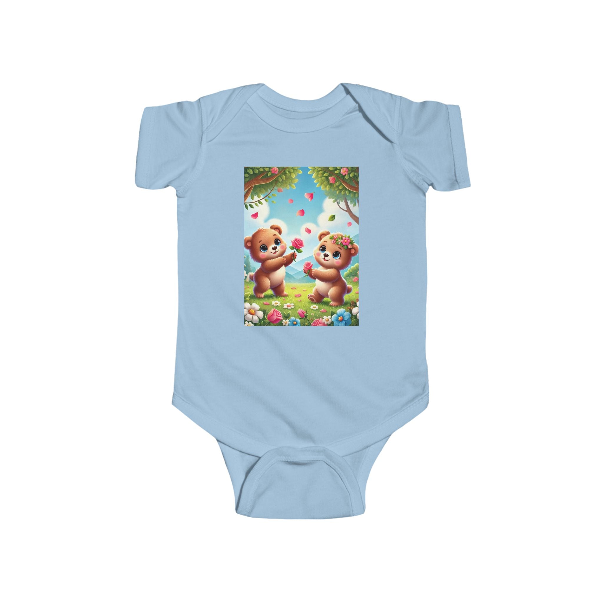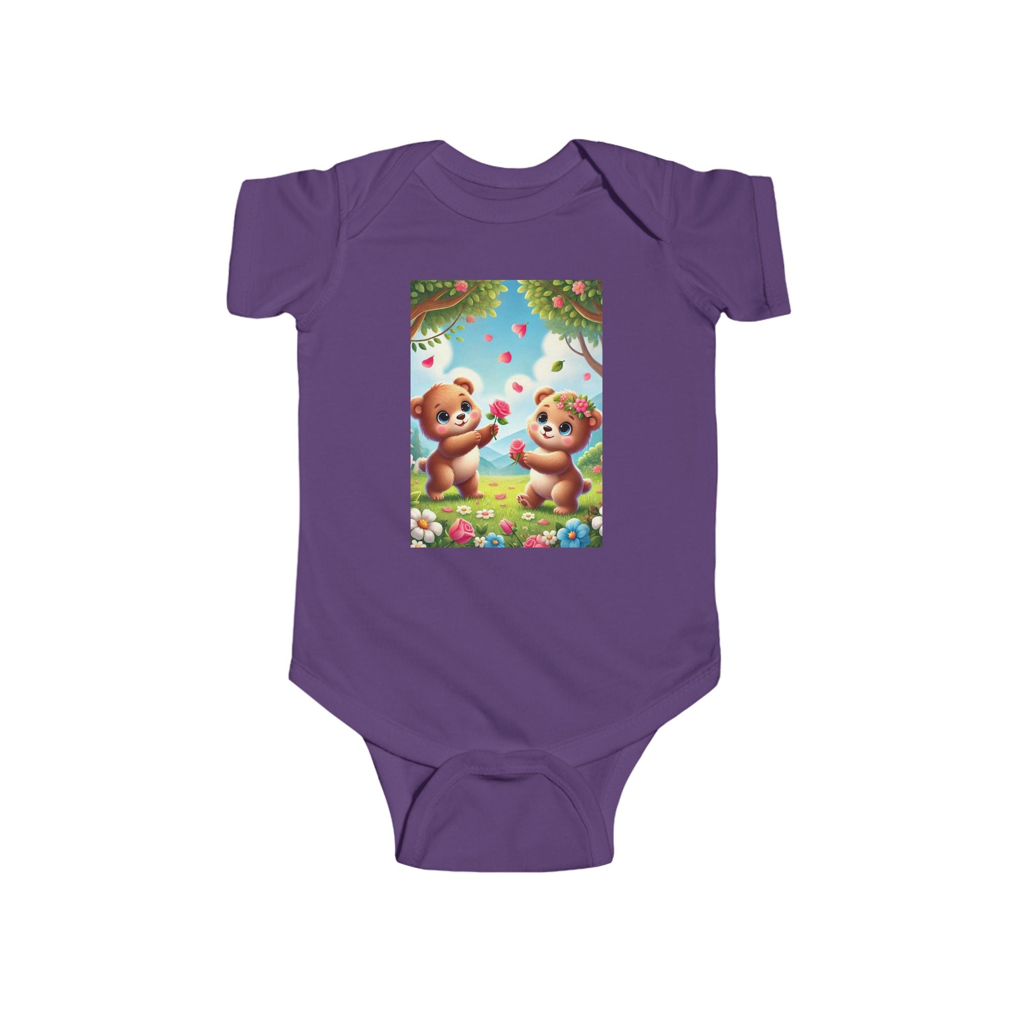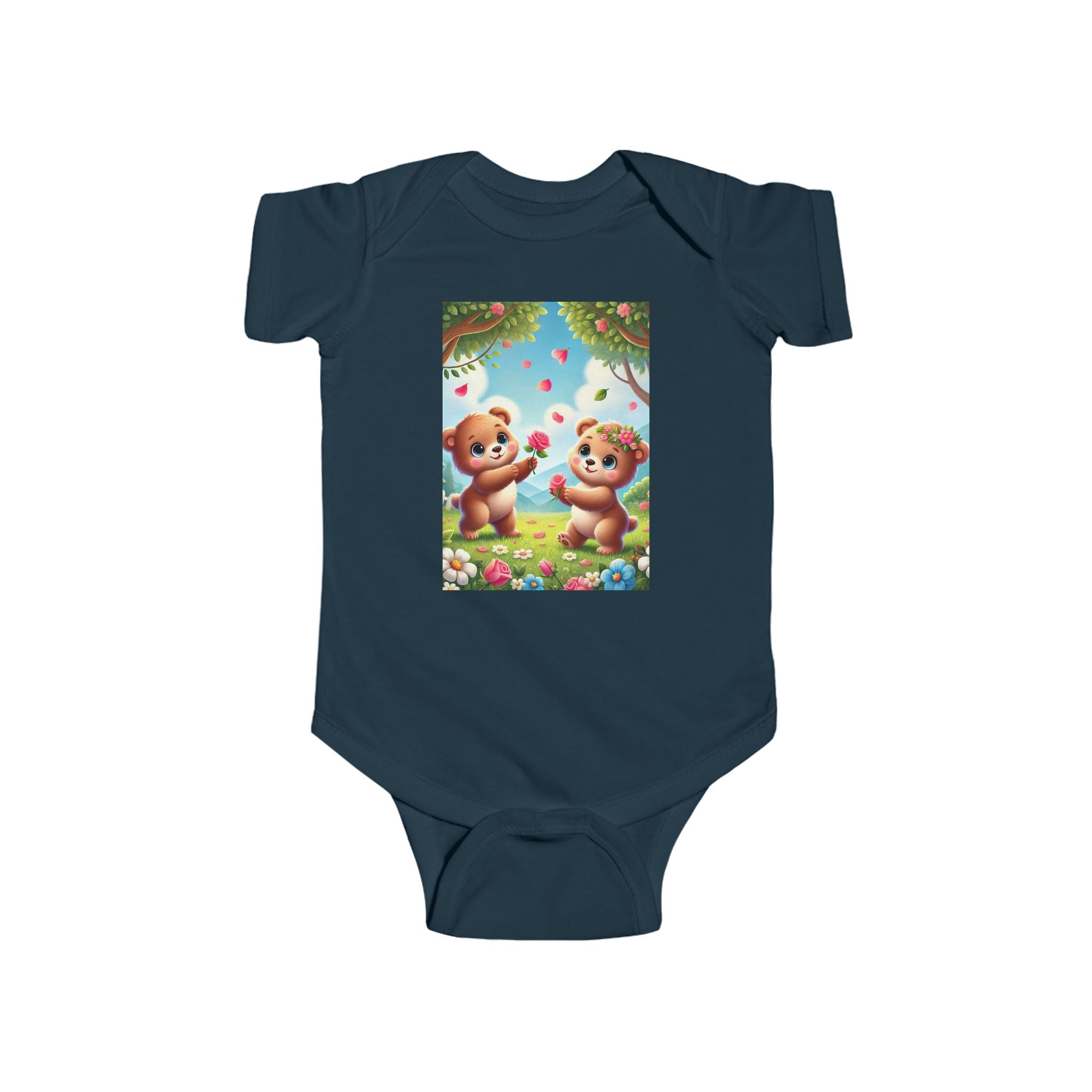 Petals and Paws Infant Fine Jersey Bodysuit wraps baby in soft, everyday comfort with a sweet garden scene that feels calm, cheerful, and full of gentle affection. In the artwork, two cuddly teddy bear friends share a quiet moment in the sunshine, exchanging pink roses beneath softly arching trees. Petals drift through the air as daisies and bright blossoms dot the green grass, while rosy cheeks, sparkling eyes, and playful floral details keep the mood warm and baby-friendly—celebrating friendship, sharing, and simple springtime joy. Designed to be both durable and soft, this fine jersey bodysuit includes easy snaps for quick changes and a smooth feel for all-day snuggles.