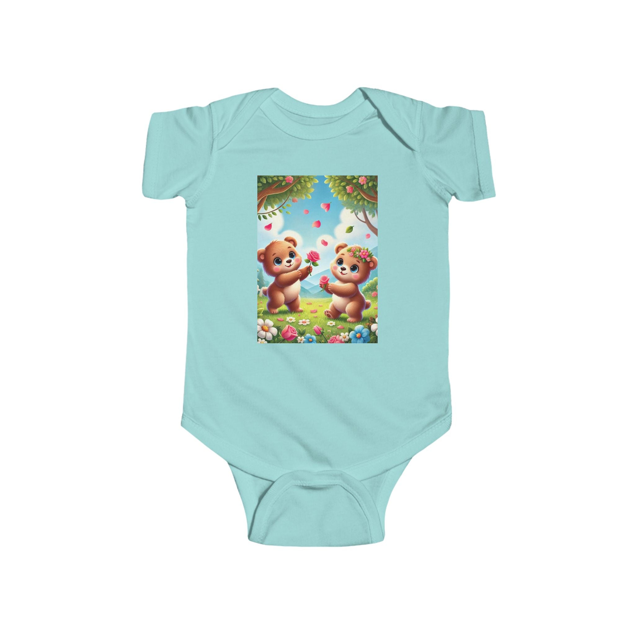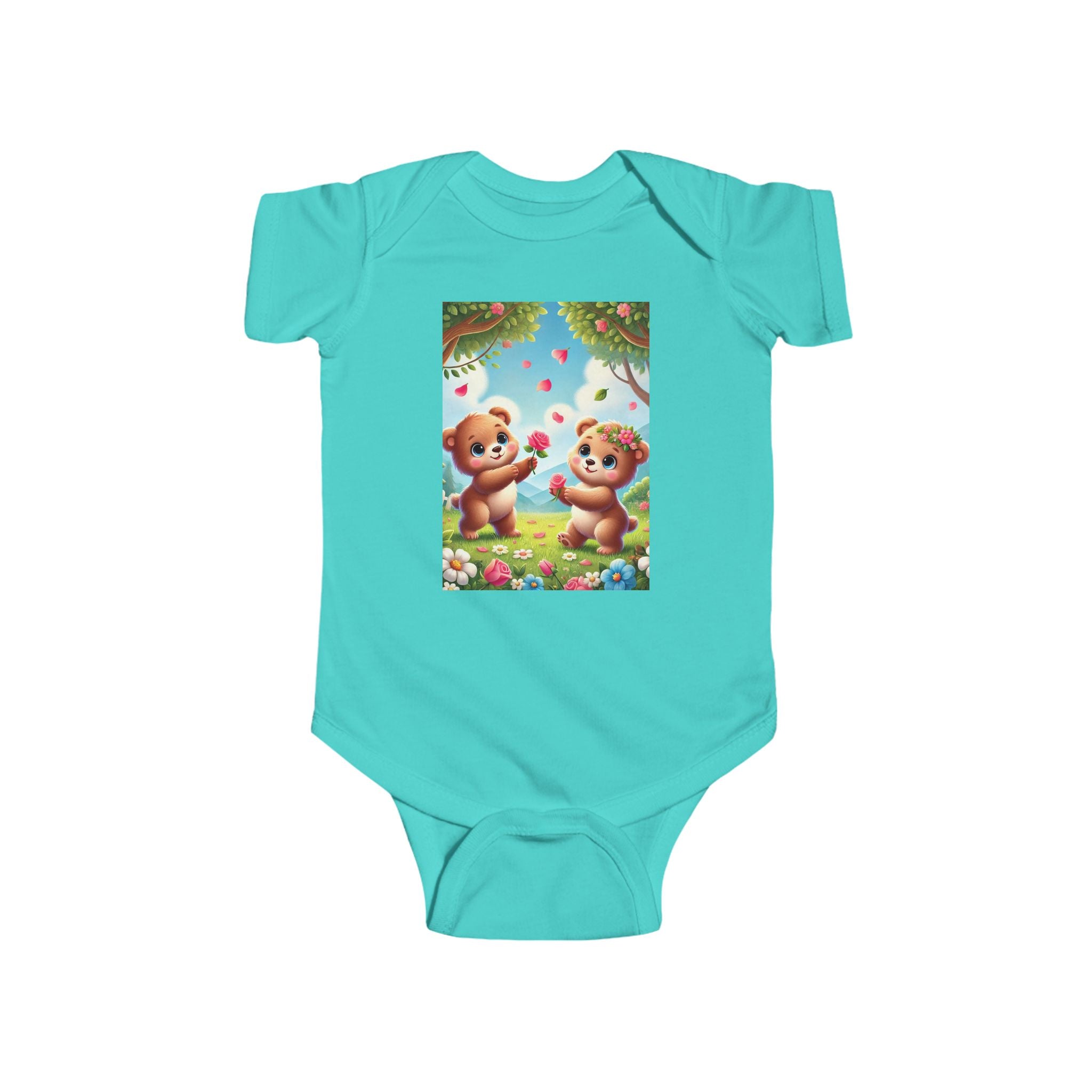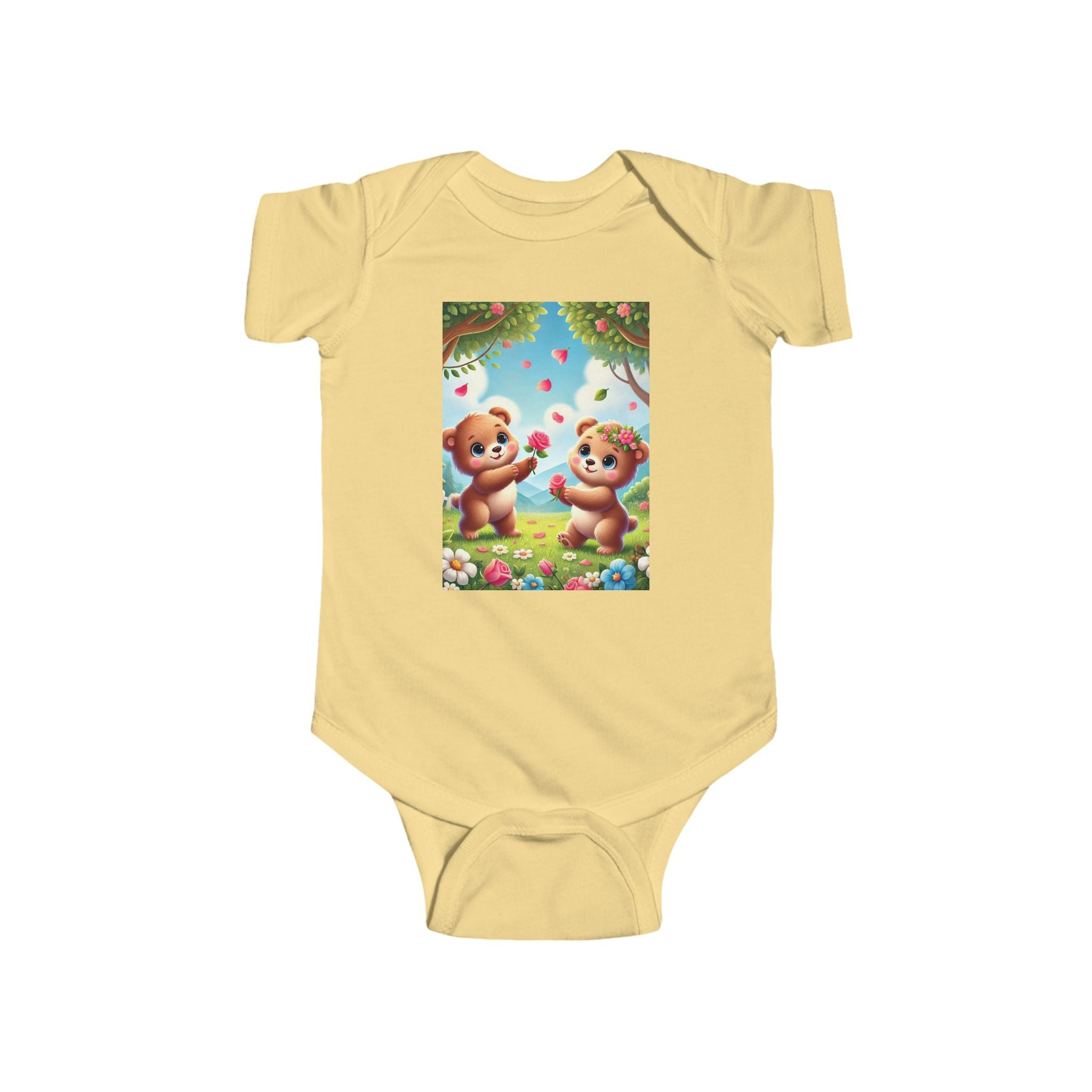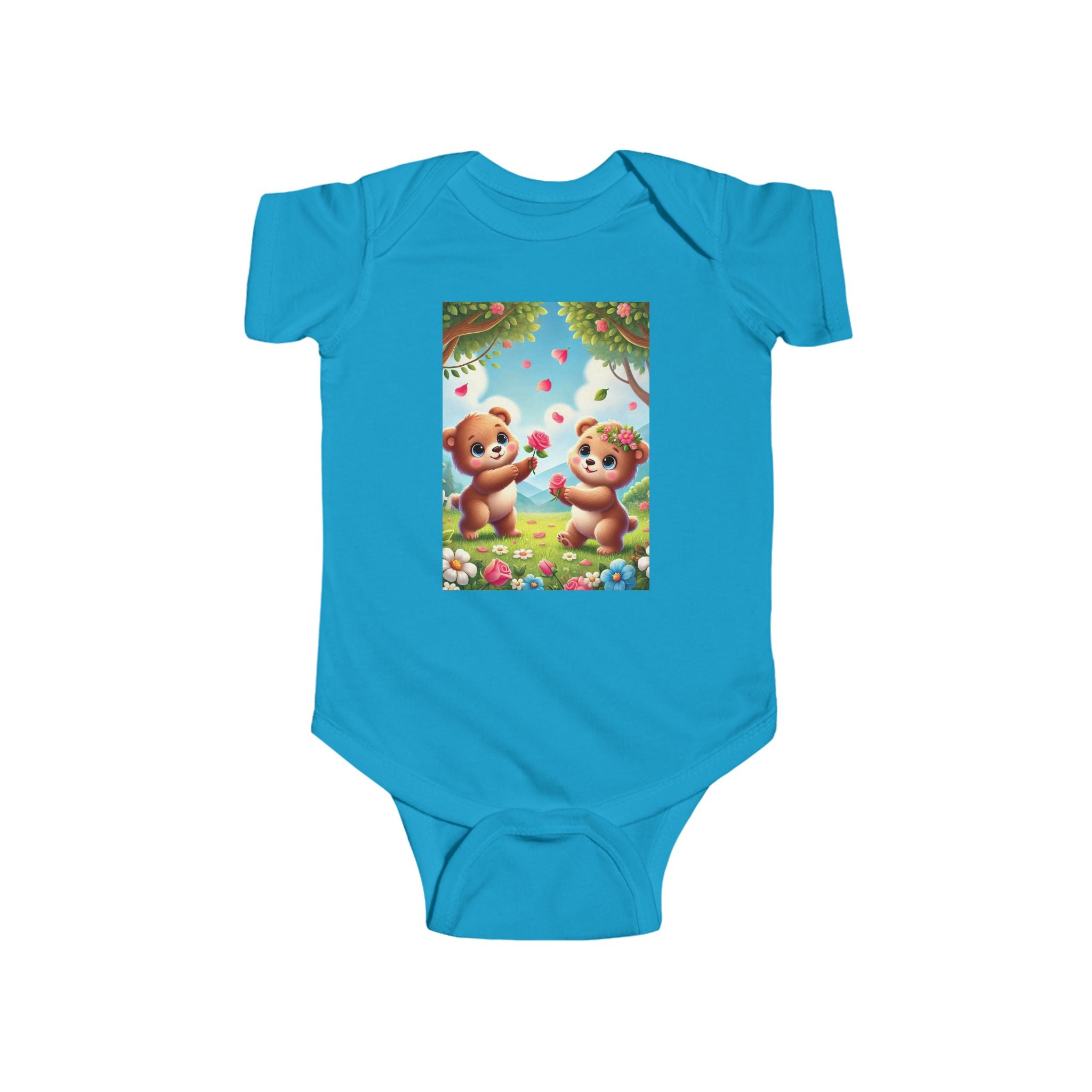 Petals and Paws Infant Fine Jersey Bodysuit wraps baby in soft, everyday comfort with a sweet garden scene that feels calm, cheerful, and full of gentle affection. In the artwork, two cuddly teddy bear friends share a quiet moment in the sunshine, exchanging pink roses beneath softly arching trees. Petals drift through the air as daisies and bright blossoms dot the green grass, while rosy cheeks, sparkling eyes, and playful floral details keep the mood warm and baby-friendly—celebrating friendship, sharing, and simple springtime joy. Designed to be both durable and soft, this fine jersey bodysuit includes easy snaps for quick changes and a smooth feel for all-day snuggles.