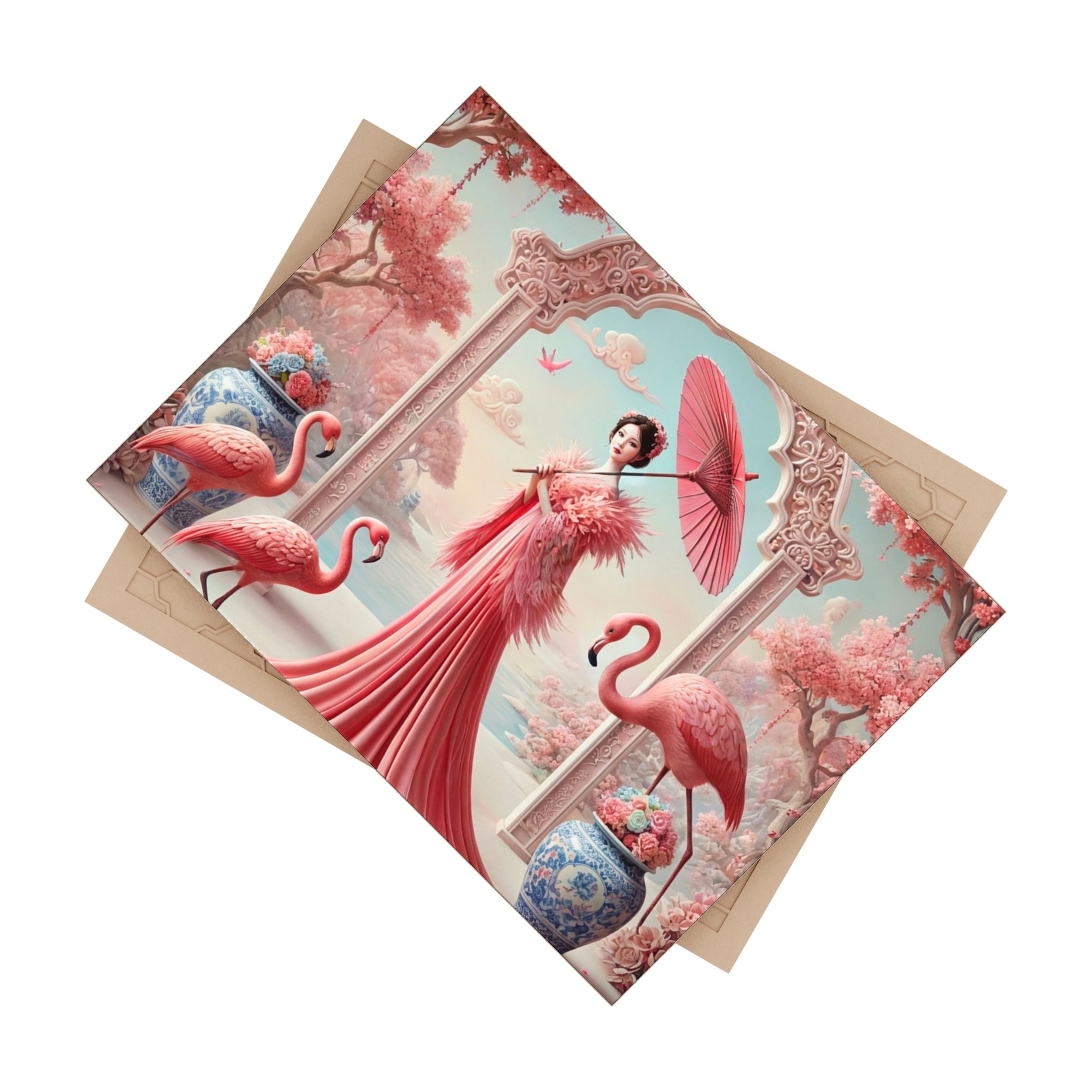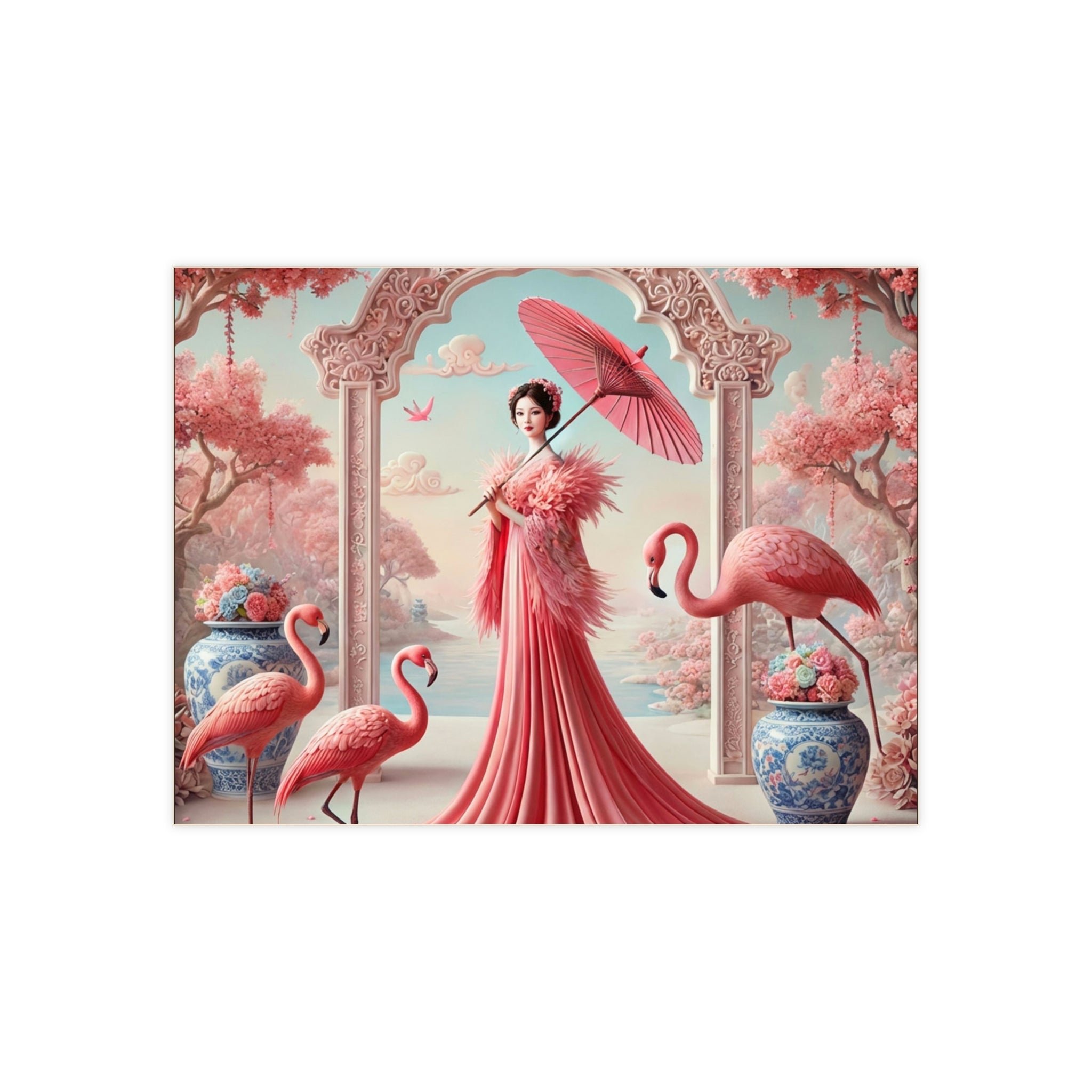 The tile features a serene garden scene in soft blush and rose tones. A poised female figure stands beneath an ornate arch holding a parasol, framed by porcelain details, drifting petals, and graceful flamingos. Calm water and pale clouds extend the composition into a dreamlike horizon, blending classical East Asian inspiration with romantic fantasy and quiet elegance.