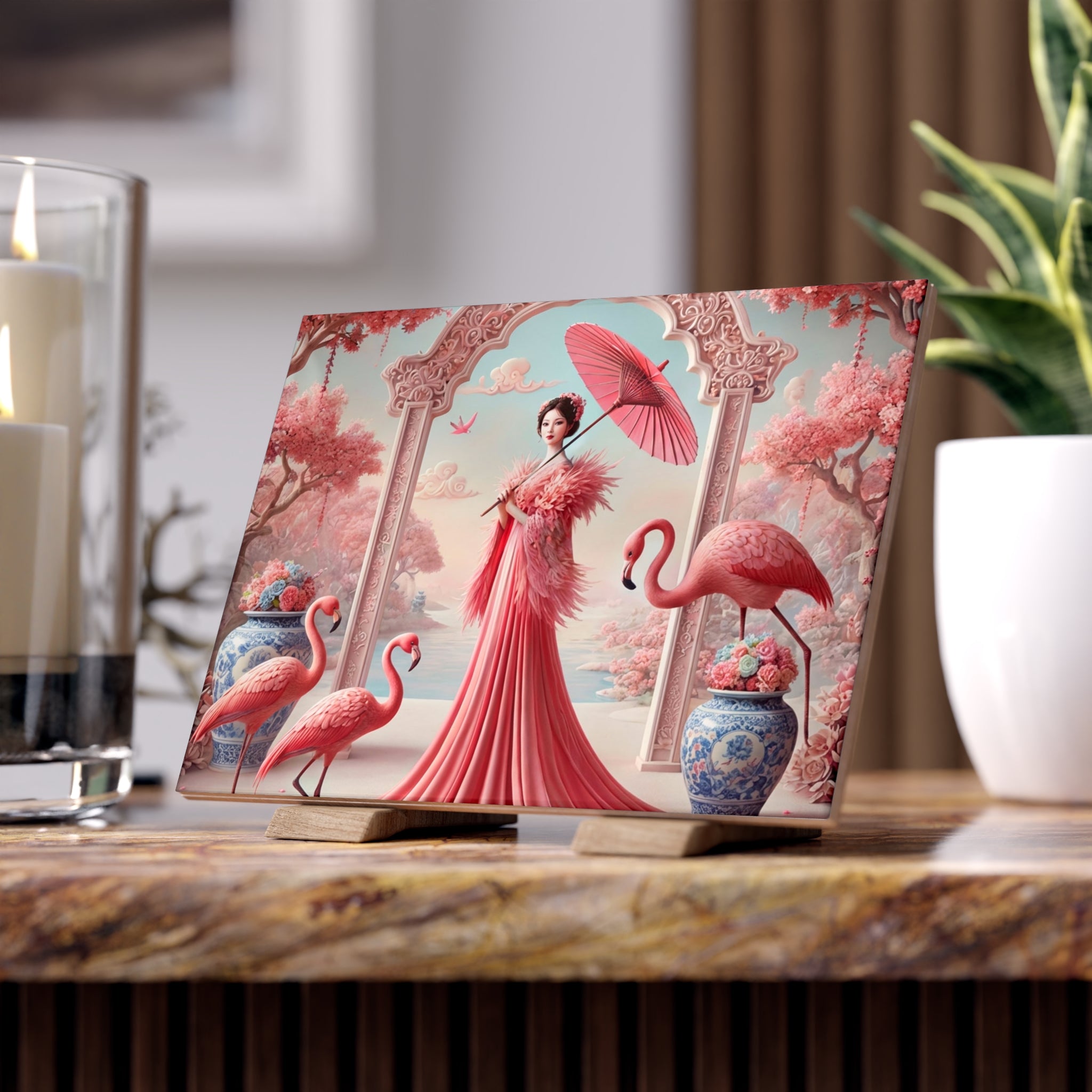 Petals, Porcelain, and Flamingos Ceramic Tile offers a refined way to display art in a clean, minimalist format, perfect for shelves, desks, mantels, or curated wall arrangements. Designed as a decorative accent, this ceramic tile is available in either a glossy or matte finish, allowing you to choose the look that best complements your space. Please note that any wooden stand shown in mockup images is not included.