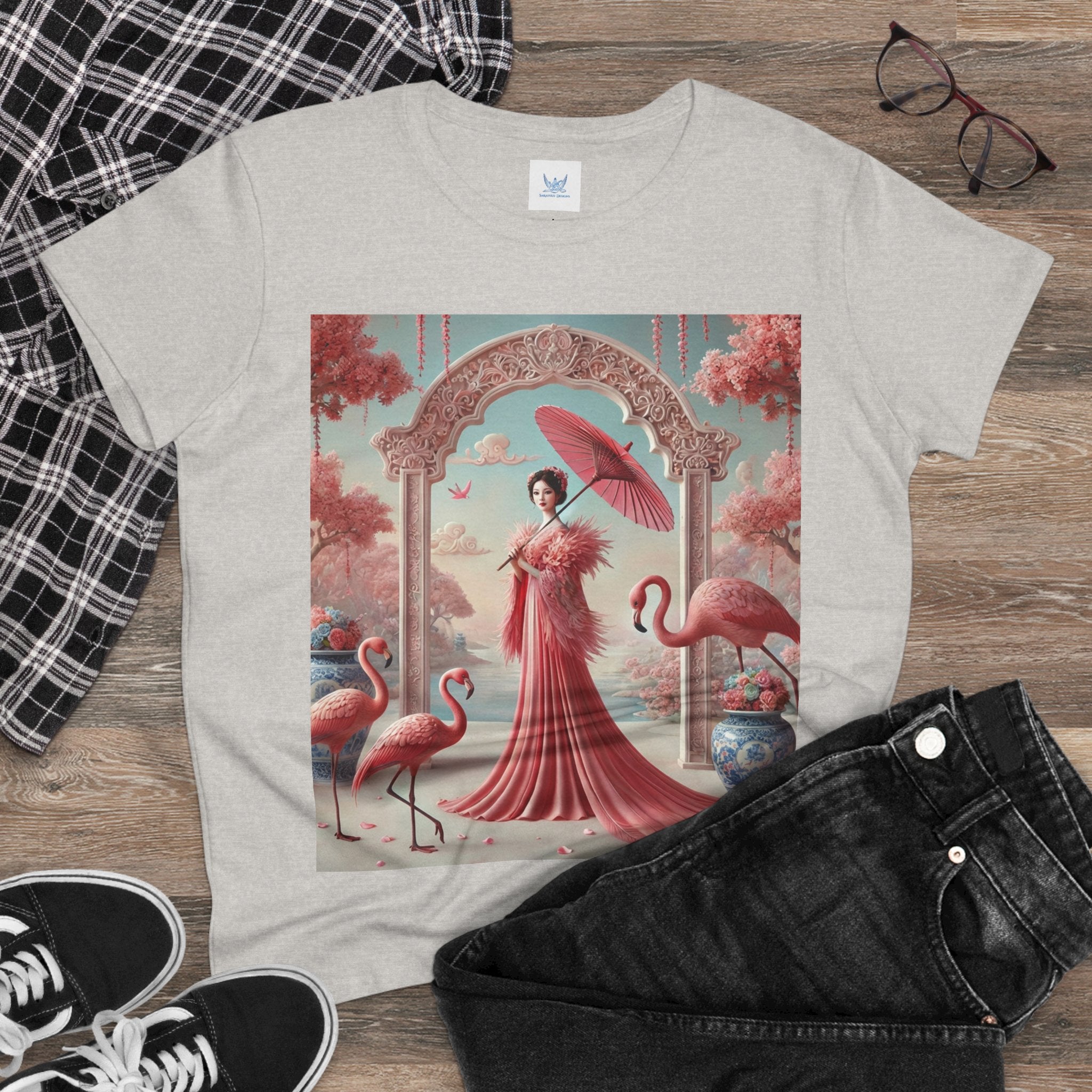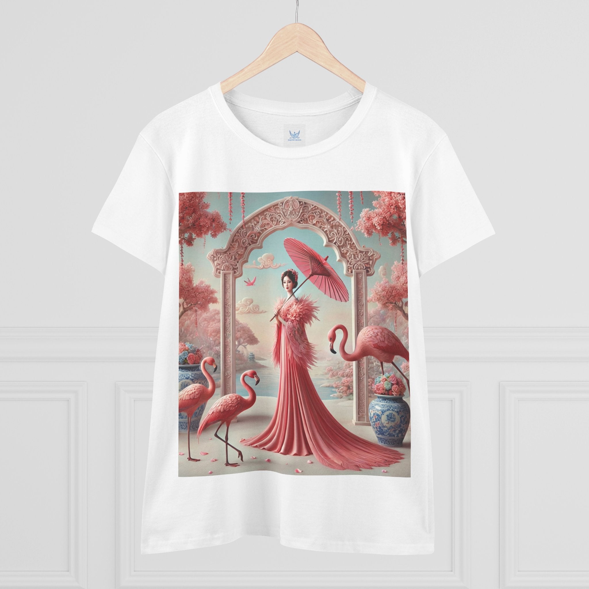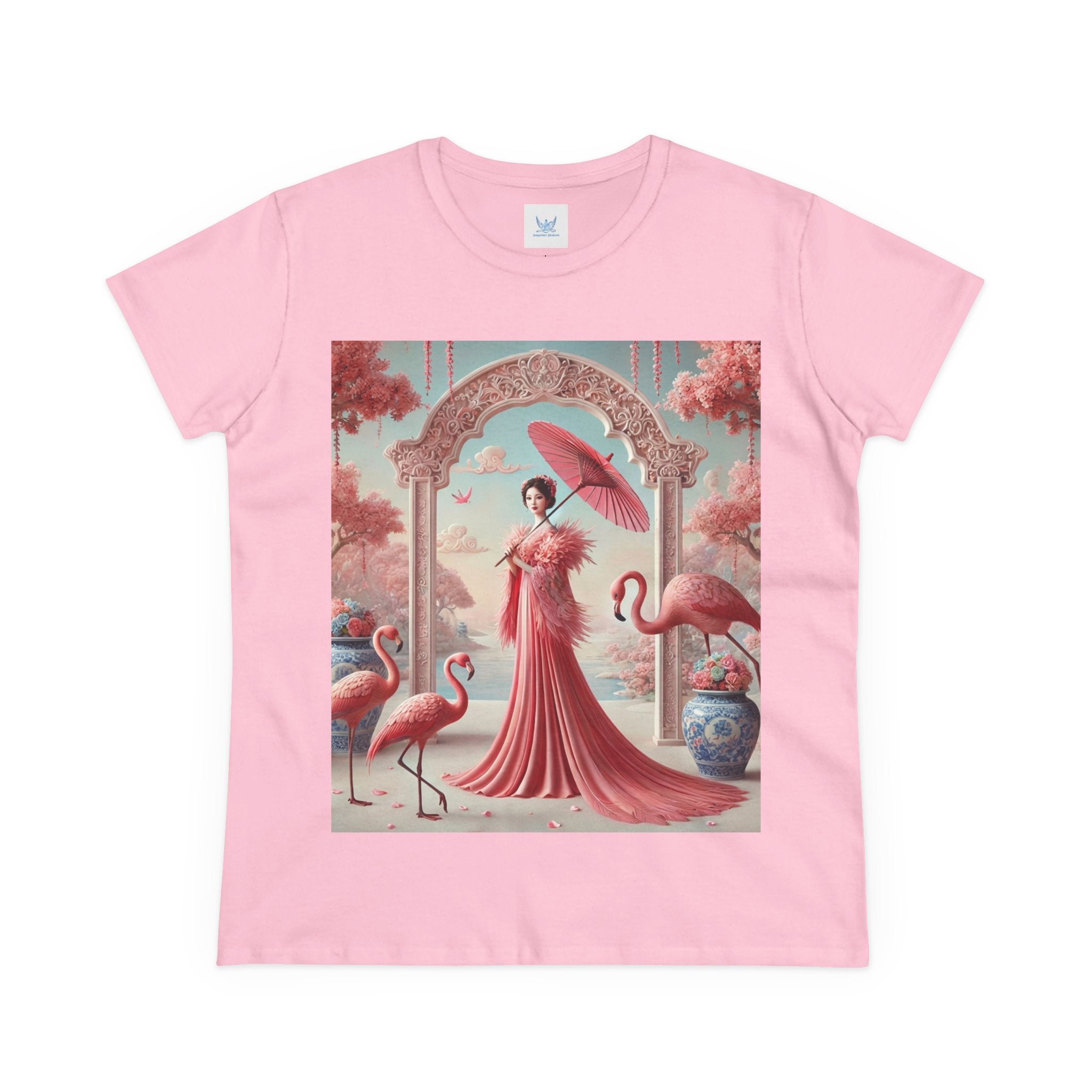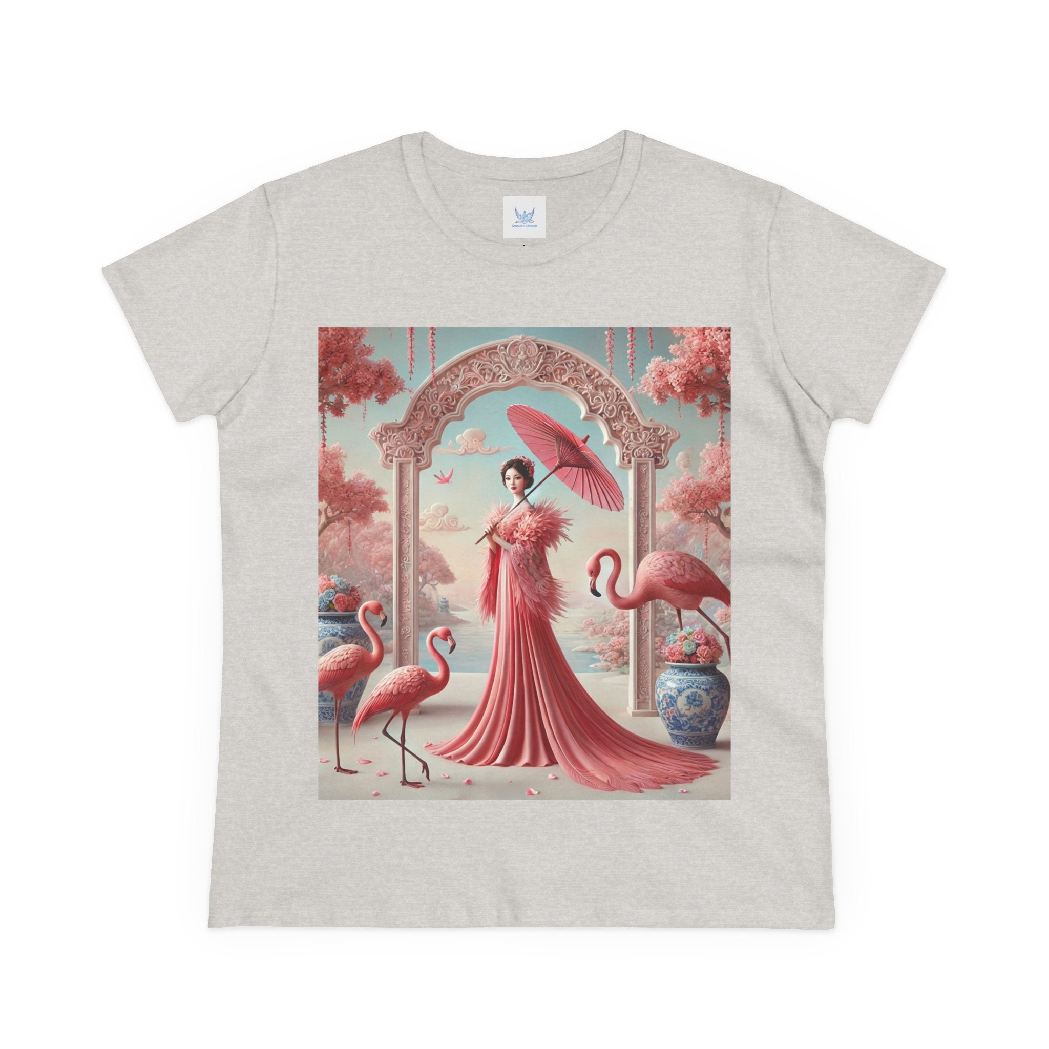 The artwork printed on the tee introduces a serene garden scene in gentle blush and rose tones. A poised female figure stands beneath an ornate arch holding a parasol, framed by porcelain details, drifting petals, and graceful flamingos. Calm water and pale clouds soften the background, blending classical East Asian inspiration with romantic fantasy to create a design that feels elegant, balanced, and quietly expressive.