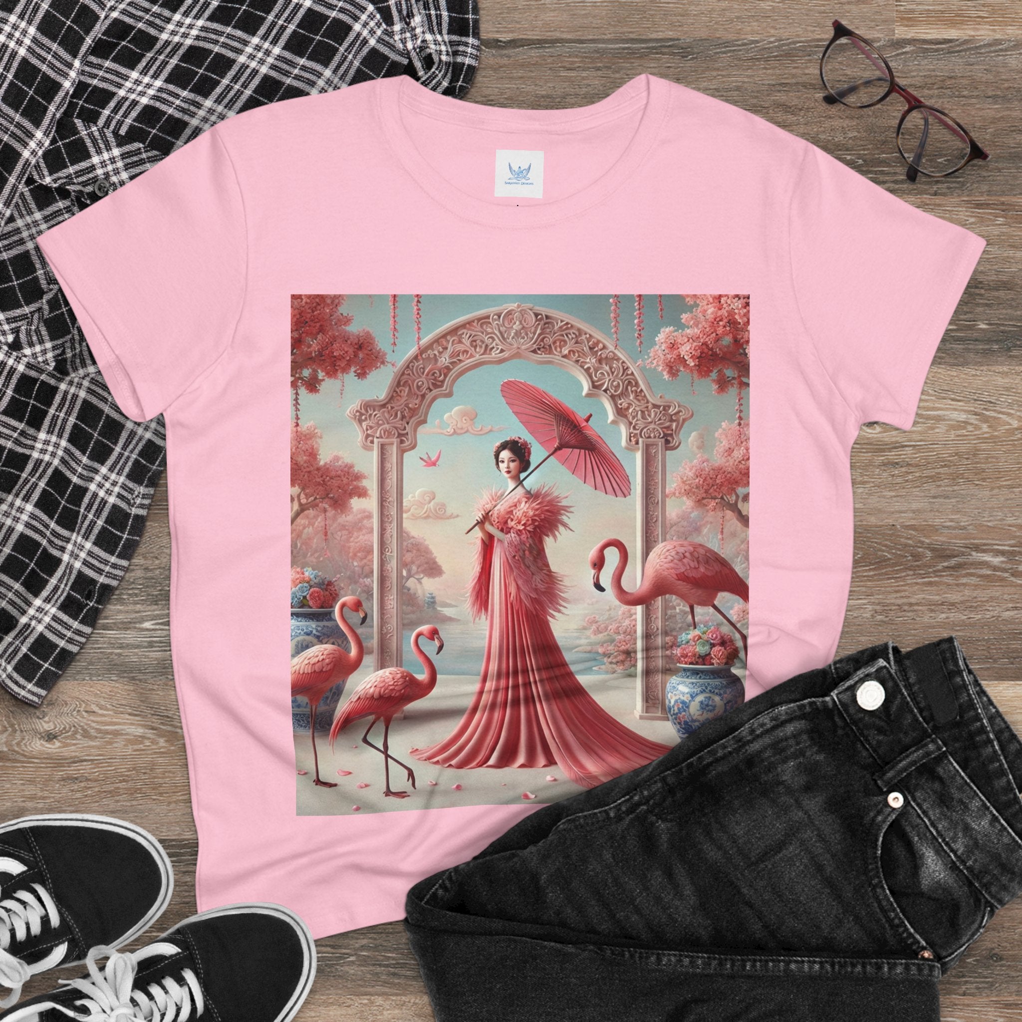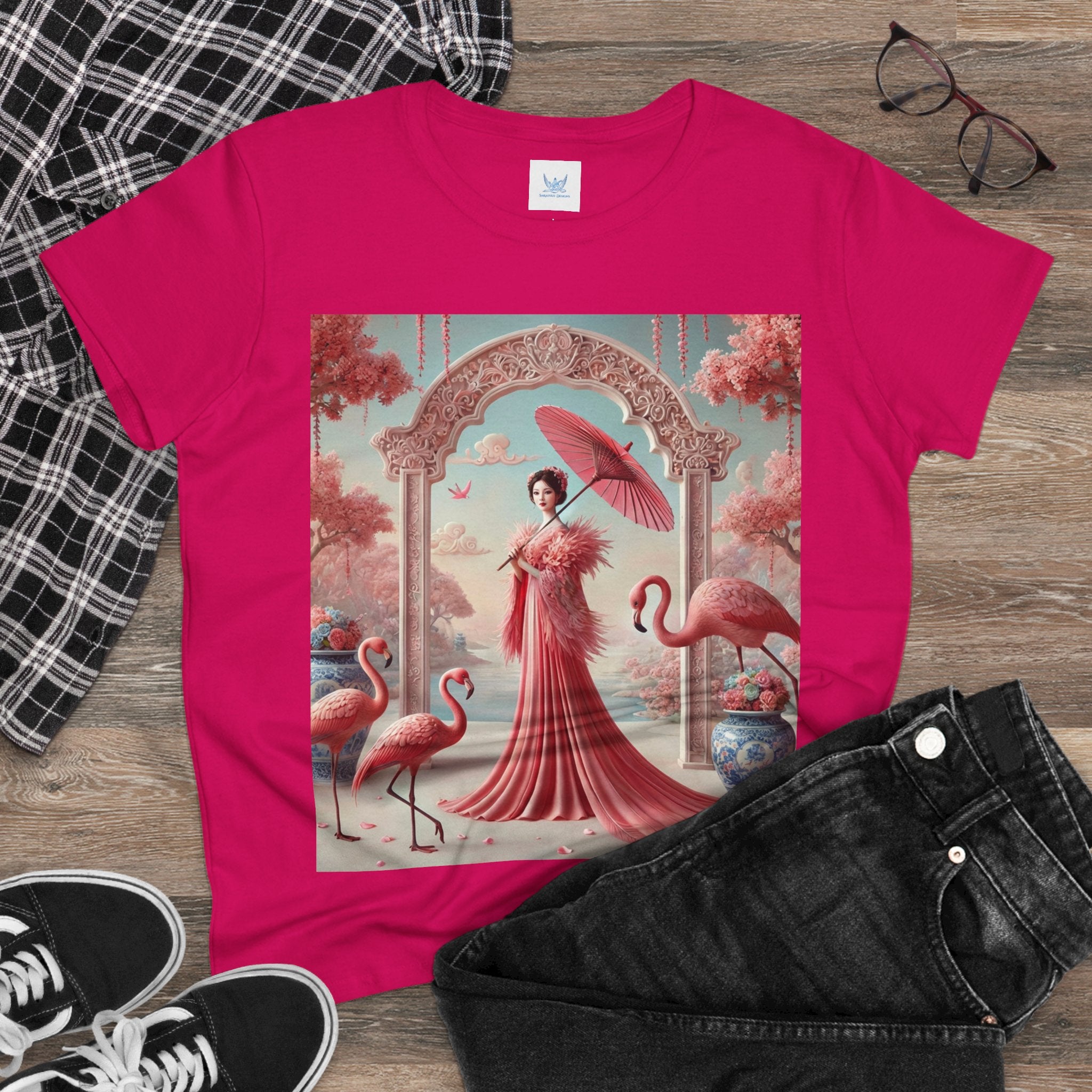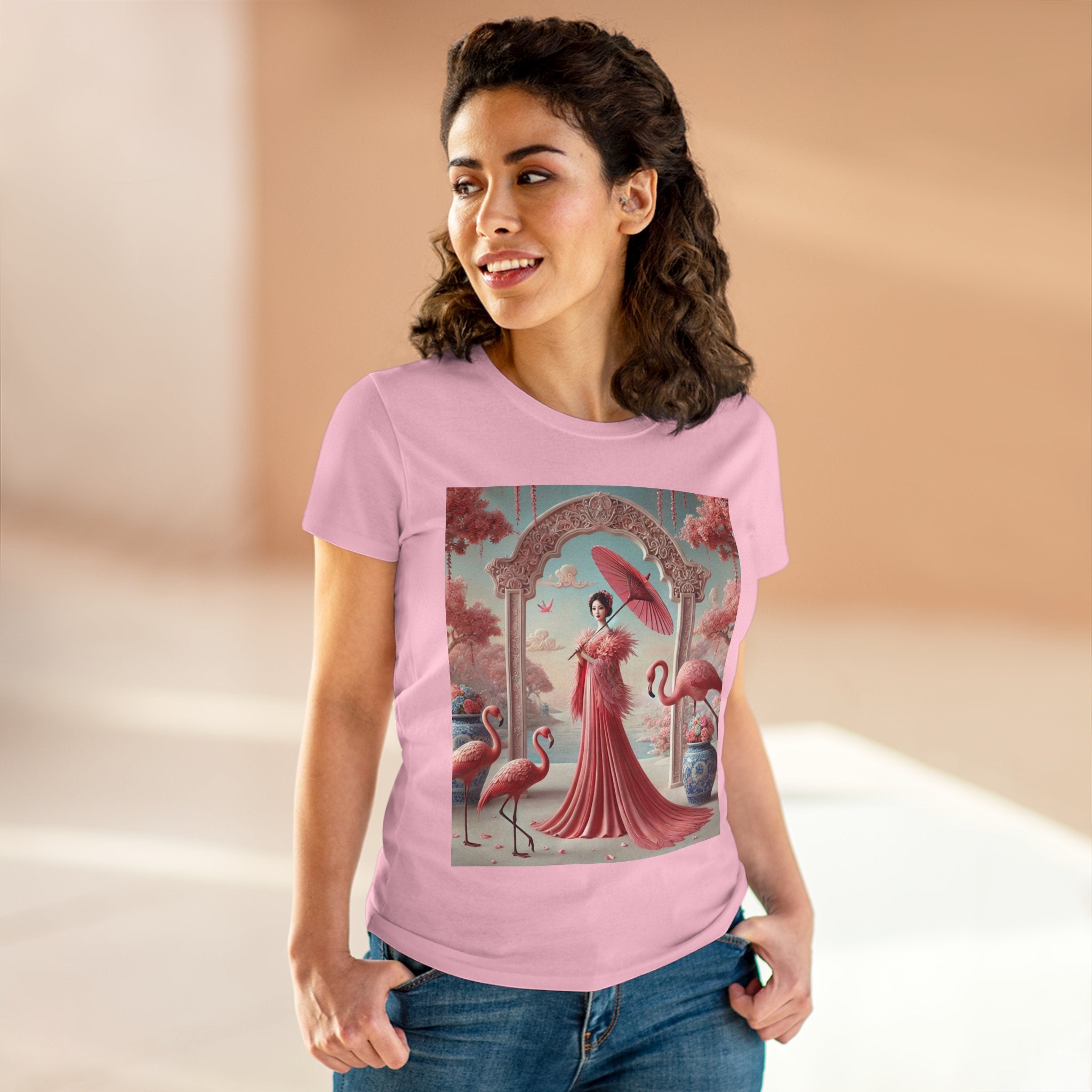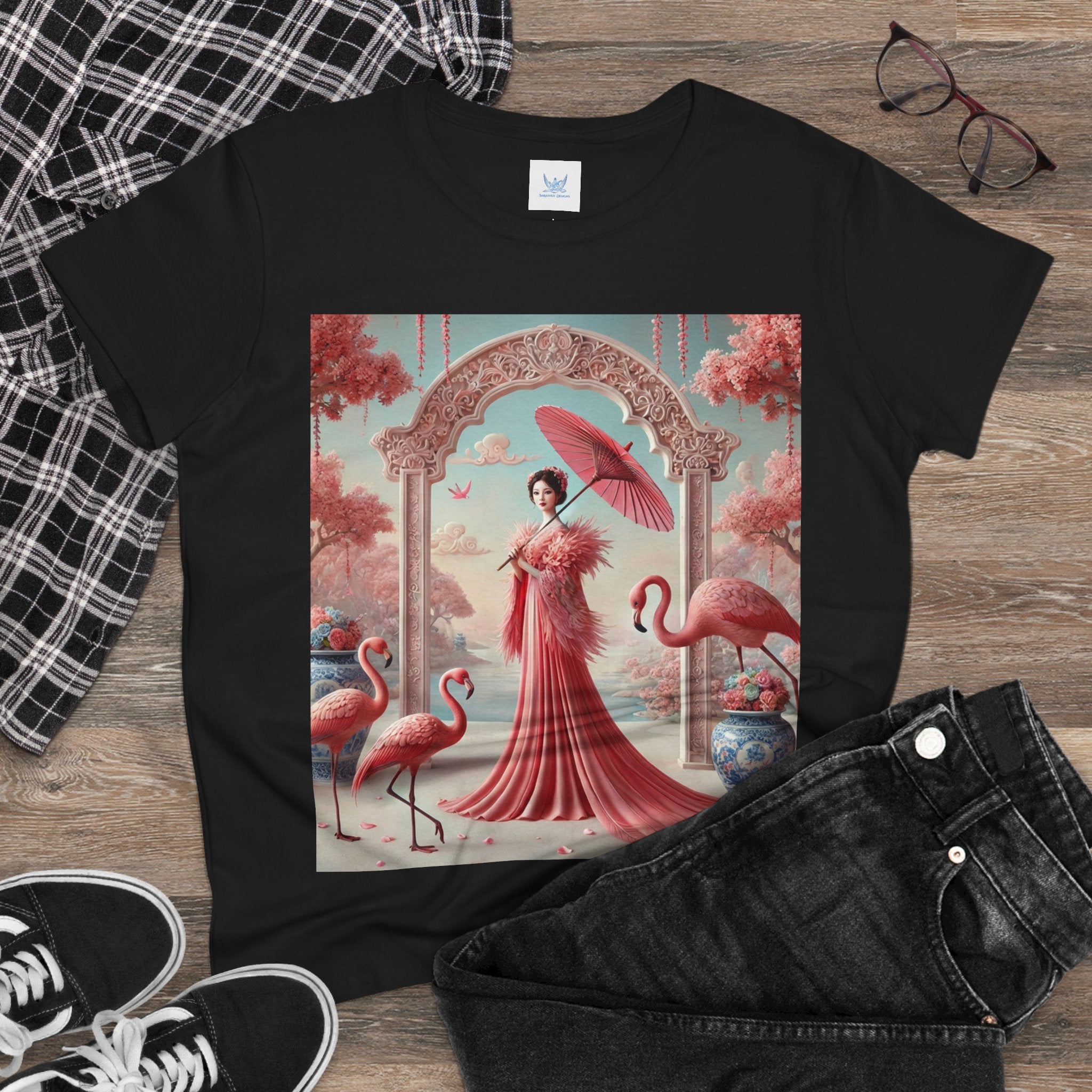 The artwork printed on the tee introduces a serene garden scene in gentle blush and rose tones. A poised female figure stands beneath an ornate arch holding a parasol, framed by porcelain details, drifting petals, and graceful flamingos. Calm water and pale clouds soften the background, blending classical East Asian inspiration with romantic fantasy to create a design that feels elegant, balanced, and quietly expressive.