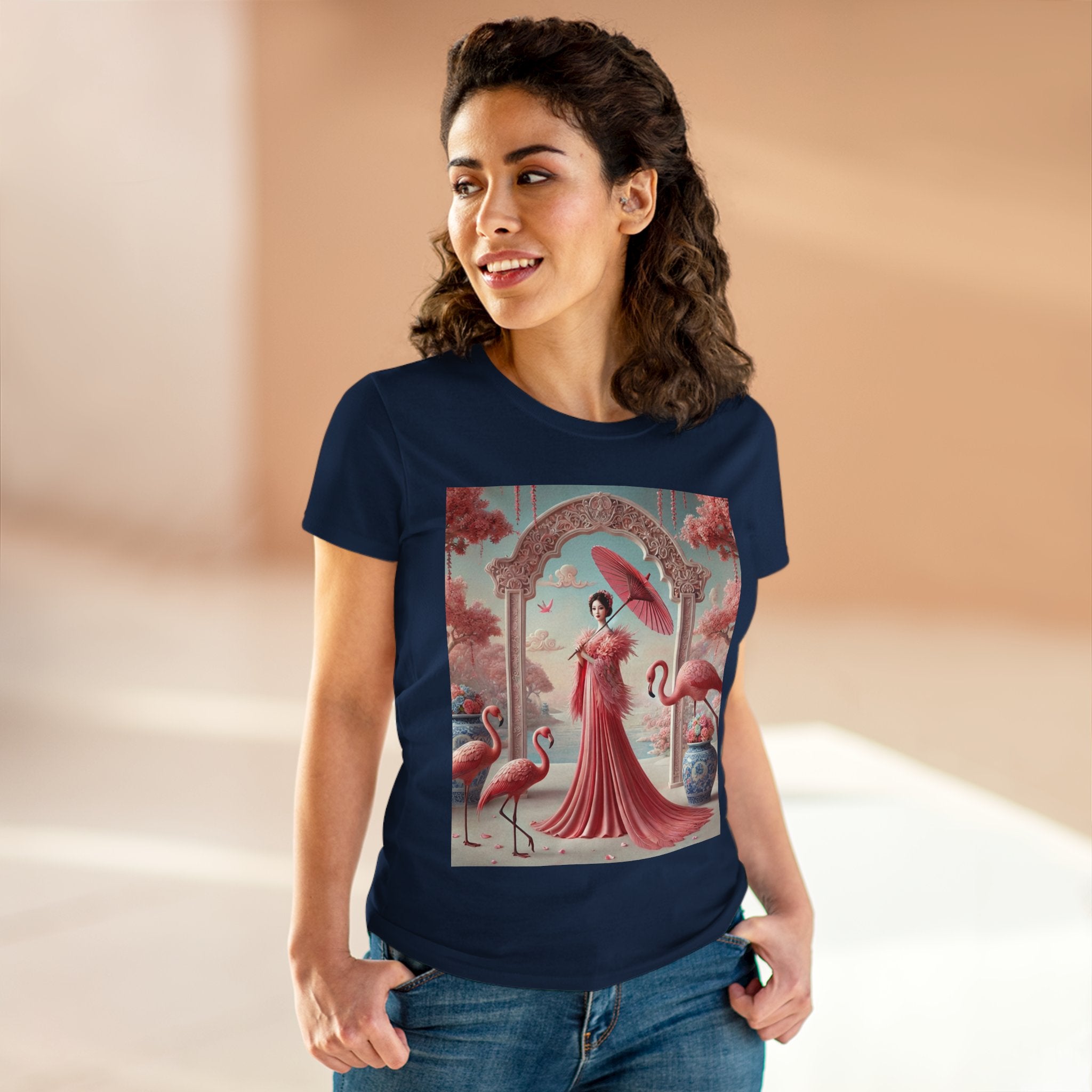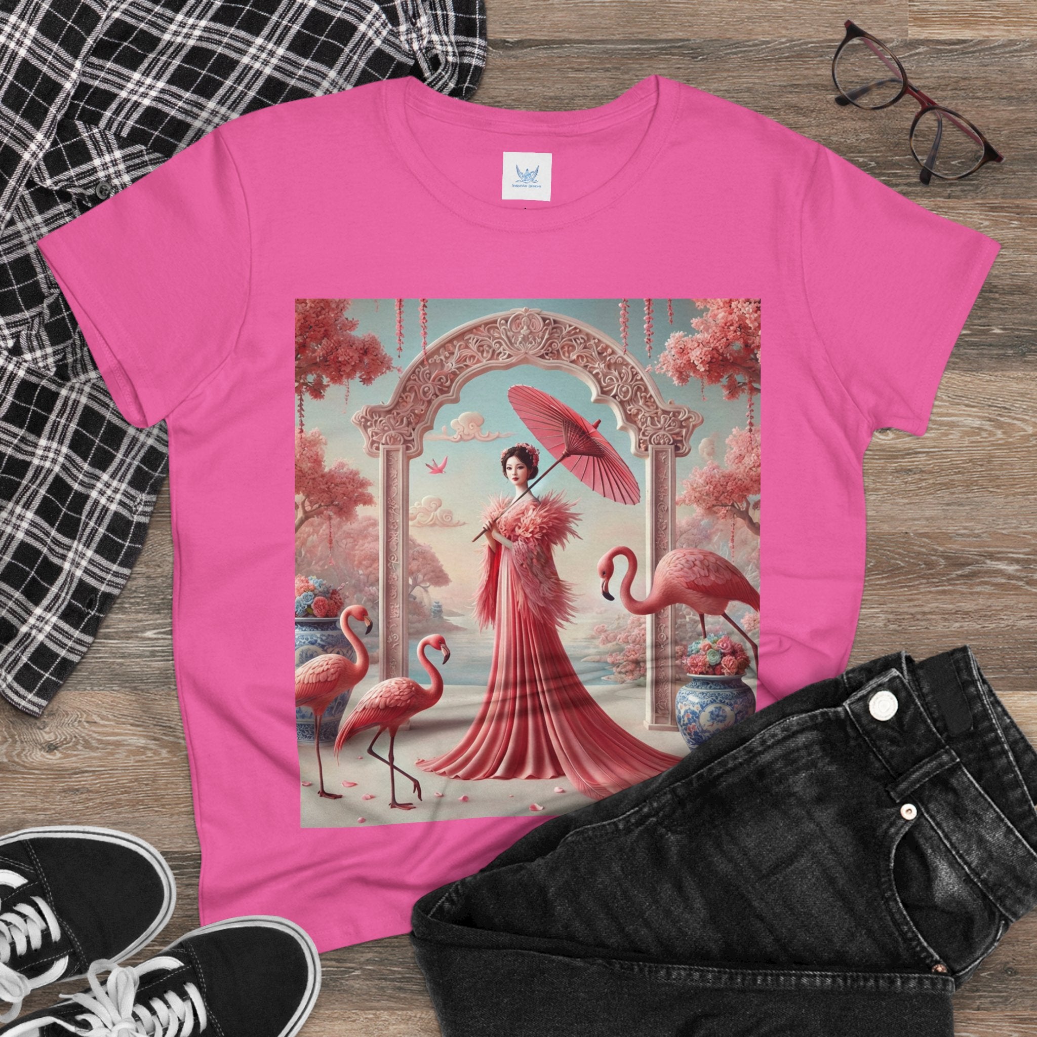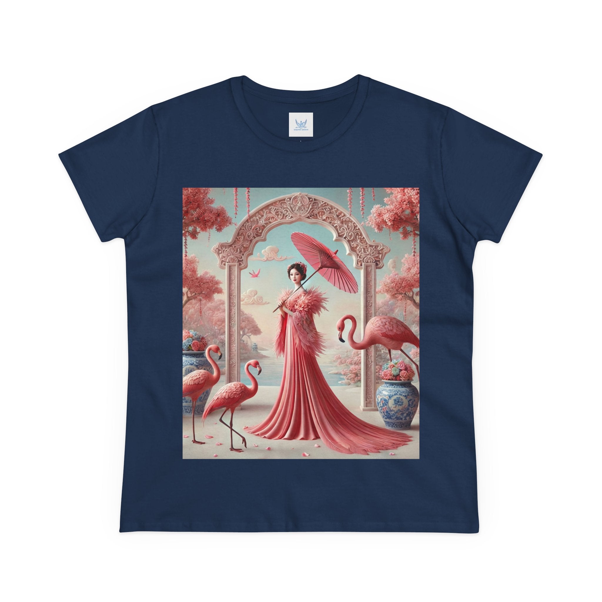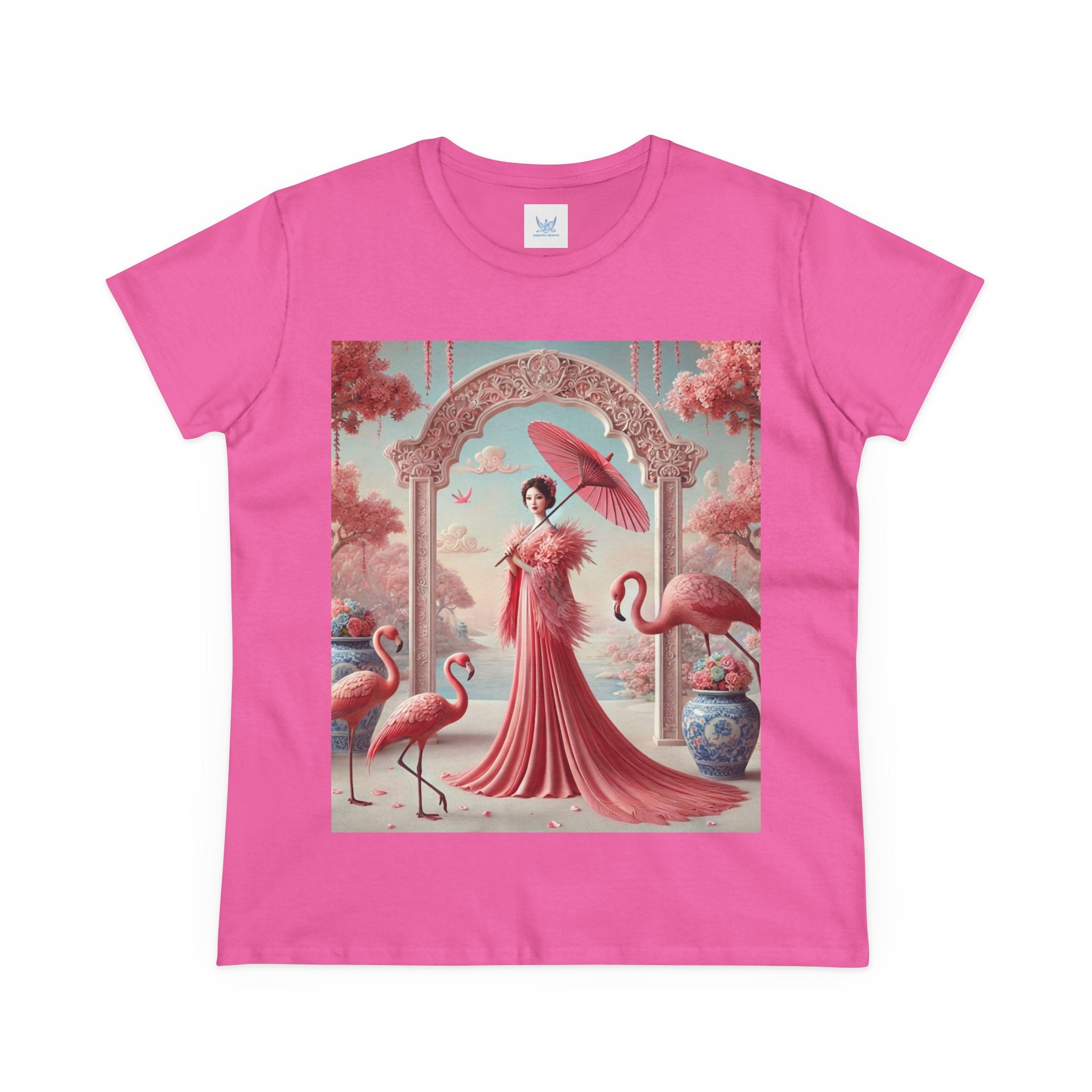 The artwork printed on the tee introduces a serene garden scene in gentle blush and rose tones. A poised female figure stands beneath an ornate arch holding a parasol, framed by porcelain details, drifting petals, and graceful flamingos. Calm water and pale clouds soften the background, blending classical East Asian inspiration with romantic fantasy to create a design that feels elegant, balanced, and quietly expressive.