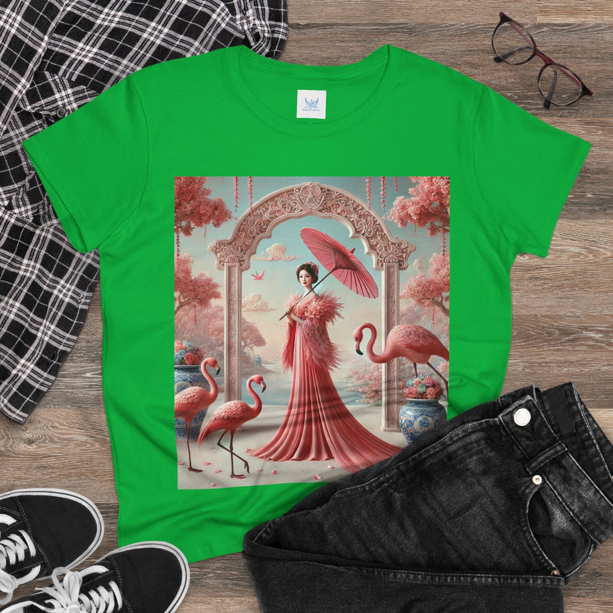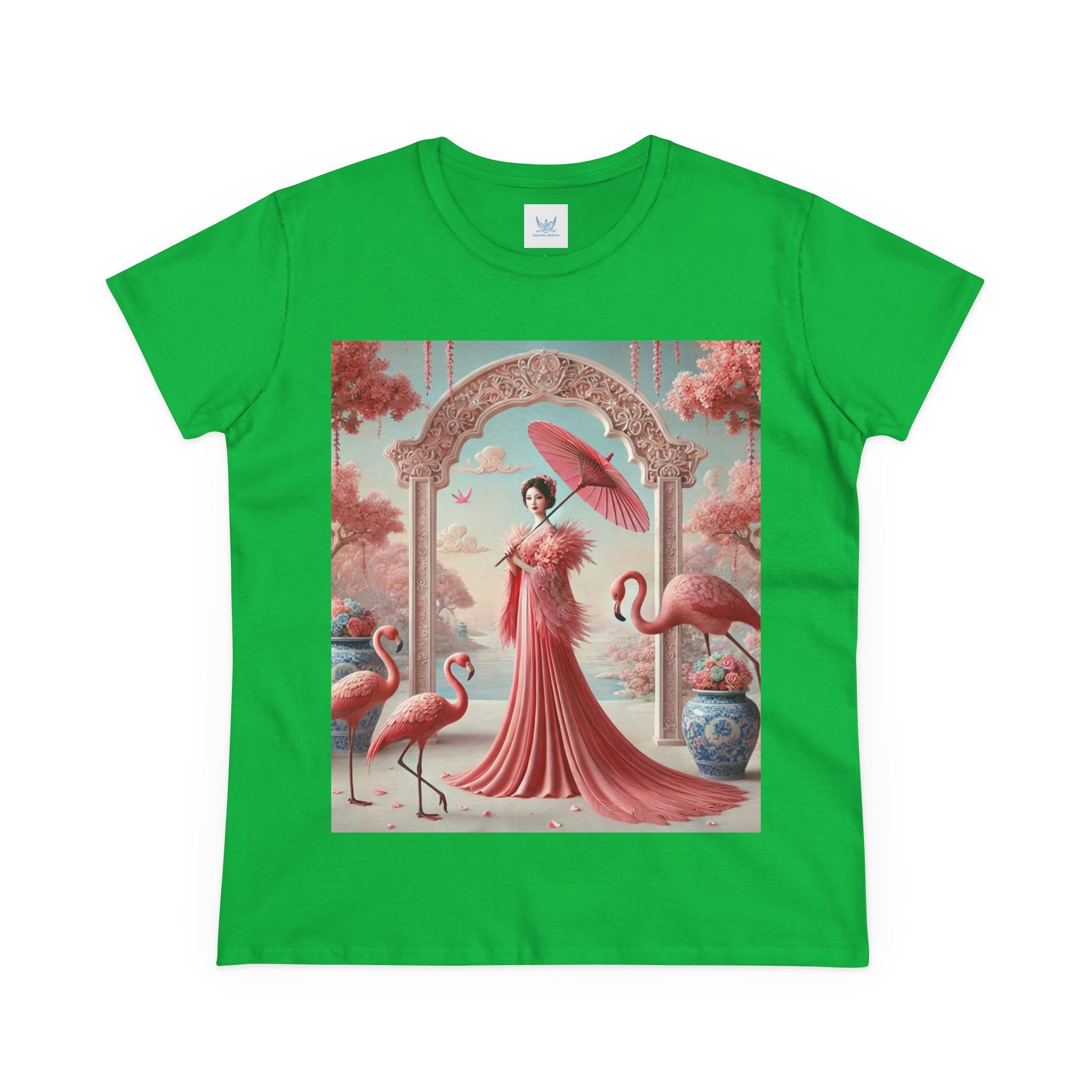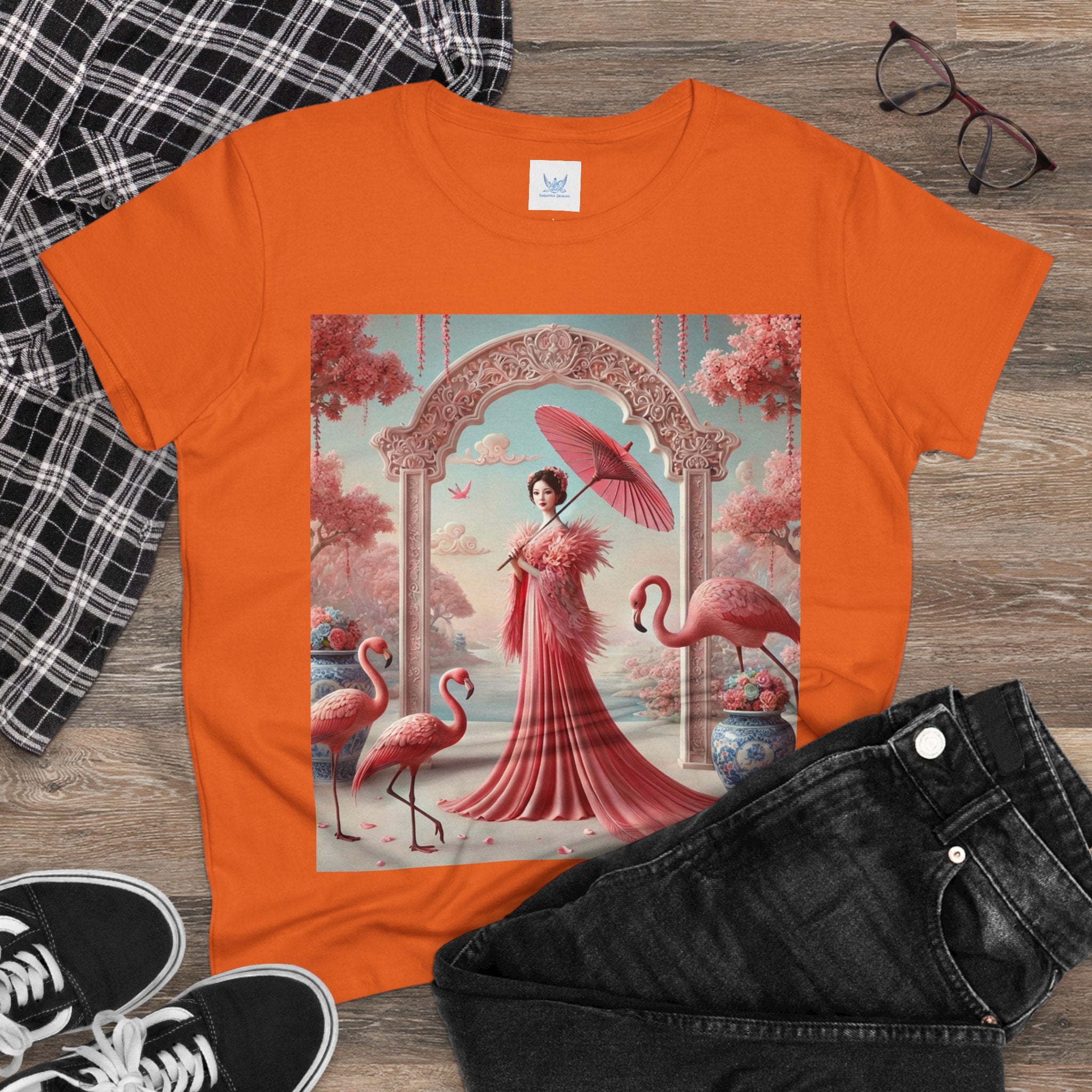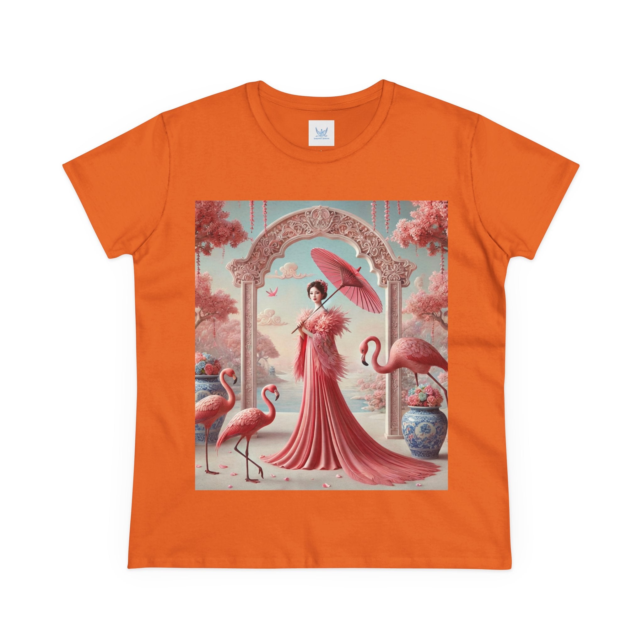 The artwork printed on the tee introduces a serene garden scene in gentle blush and rose tones. A poised female figure stands beneath an ornate arch holding a parasol, framed by porcelain details, drifting petals, and graceful flamingos. Calm water and pale clouds soften the background, blending classical East Asian inspiration with romantic fantasy to create a design that feels elegant, balanced, and quietly expressive.