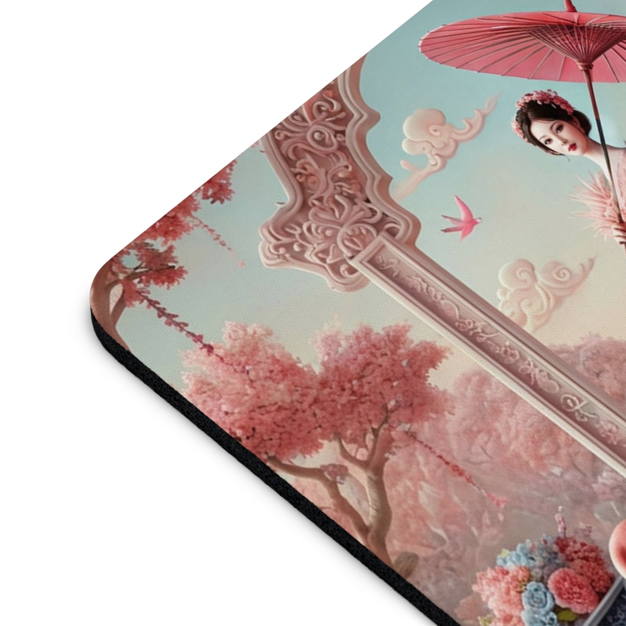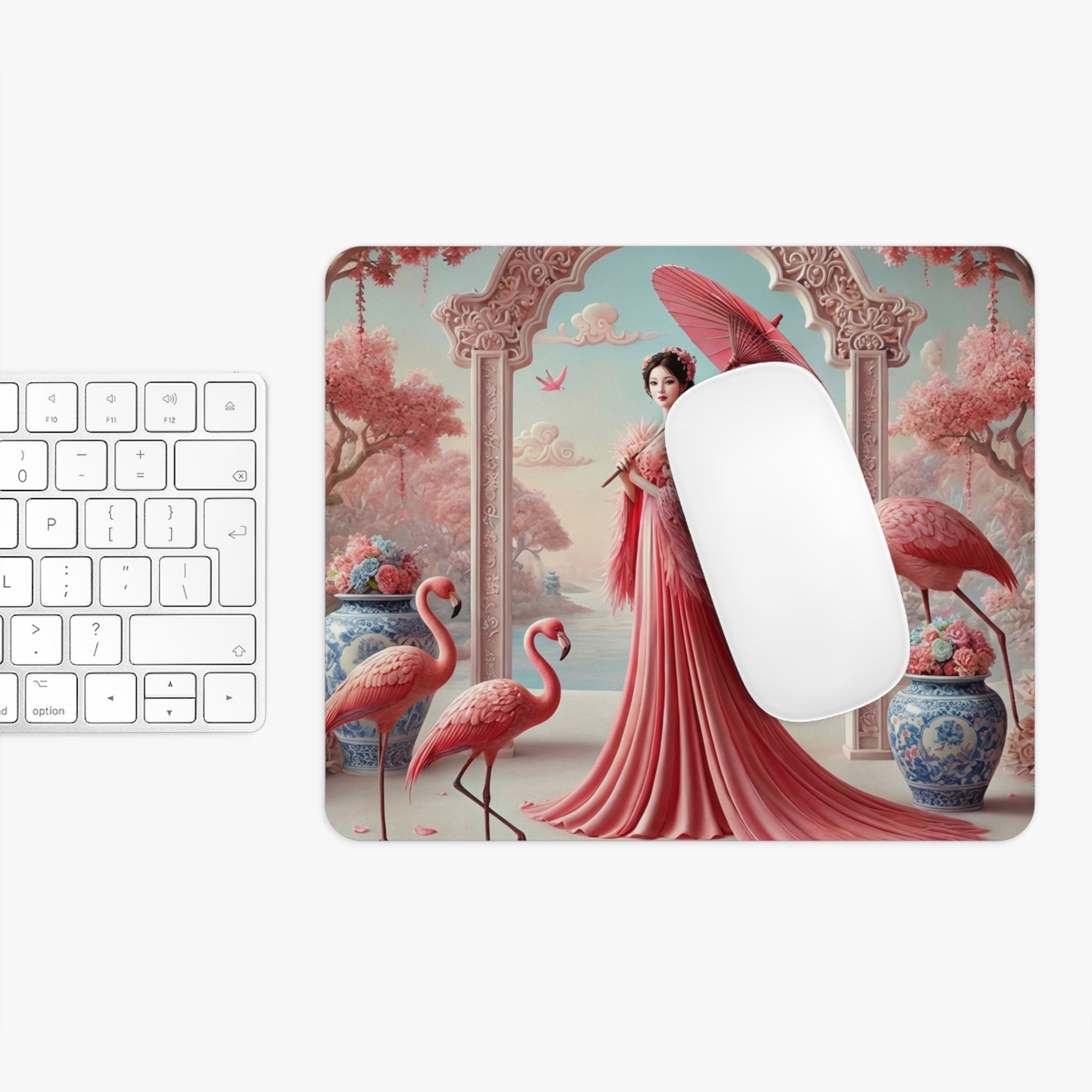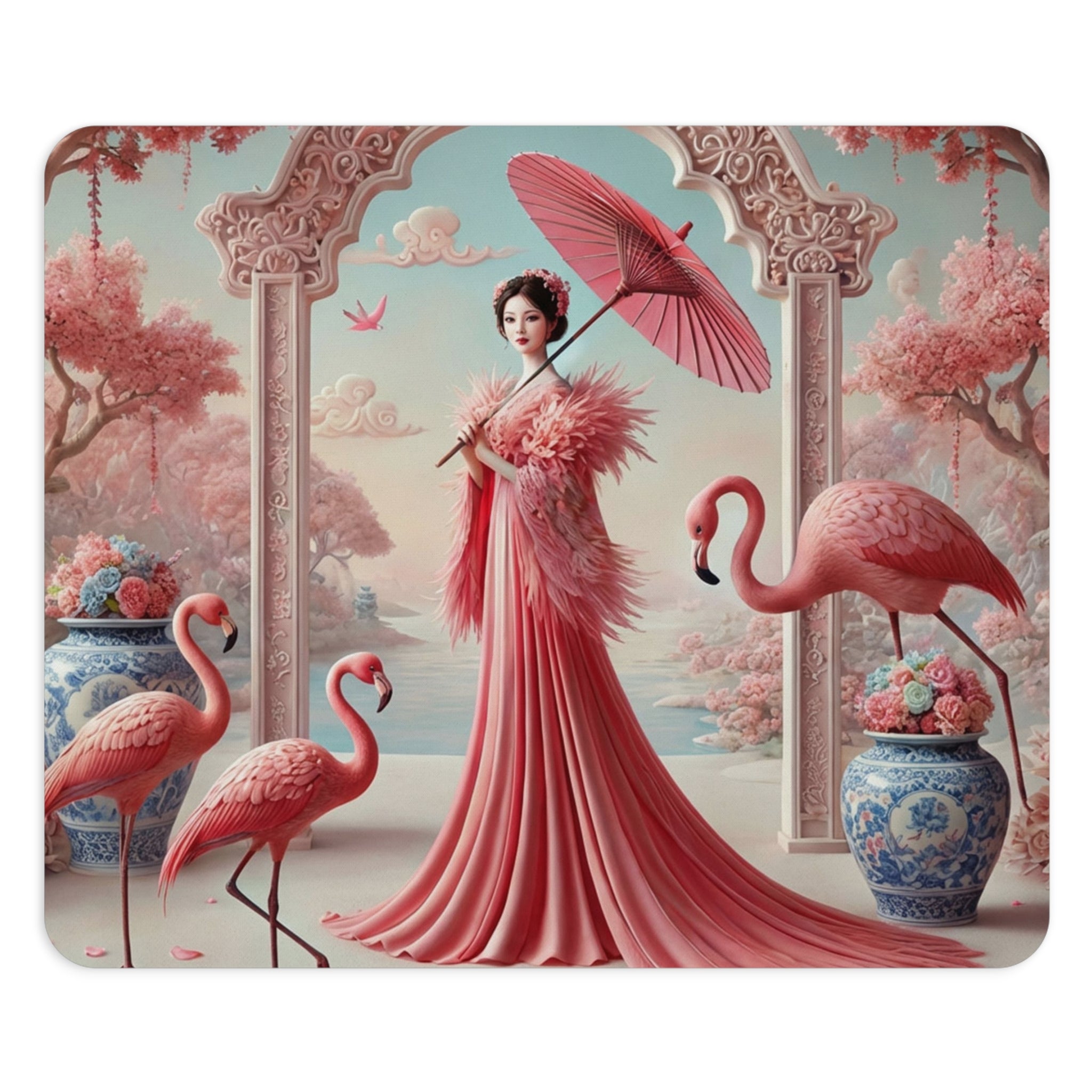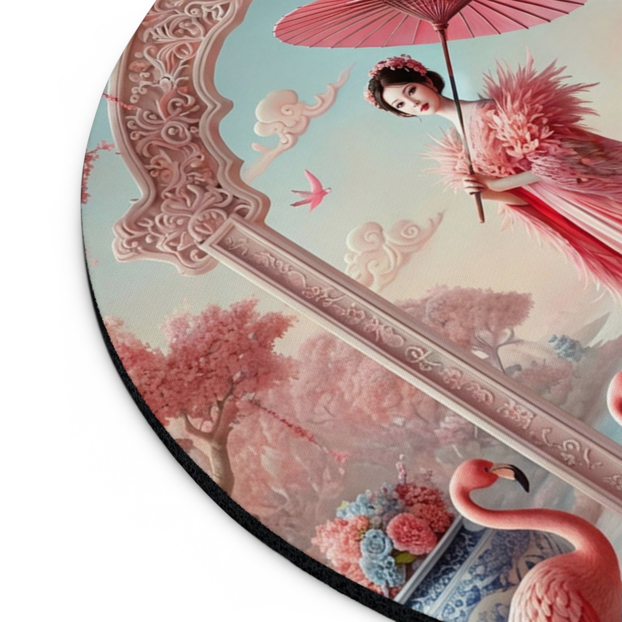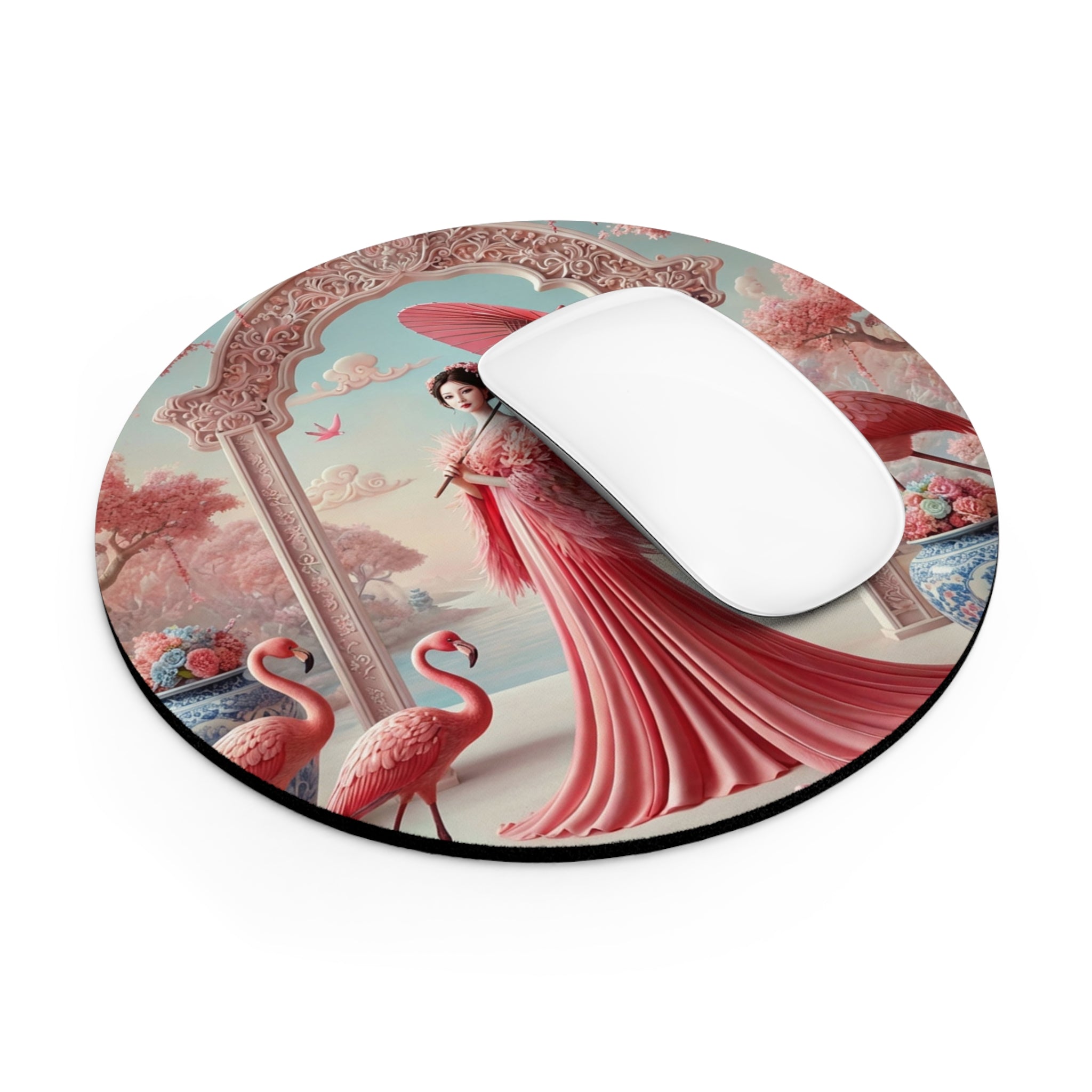 Petals, Porcelain, and Flamingos Mouse Pad brings romantic garden elegance to your desk, turning everyday work into a more beautiful ritual. Available in two shapes—round or rectangular—this mouse pad is any laptop’s dream companion, designed to breathe color into a cubicle, workspace, or home office while staying comfortable and dependable throughout the day.