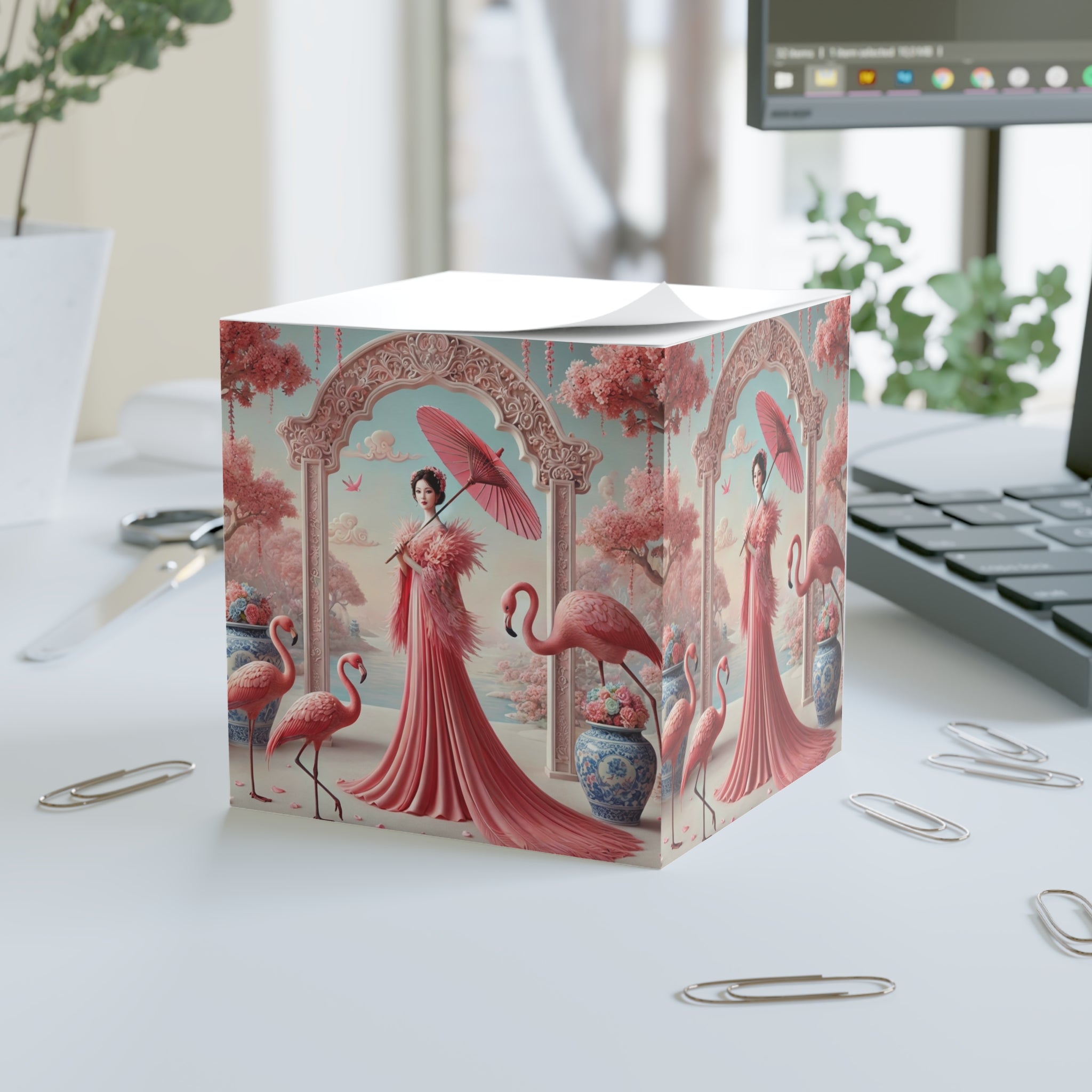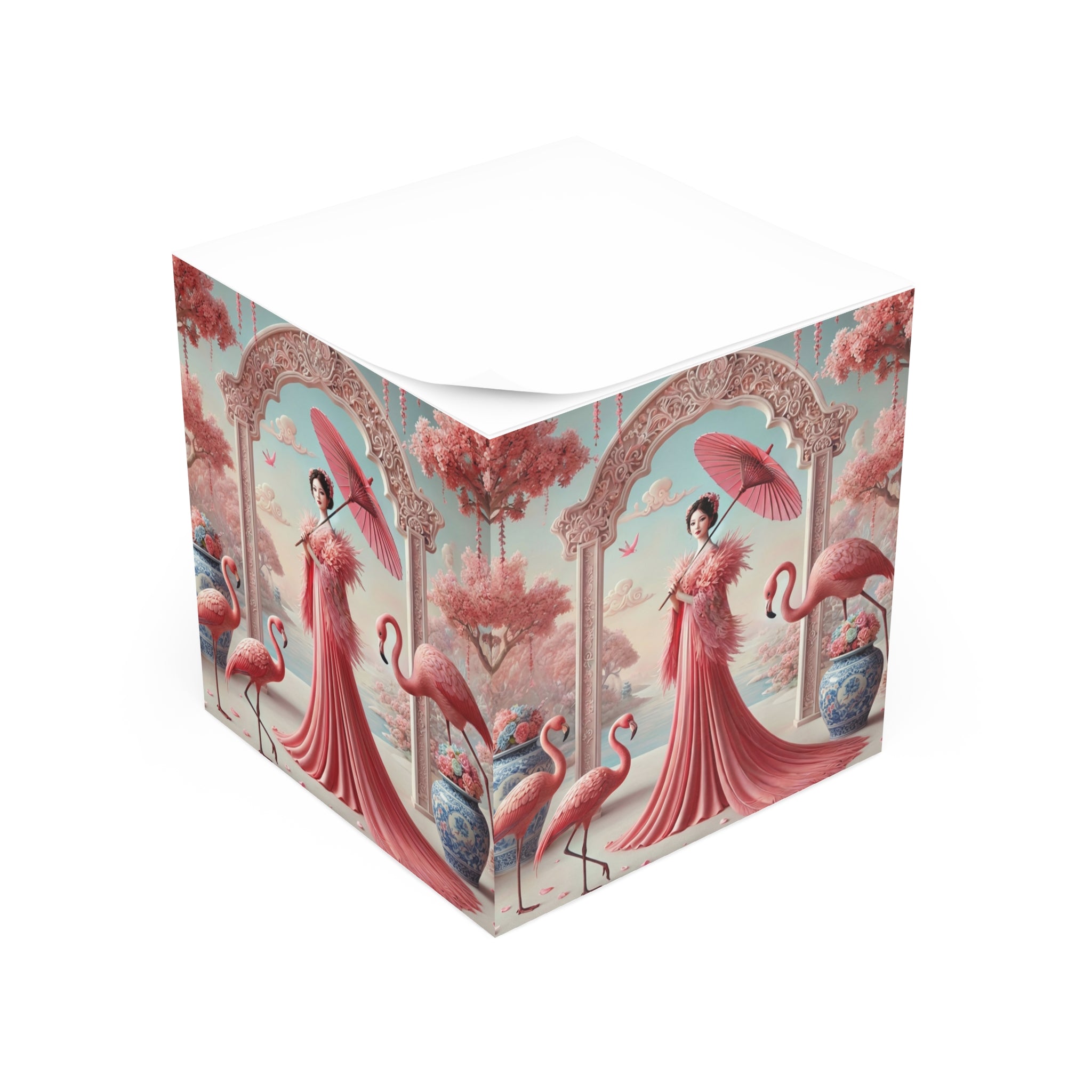 Petals, Porcelain, and Flamingos Note Cube blends everyday organization with refined artistry, turning a simple desk essential into a decorative accent. Designed for jotting quick thoughts, lists, or reminders, this sticky note cube brings elegance to your workspace while keeping 700 adhesive sheets close at hand, making it as practical as it is visually captivating.