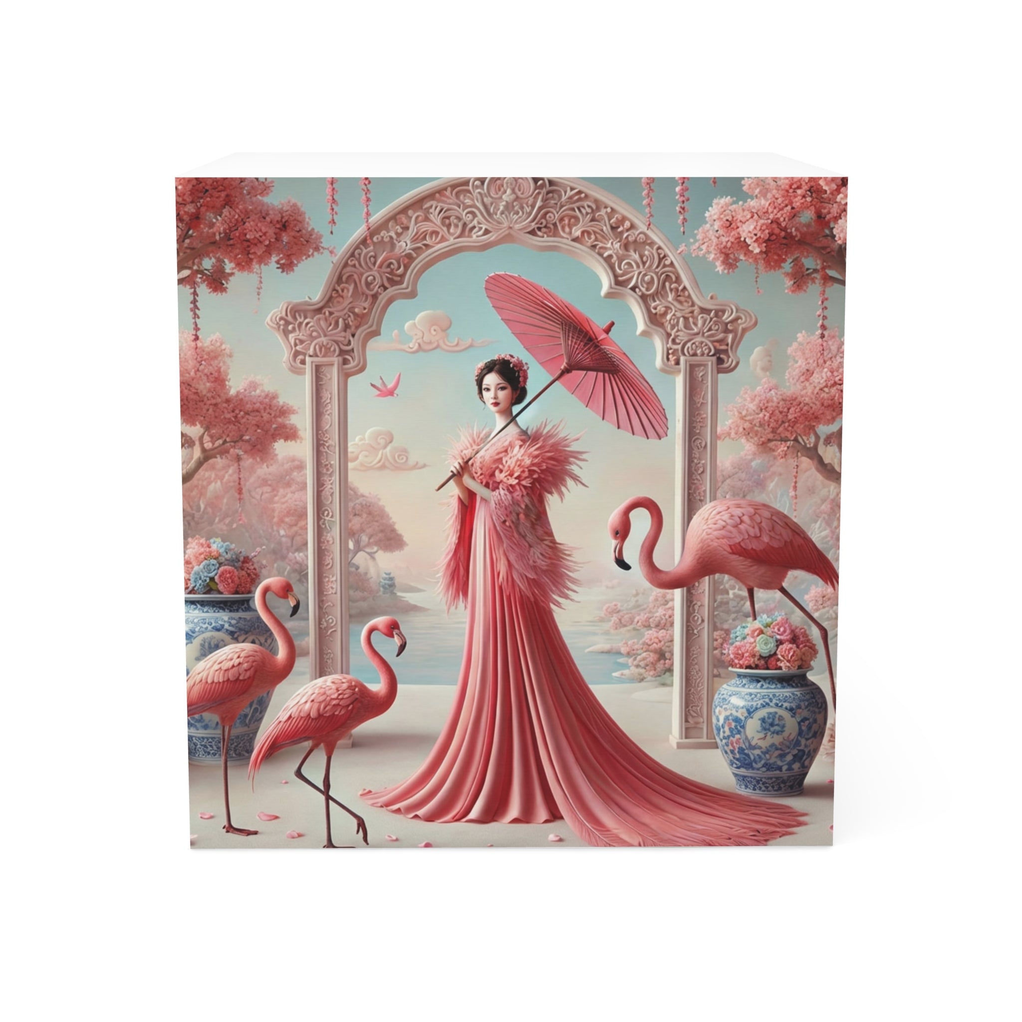 The artwork unfolds around the cube with a poised female figure beneath an ornate garden arch, dressed in flowing blush and rose tones that echo the surrounding blossoms. Porcelain vases filled with flowers anchor the scene, while graceful flamingos introduce a gentle note of whimsy and ceremony. Soft skies, calm water, and a harmonious palette of pinks and corals blend classical East Asian inspiration with romantic fantasy, creating a serene atmosphere that elevates daily routines.