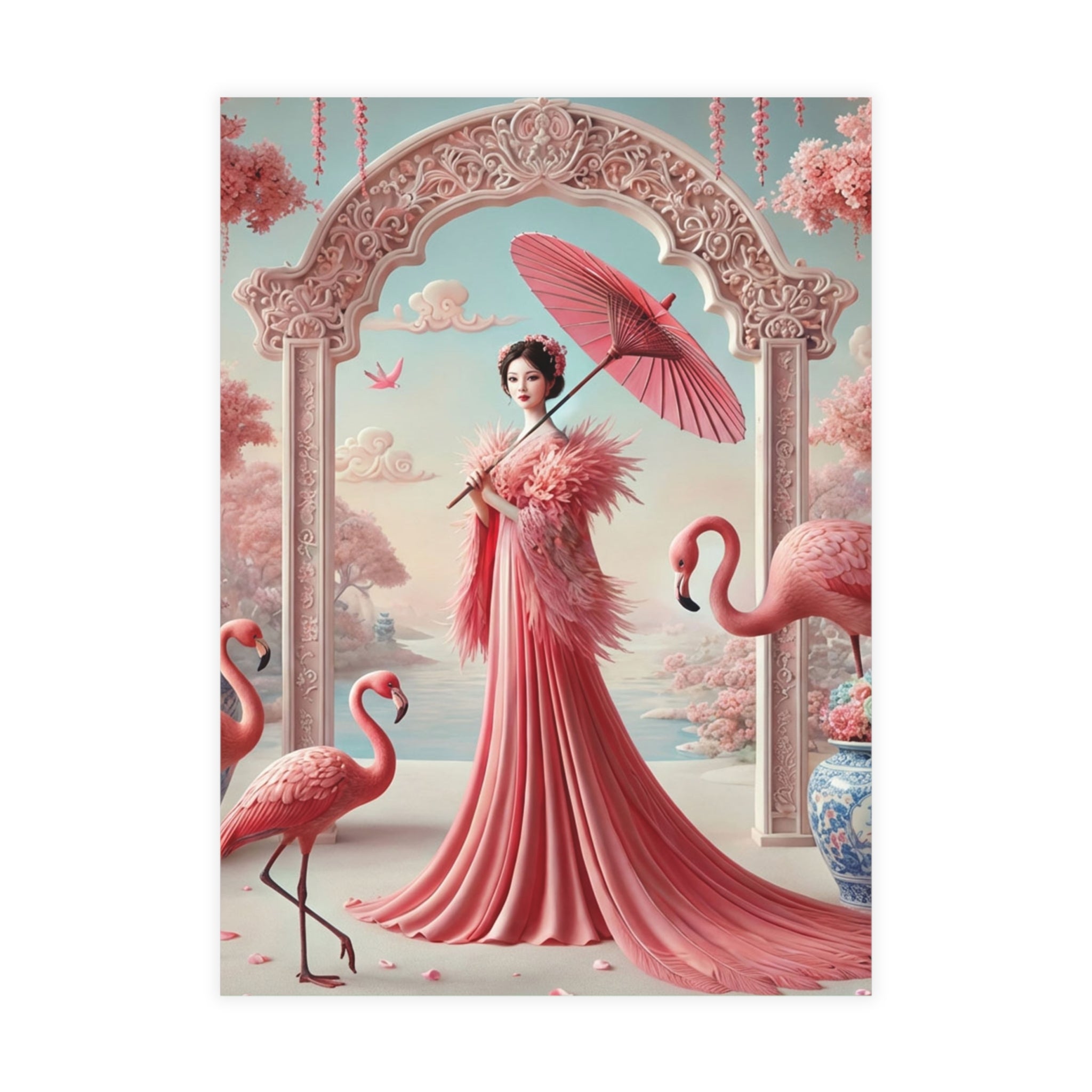 The artwork shows a poised female figure beneath an ornate garden arch in soft blush tones, accompanied by porcelain details, drifting petals, and graceful flamingos. Calm water and pale clouds create a serene, dreamlike setting inspired by classical East Asian aesthetics and romantic fantasy.