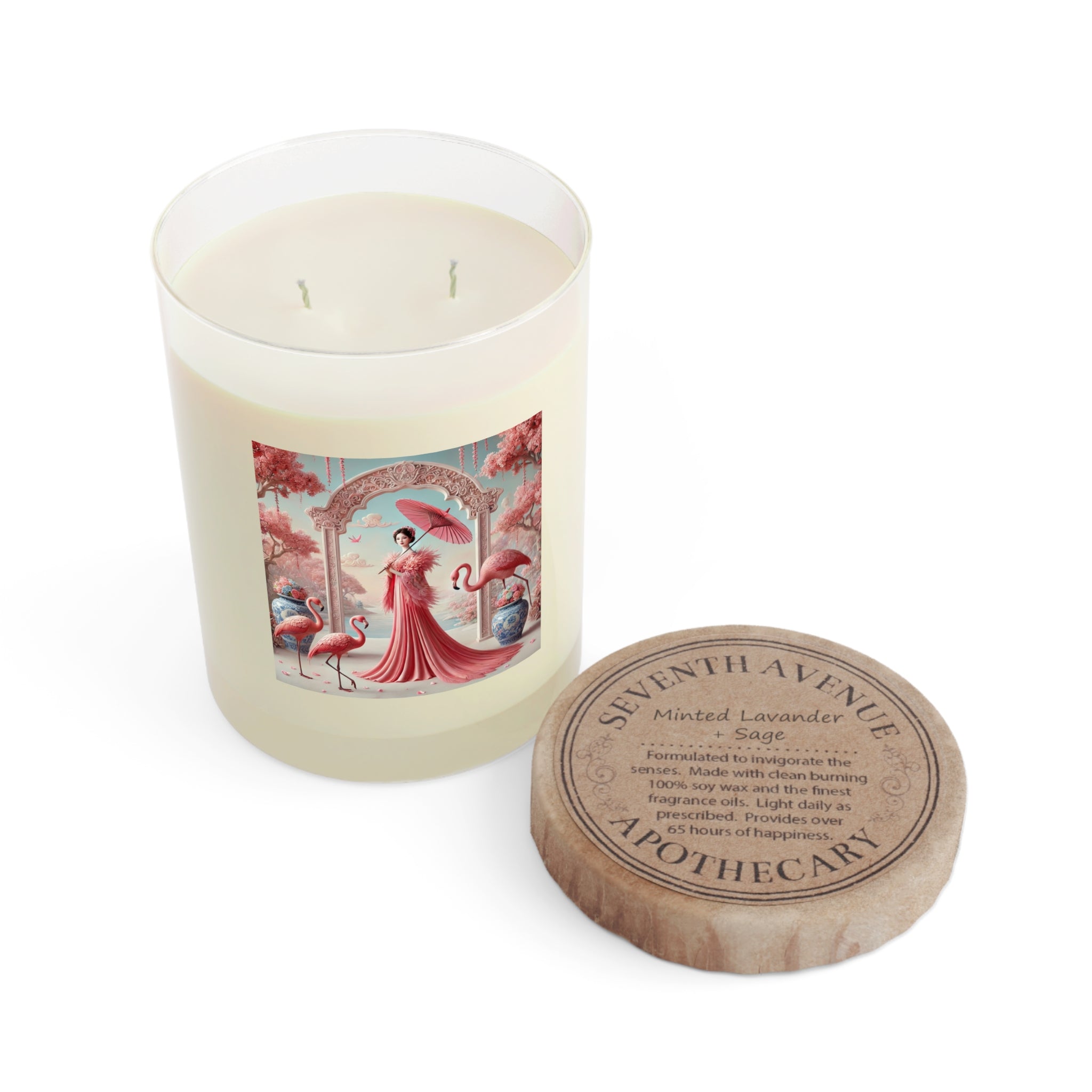 Petals, Porcelain, and Flamingos Scented Candle – Full Glass, 11oz is designed to invite calm into your space, pairing soothing fragrance with an elegant visual presence. Crafted for moments of pause and reflection, this Seventh Avenue candle is poured into a full glass vessel and made with 100% food-grade soy wax and premium fragrance oils. Phthalate- and lead-free, it offers a clean, even burn of approximately 65 hours, while the artwork is printed directly onto the glass for a refined, seamless finish. Available in Minted Lavender & Sage, White Tea & Fig, and Ocean Mist & Moss, each scent enhances the candle’s tranquil character.