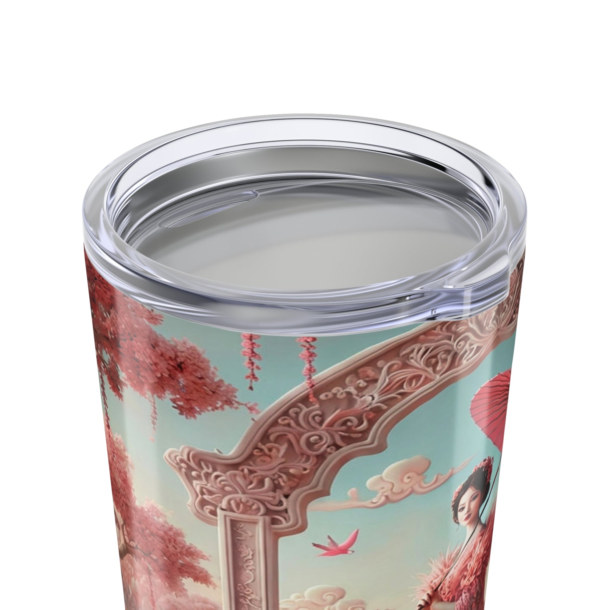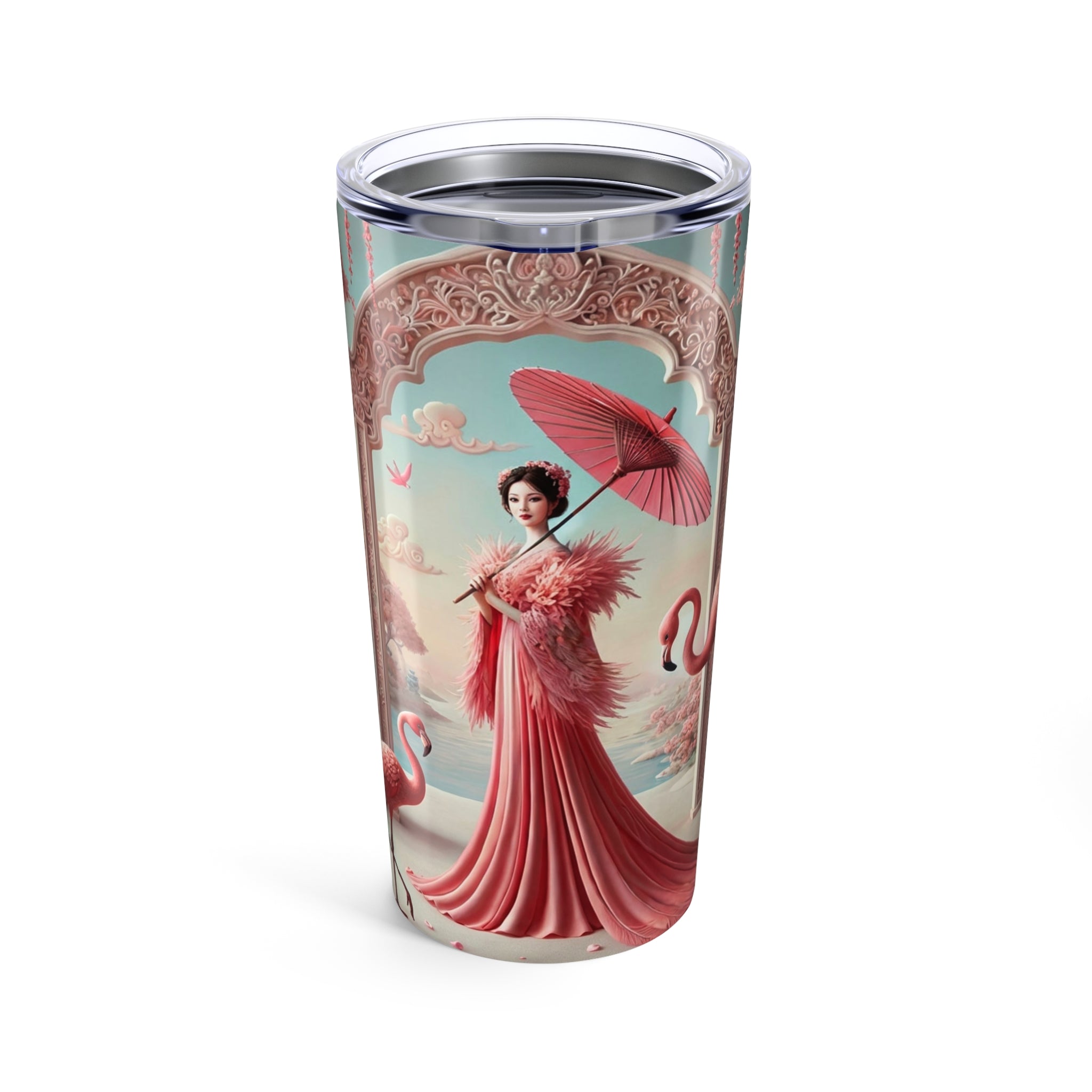 The artwork wraps seamlessly around the tumbler, revealing a tranquil garden scene in gentle blush and rose tones. A poised female figure stands beneath an ornate arch with a parasol in hand, accompanied by porcelain accents, drifting petals, and graceful flamingos. The soft palette and balanced composition draw on classical East Asian inspiration blended with romantic fantasy, creating a calm, refined visual that complements each sip.