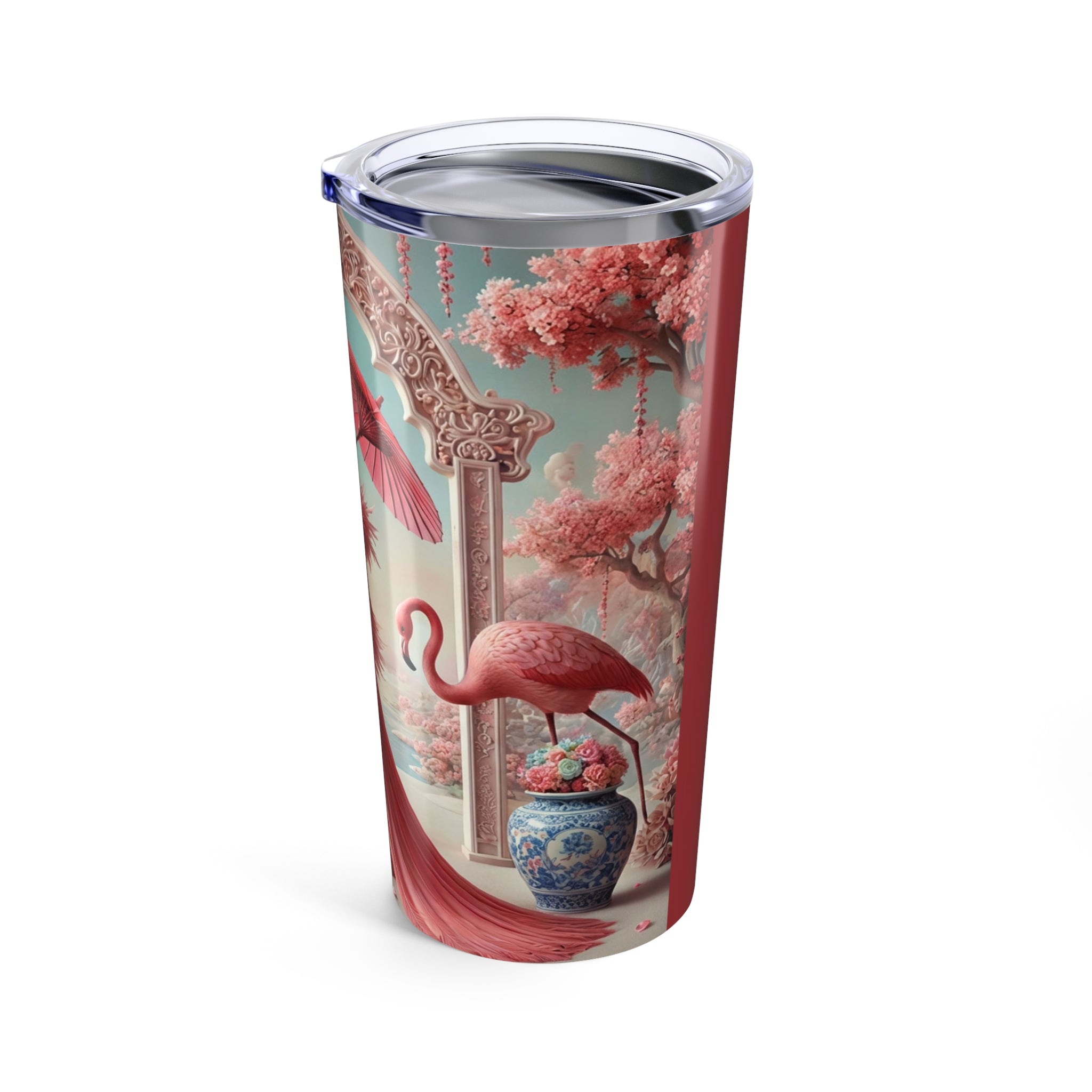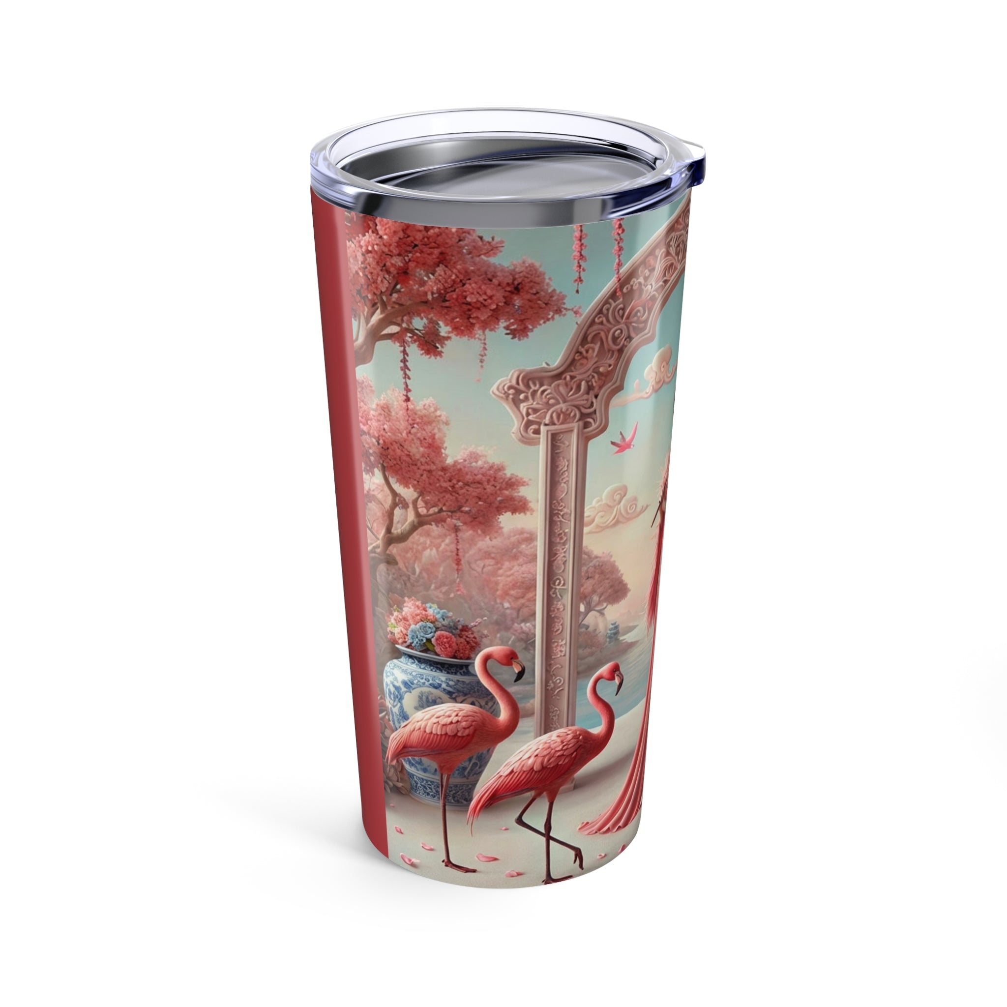Petals, Porcelain, and Flamingos Tumbler – 20oz blends everyday performance with soft, romantic artistry, designed to keep 20oz of your favorite beverages hot or cold while adding elegance to your daily routine. Made from durable stainless steel with double-wall vacuum insulation, this tumbler is built for comfort and convenience, featuring rounded corners, a glossy finish, and a clear push-on lid with a rubber gasket—ideal for work, travel, or moments of pause.
