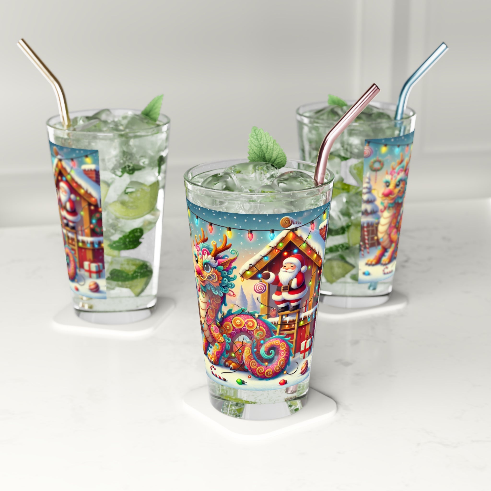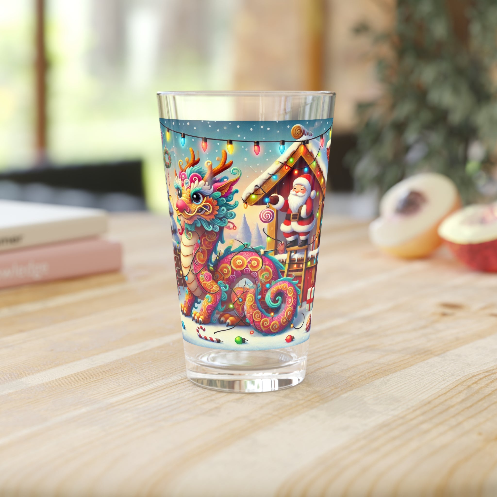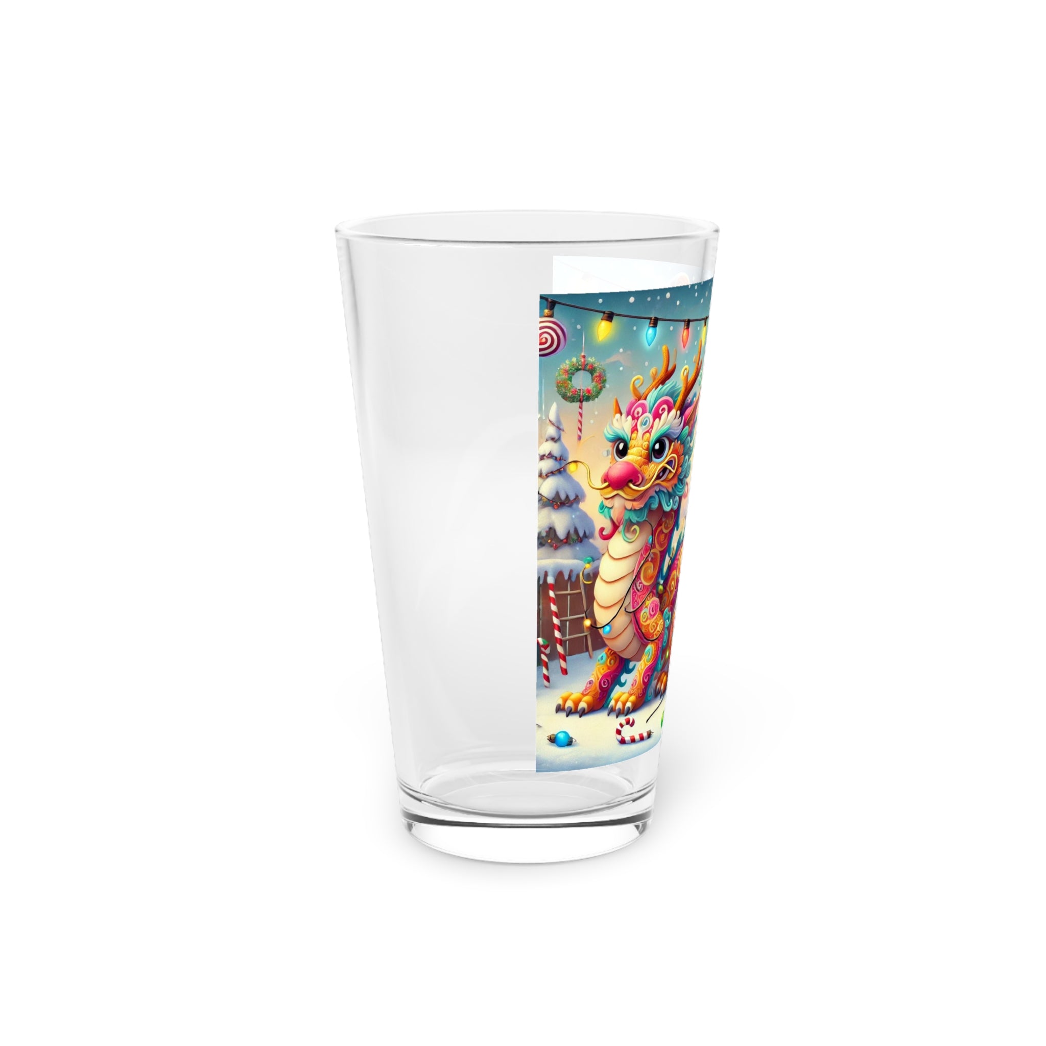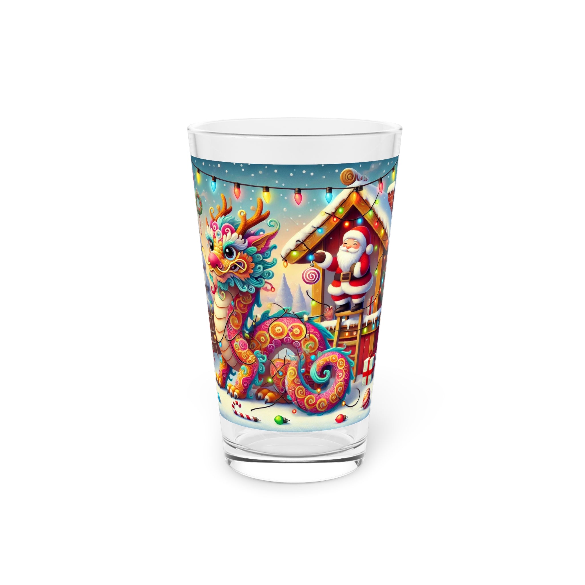 Celebrate the holidays in style with the Playful Dragon's Christmas Glass! Perfect for festive beverages, this versatile 16oz pint glass features a whimsical dragon tangled in colorful Christmas lights outside Santa’s workshop. The vibrant, playful artwork adds a touch of humor and charm, while Santa Claus, watching with amusement, brings a traditional holiday vibe to the design.