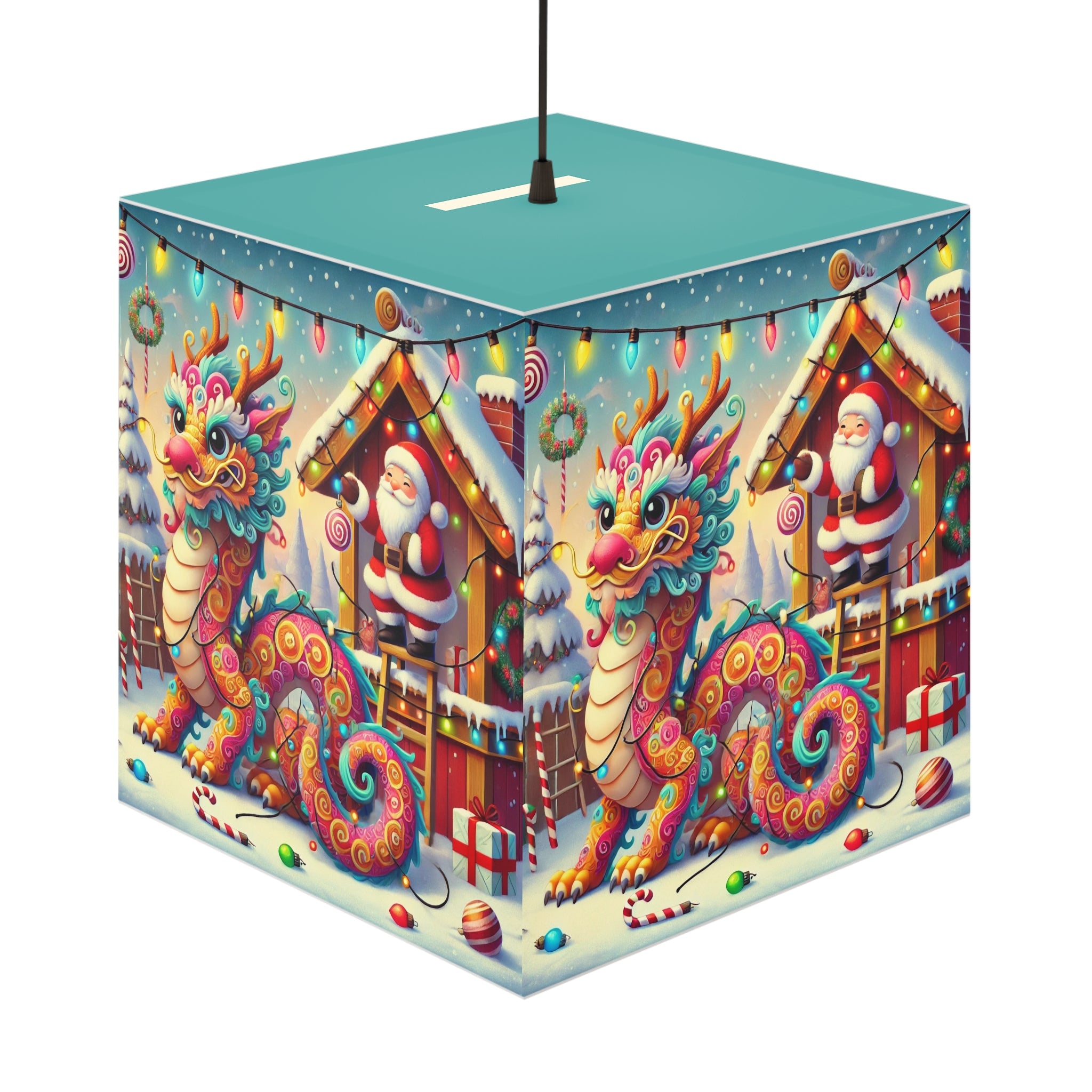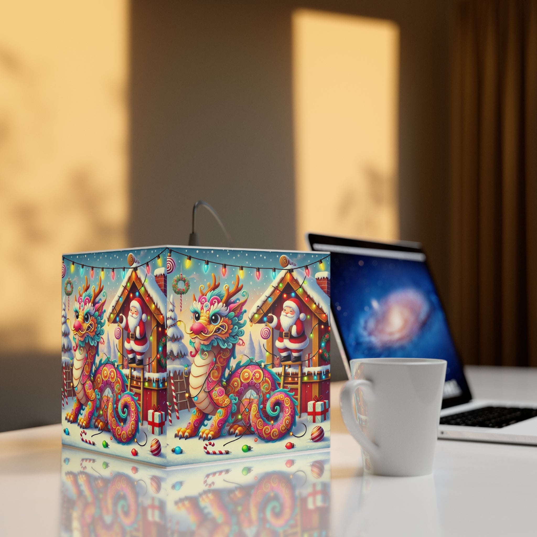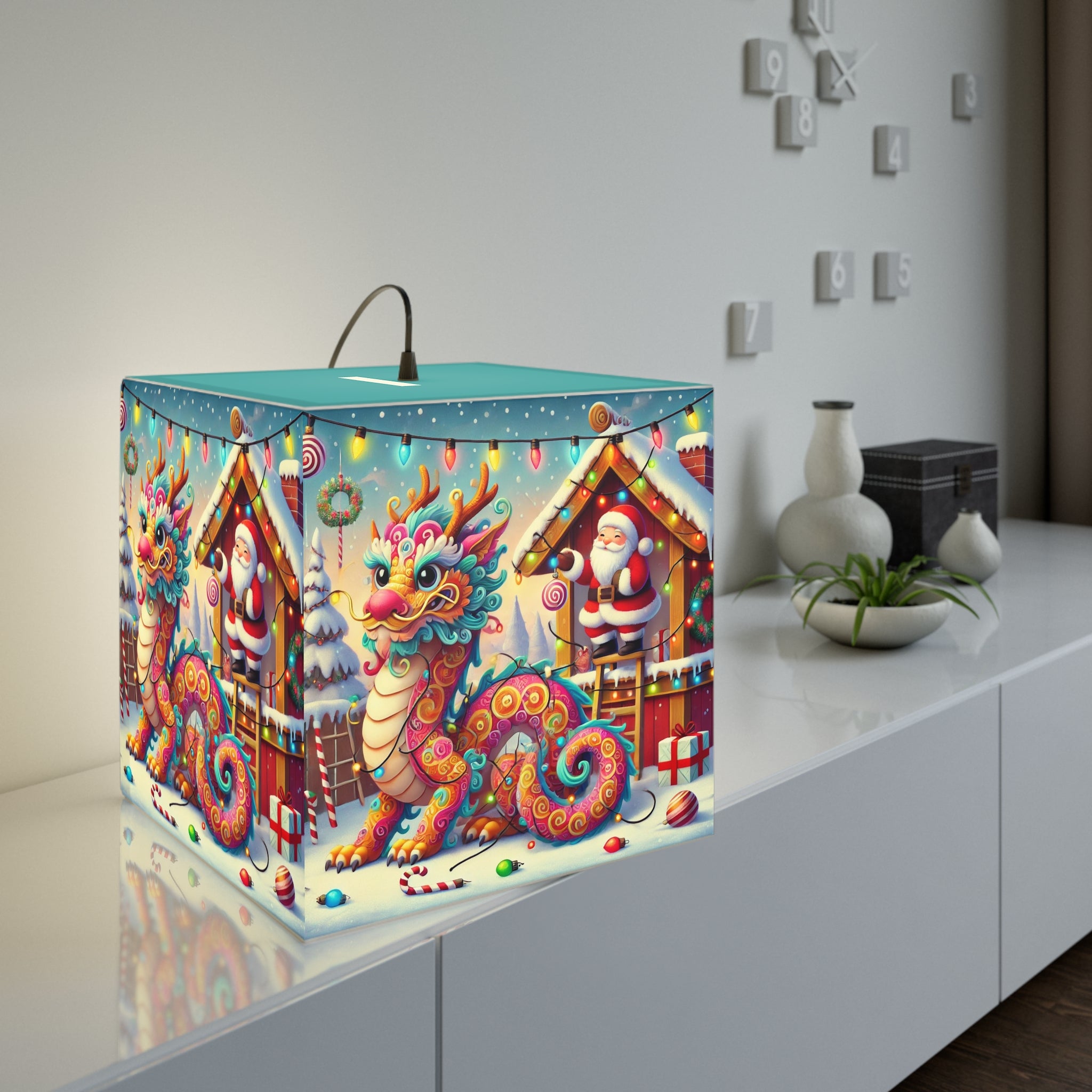 The lamp showcases whimsical artwork of a playful dragon wrapped in colorful Christmas lights outside Santa’s workshop. Santa watches with an amused twinkle, capturing the joy and humor of the season.