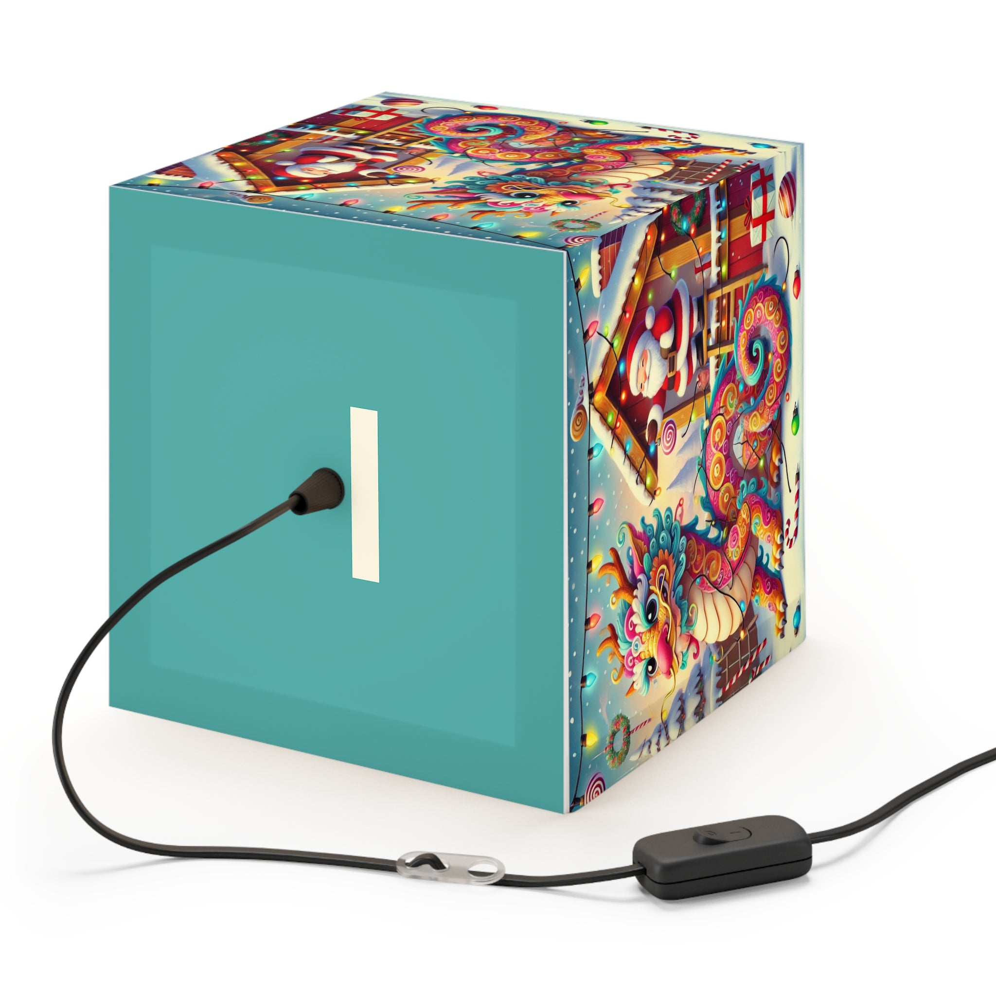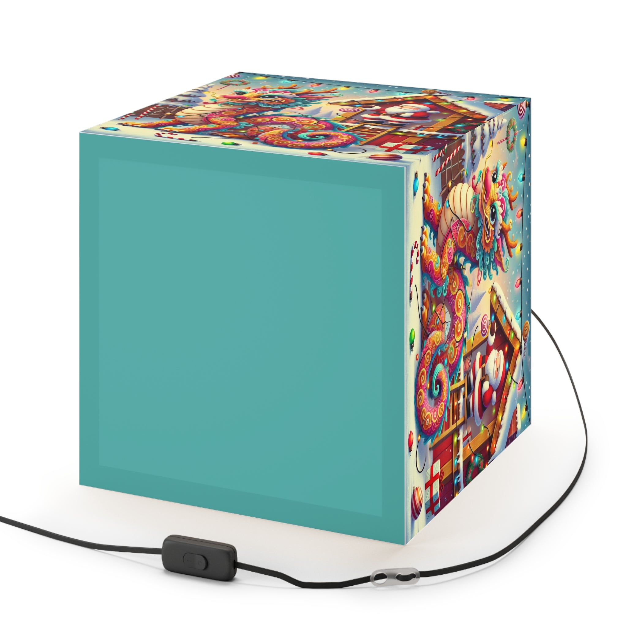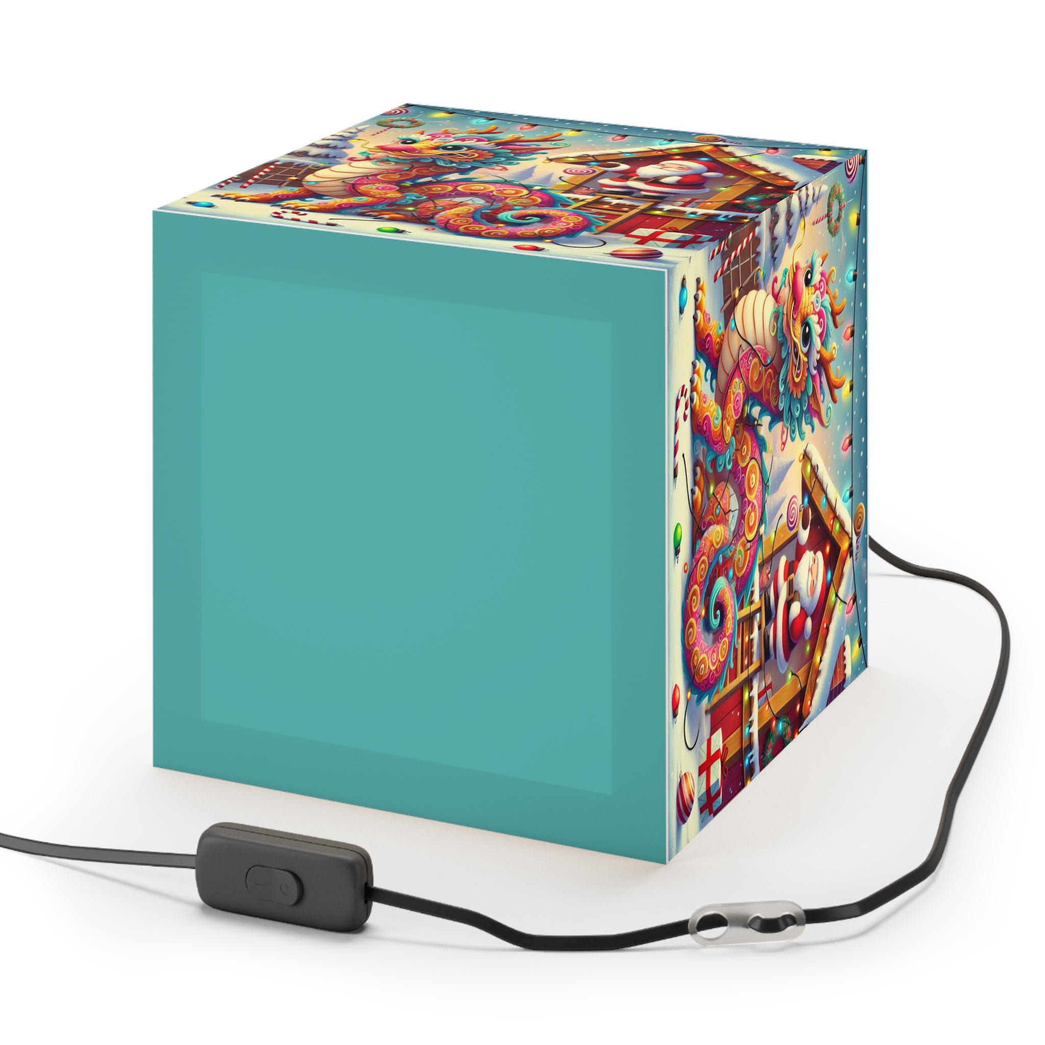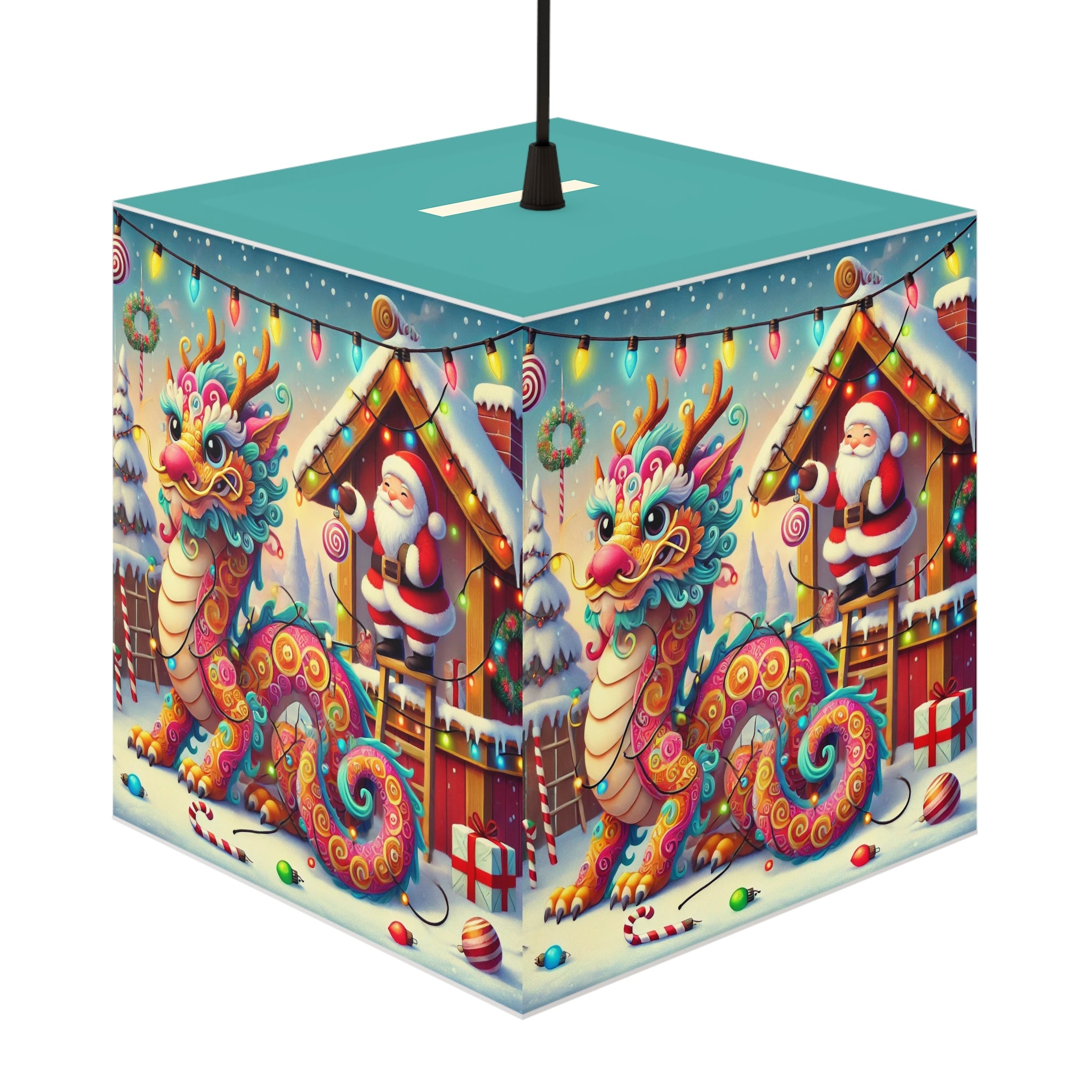 The lamp showcases whimsical artwork of a playful dragon wrapped in colorful Christmas lights outside Santa’s workshop. Santa watches with an amused twinkle, capturing the joy and humor of the season.