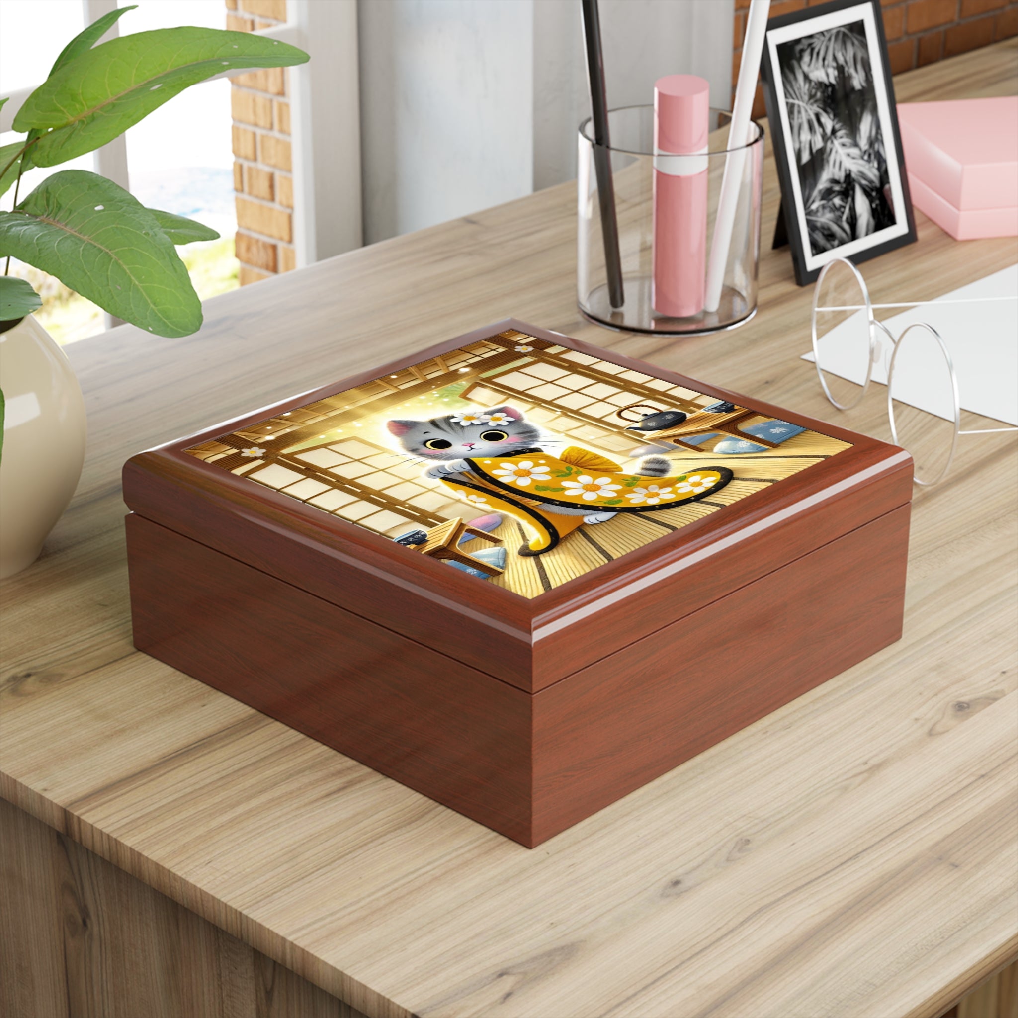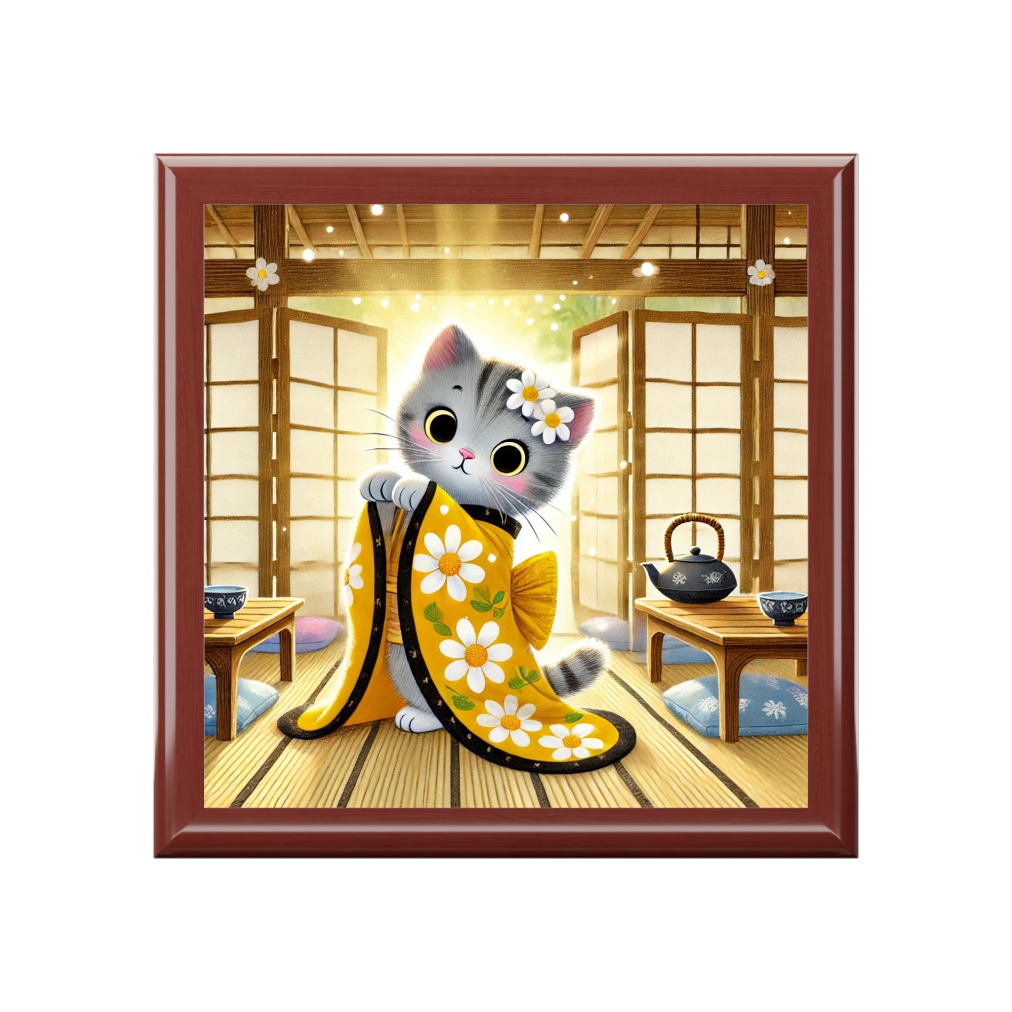 Playful Kitten in the Tea Room Jewelry Box invites you into a cozy moment of quiet curiosity and charm. On the glossy ceramic tile lid, an adorable gray kitten dressed in a yellow kimono sprinkled with daisy patterns gazes thoughtfully in front of an ornate folding screen. Soft lighting spills across tatami mats and wooden accents, creating the feeling of a peaceful tea room where time slows down and every detail feels warm and welcoming.