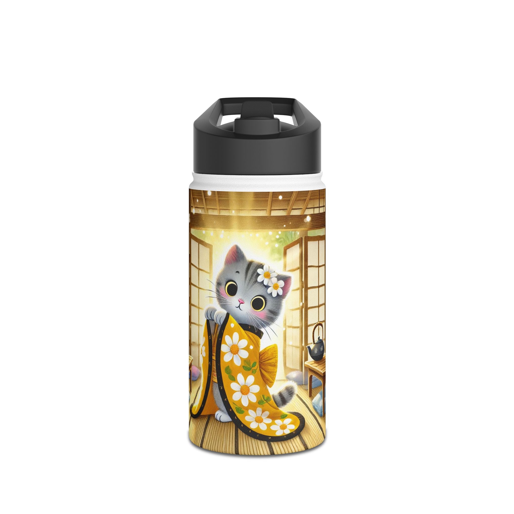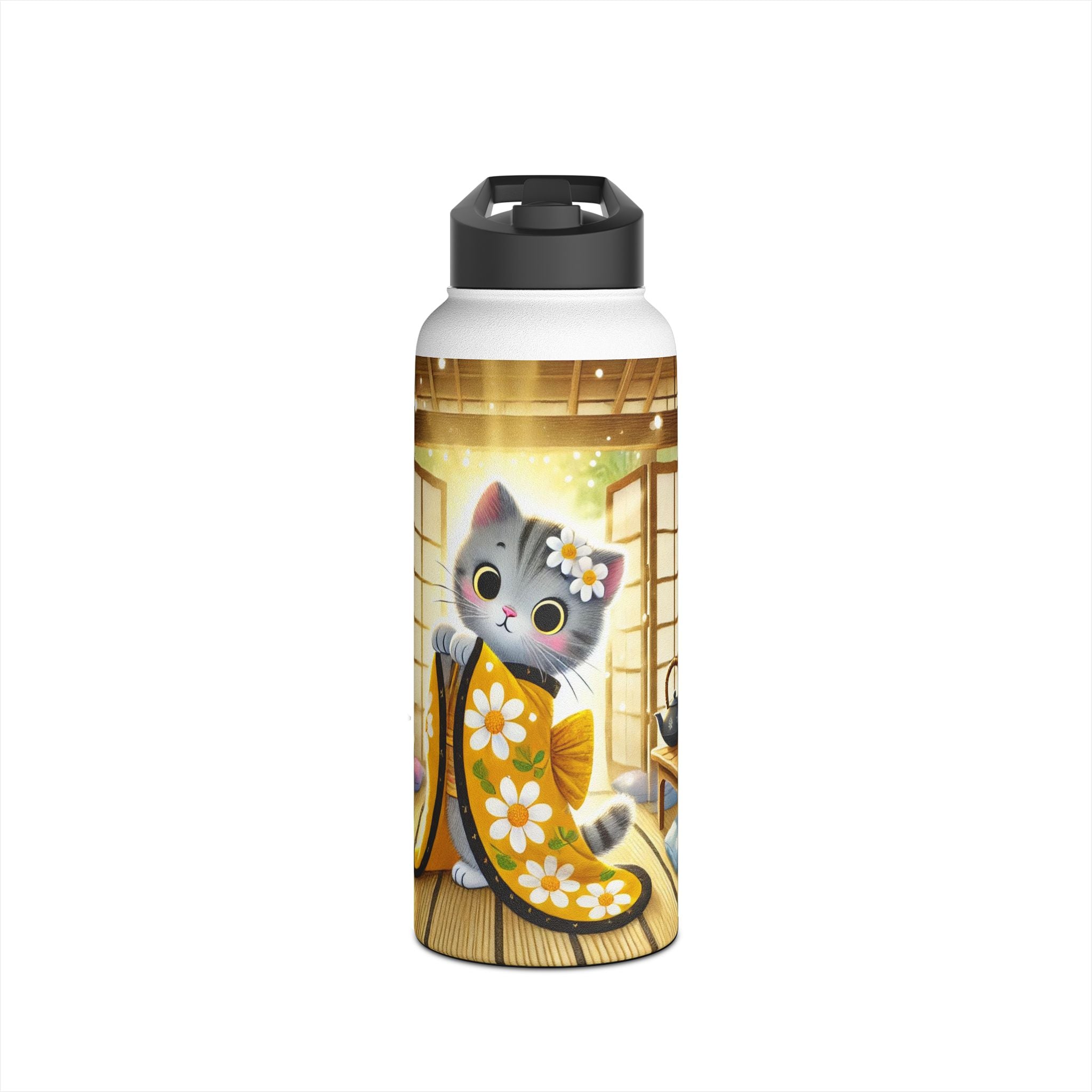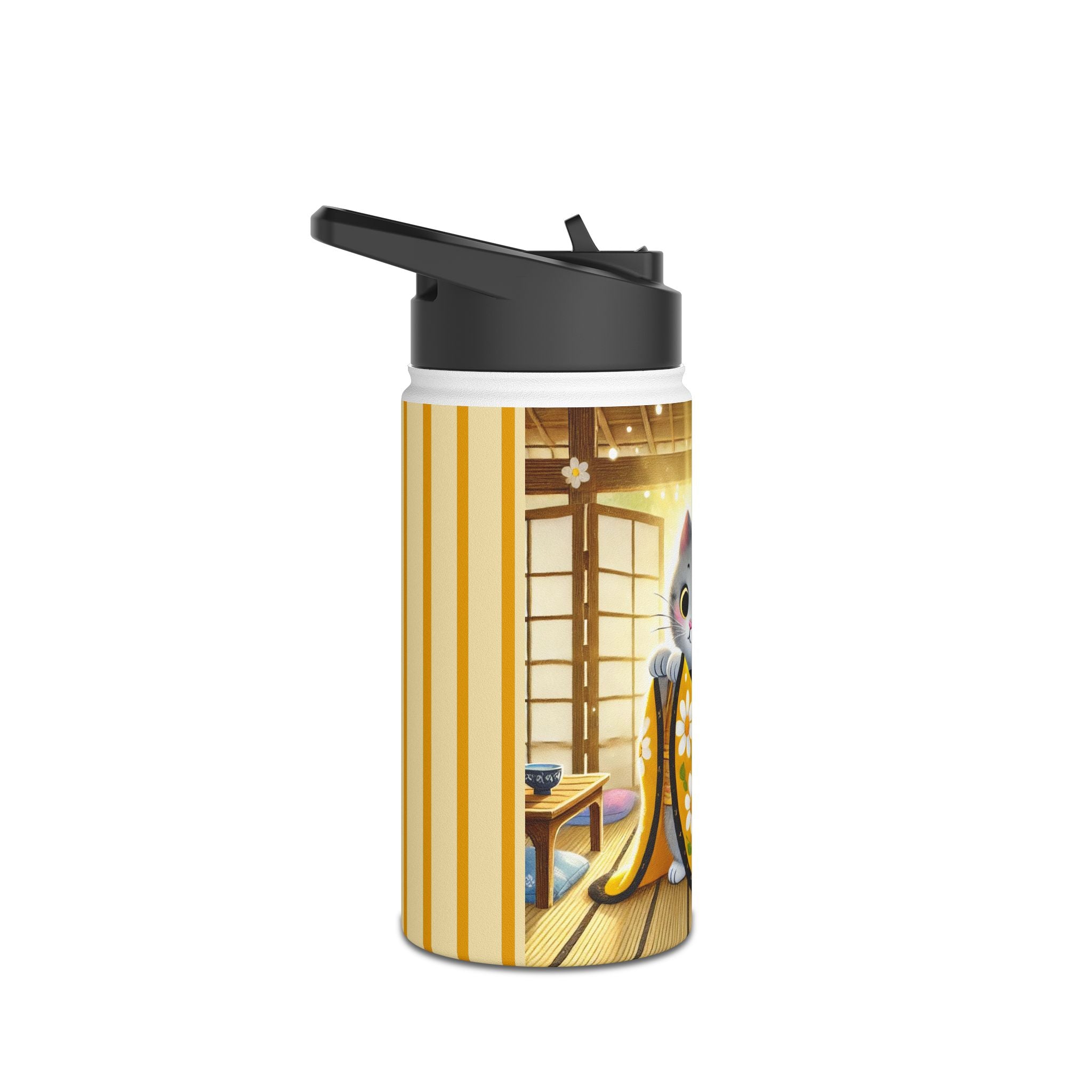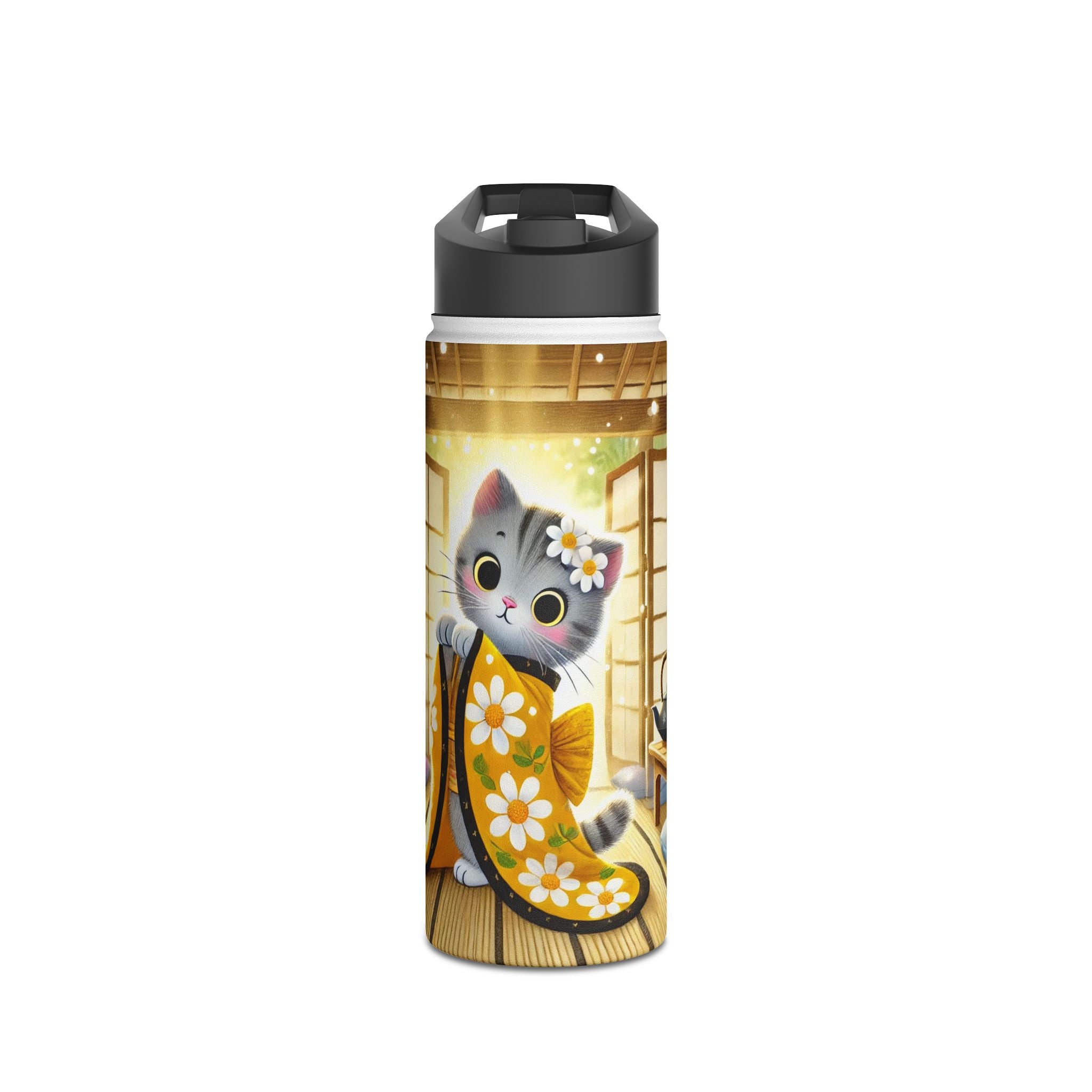 The enchanting artwork, Playful Kitten in the Tea Room, captures a mischievous gray kitten dressed in a cheerful yellow kimono adorned with daisy motifs. The little feline curiously gazes before an ornate Japanese folding screen, surrounded by soft natural light that filters through a traditional tea room. Warm wooden accents and tatami textures evoke a sense of serenity and intimacy, while the kitten’s playful expression adds a whimsical spark to the scene. The result is a delightful blend of cultural grace and everyday joy—an artwork that turns a simple bottle into a moment of peace and wonder.