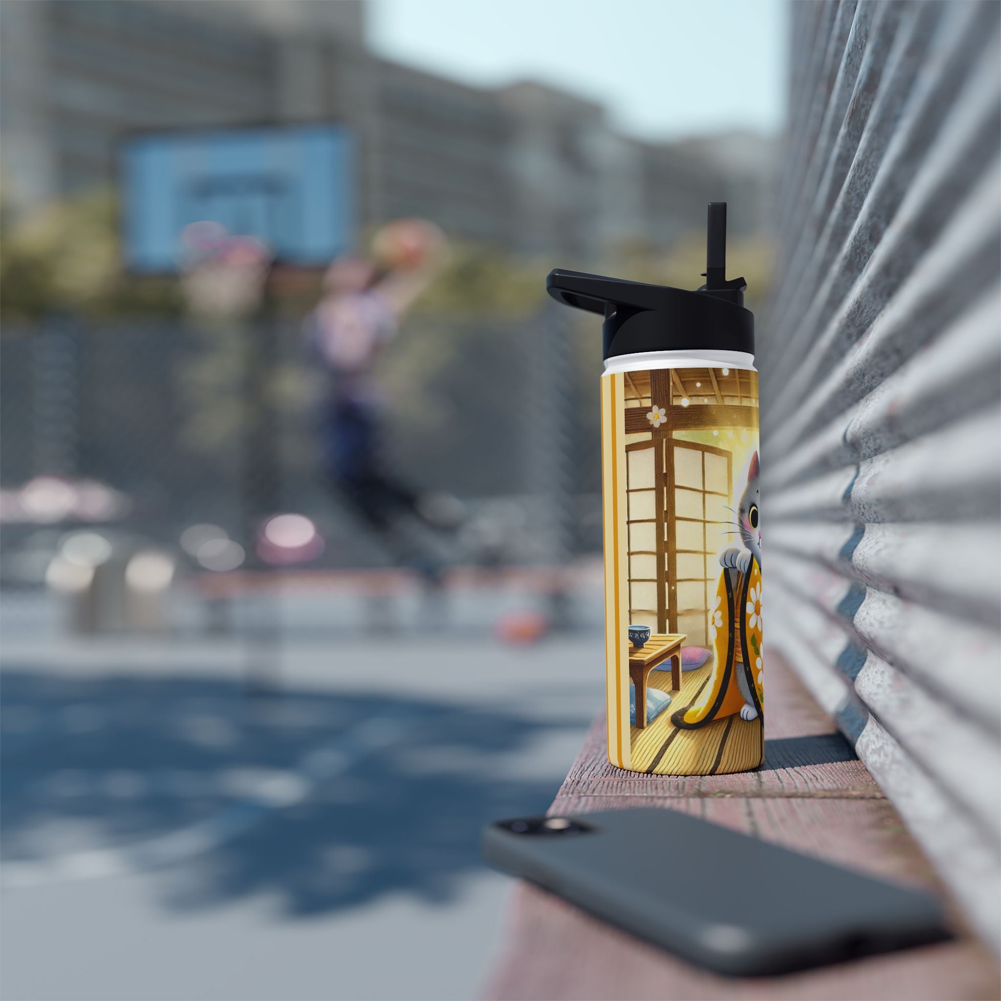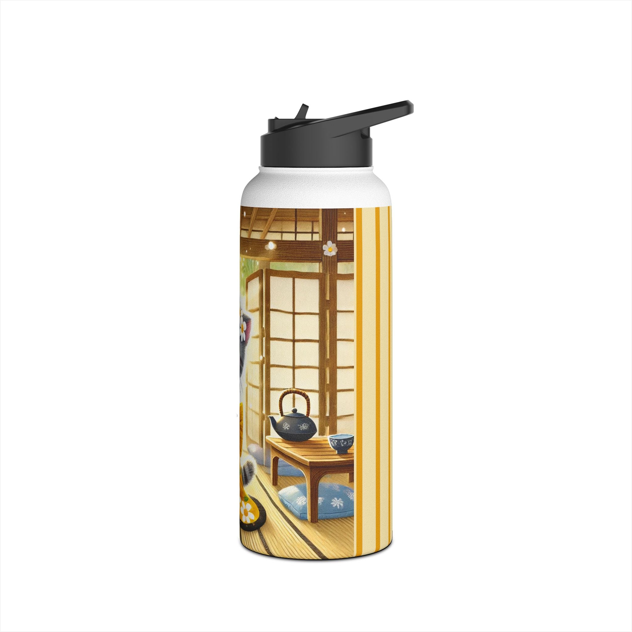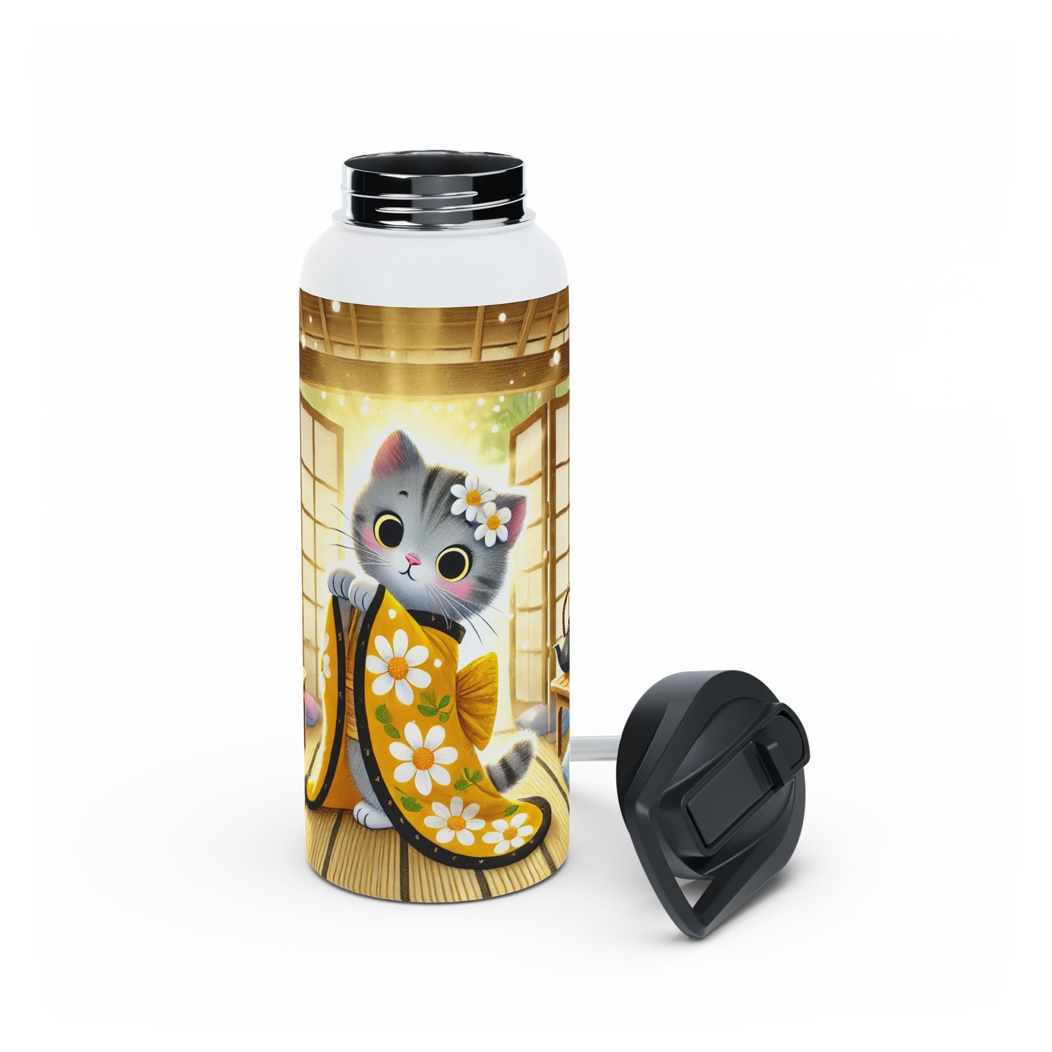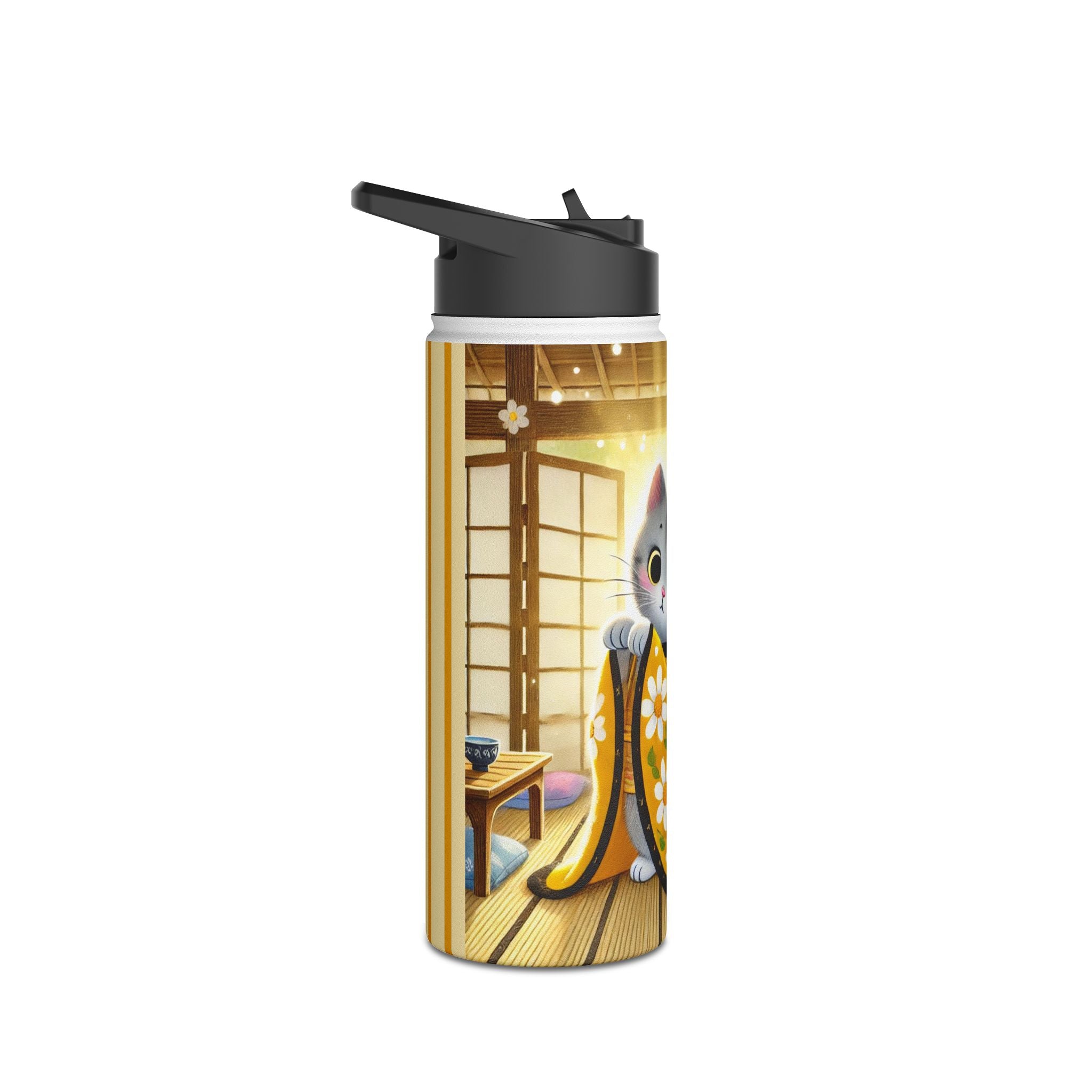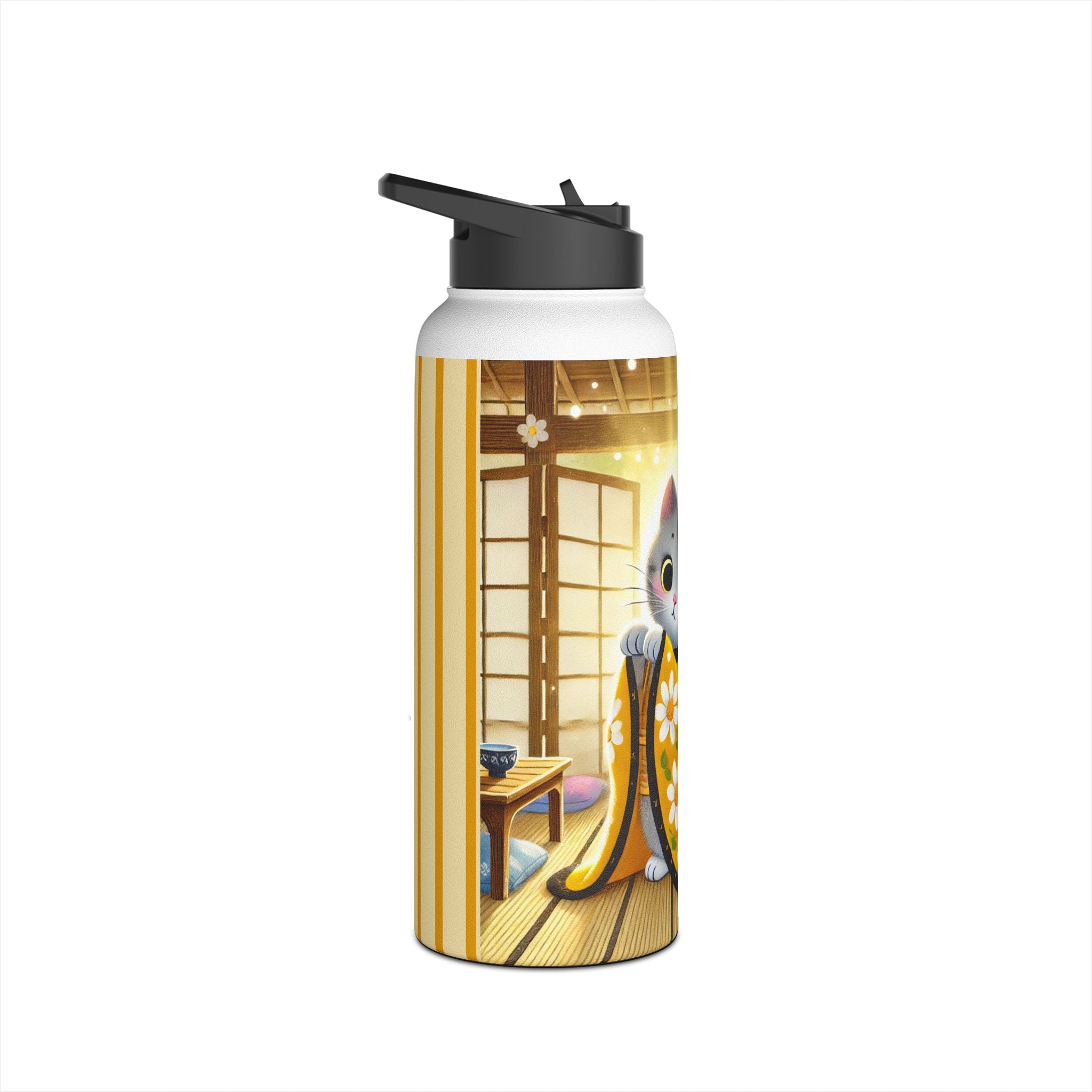 The enchanting artwork, Playful Kitten in the Tea Room, captures a mischievous gray kitten dressed in a cheerful yellow kimono adorned with daisy motifs. The little feline curiously gazes before an ornate Japanese folding screen, surrounded by soft natural light that filters through a traditional tea room. Warm wooden accents and tatami textures evoke a sense of serenity and intimacy, while the kitten’s playful expression adds a whimsical spark to the scene. The result is a delightful blend of cultural grace and everyday joy—an artwork that turns a simple bottle into a moment of peace and wonder.