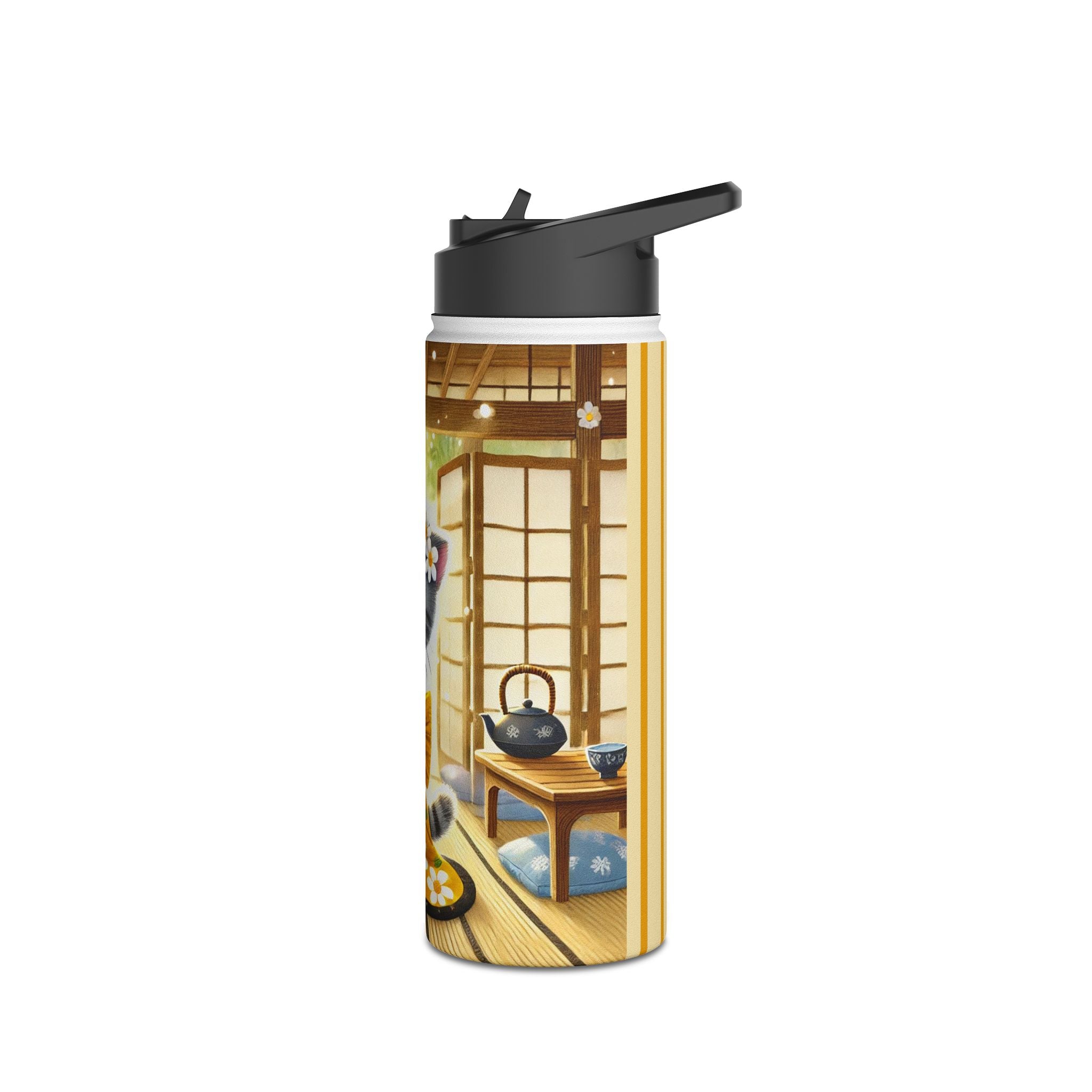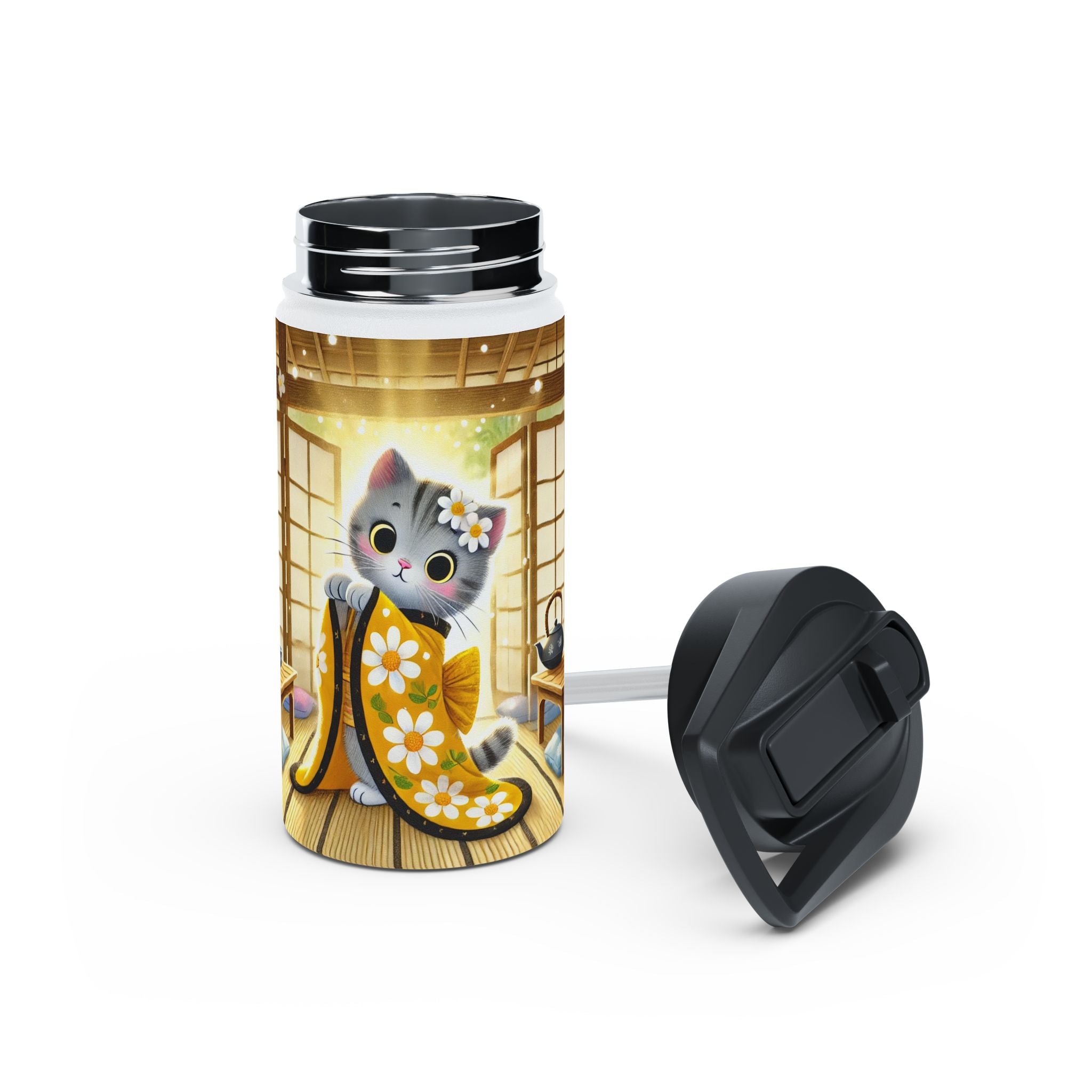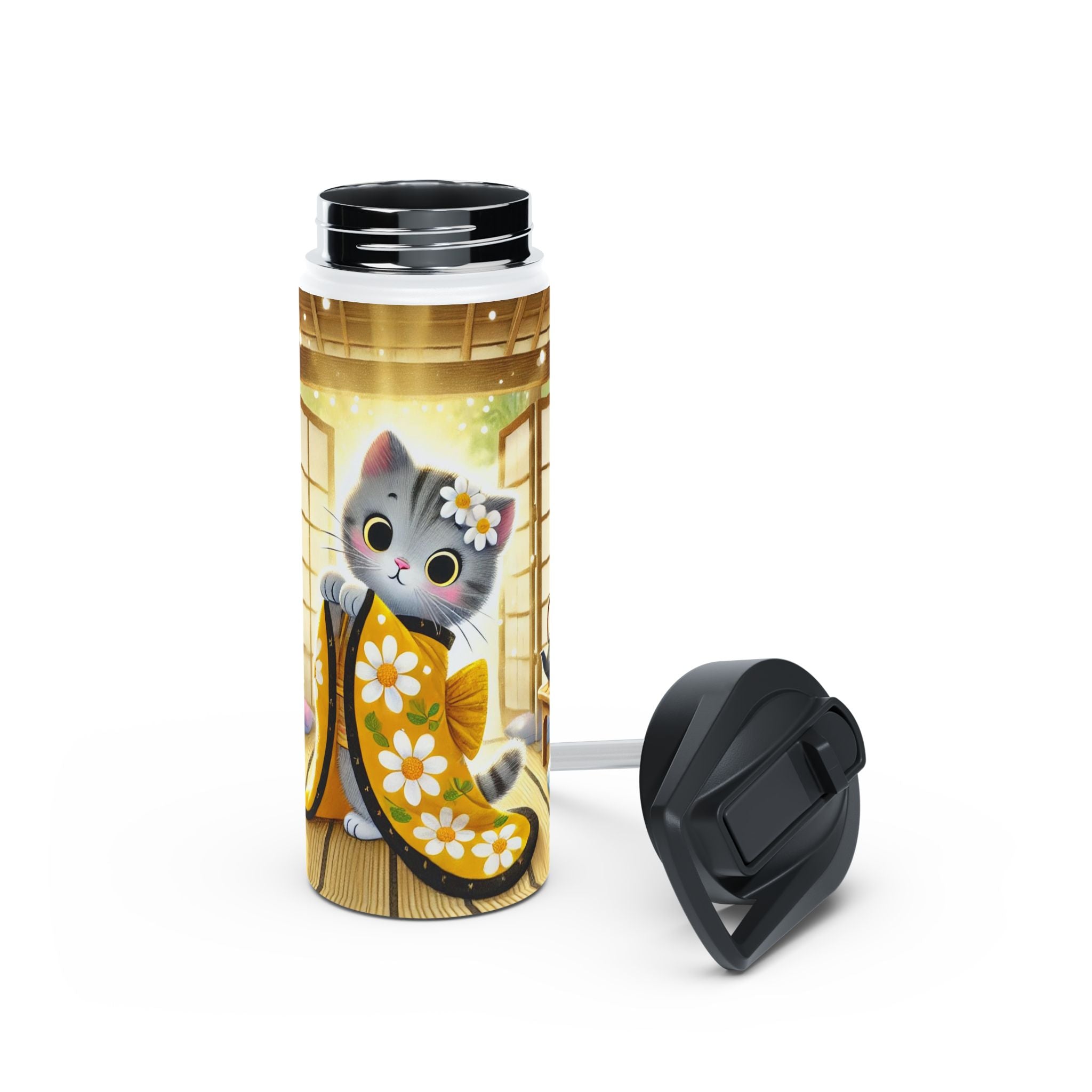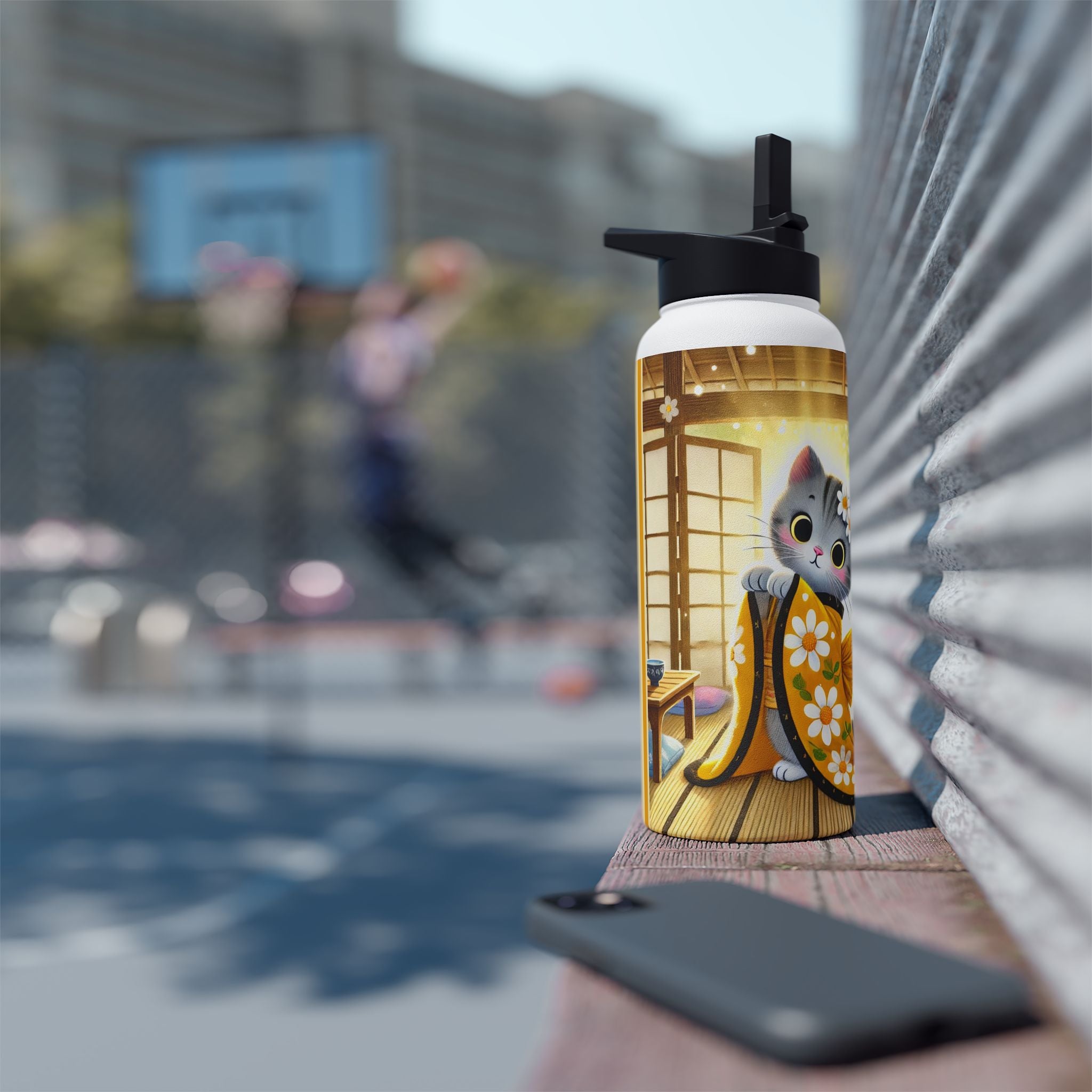 The enchanting artwork, Playful Kitten in the Tea Room, captures a mischievous gray kitten dressed in a cheerful yellow kimono adorned with daisy motifs. The little feline curiously gazes before an ornate Japanese folding screen, surrounded by soft natural light that filters through a traditional tea room. Warm wooden accents and tatami textures evoke a sense of serenity and intimacy, while the kitten’s playful expression adds a whimsical spark to the scene. The result is a delightful blend of cultural grace and everyday joy—an artwork that turns a simple bottle into a moment of peace and wonder.