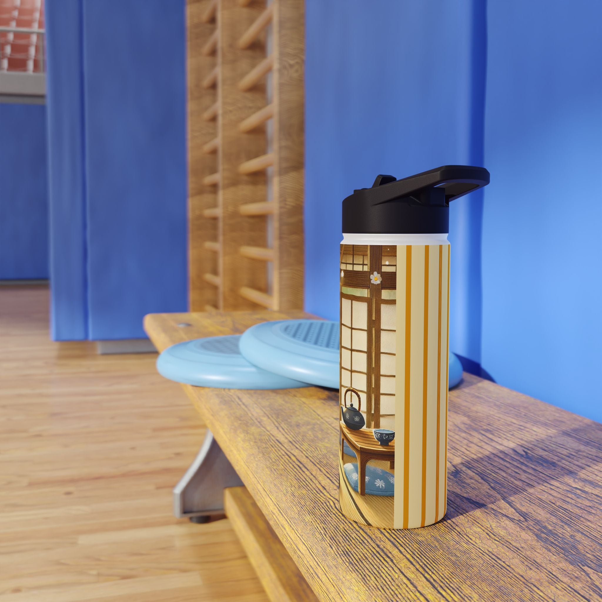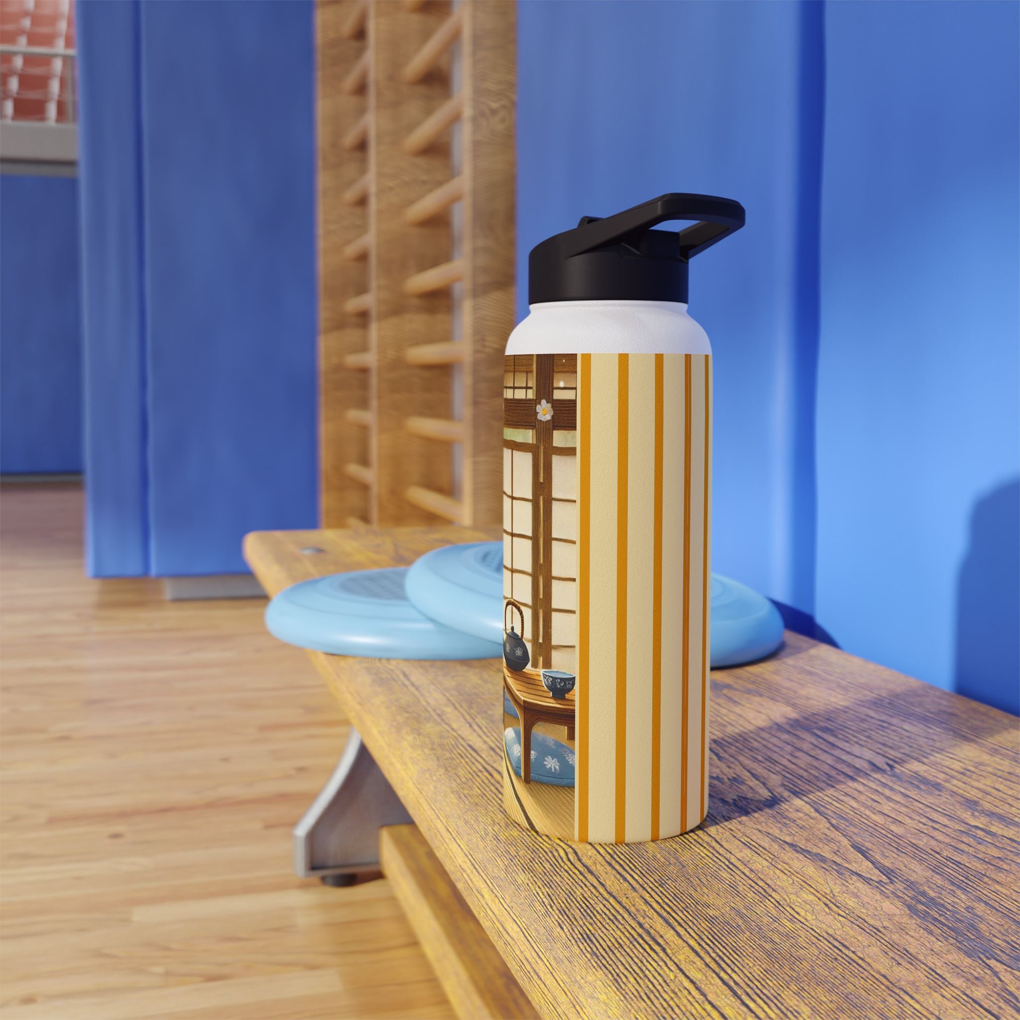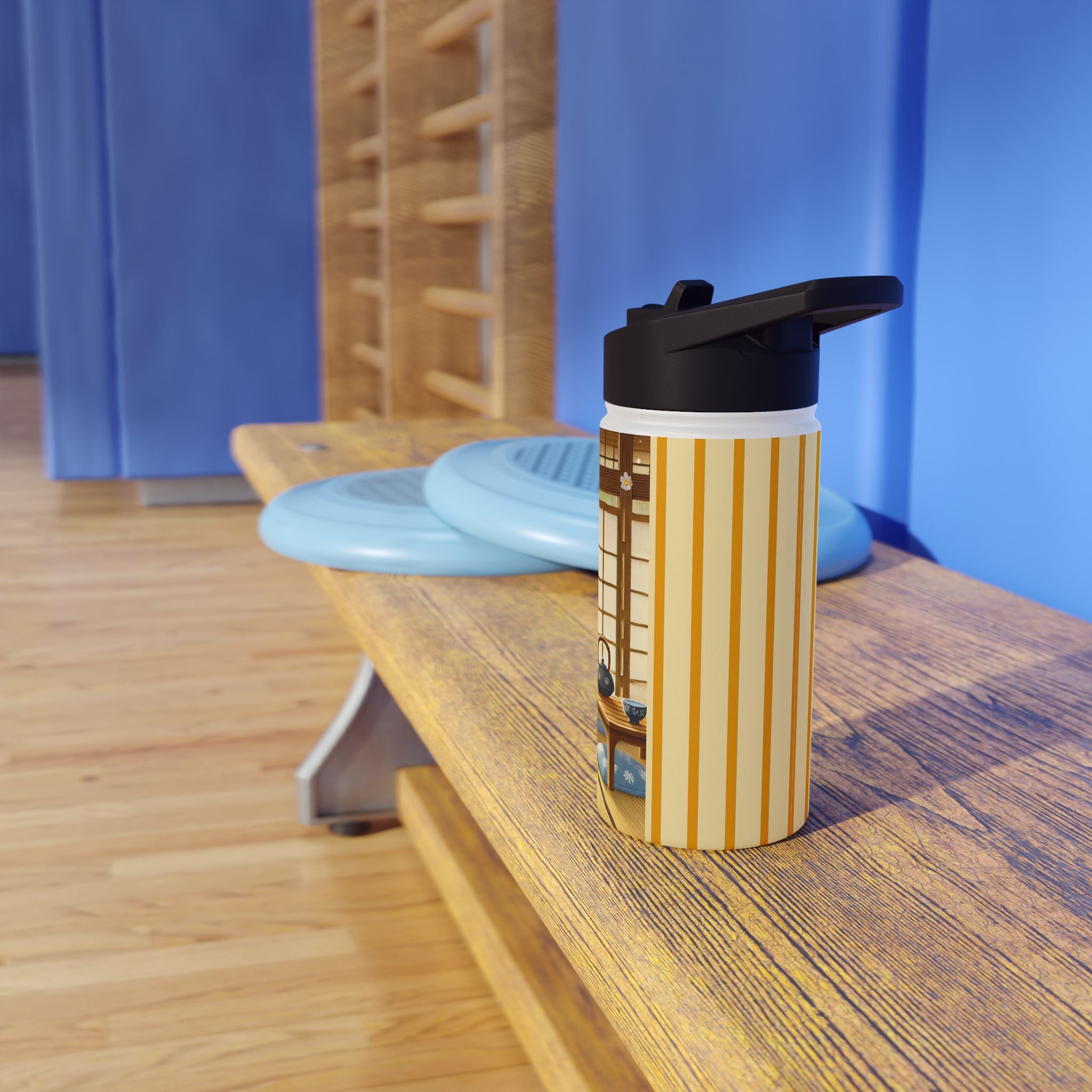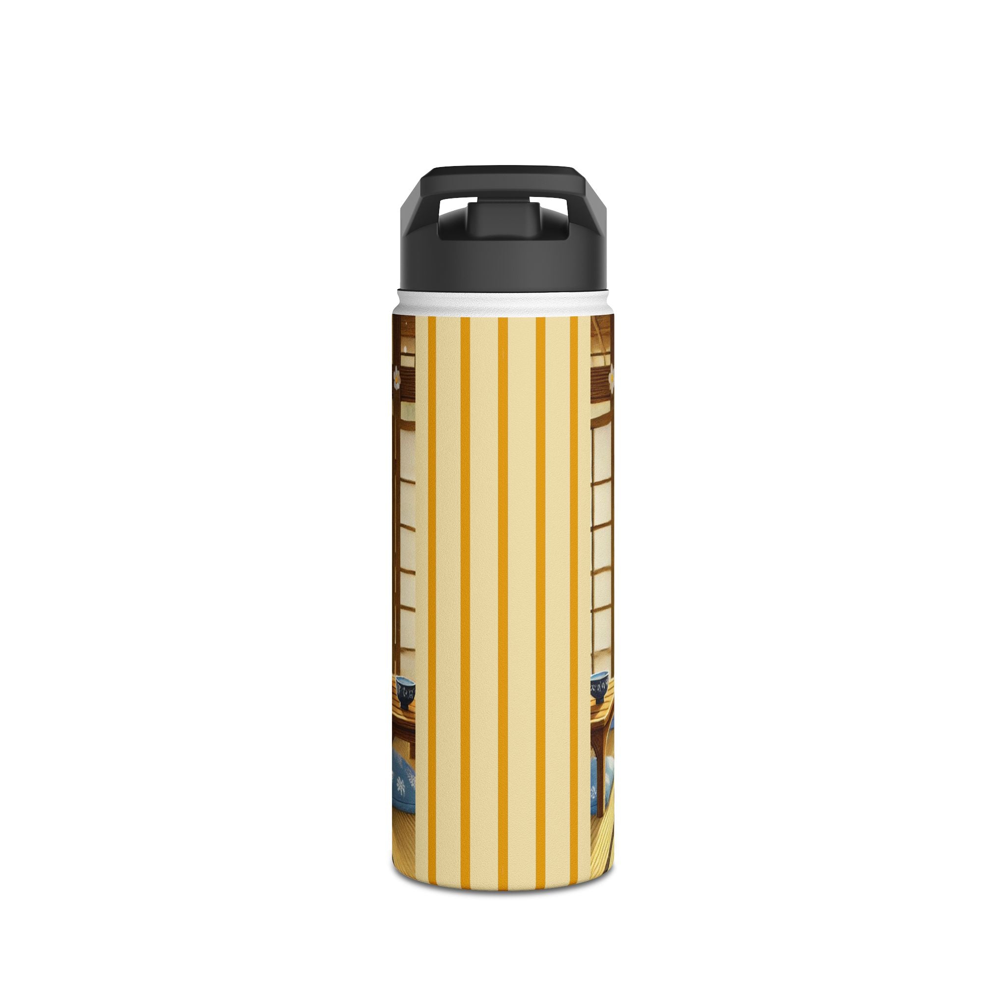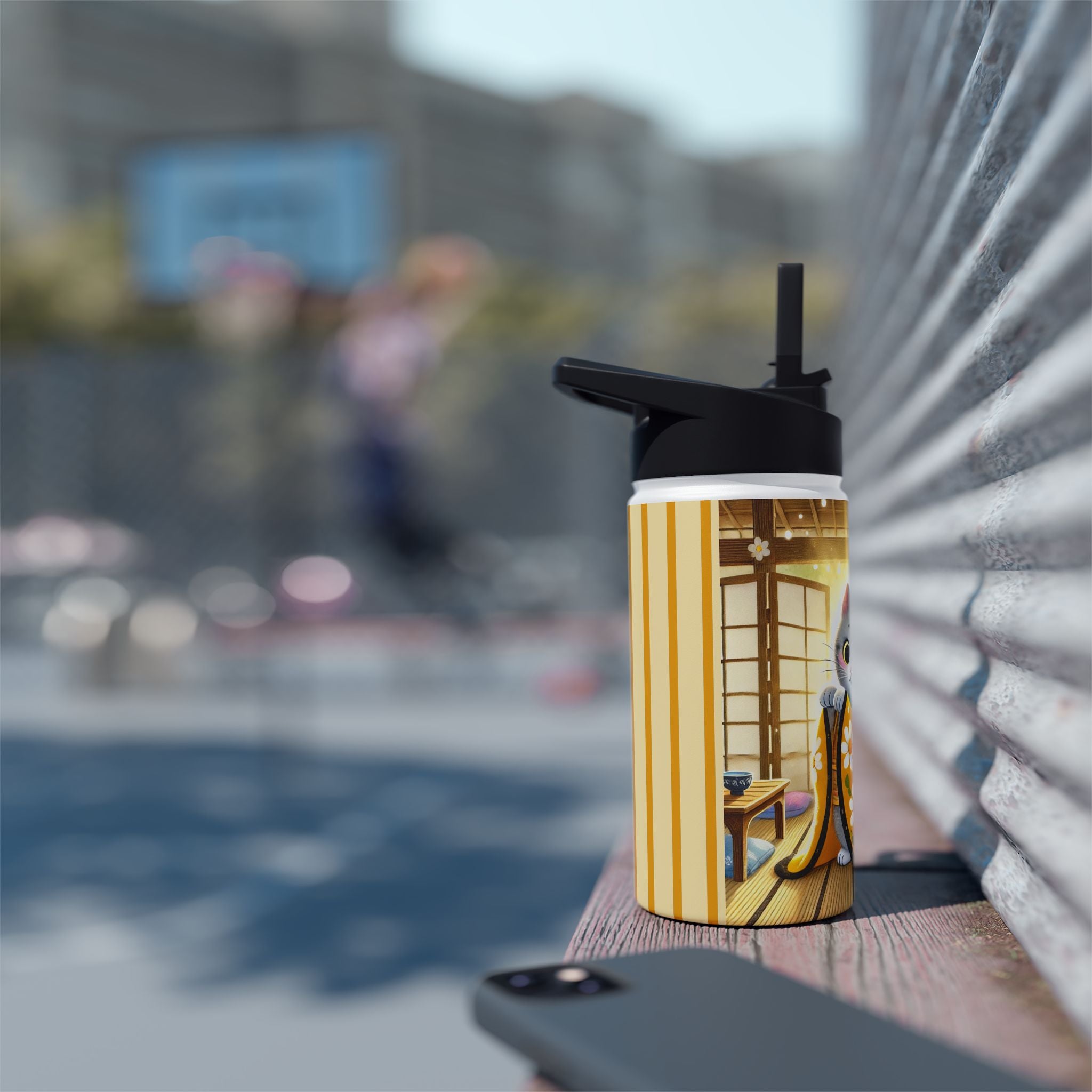 The enchanting artwork, Playful Kitten in the Tea Room, captures a mischievous gray kitten dressed in a cheerful yellow kimono adorned with daisy motifs. The little feline curiously gazes before an ornate Japanese folding screen, surrounded by soft natural light that filters through a traditional tea room. Warm wooden accents and tatami textures evoke a sense of serenity and intimacy, while the kitten’s playful expression adds a whimsical spark to the scene. The result is a delightful blend of cultural grace and everyday joy—an artwork that turns a simple bottle into a moment of peace and wonder.