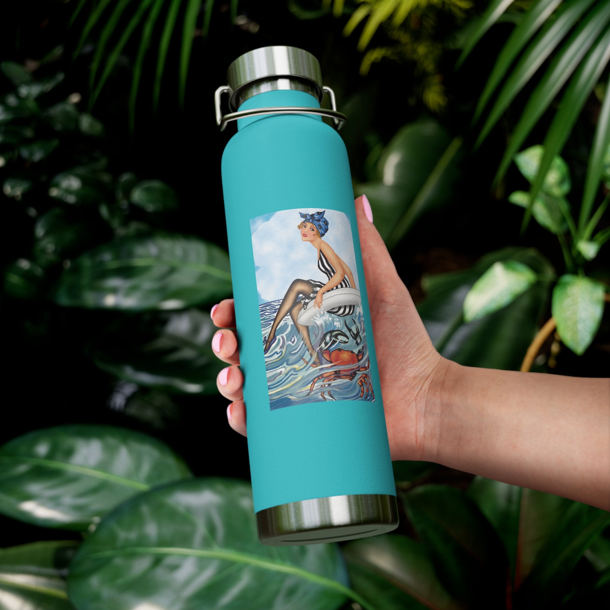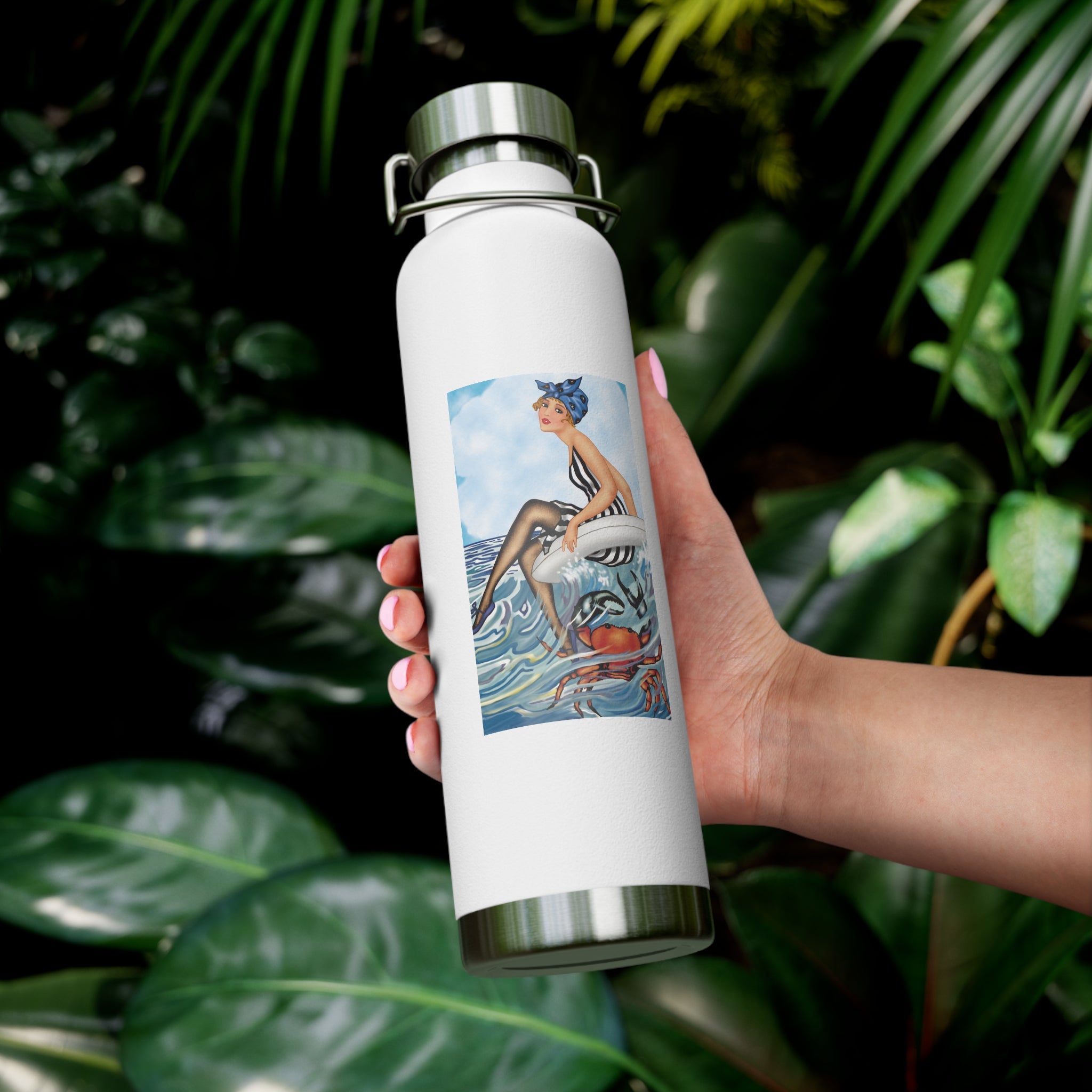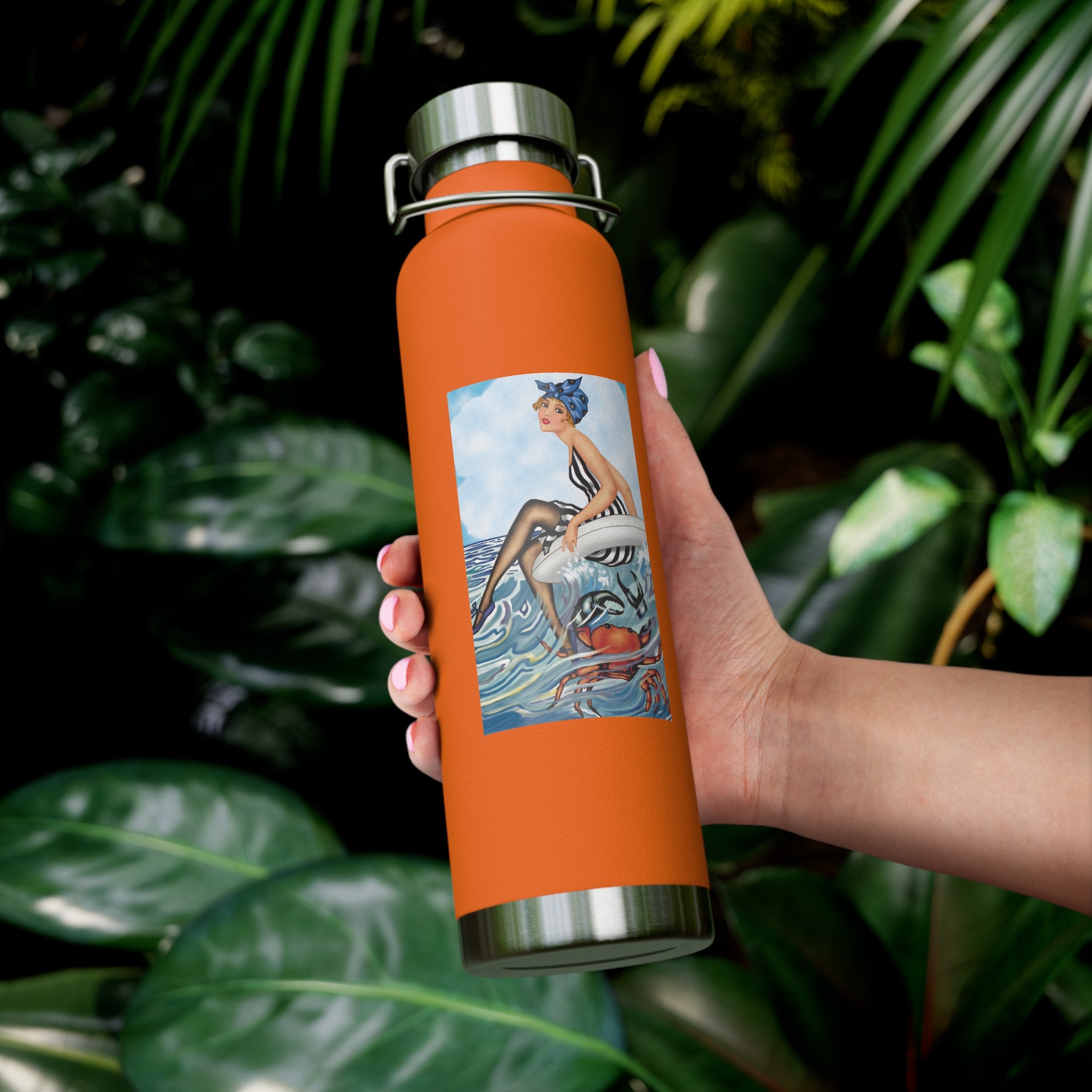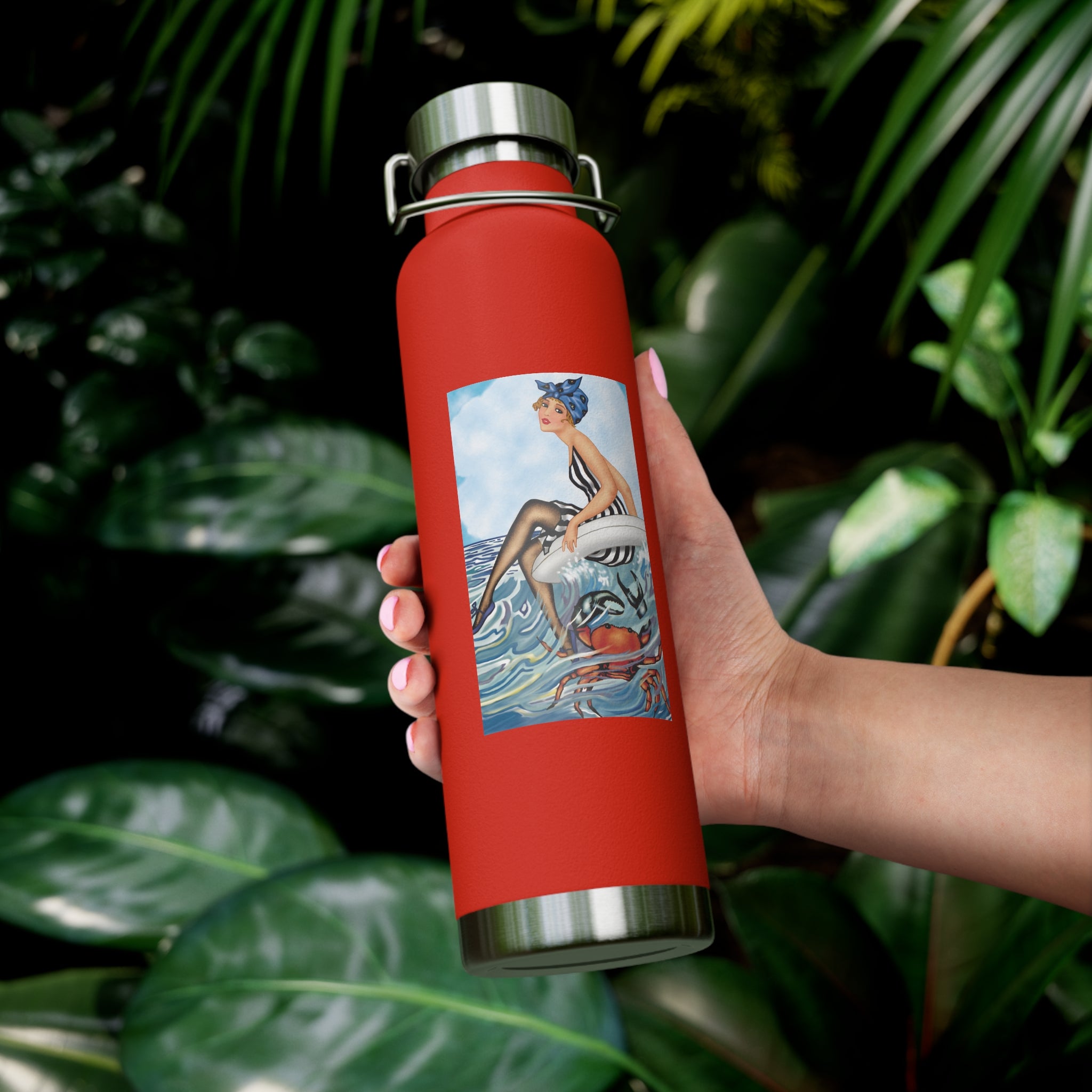 Artwork designed and digitally remastered by Sarasvati Designs. In a whimsical vintage art deco scene, an elegant woman in a fashionable striped swimsuit is playfully lifted by a wave while a stylized red crab reaches out from the sea, creating an amusing encounter.