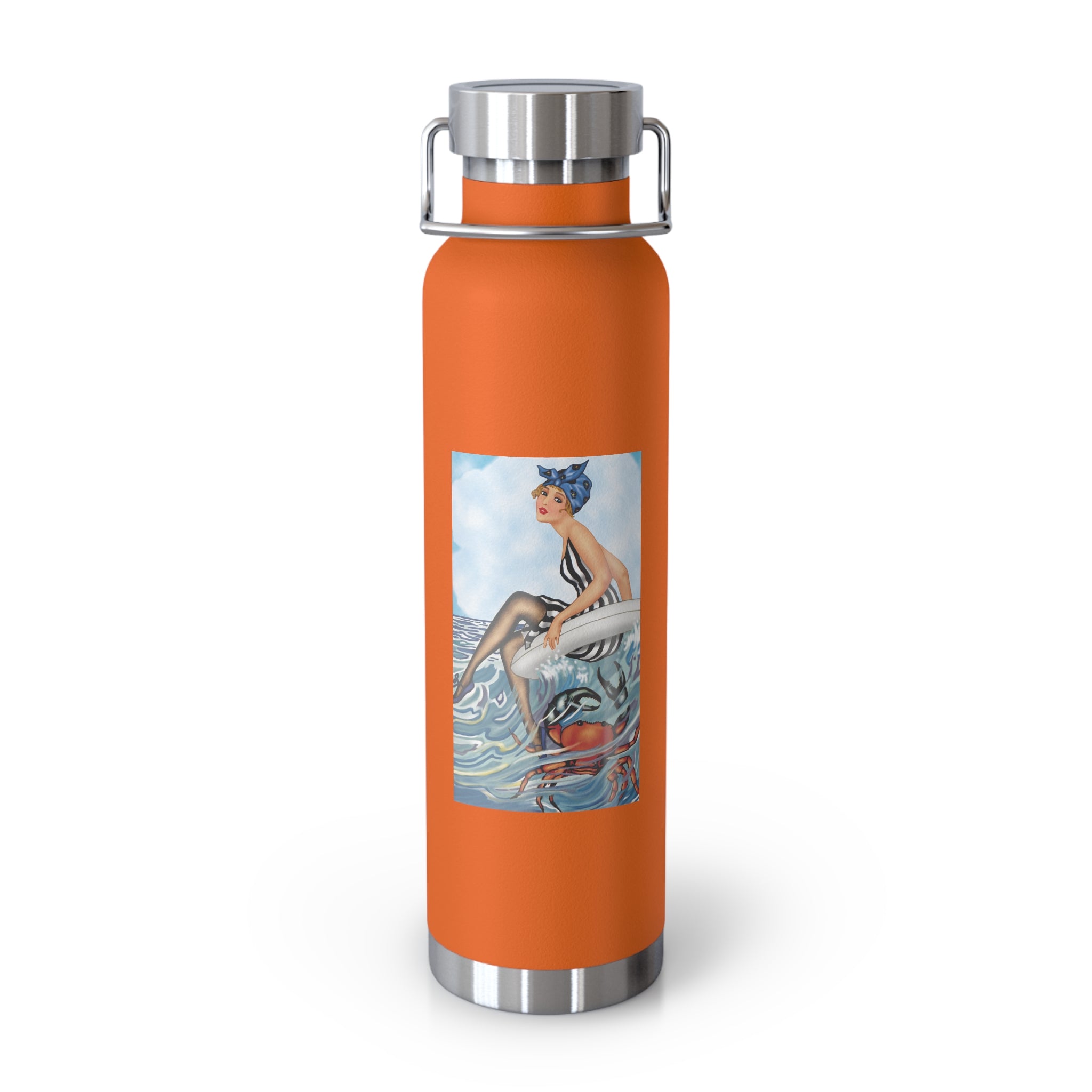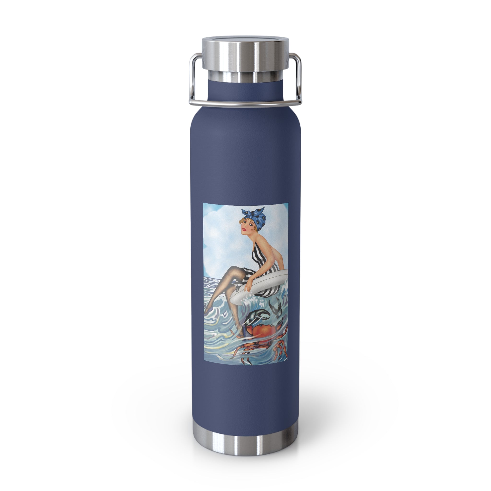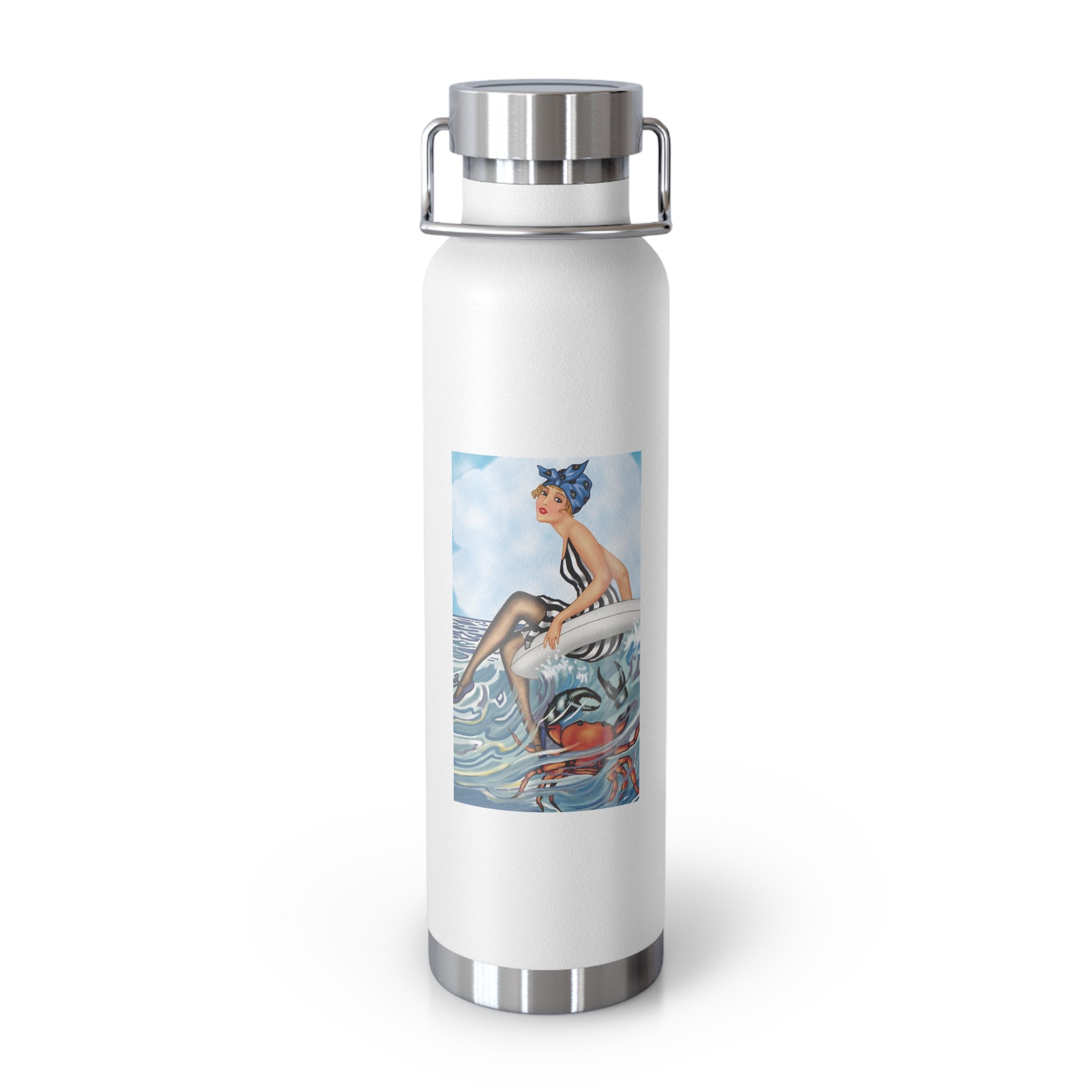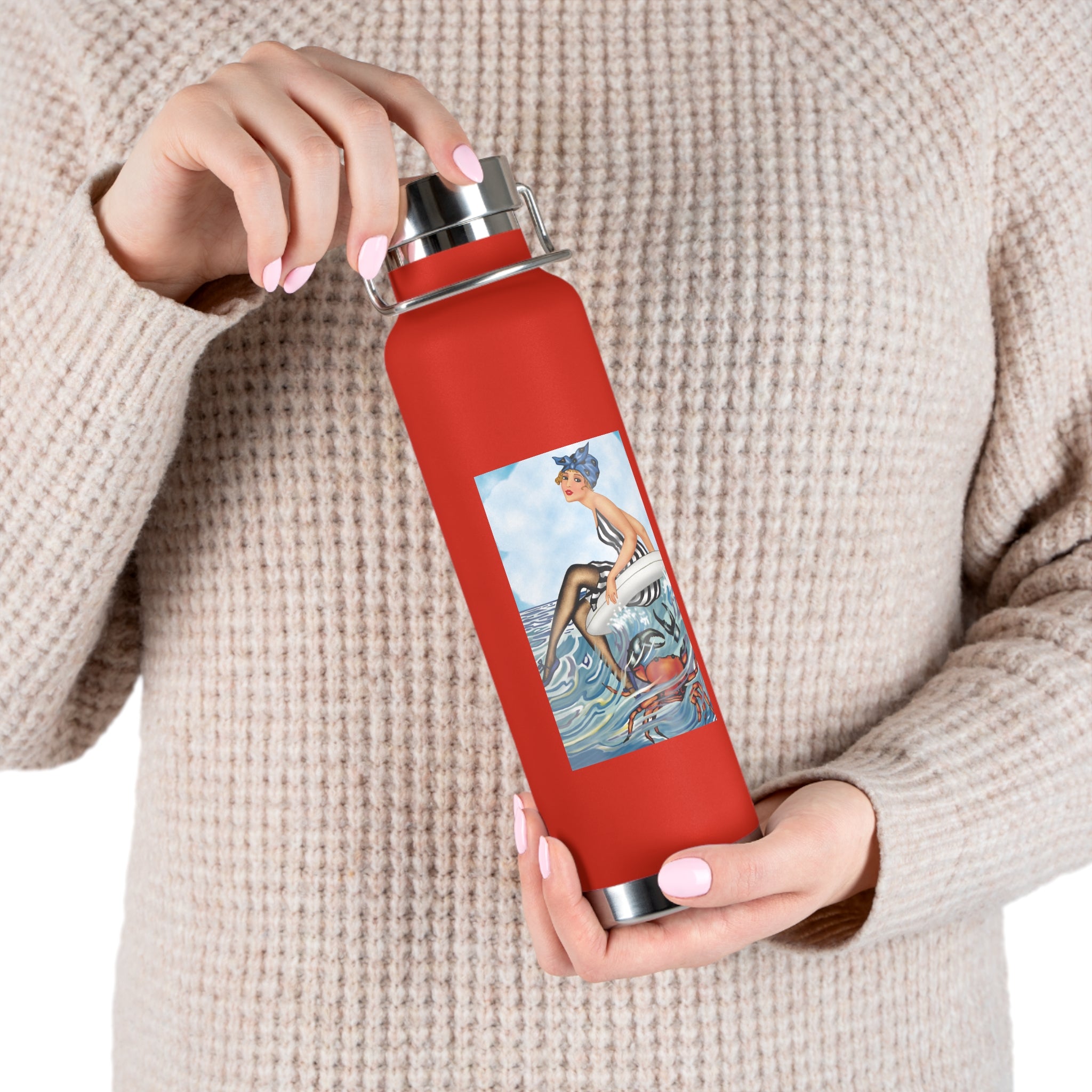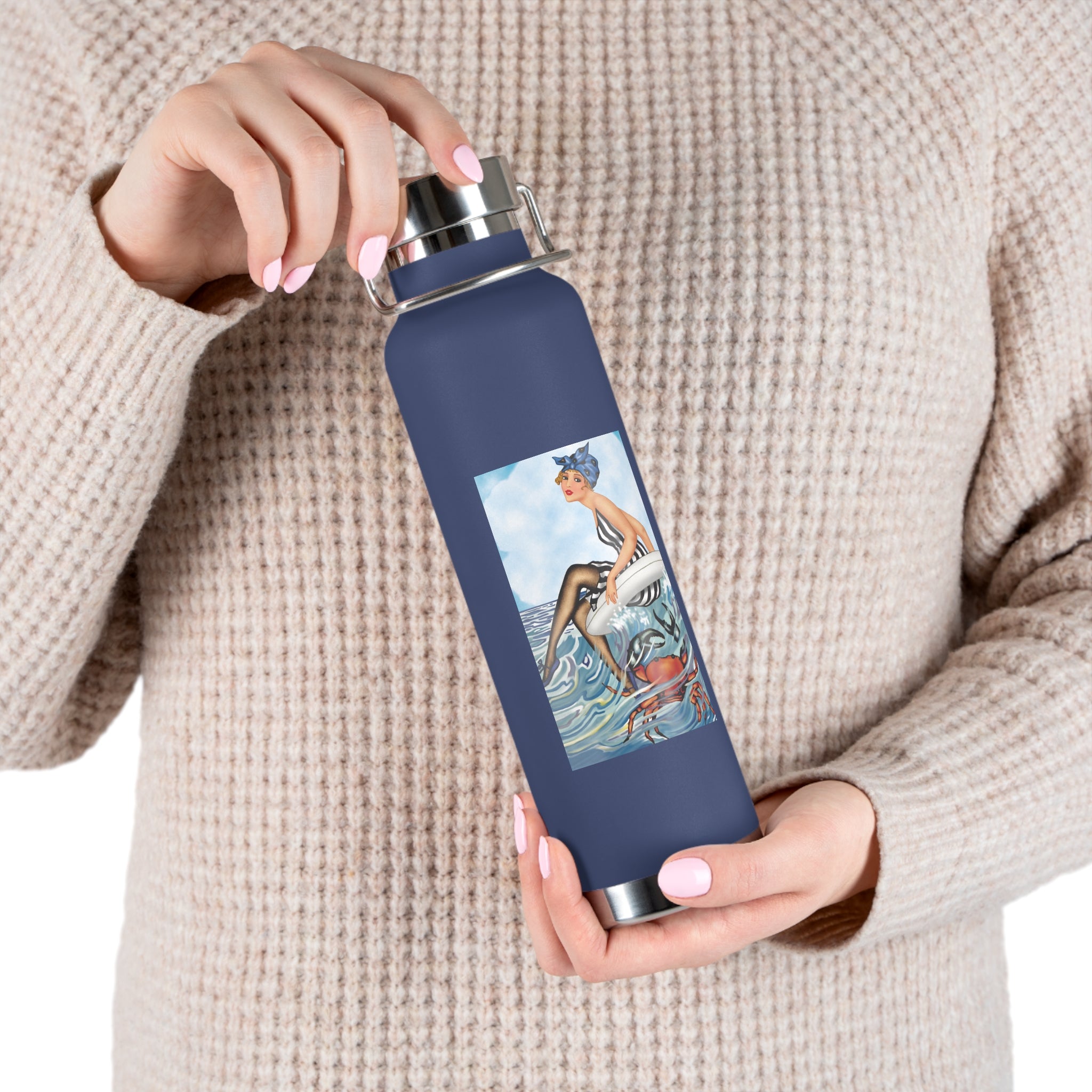 Artwork designed and digitally remastered by Sarasvati Designs. In a whimsical vintage art deco scene, an elegant woman in a fashionable striped swimsuit is playfully lifted by a wave while a stylized red crab reaches out from the sea, creating an amusing encounter.