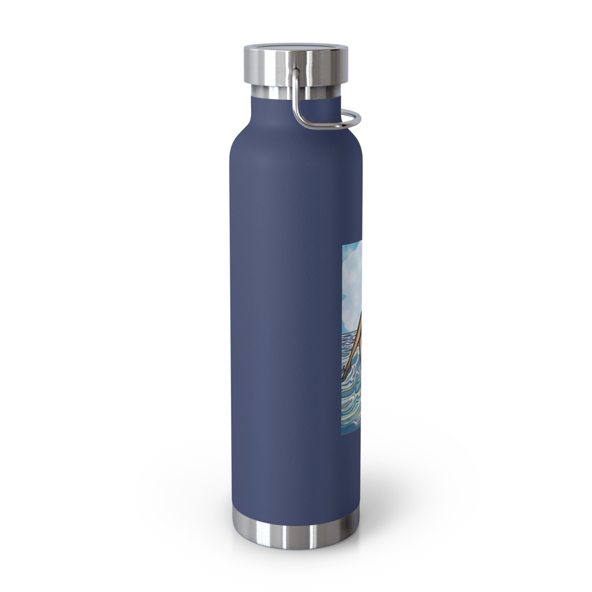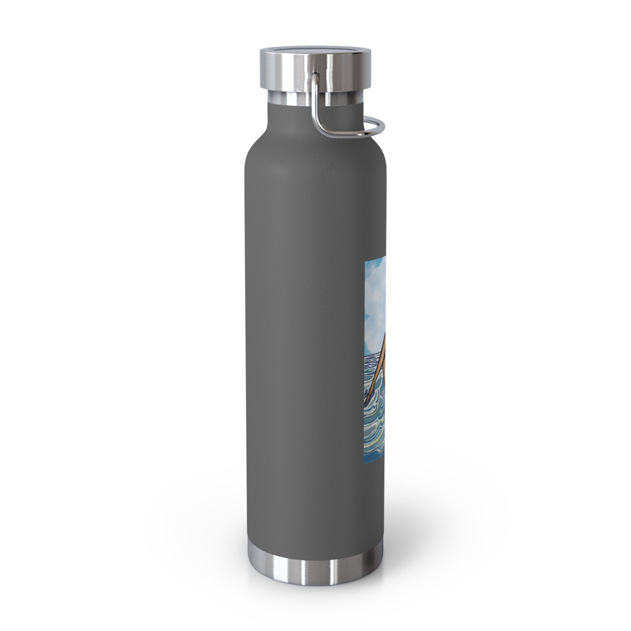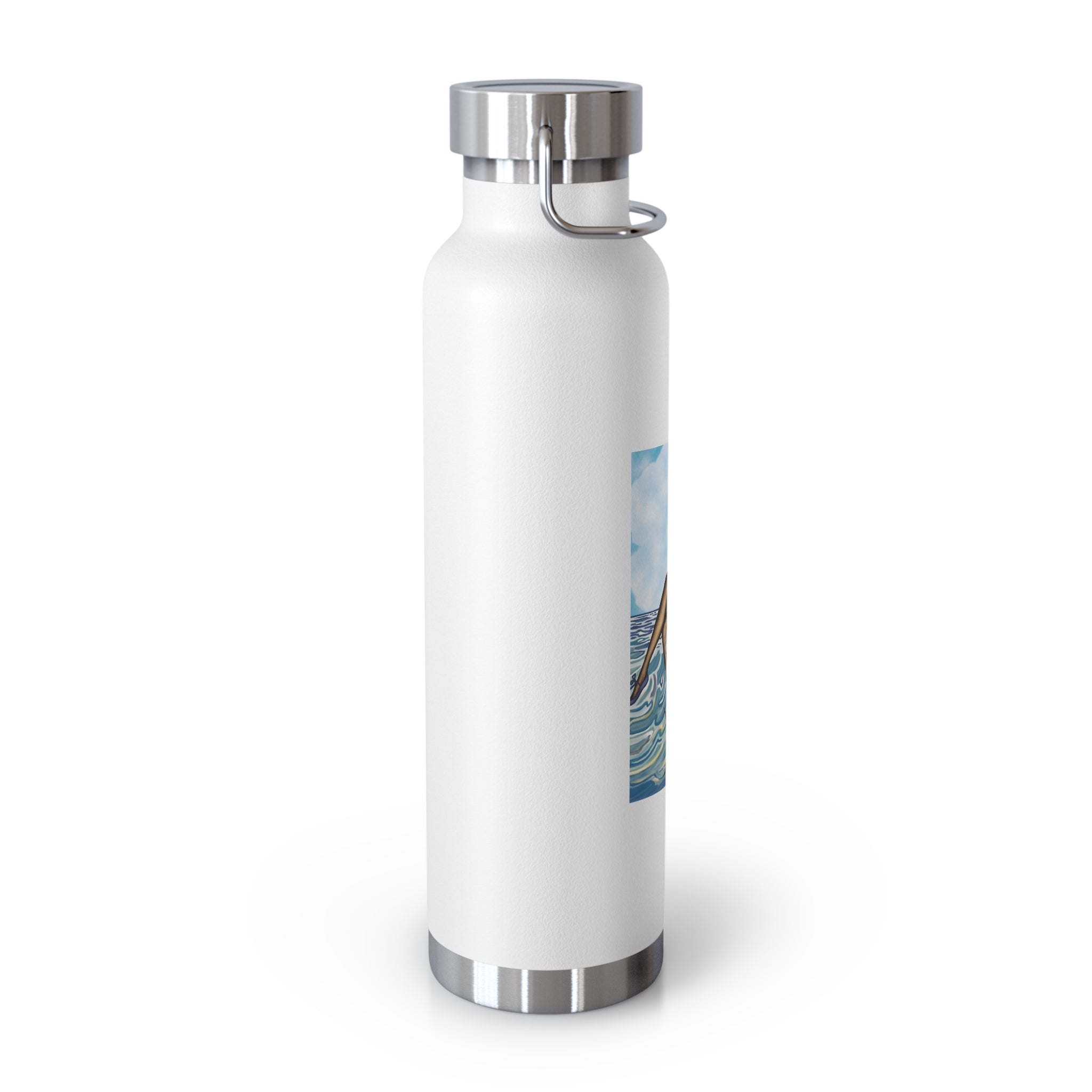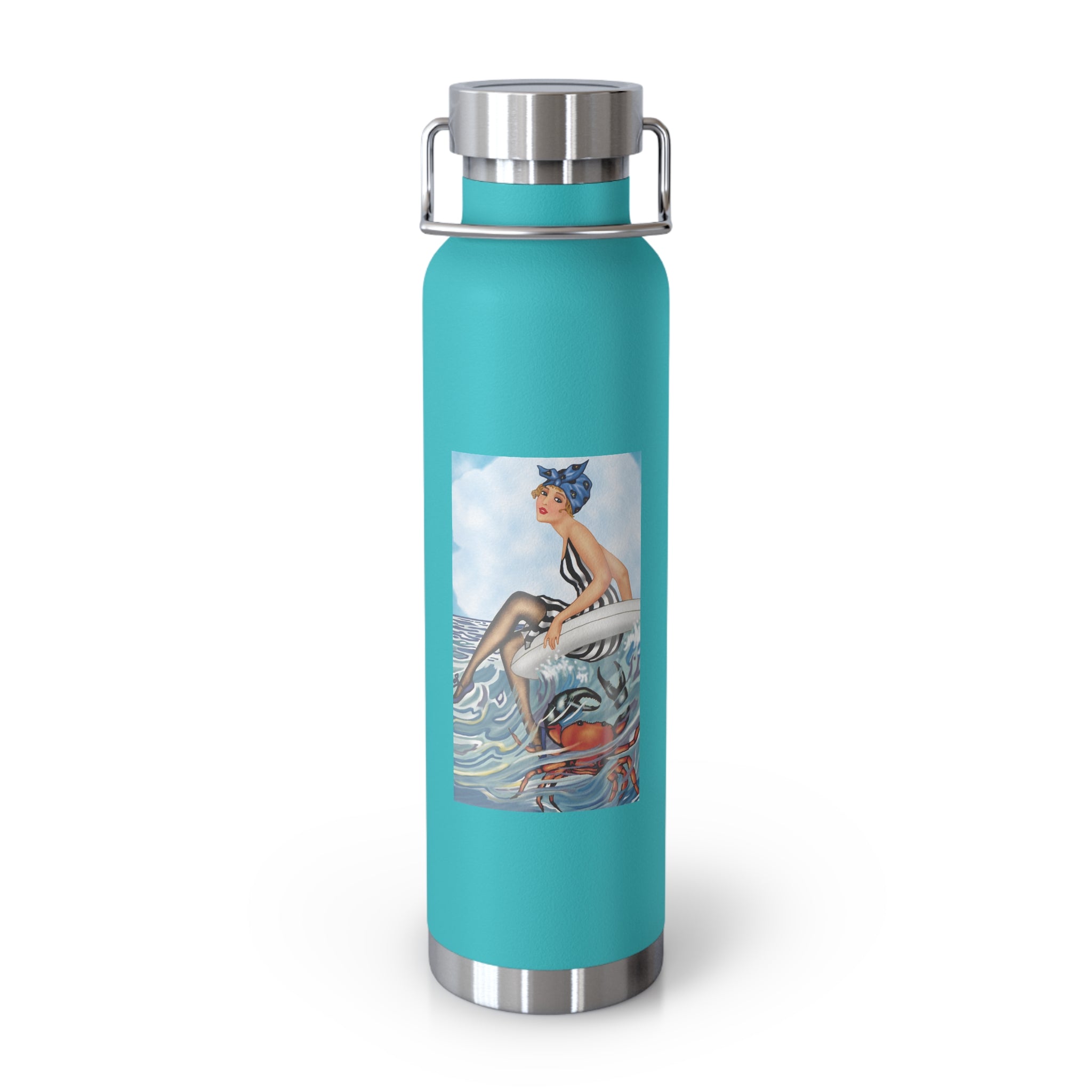 Artwork designed and digitally remastered by Sarasvati Designs. In a whimsical vintage art deco scene, an elegant woman in a fashionable striped swimsuit is playfully lifted by a wave while a stylized red crab reaches out from the sea, creating an amusing encounter.