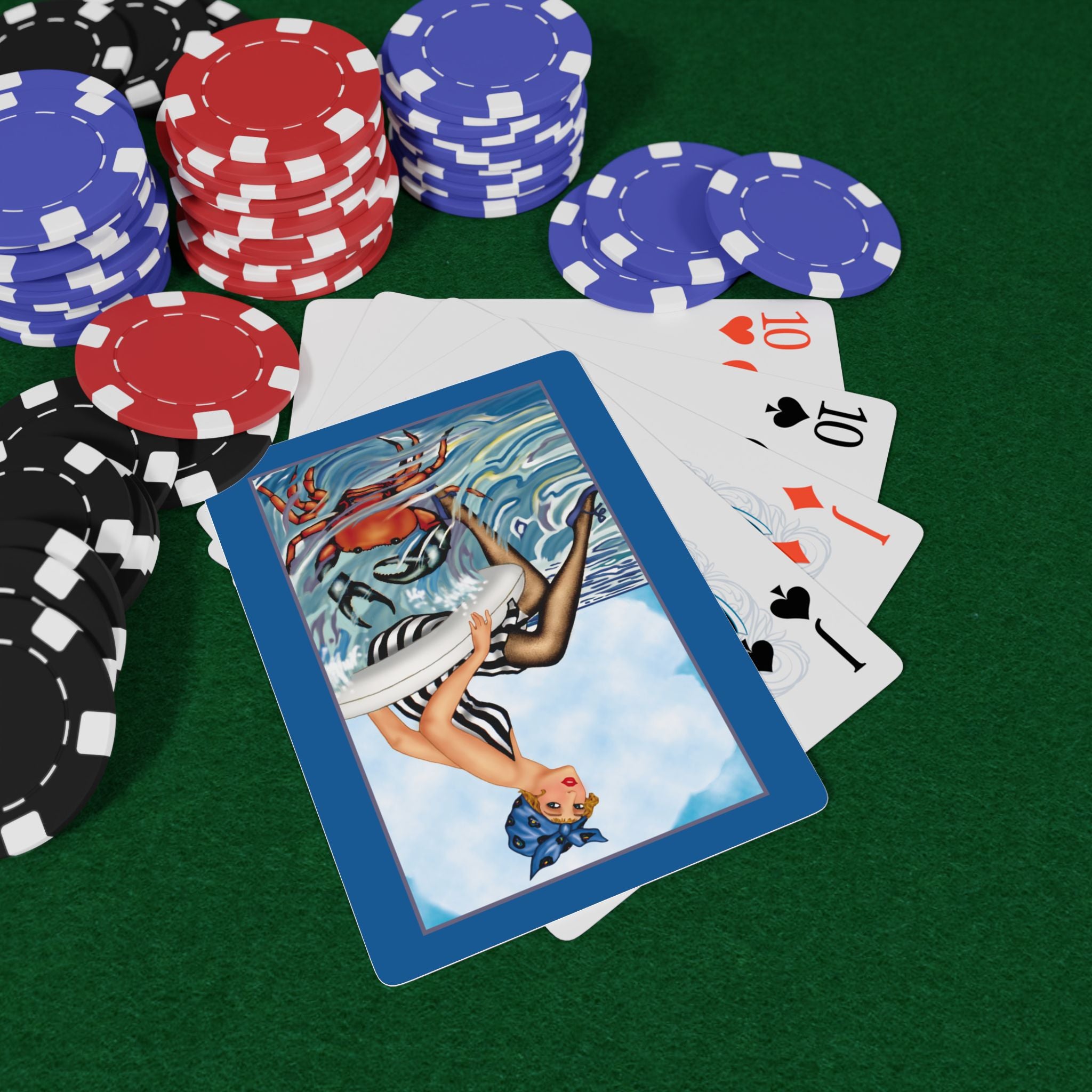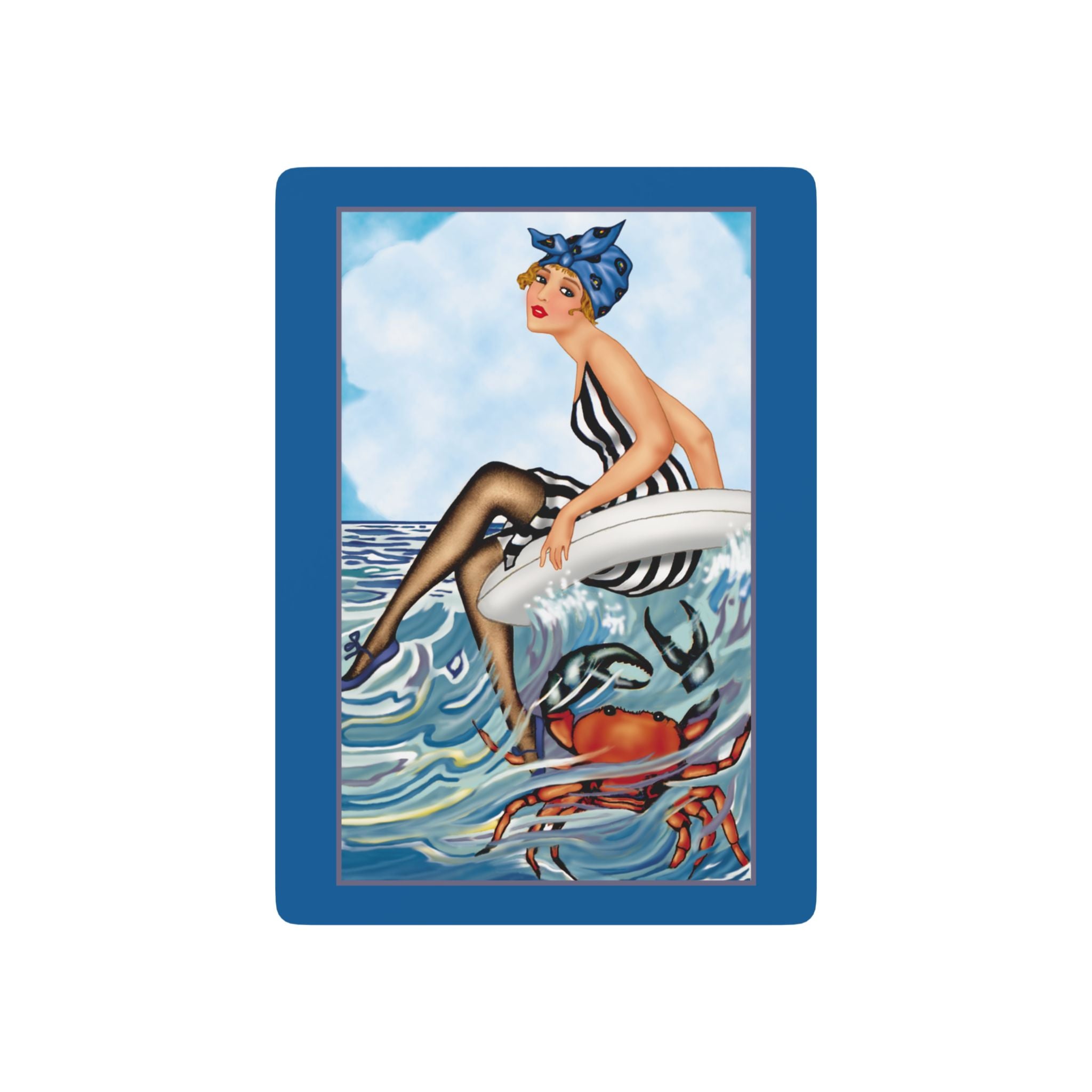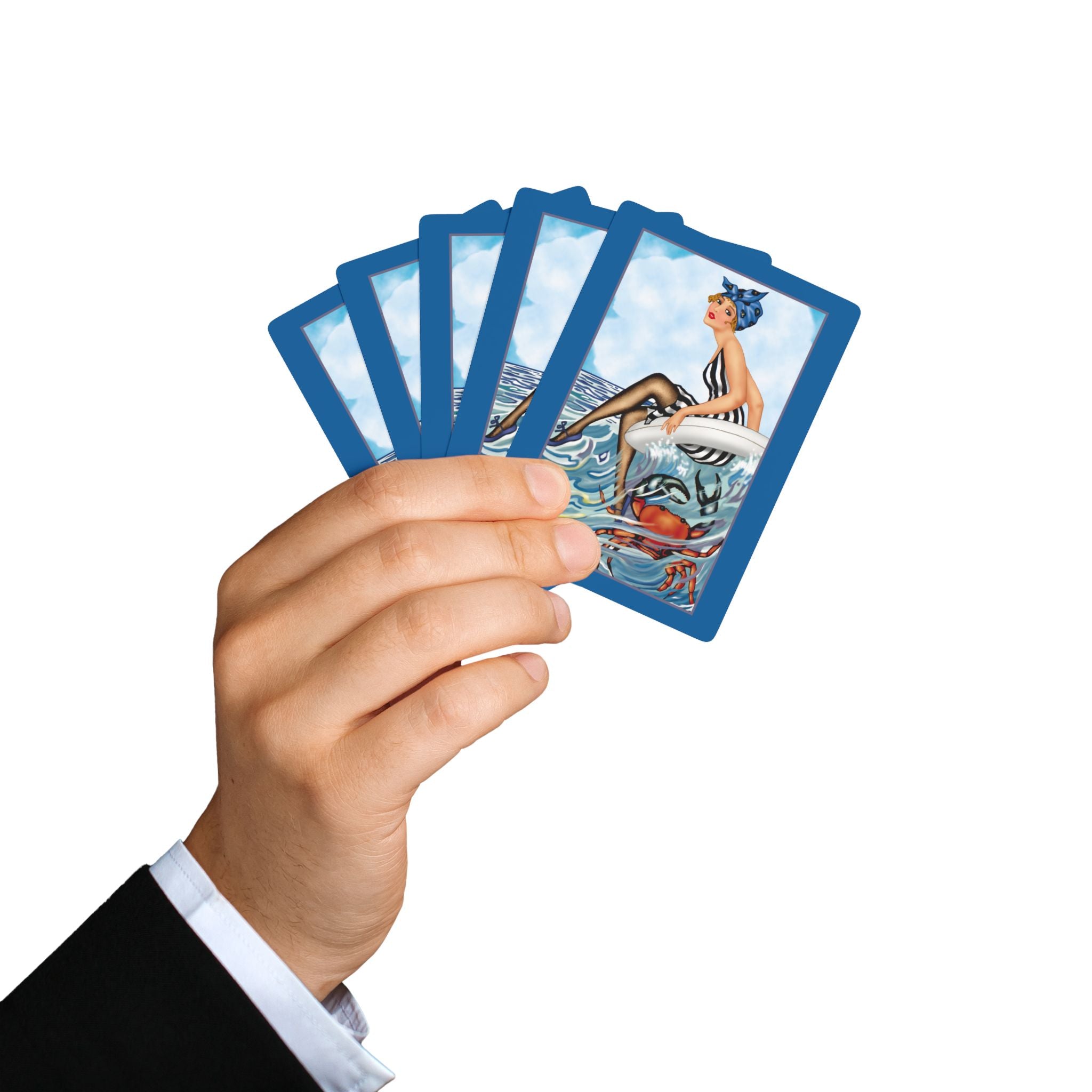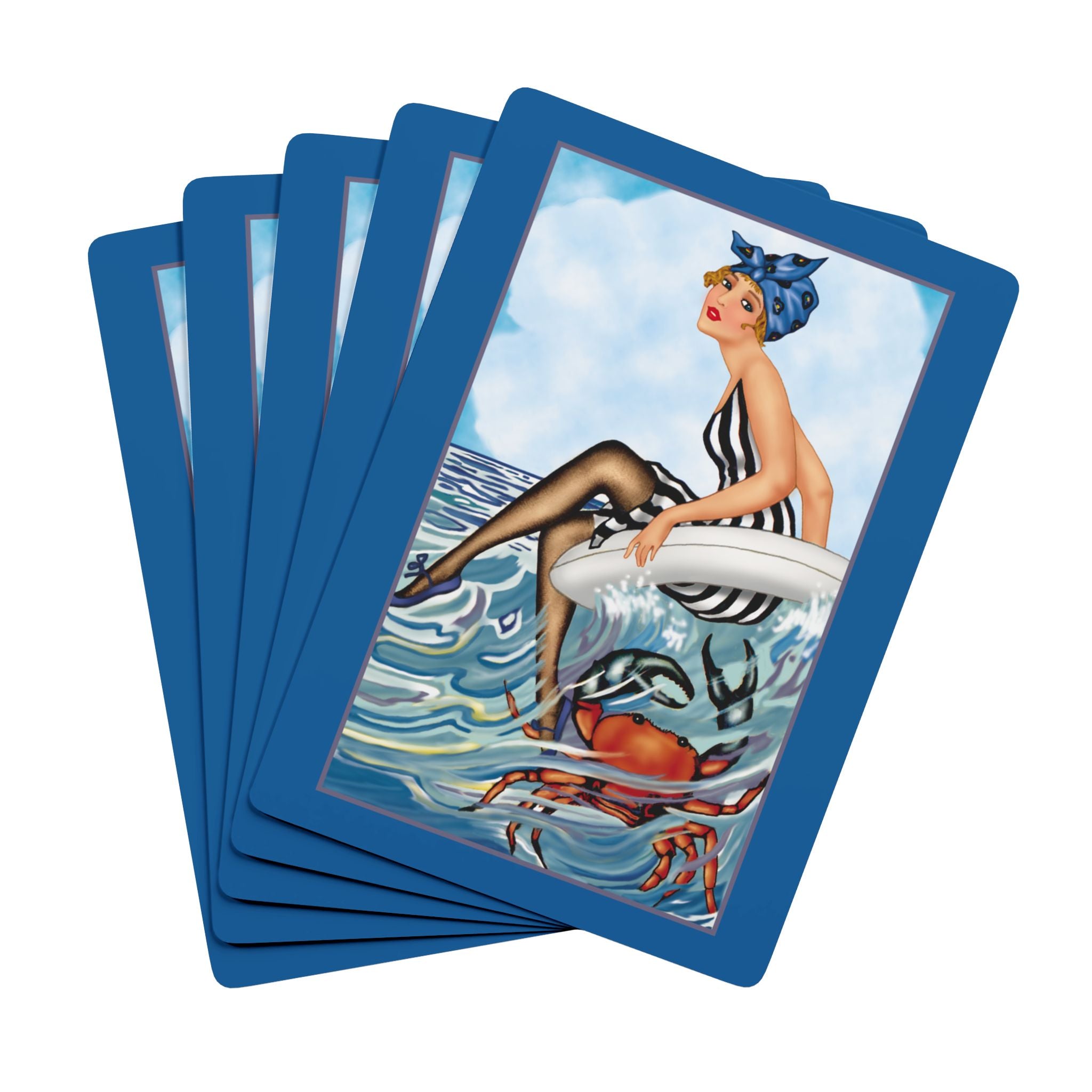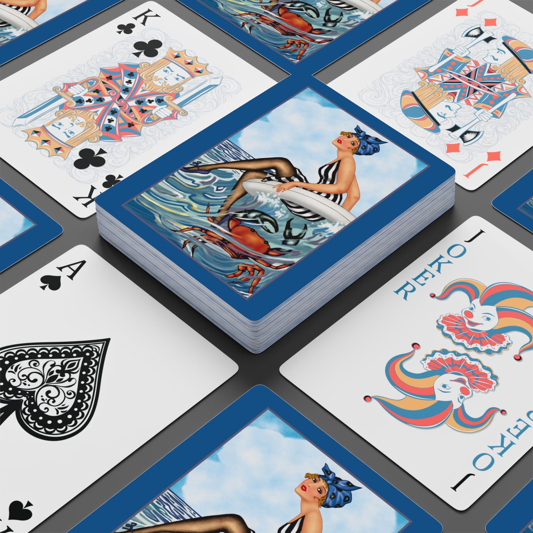 The featured artwork, Playful Waves and Fashion Follies Playing Cards, presents a whimsical vintage Art Deco scene where an elegant woman in a fashionable striped swimsuit is playfully lifted by a wave while a stylized red crab reaches out from the sea, creating an amusing encounter. This lighthearted image captures a delightful mix of fashion, nature, and charm.
