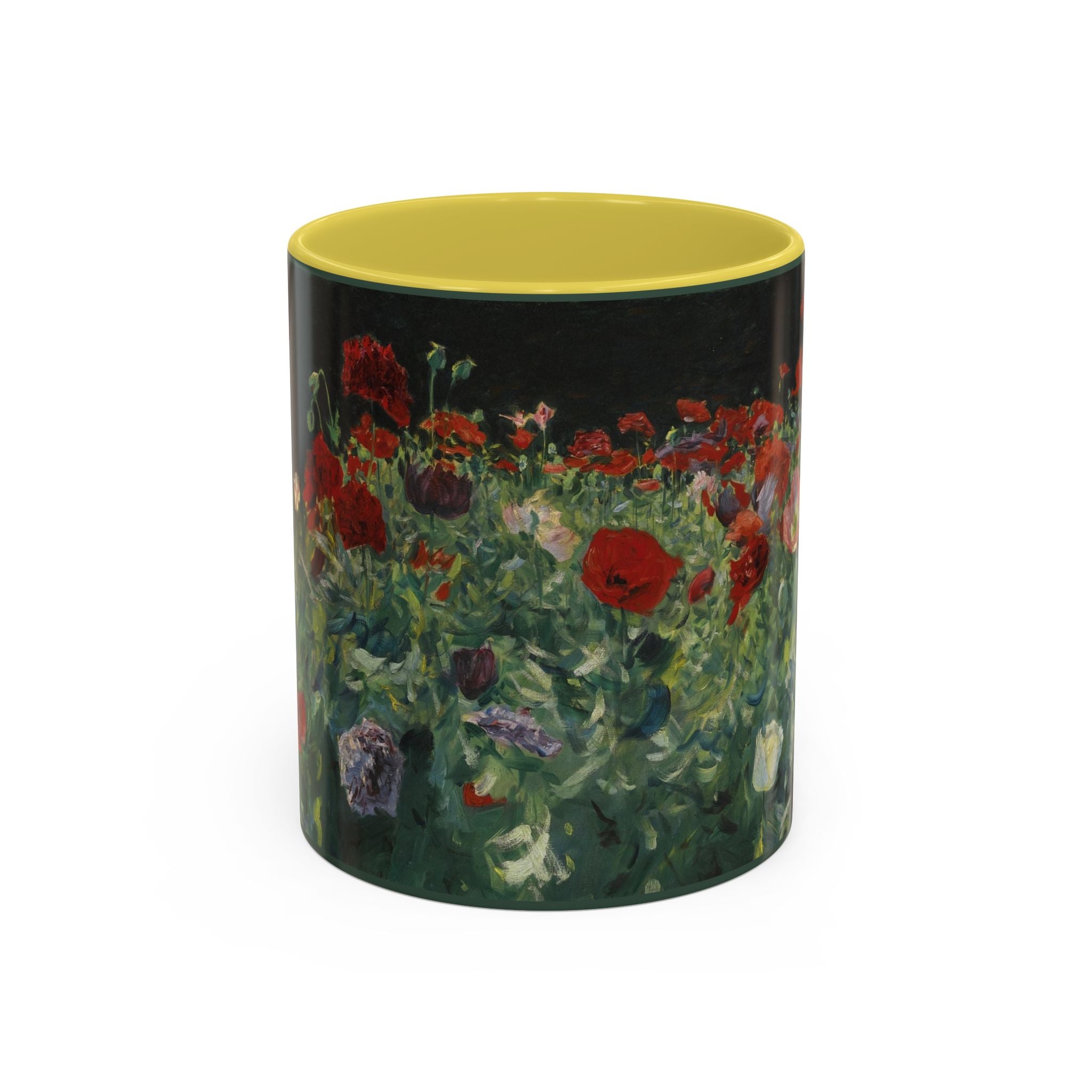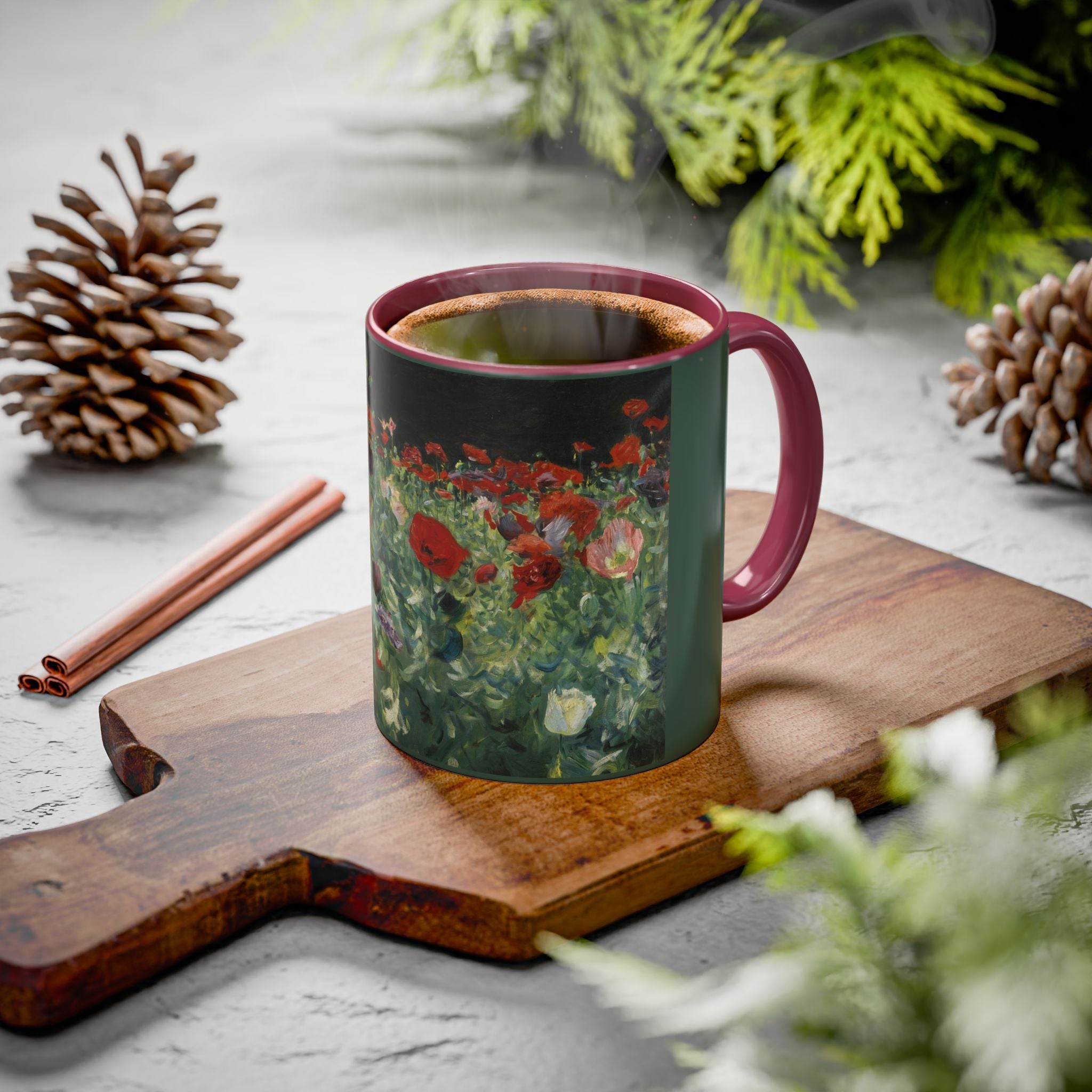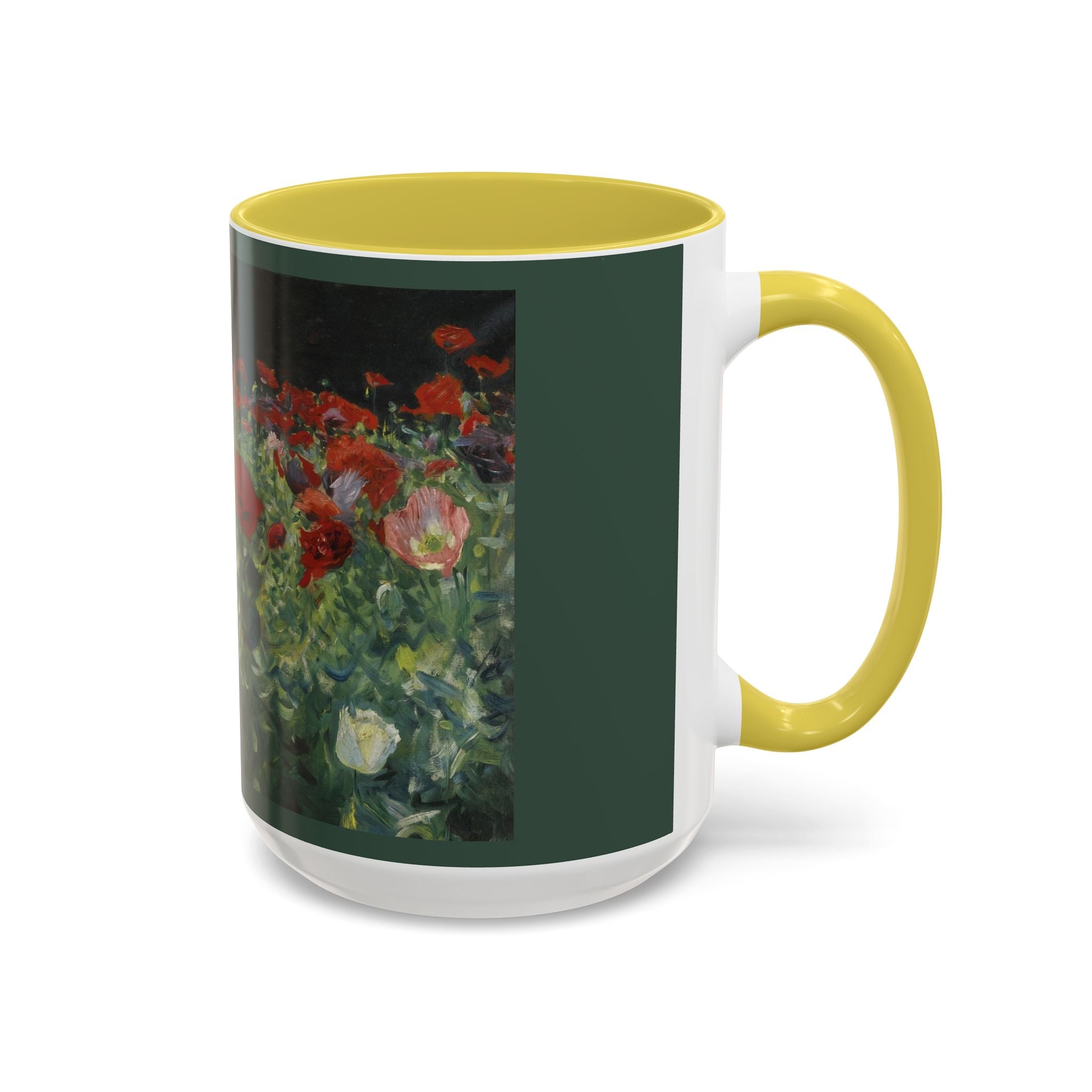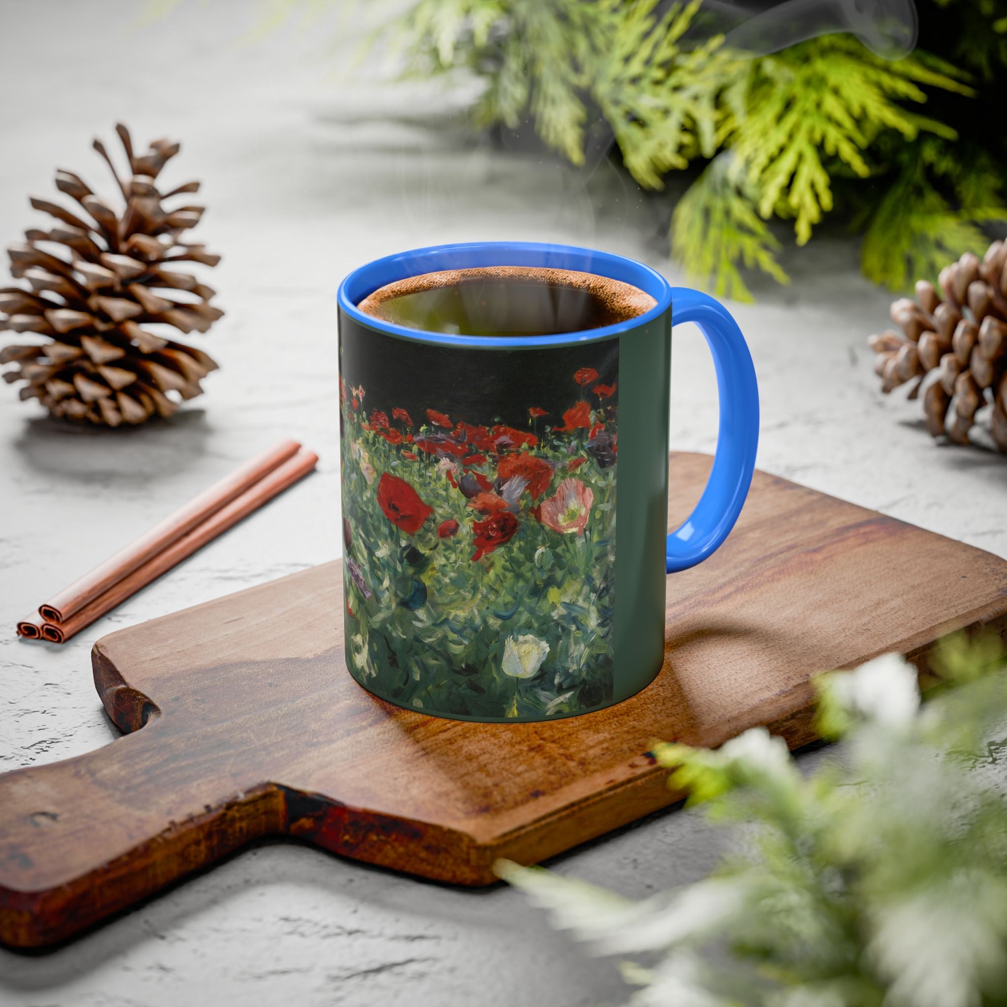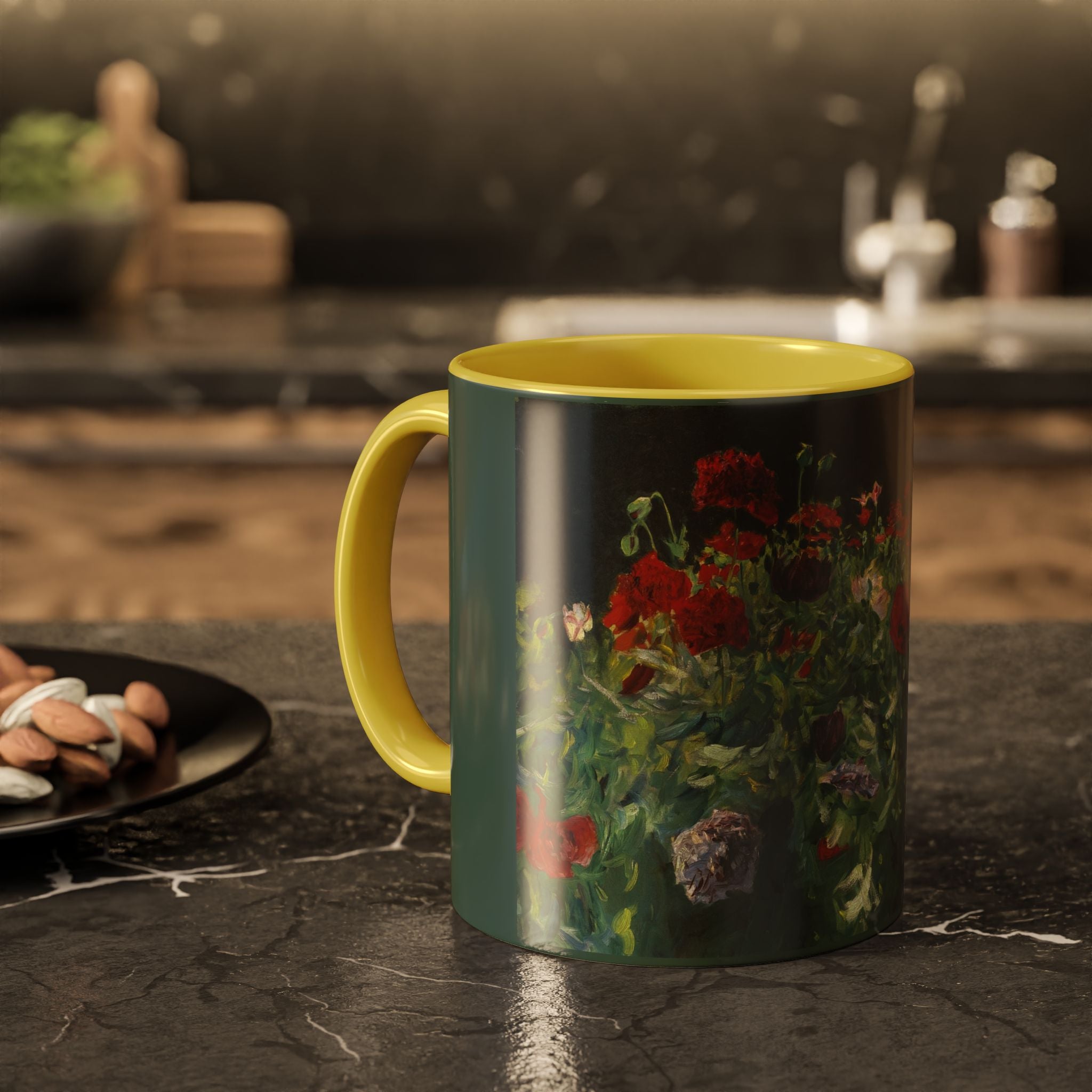 Mugs are a kitchen essential, and when infused with a personalized touch, they transform into cherished favorites. These mugs, offered in 12 vibrant color choices, can hold up to 11oz of your preferred rejuvenating beverage and feature a colored handle and interior. The glossy finish adds an elegant accent that beautifully complements the high-fidelity artwork print, making them not only a delightful addition to your kitchen but also a fantastic choice for thoughtful gifts.