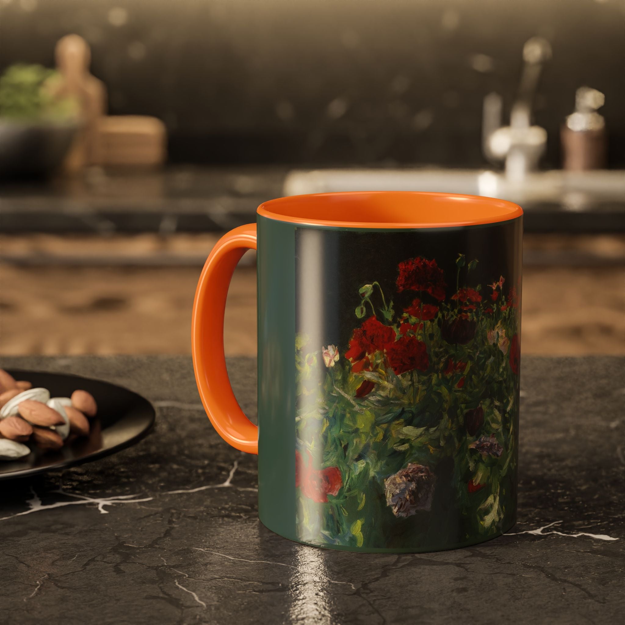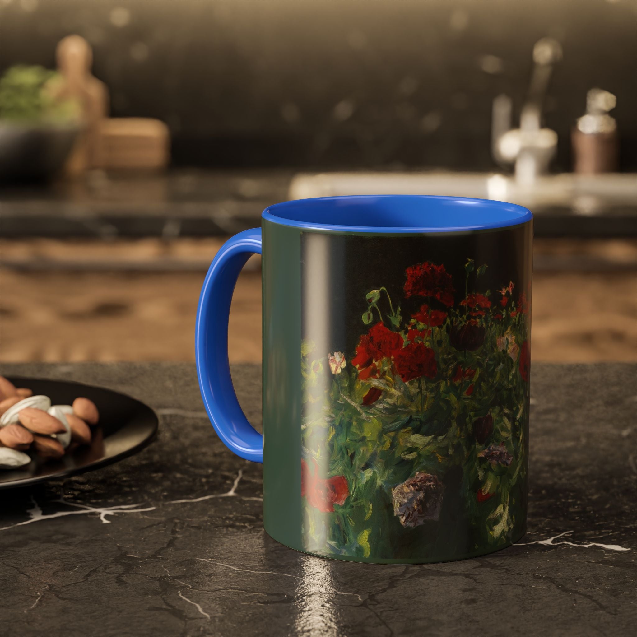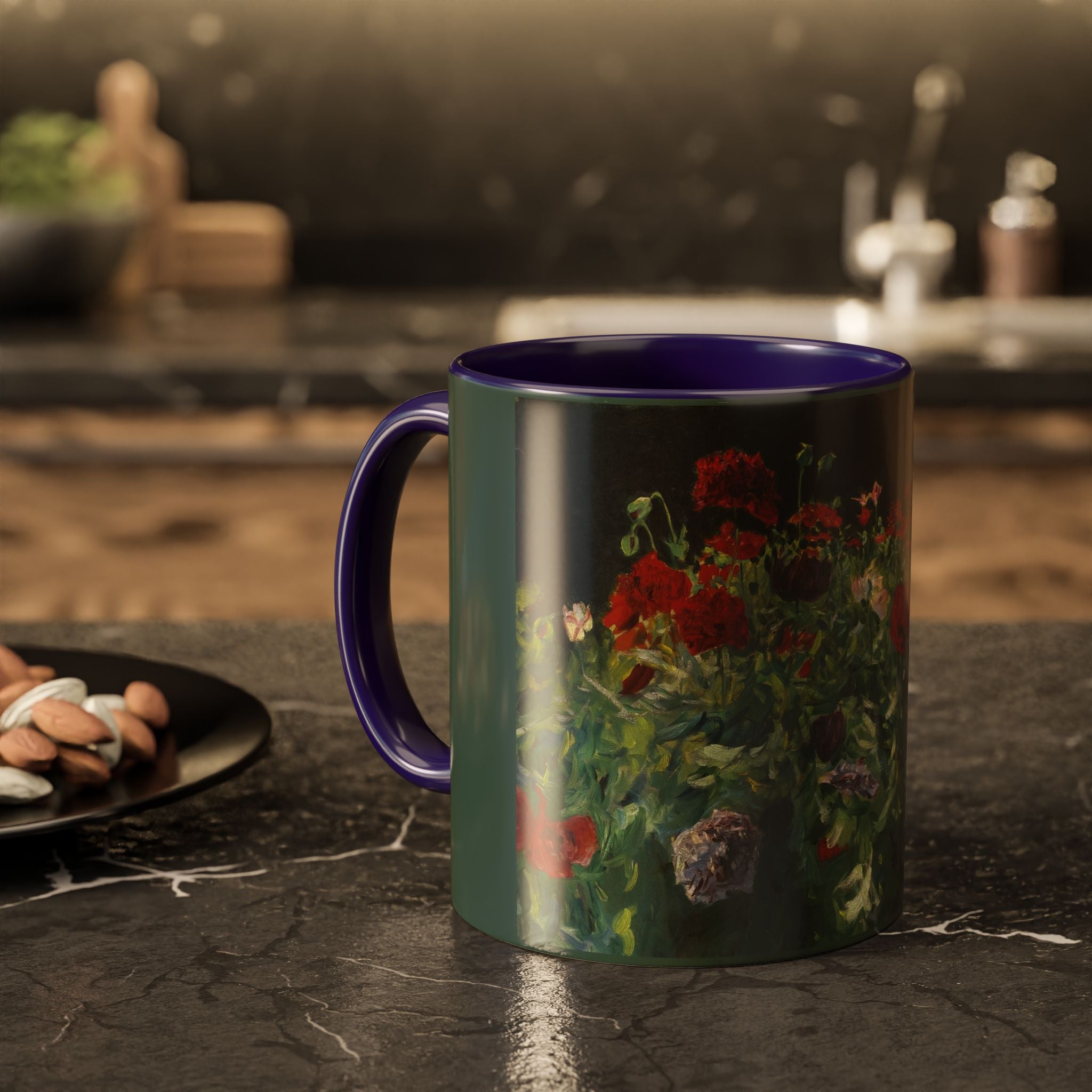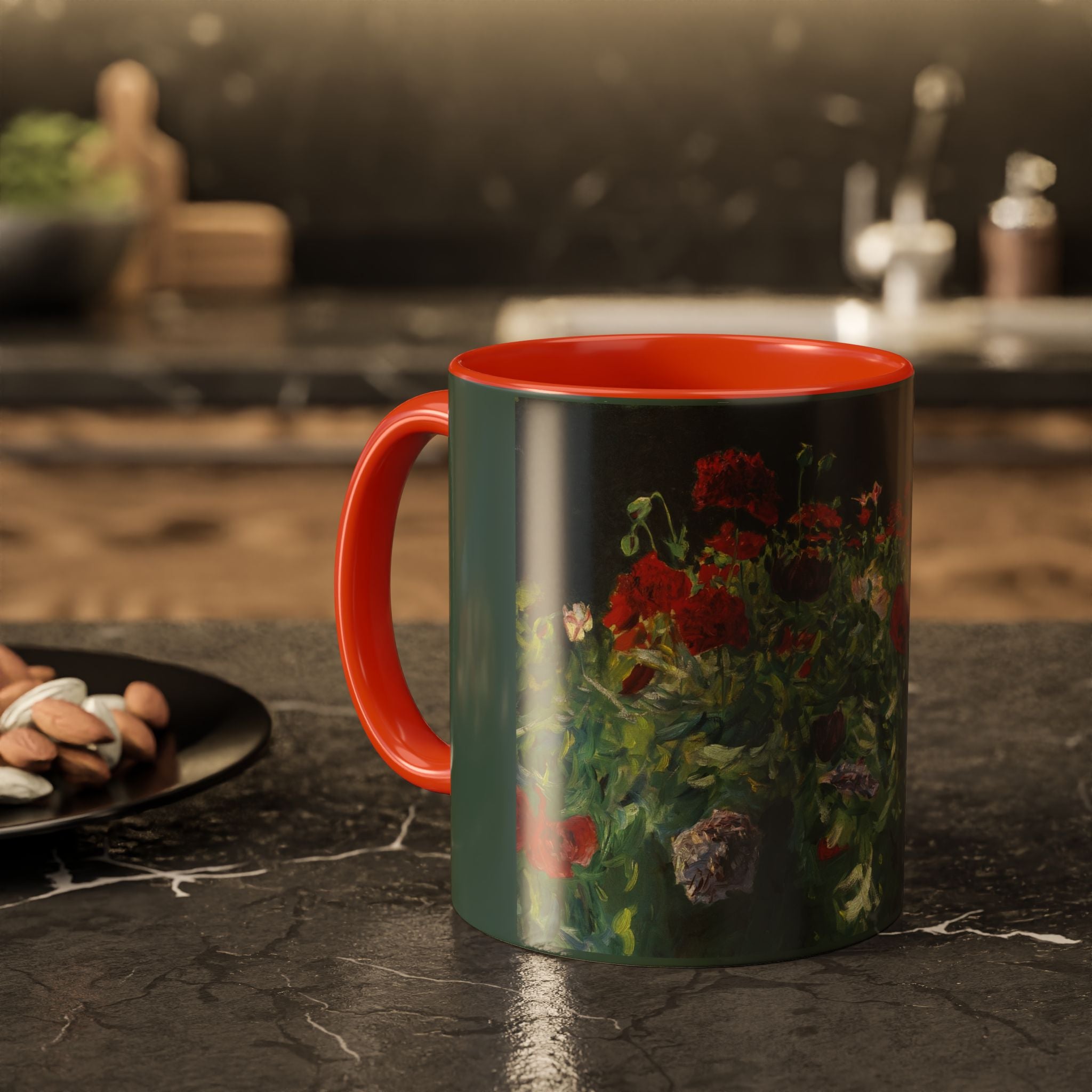 Mugs are a kitchen essential, and when infused with a personalized touch, they transform into cherished favorites. These mugs, offered in 12 vibrant color choices, can hold up to 11oz of your preferred rejuvenating beverage and feature a colored handle and interior. The glossy finish adds an elegant accent that beautifully complements the high-fidelity artwork print, making them not only a delightful addition to your kitchen but also a fantastic choice for thoughtful gifts.
