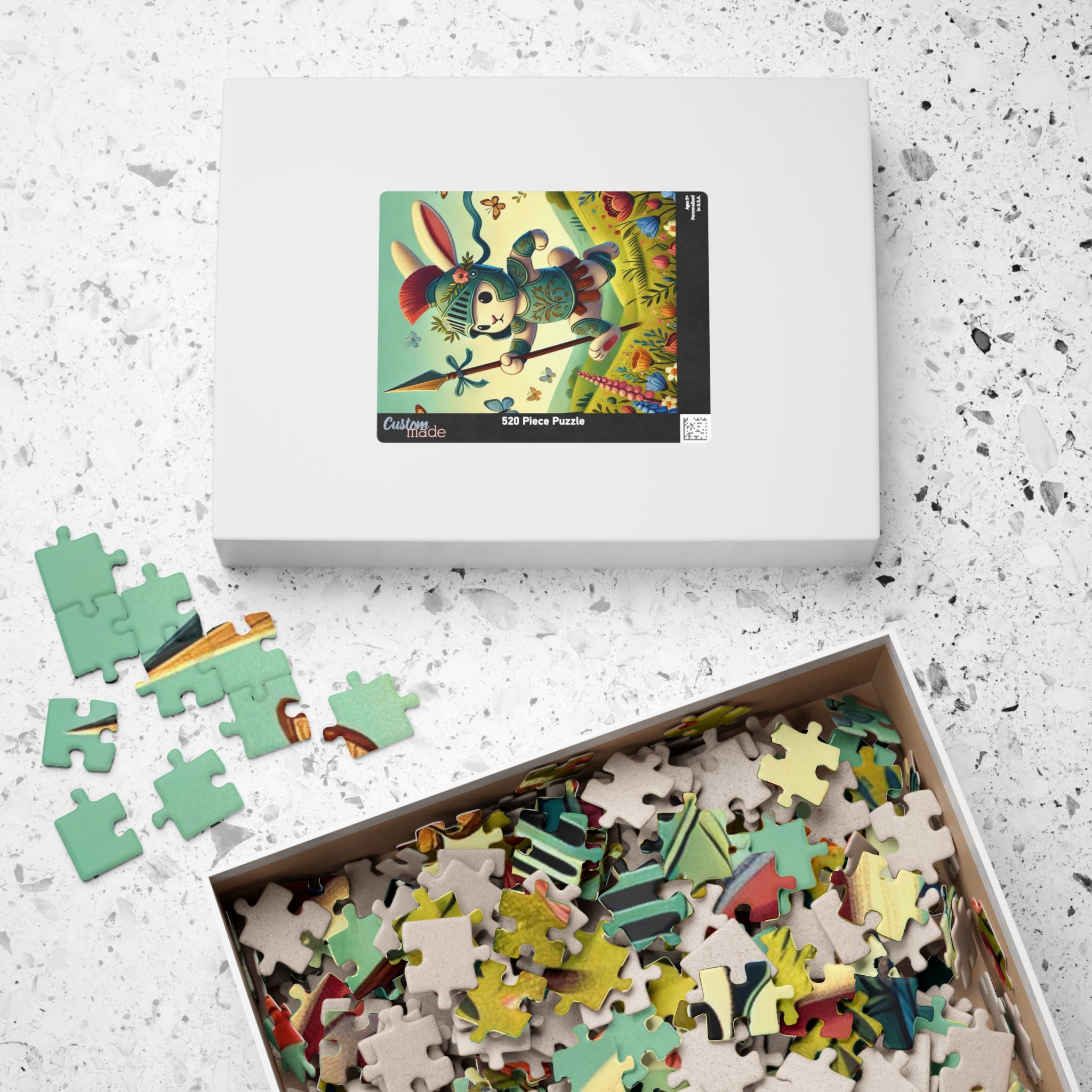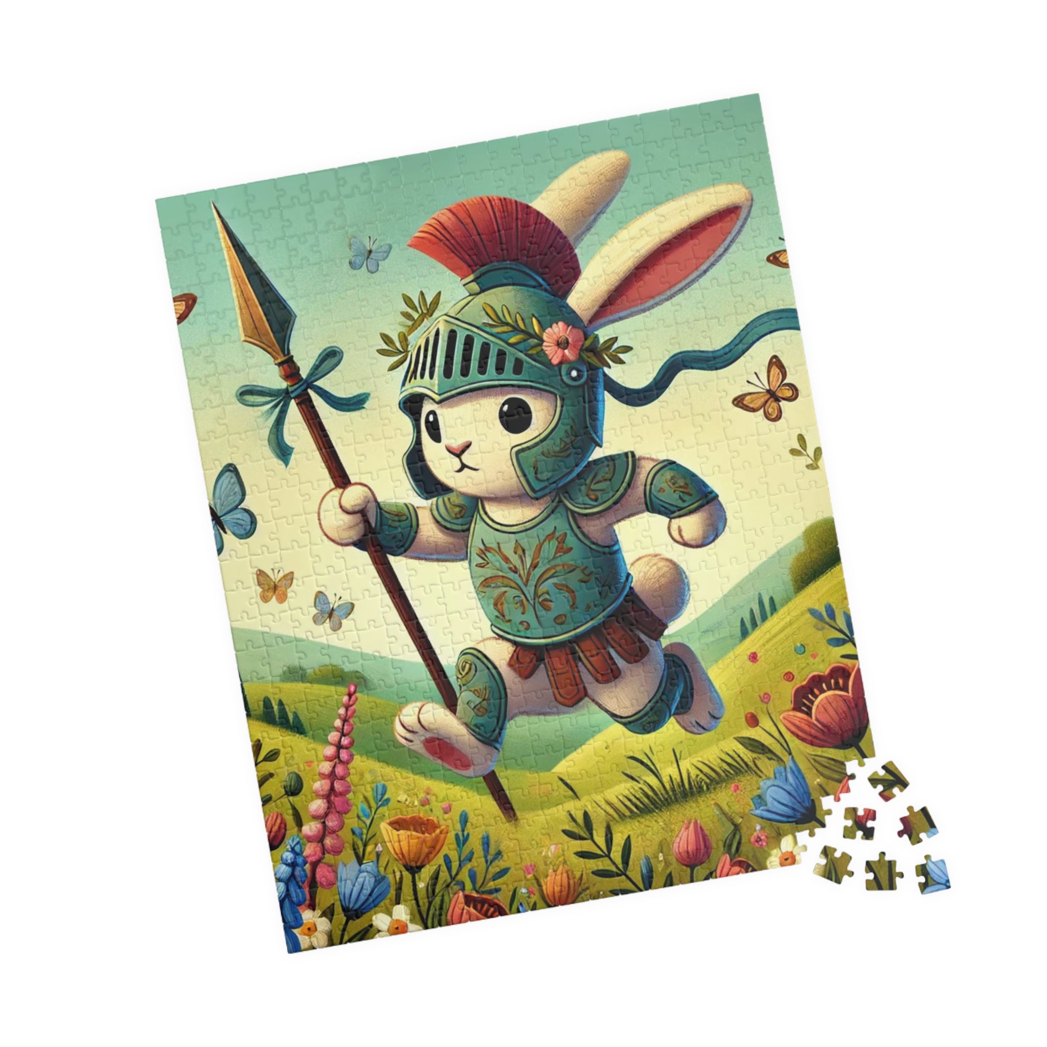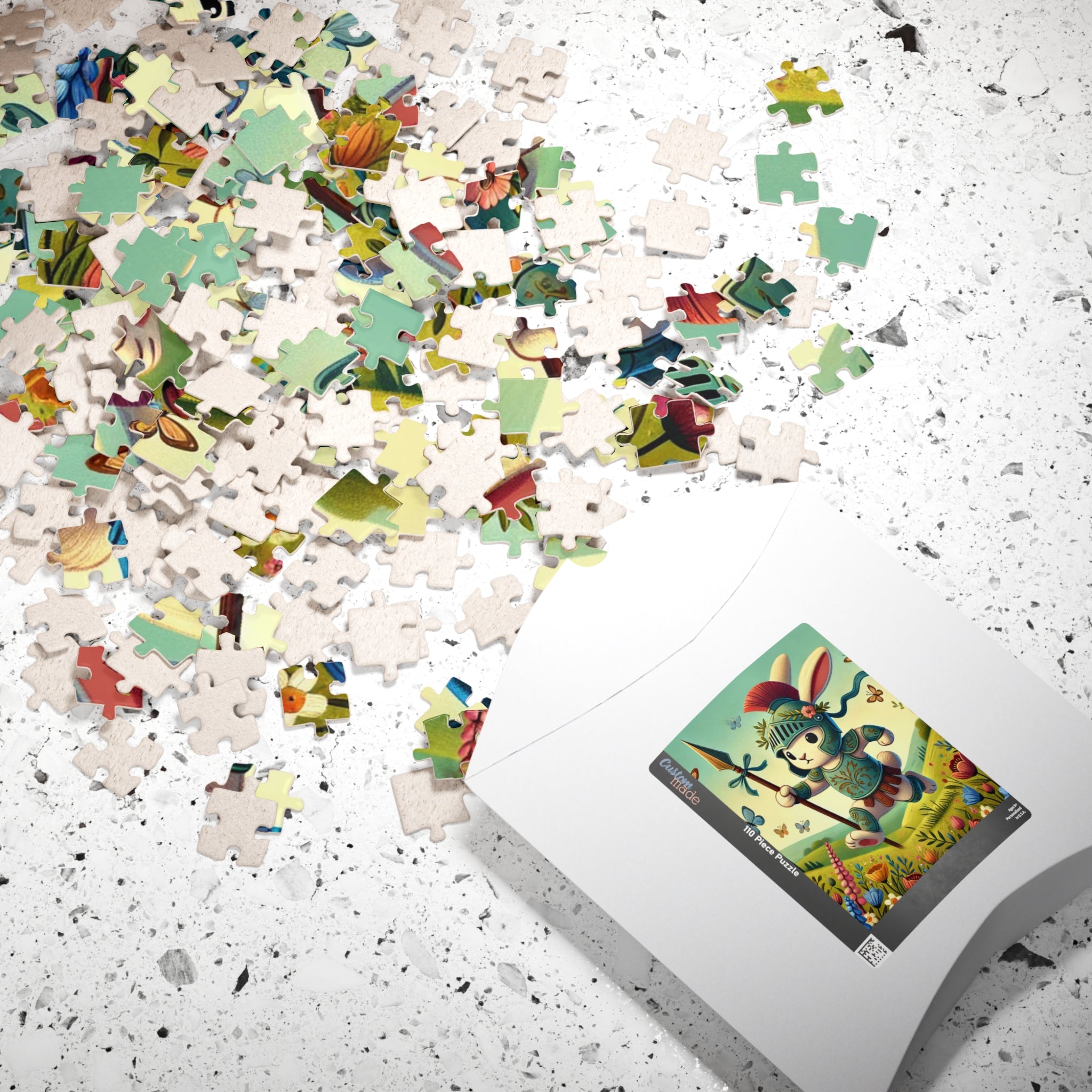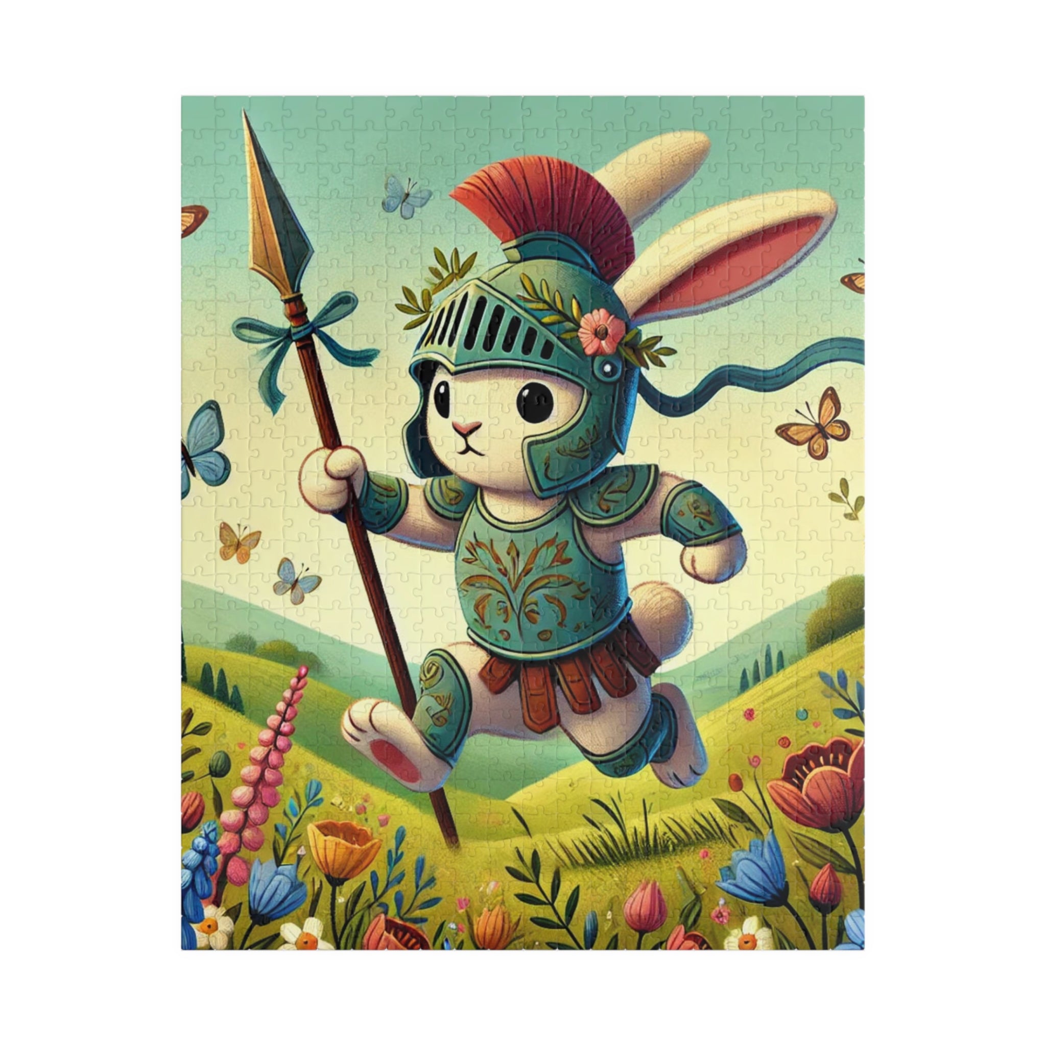 The Rabbit Gladiator artwork features a fearless rabbit wielding a wooden spear, hopping through a flower-filled meadow to defend its clan. The scene captures the spirit of heroism and play, blending the excitement of a tiny warrior’s quest with the innocence of springtime wonder. With its soft tones, lively motion, and playful yet refined design, this puzzle brings both adventure and joy to every piece.