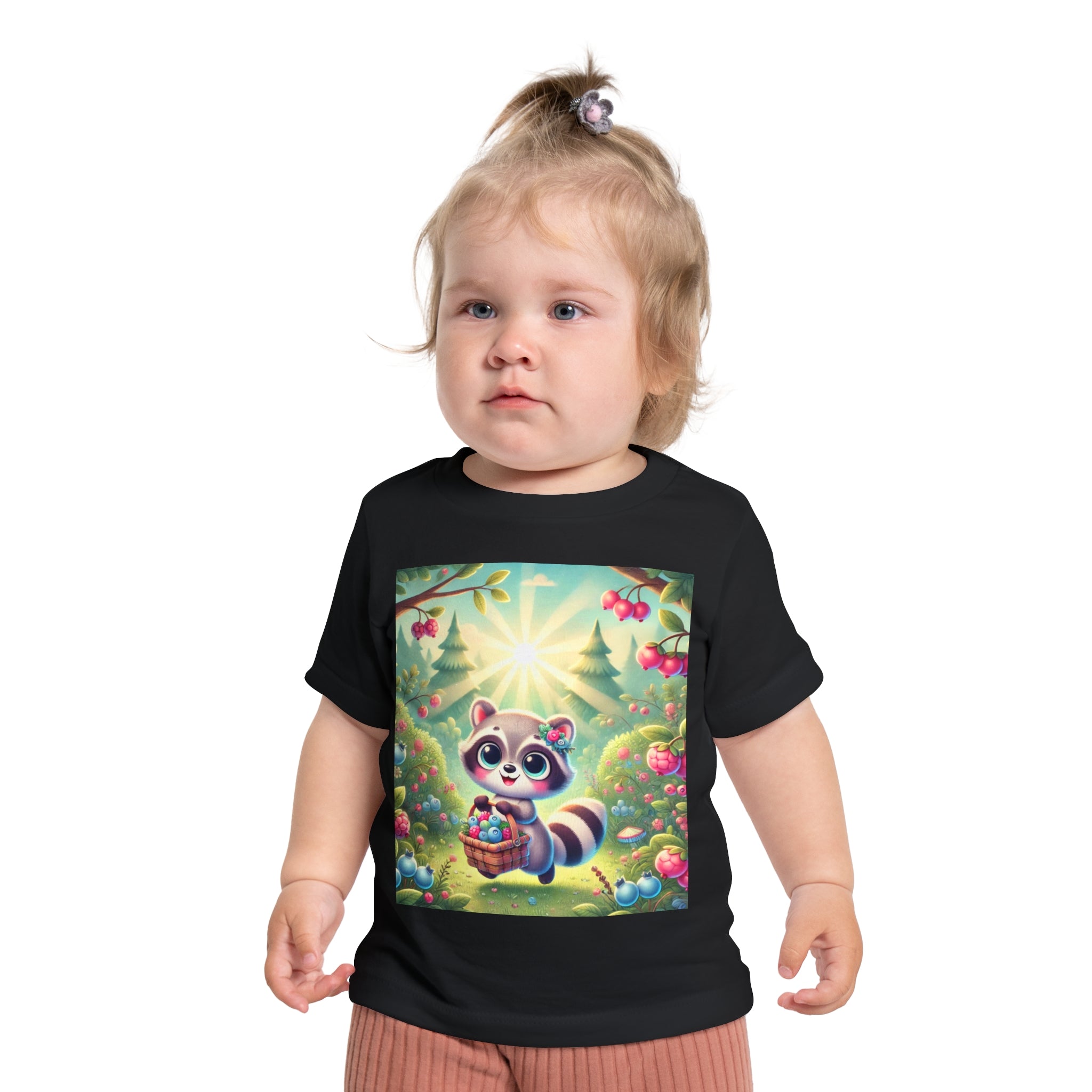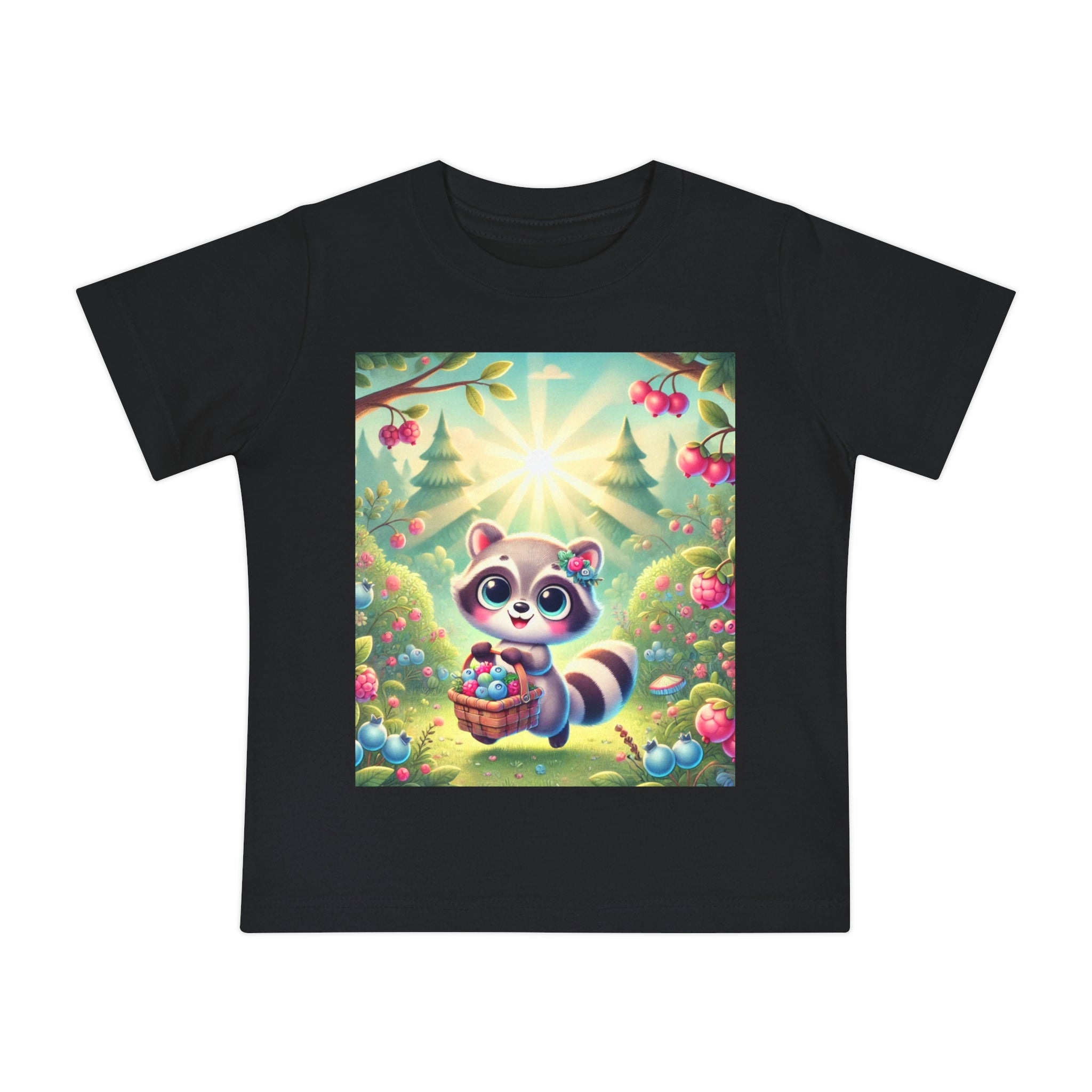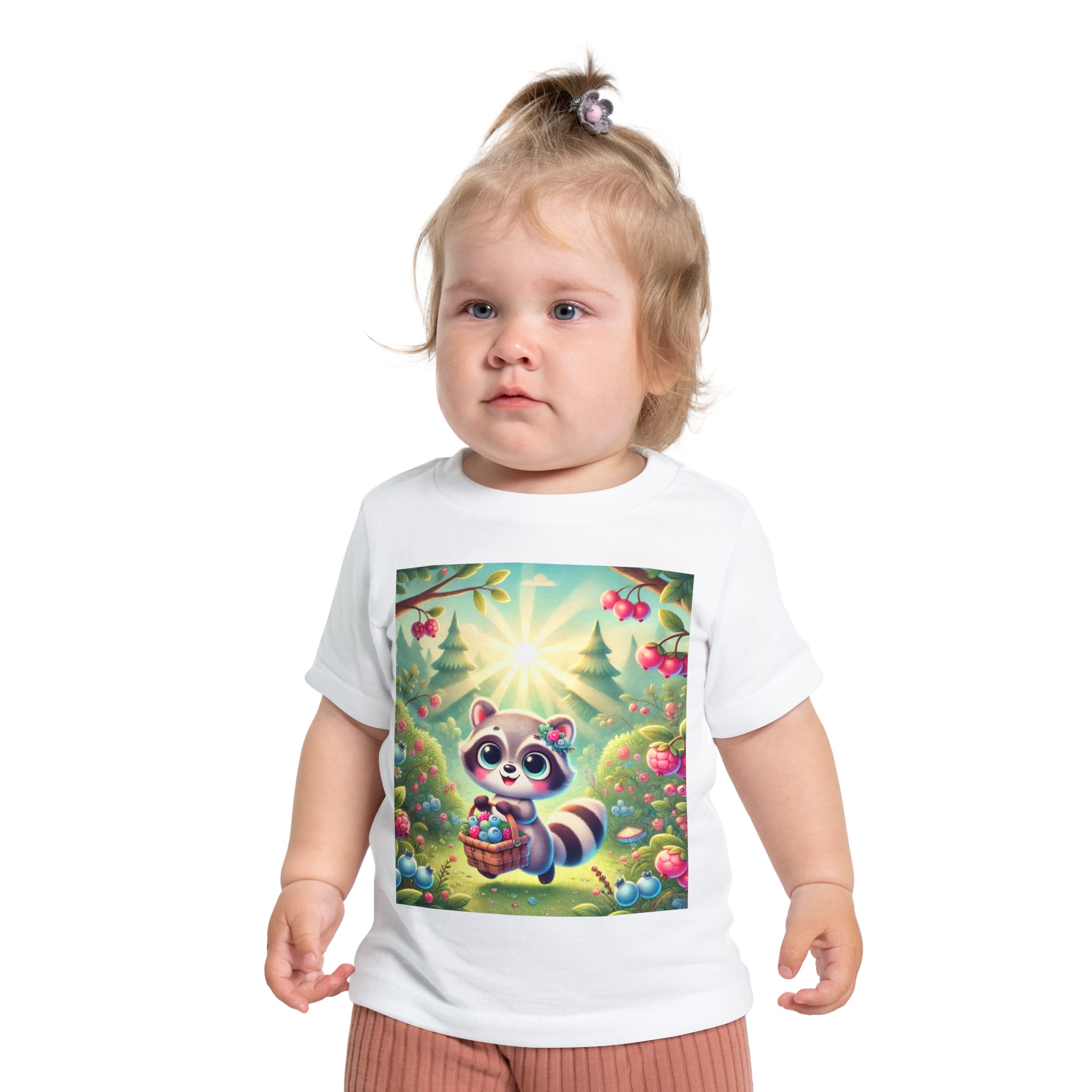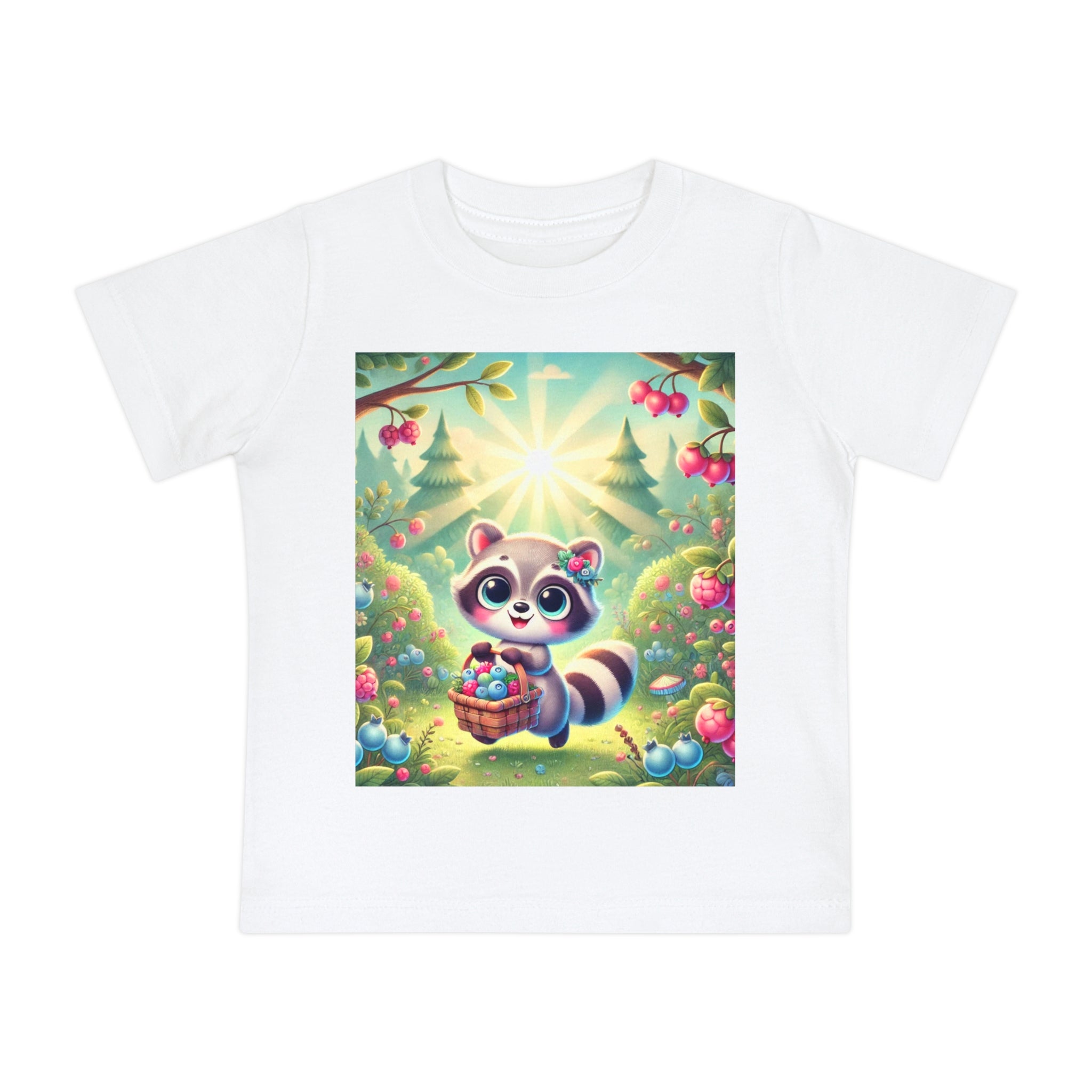 Raccoon’s Berry Basket brings the warmth and sweetness of summer to life in this charming woodland scene. Bathed in golden sunlight, a young raccoon stands amid a lush berry grove, proudly holding a small basket overflowing with freshly picked fruit. Around the playful little gatherer, raspberry bushes, blueberry clusters, and cherry-laden branches glow with vibrant color under a clear blue sky. Sunbeams stream through tall evergreens, making each leaf and berry shimmer with life. A tiny flower tucked behind the raccoon’s ear adds an endearing touch of innocence. Rendered in flat, storybook-style colors with gentle gradients and rich detail, this heartwarming artwork captures the simple joys of discovery, the beauty of nature’s abundance, and the wonder of childhood curiosity.