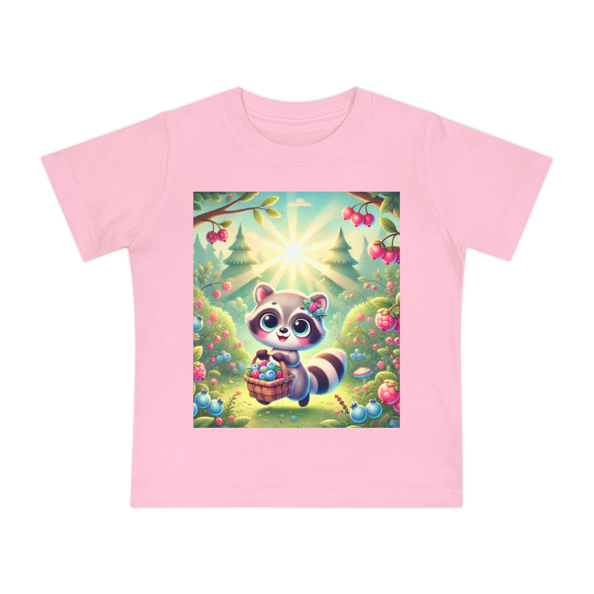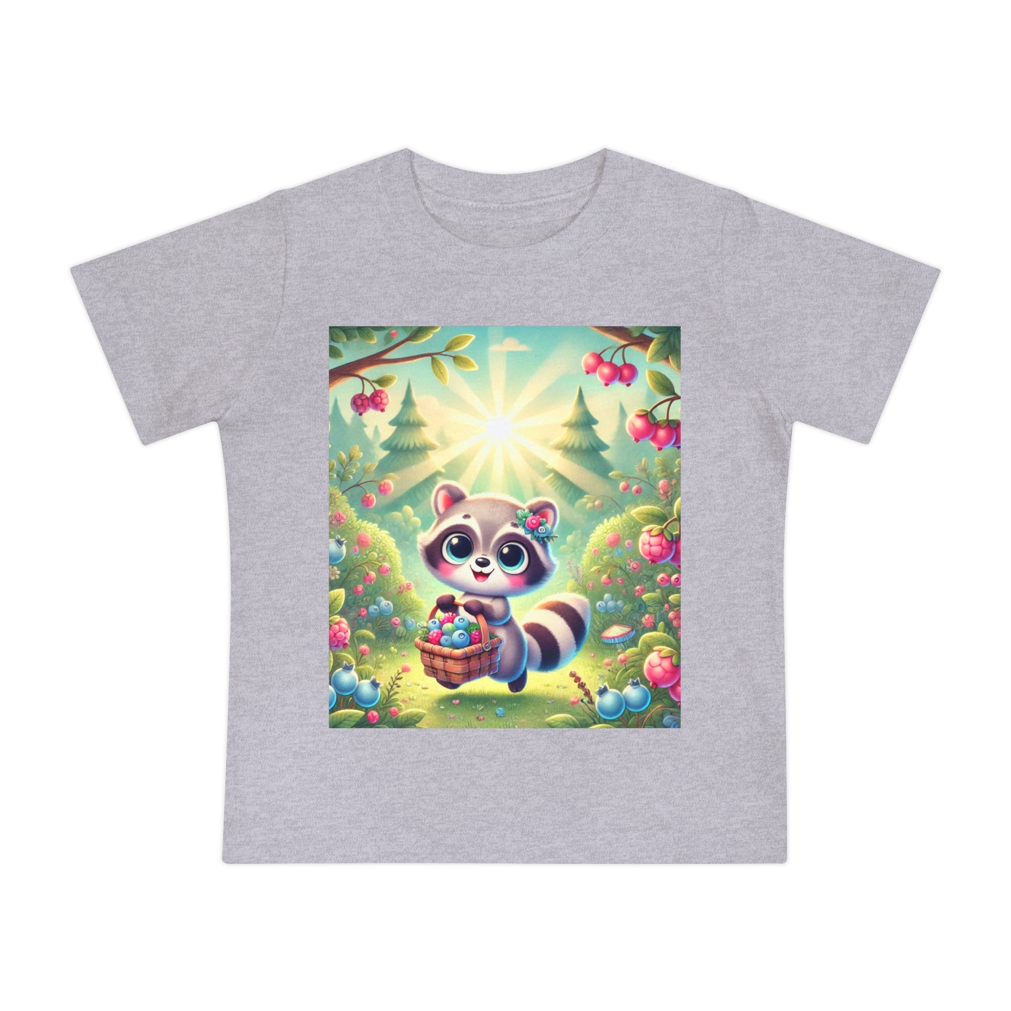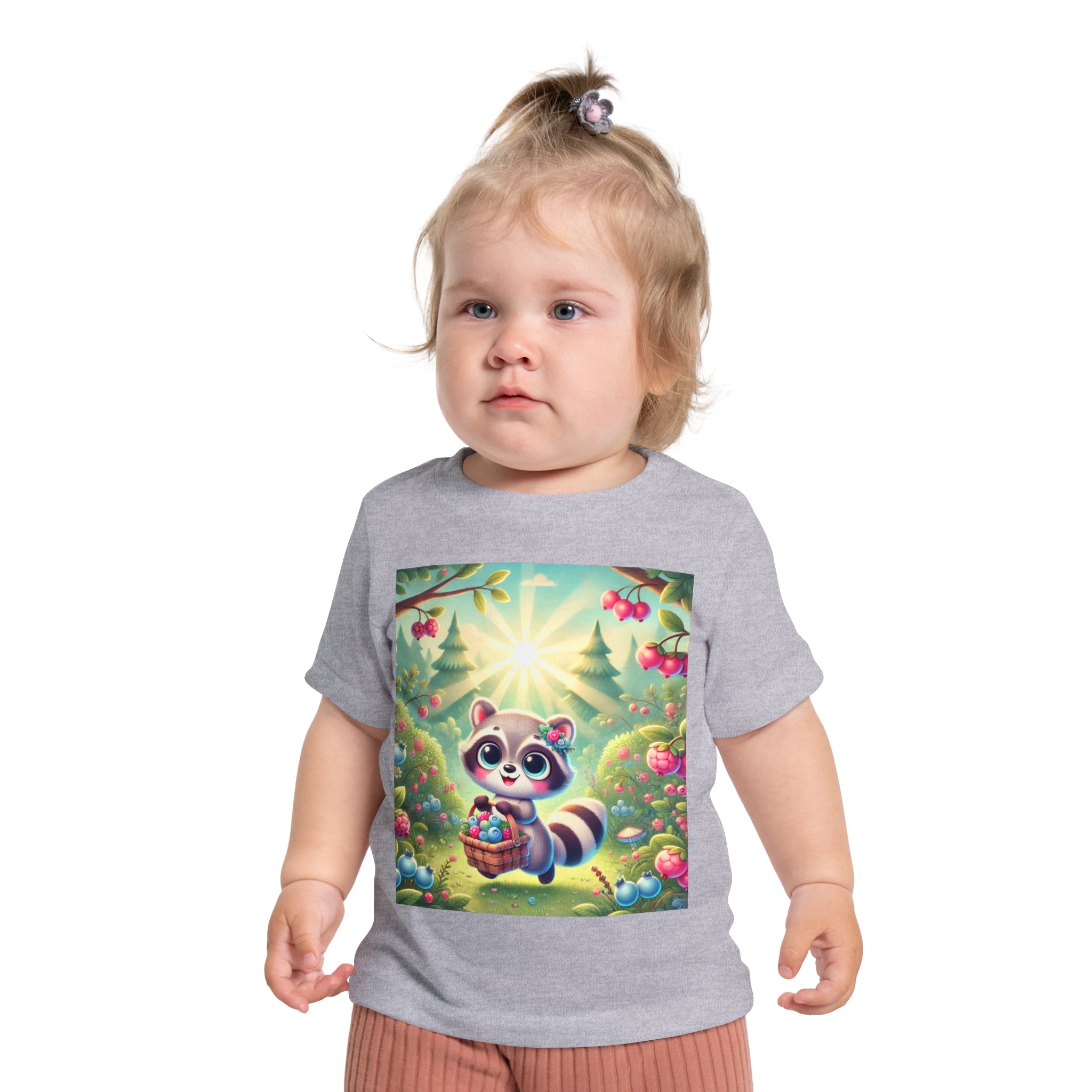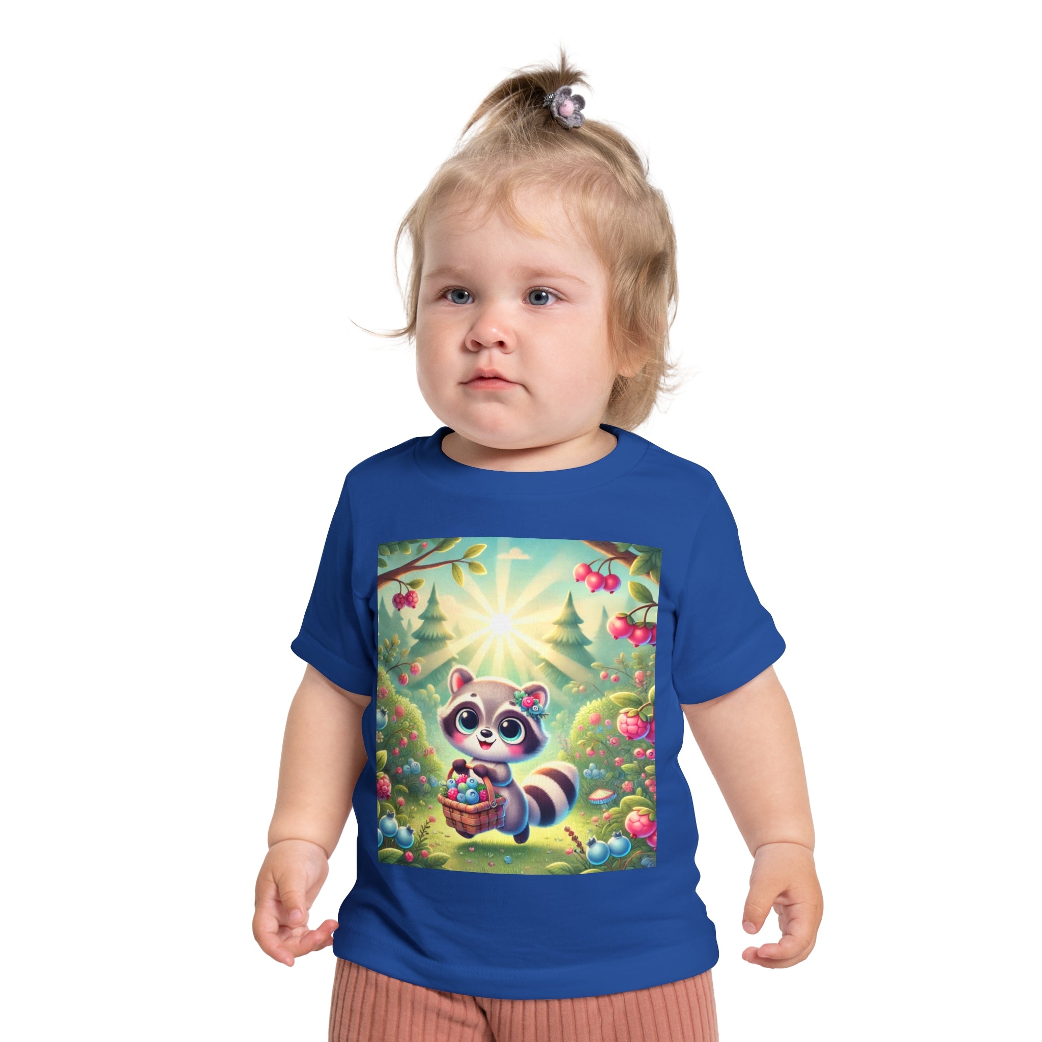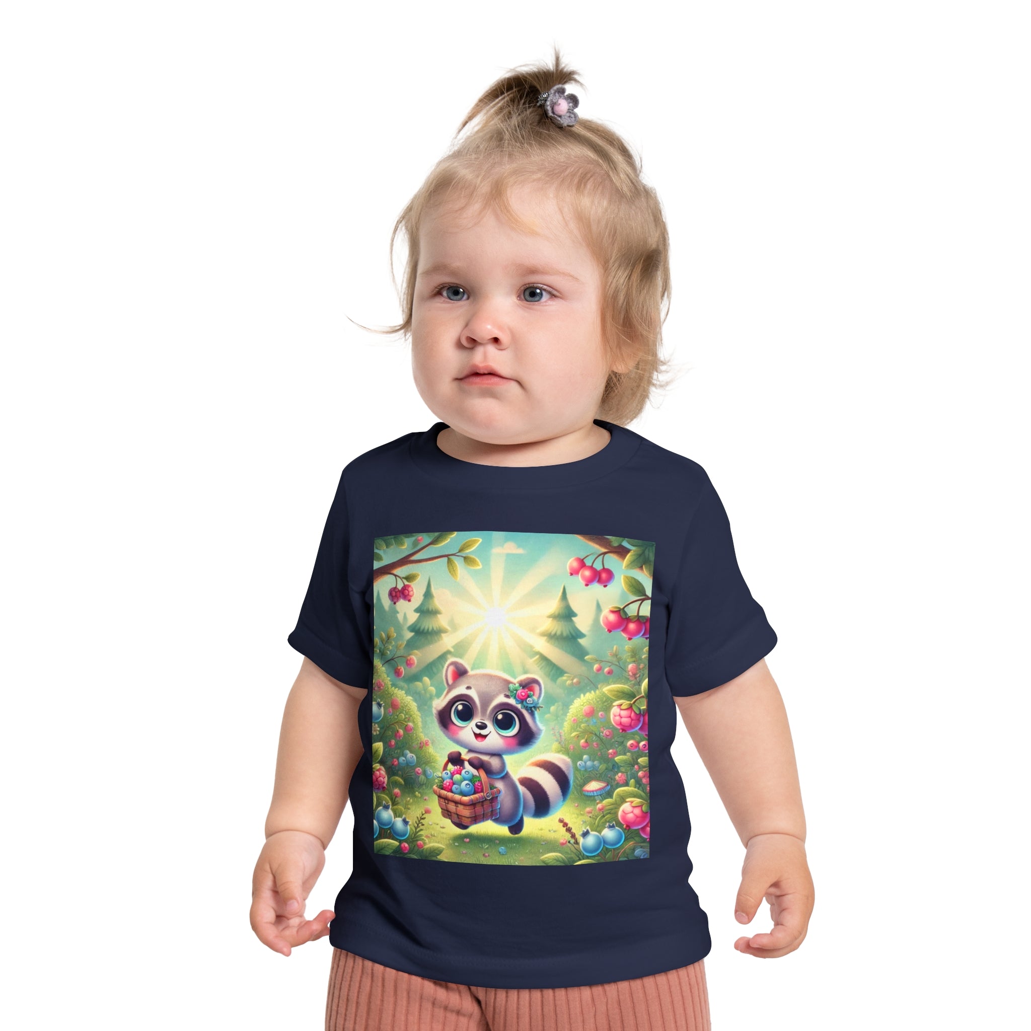 Raccoon’s Berry Basket brings the warmth and sweetness of summer to life in this charming woodland scene. Bathed in golden sunlight, a young raccoon stands amid a lush berry grove, proudly holding a small basket overflowing with freshly picked fruit. Around the playful little gatherer, raspberry bushes, blueberry clusters, and cherry-laden branches glow with vibrant color under a clear blue sky. Sunbeams stream through tall evergreens, making each leaf and berry shimmer with life. A tiny flower tucked behind the raccoon’s ear adds an endearing touch of innocence. Rendered in flat, storybook-style colors with gentle gradients and rich detail, this heartwarming artwork captures the simple joys of discovery, the beauty of nature’s abundance, and the wonder of childhood curiosity.