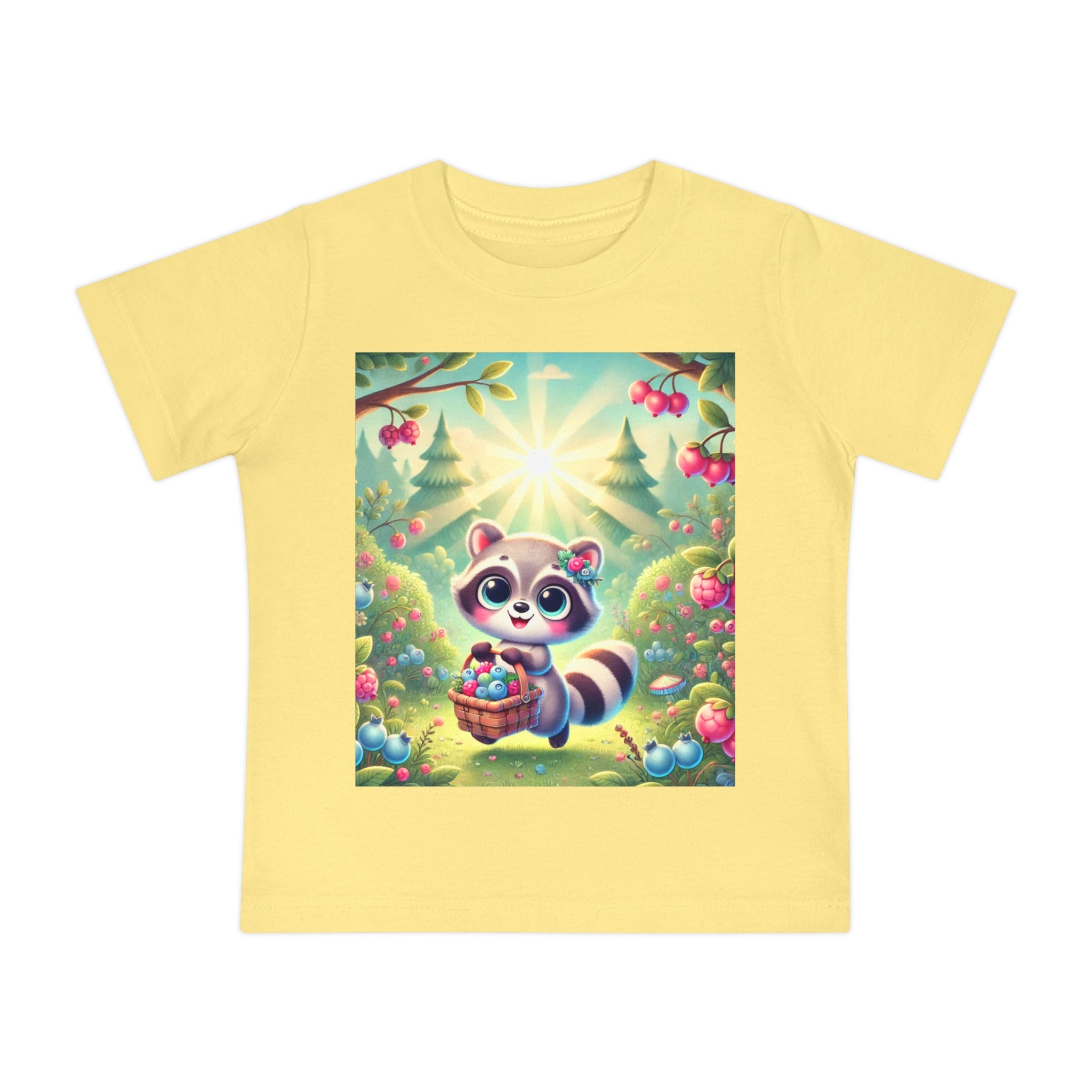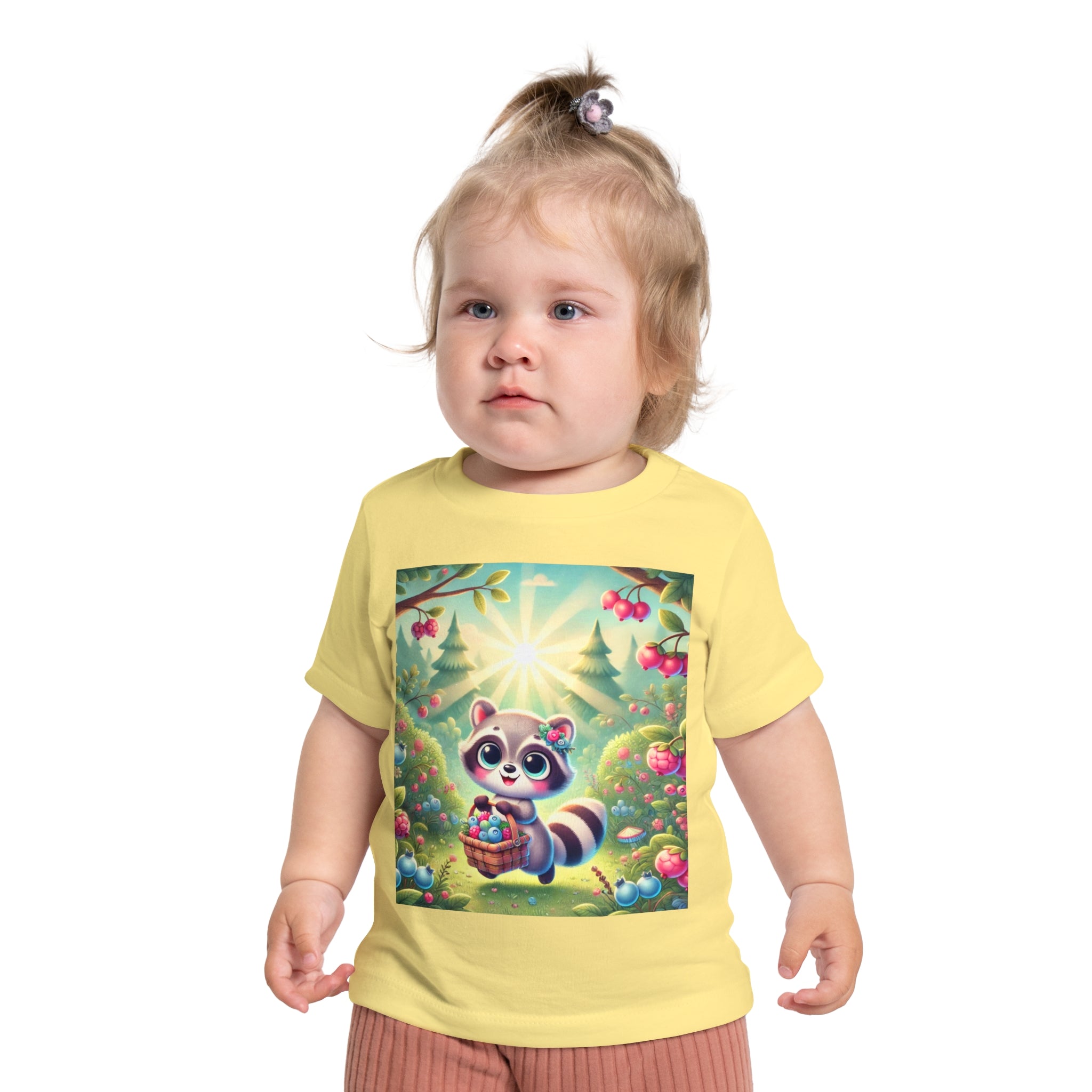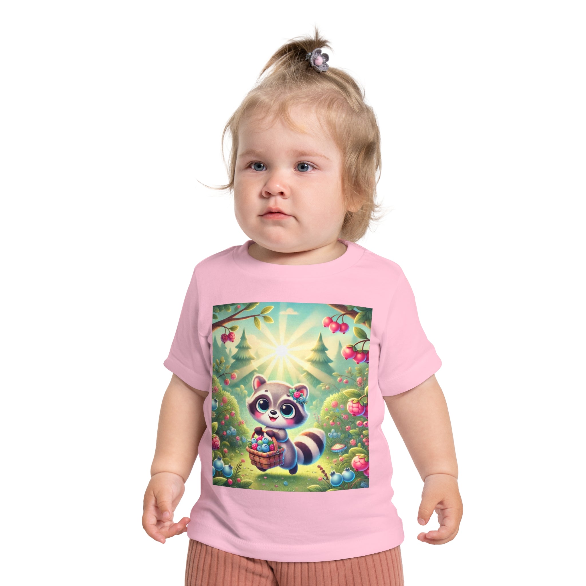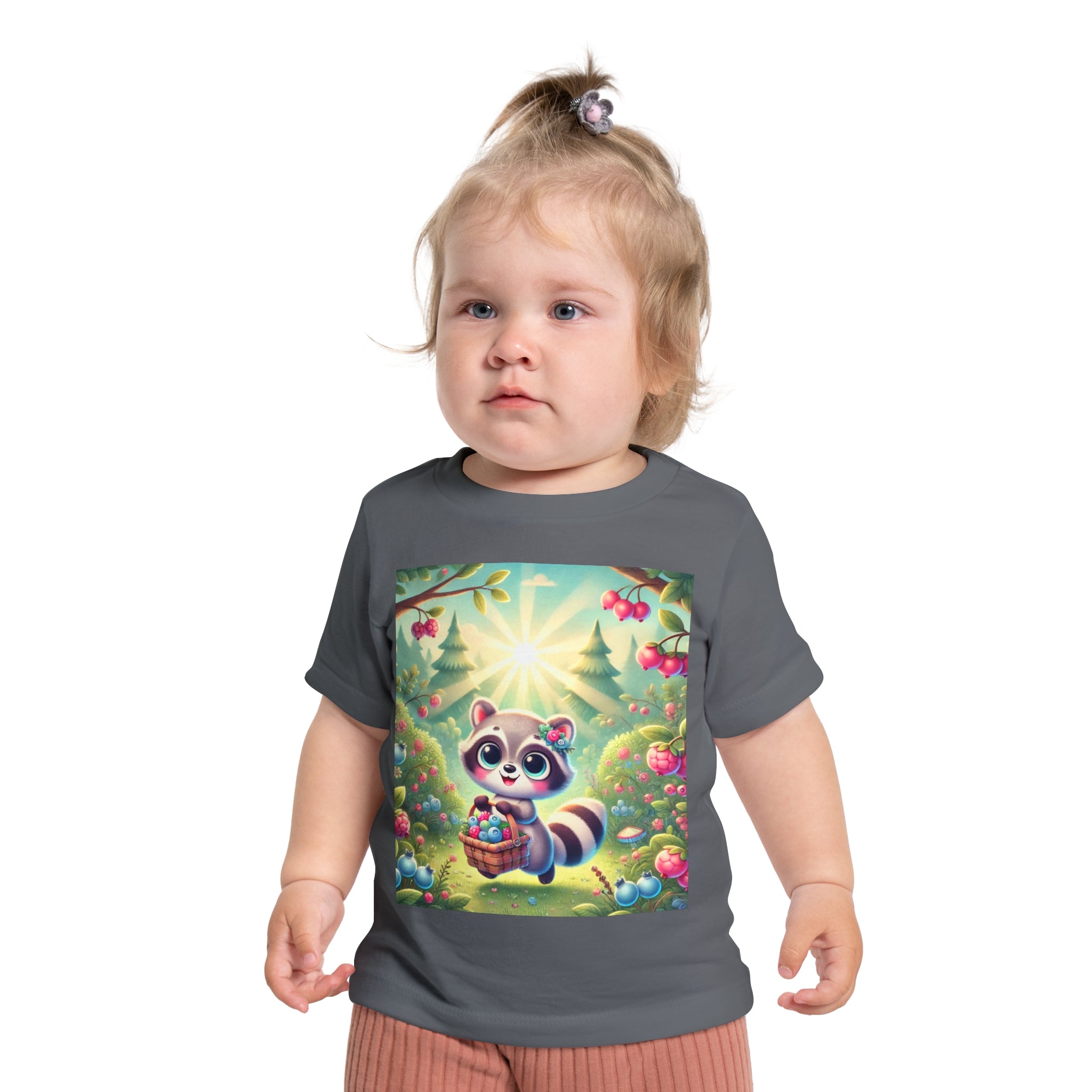 Raccoon’s Berry Basket brings the warmth and sweetness of summer to life in this charming woodland scene. Bathed in golden sunlight, a young raccoon stands amid a lush berry grove, proudly holding a small basket overflowing with freshly picked fruit. Around the playful little gatherer, raspberry bushes, blueberry clusters, and cherry-laden branches glow with vibrant color under a clear blue sky. Sunbeams stream through tall evergreens, making each leaf and berry shimmer with life. A tiny flower tucked behind the raccoon’s ear adds an endearing touch of innocence. Rendered in flat, storybook-style colors with gentle gradients and rich detail, this heartwarming artwork captures the simple joys of discovery, the beauty of nature’s abundance, and the wonder of childhood curiosity.