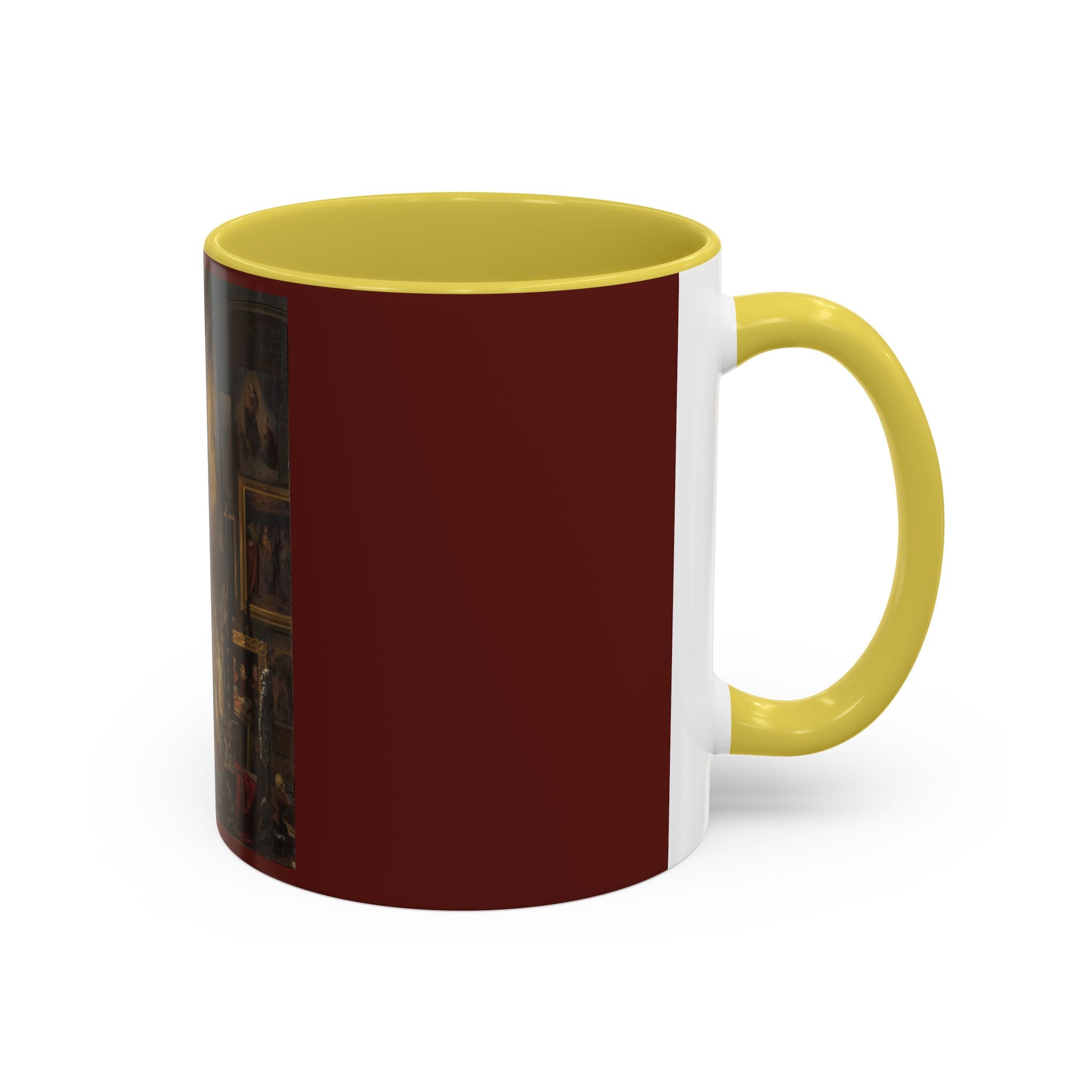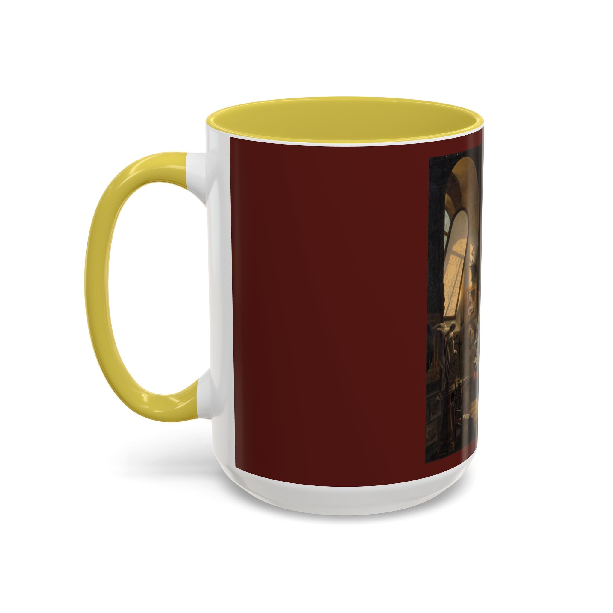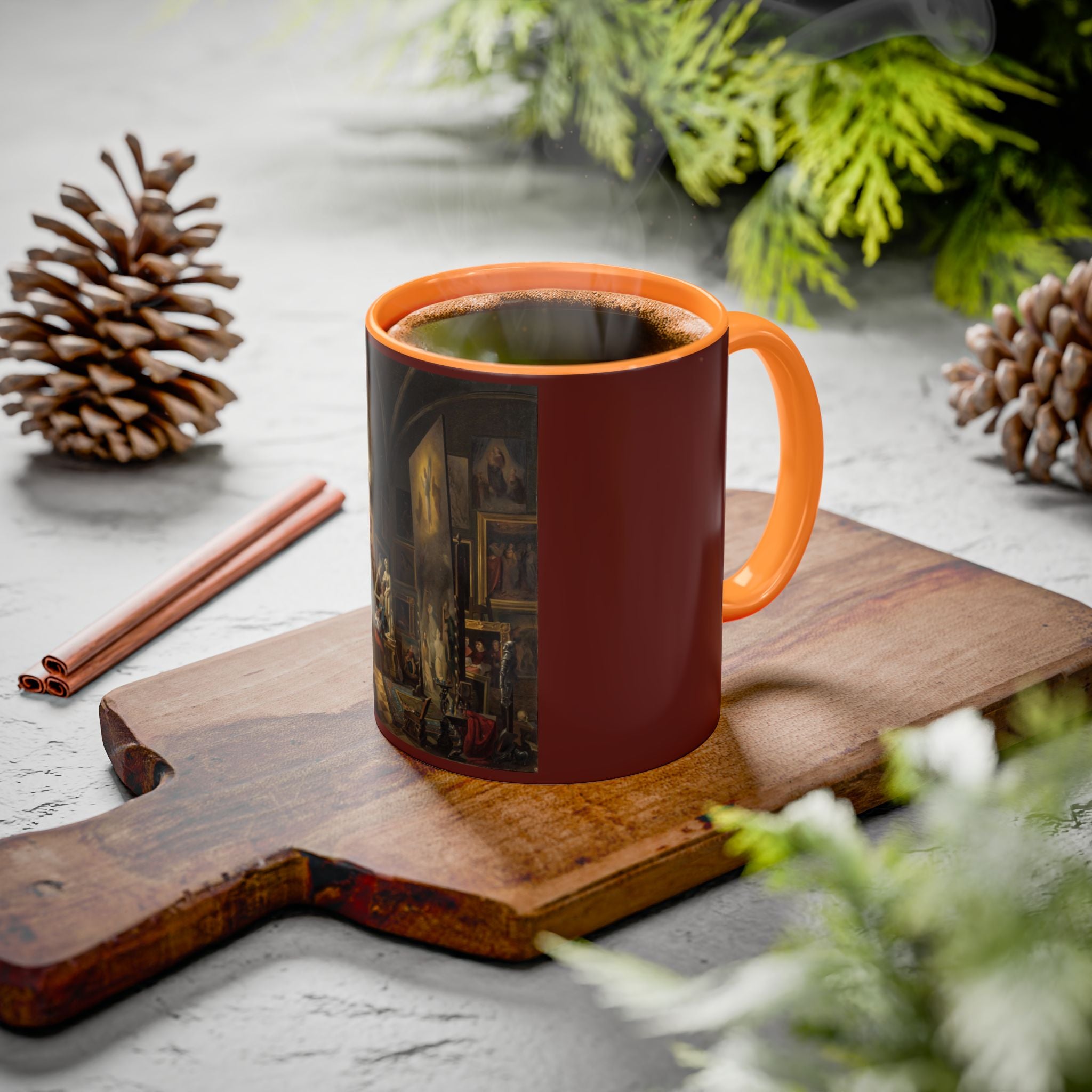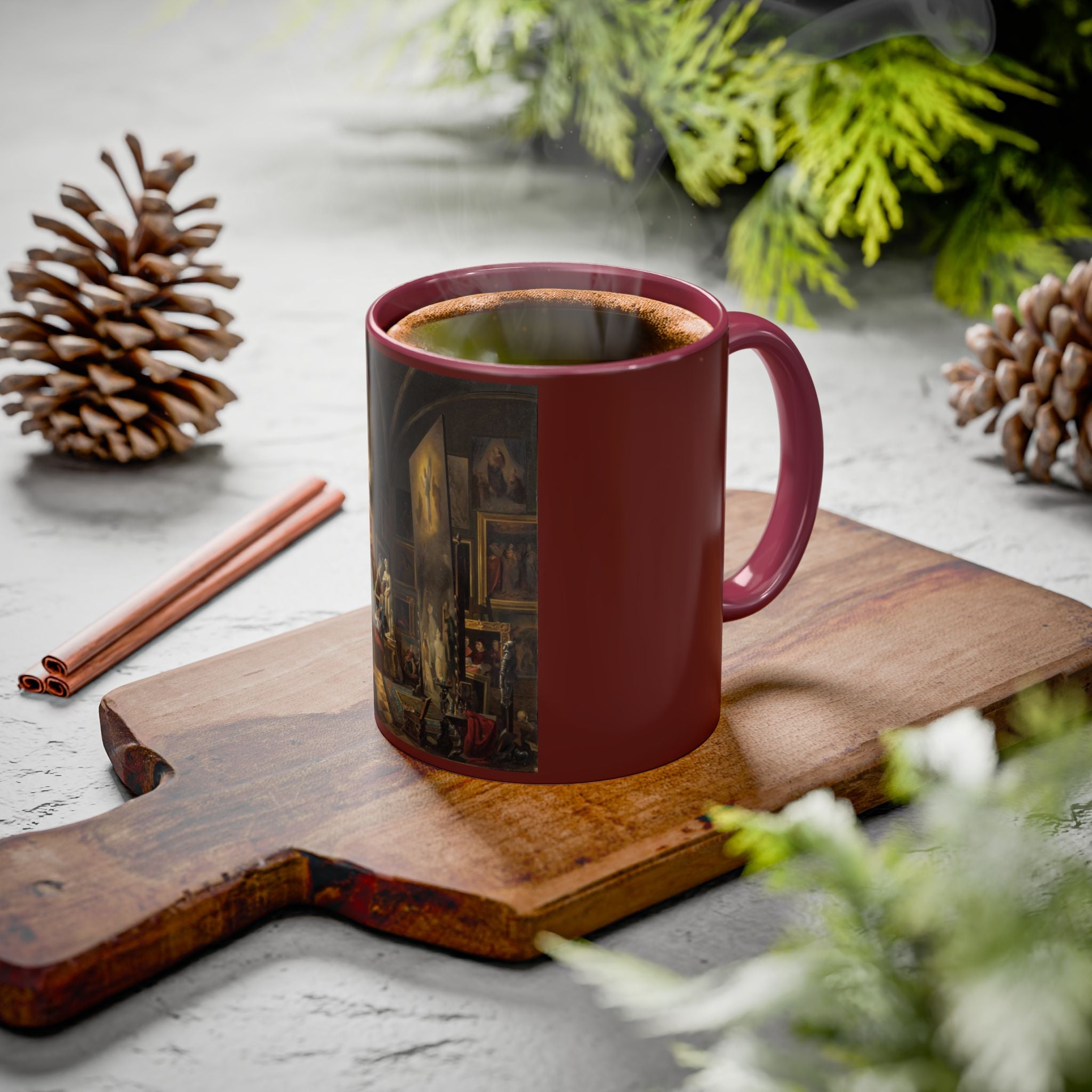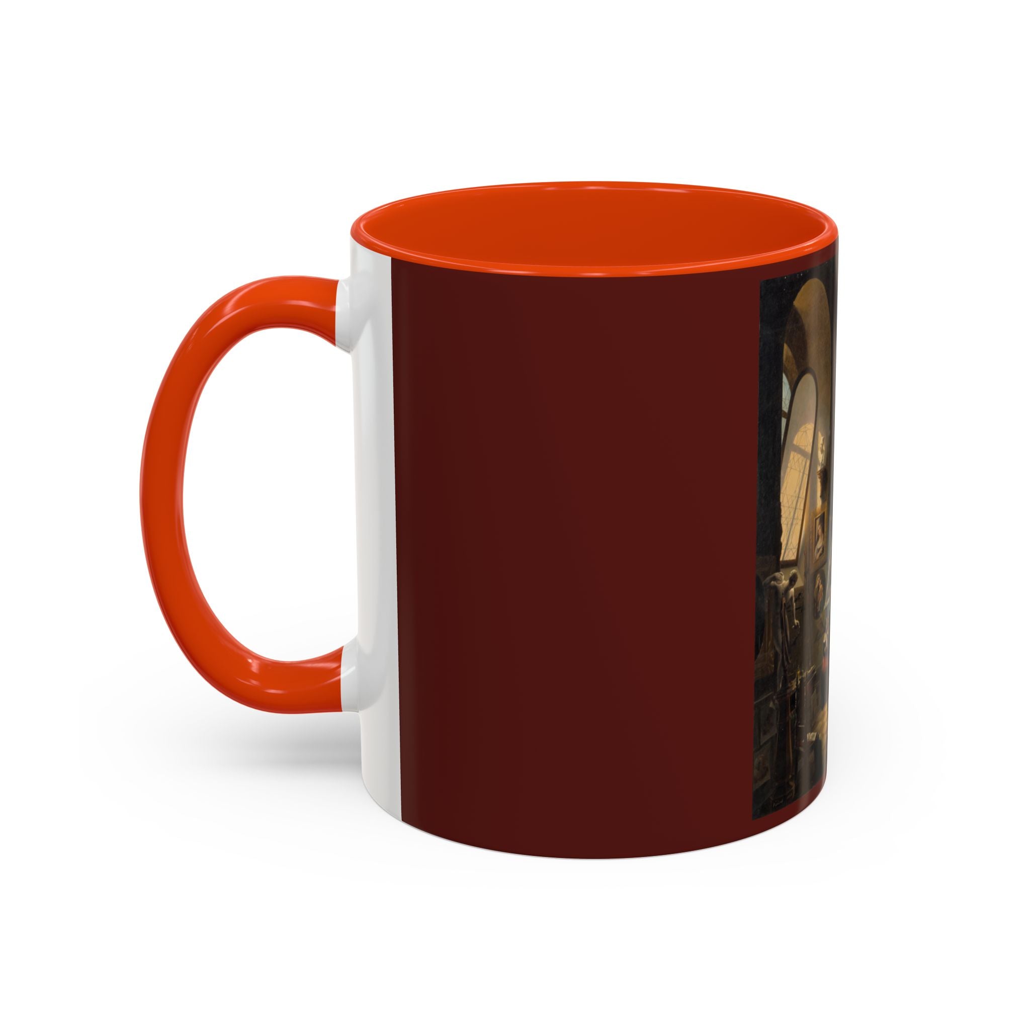 Mugs are a kitchen essential, and when infused with a personalized touch, they transform into cherished favorites. These mugs, offered in 12 vibrant color choices, can hold up to 11oz of your preferred rejuvenating beverage and feature a colored handle and interior. The glossy finish adds an elegant accent that beautifully complements the high-fidelity artwork print, making them not only a delightful addition to your kitchen but also a fantastic choice for thoughtful gifts.