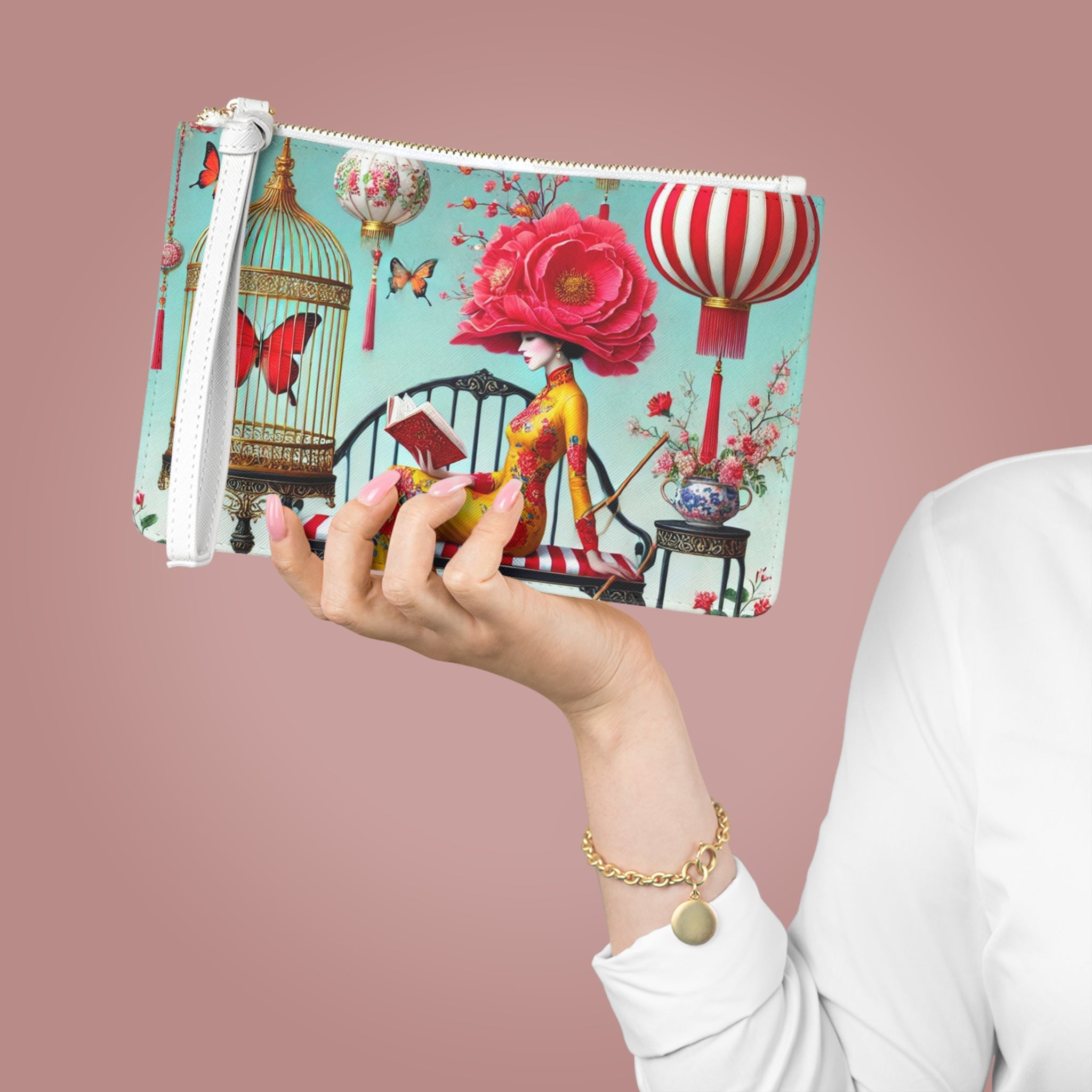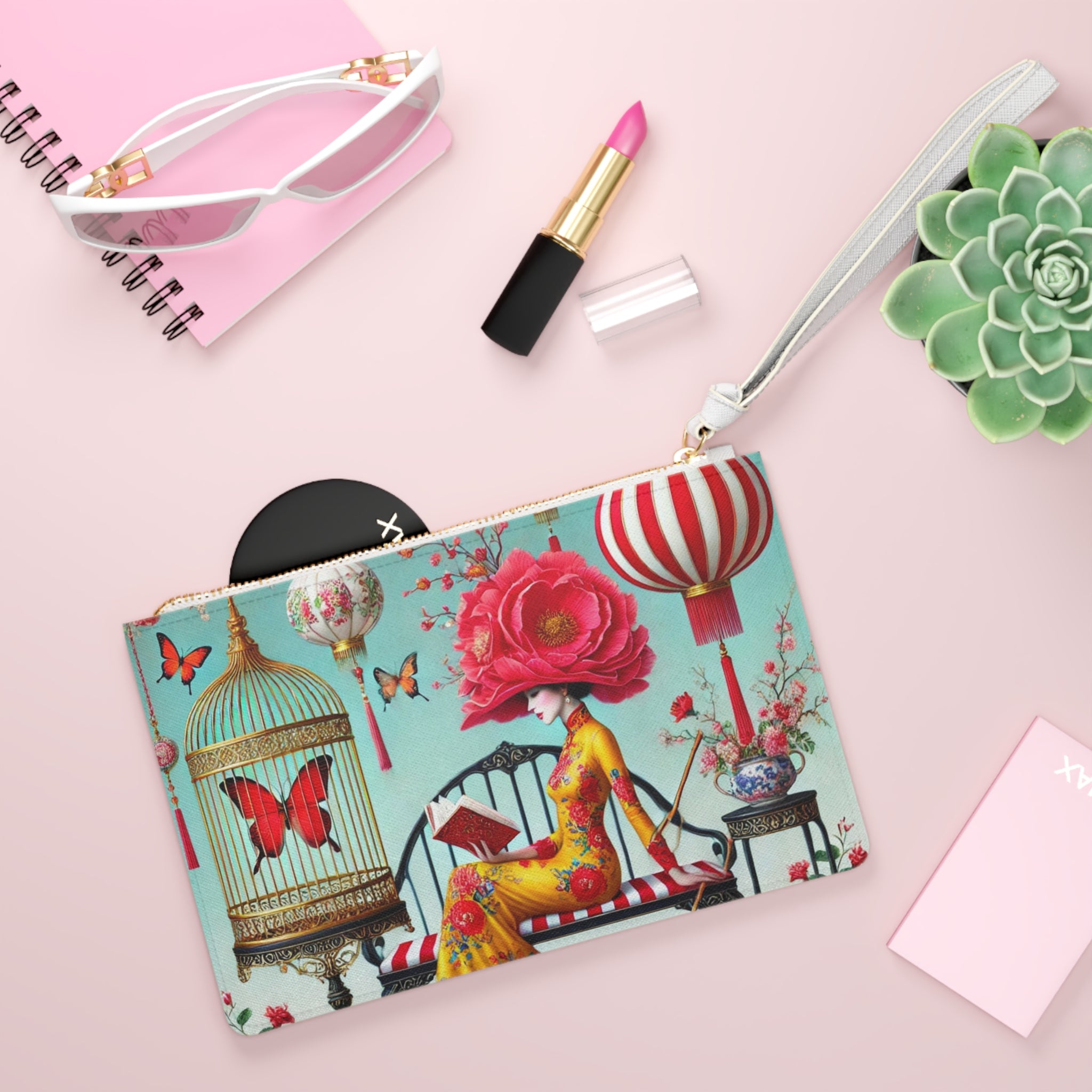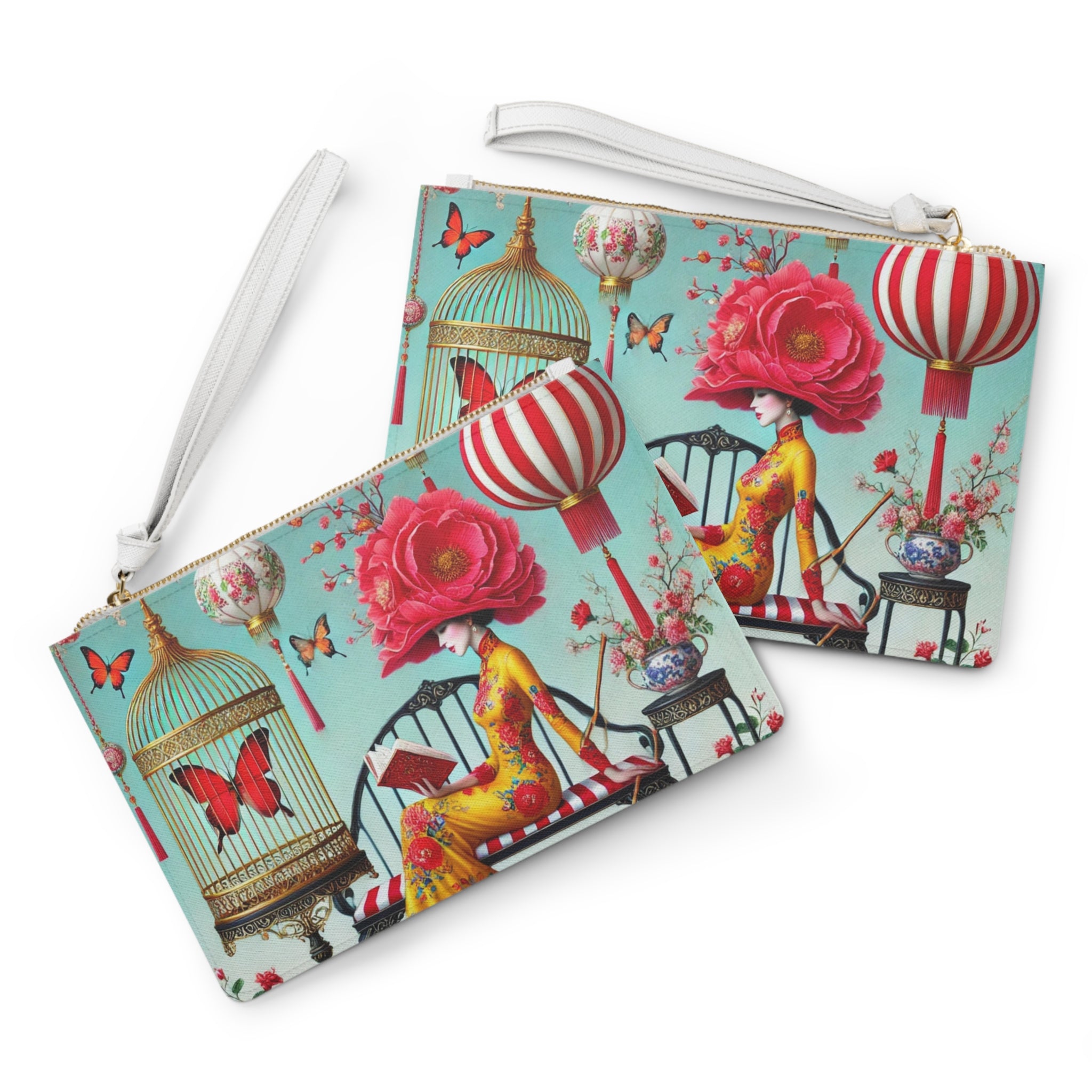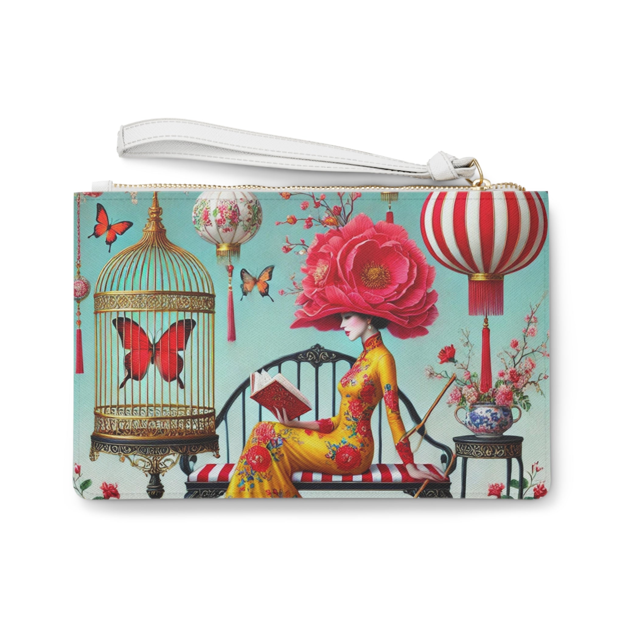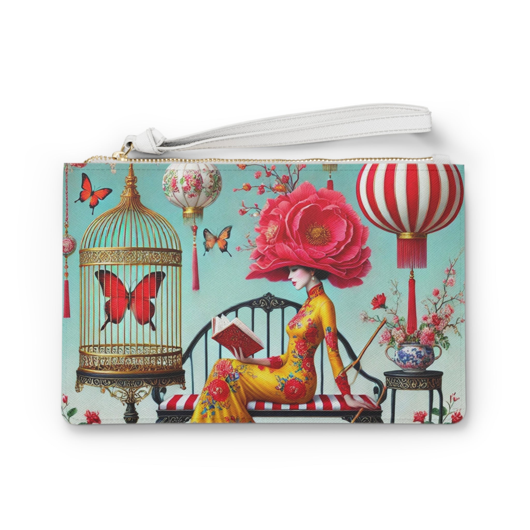 Reading In A Painted Garden Clutch Bag carries a quiet moment of elegance and reflection with you, pairing polished style with a serene, storybook scene. The artwork features a graceful figure absorbed in a book, surrounded by blooming branches, floating lanterns, and drifting butterflies. A refined palette of turquoise, warm florals, and soft gold accents creates a dreamlike setting that feels curated and calm, blending stillness with ornate detail and celebrating reading as a peaceful pause filled with beauty, imagination, and quiet focus.