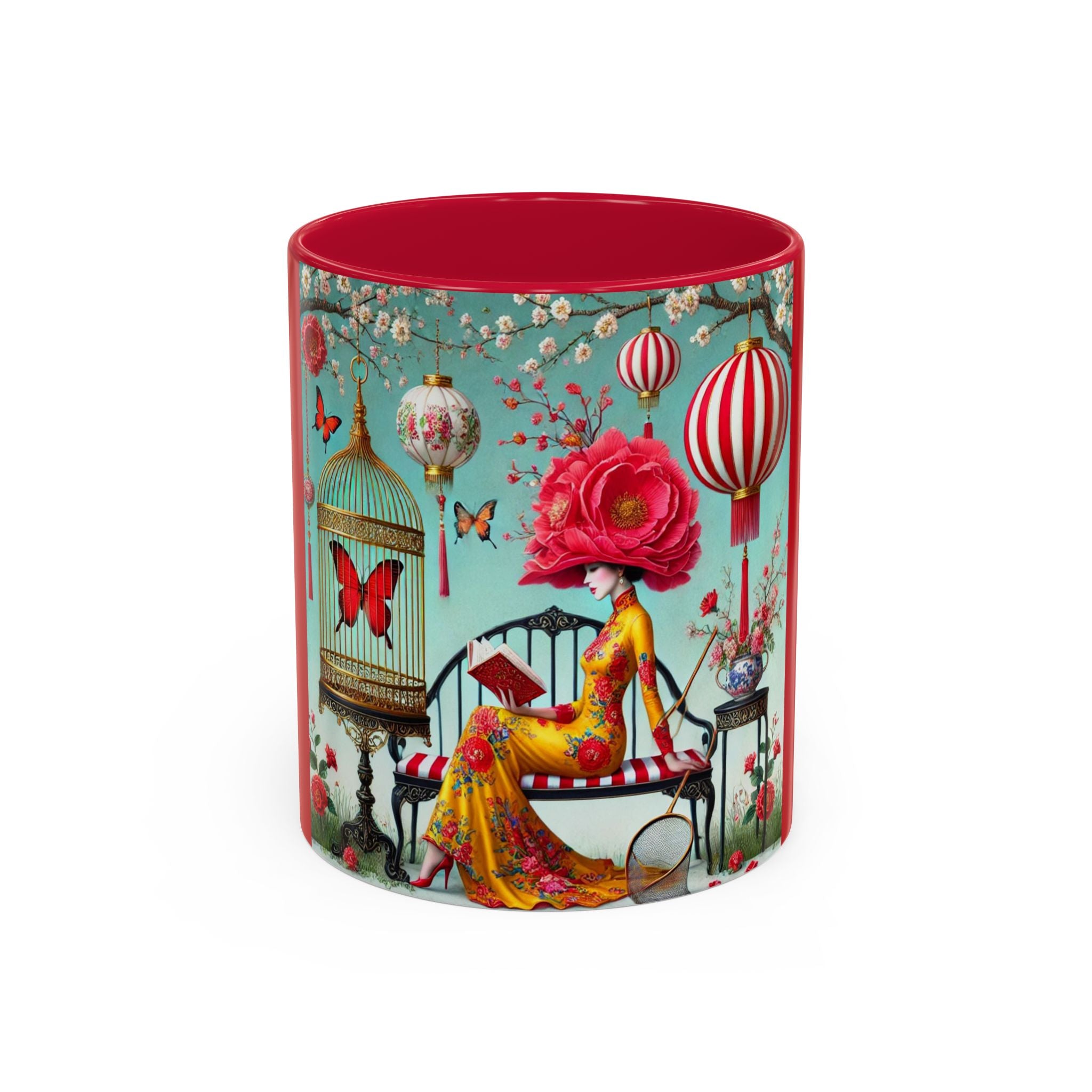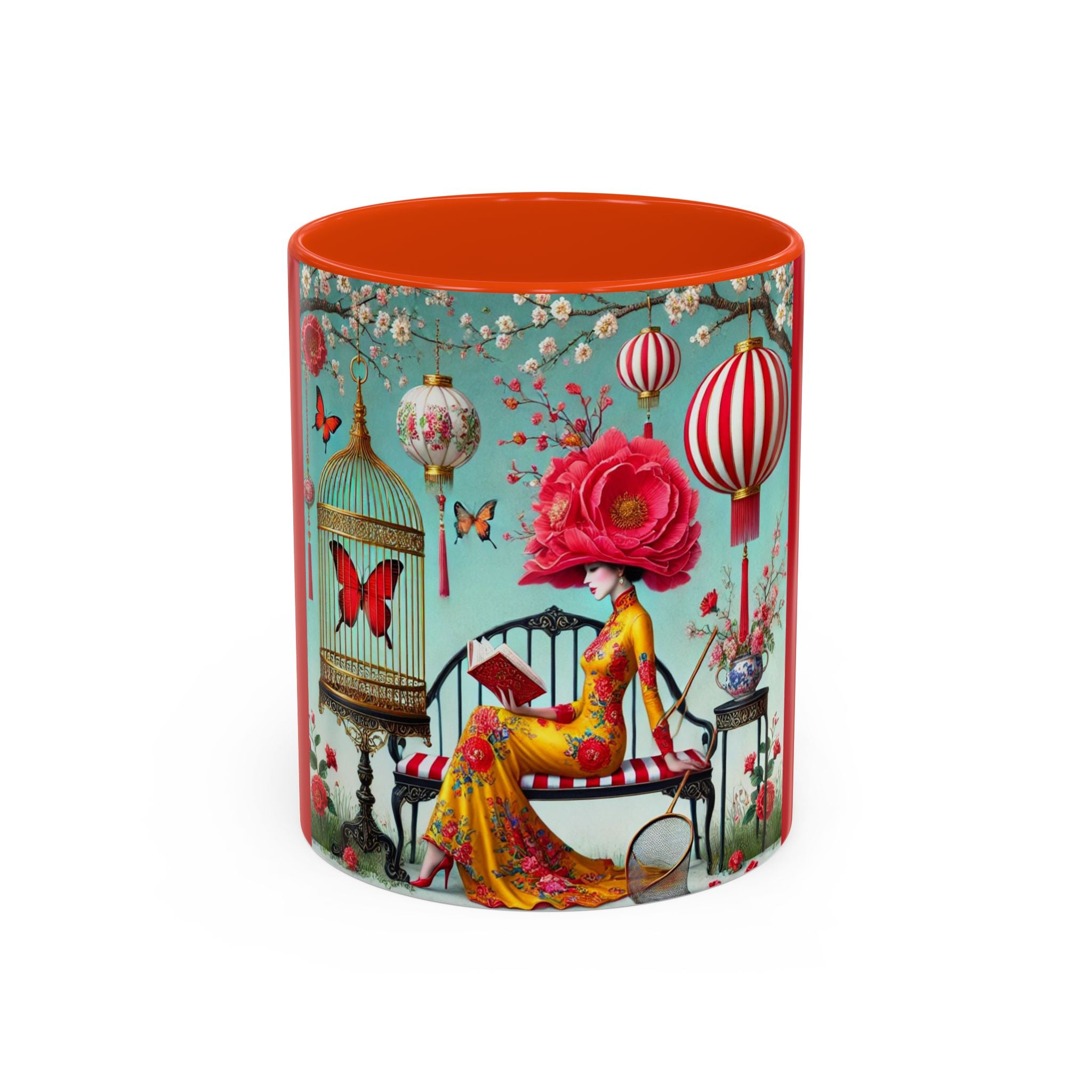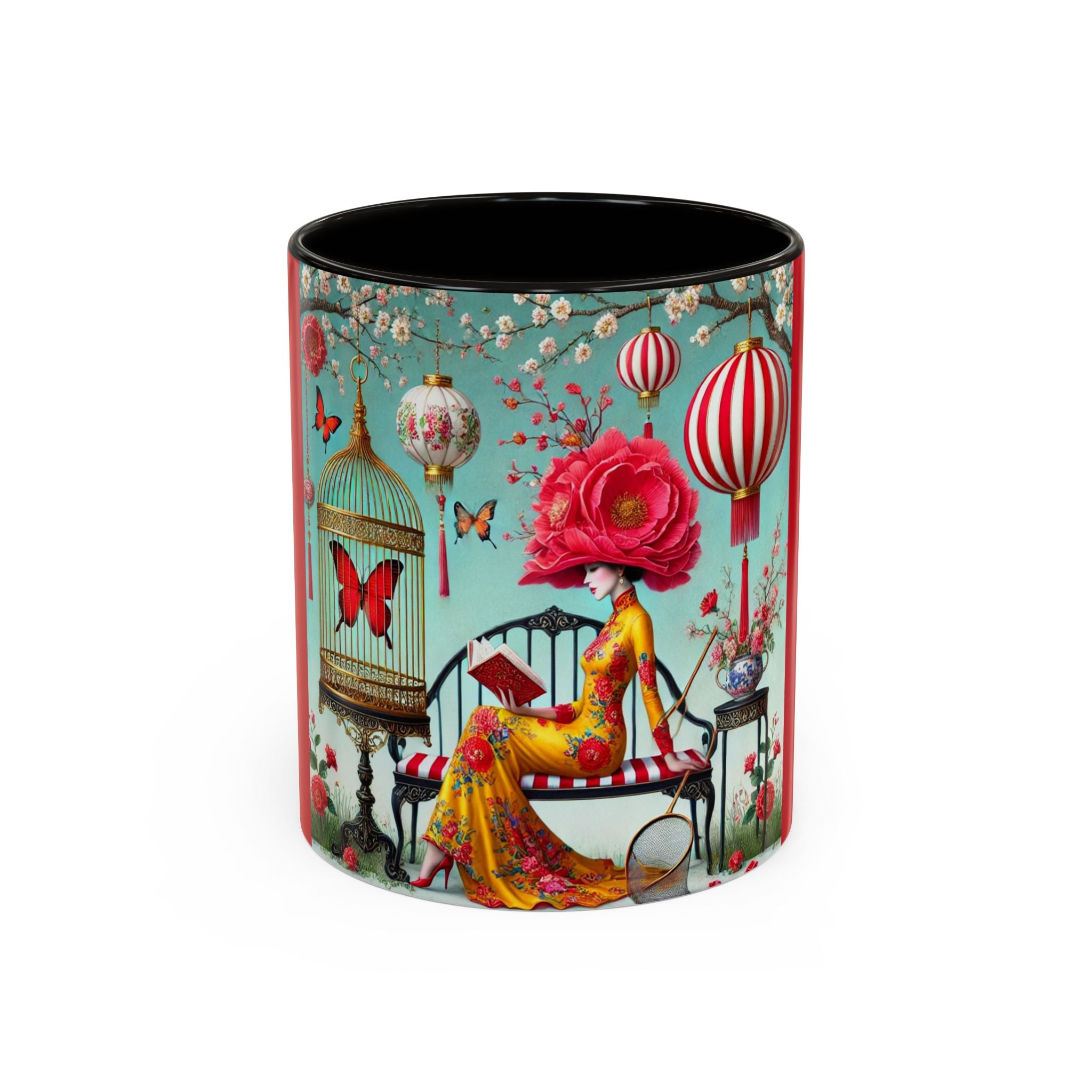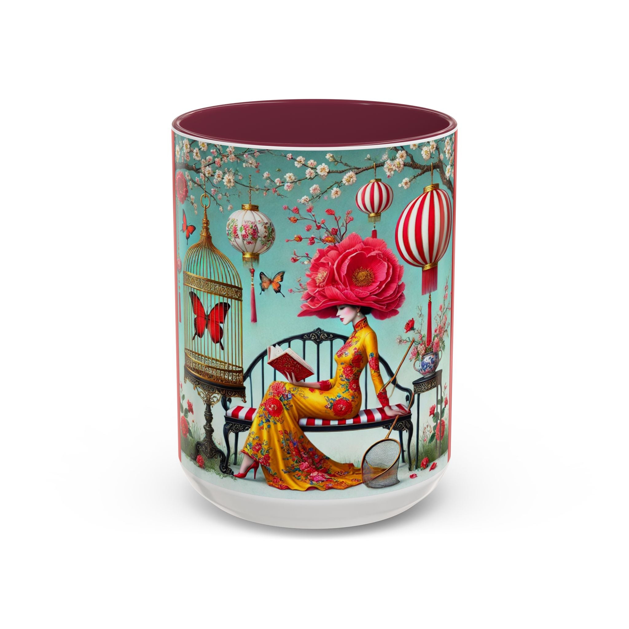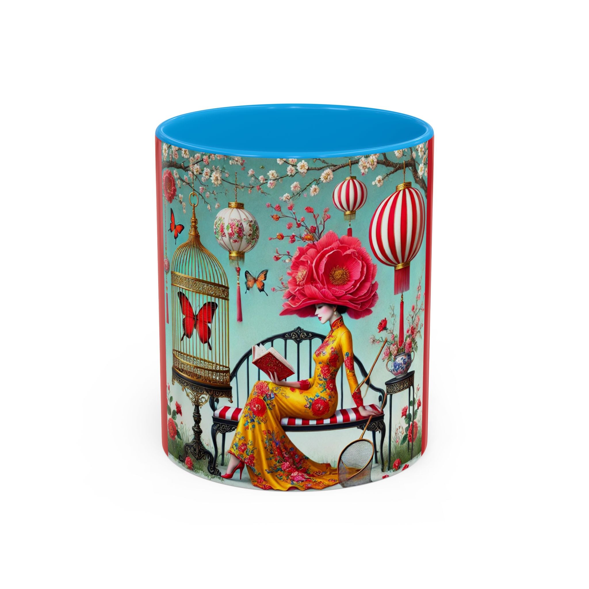 Reading in a Painted Garden turns every sip into a quiet, beautiful pause—featuring a graceful figure lost in a book beneath blooming branches, floating lanterns, and drifting butterflies. Turquoise skies, warm florals, and delicate gold-toned details create a serene, storybook atmosphere that feels curated and calm. With 12 accent colors to choose from and two generous sizes, this glossy ceramic mug is a cheerful everyday staple that also makes a thoughtful gift for readers, art lovers, and anyone who enjoys a peaceful moment.