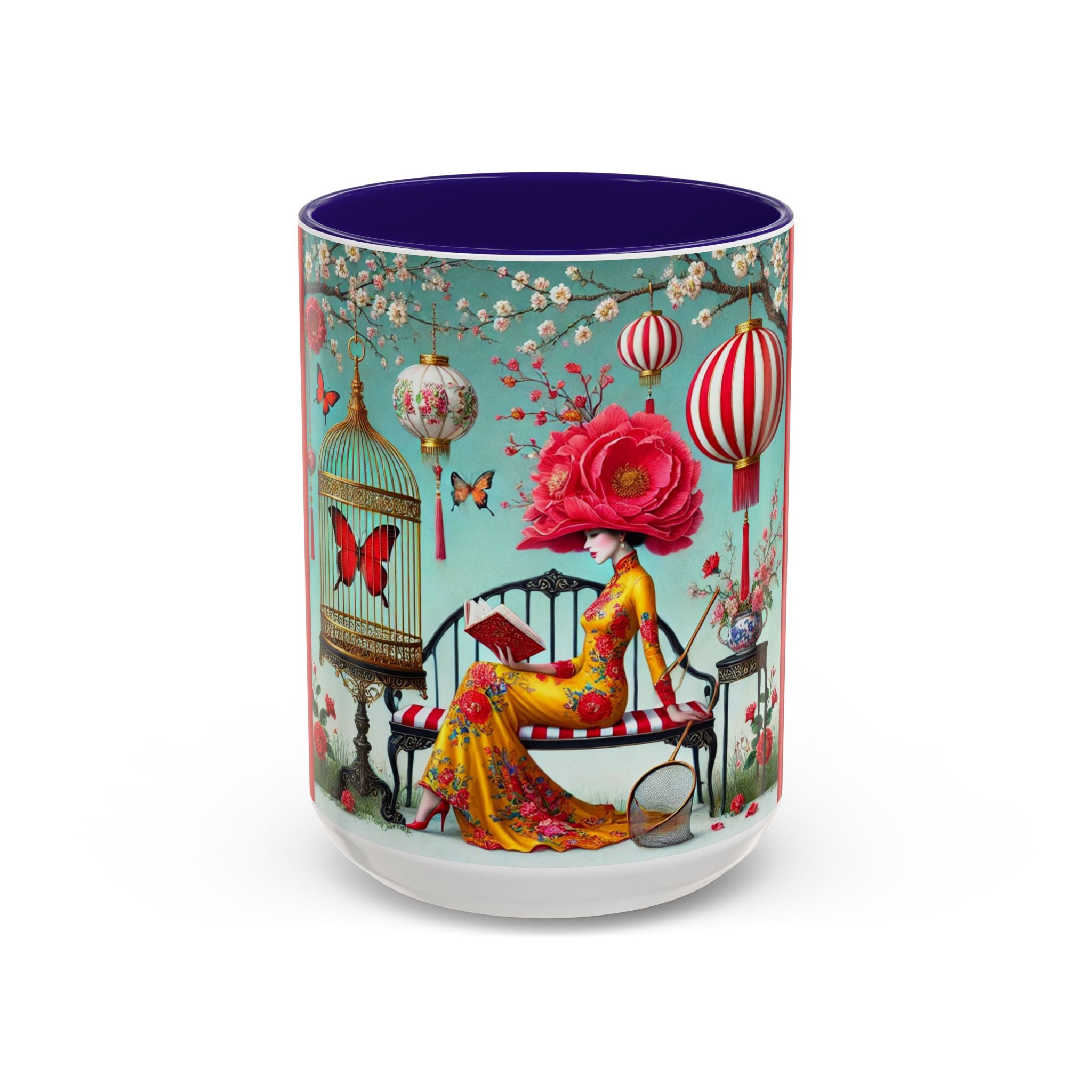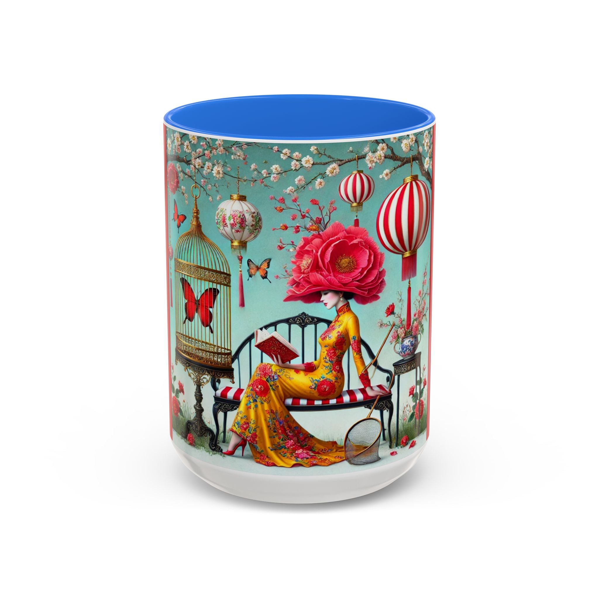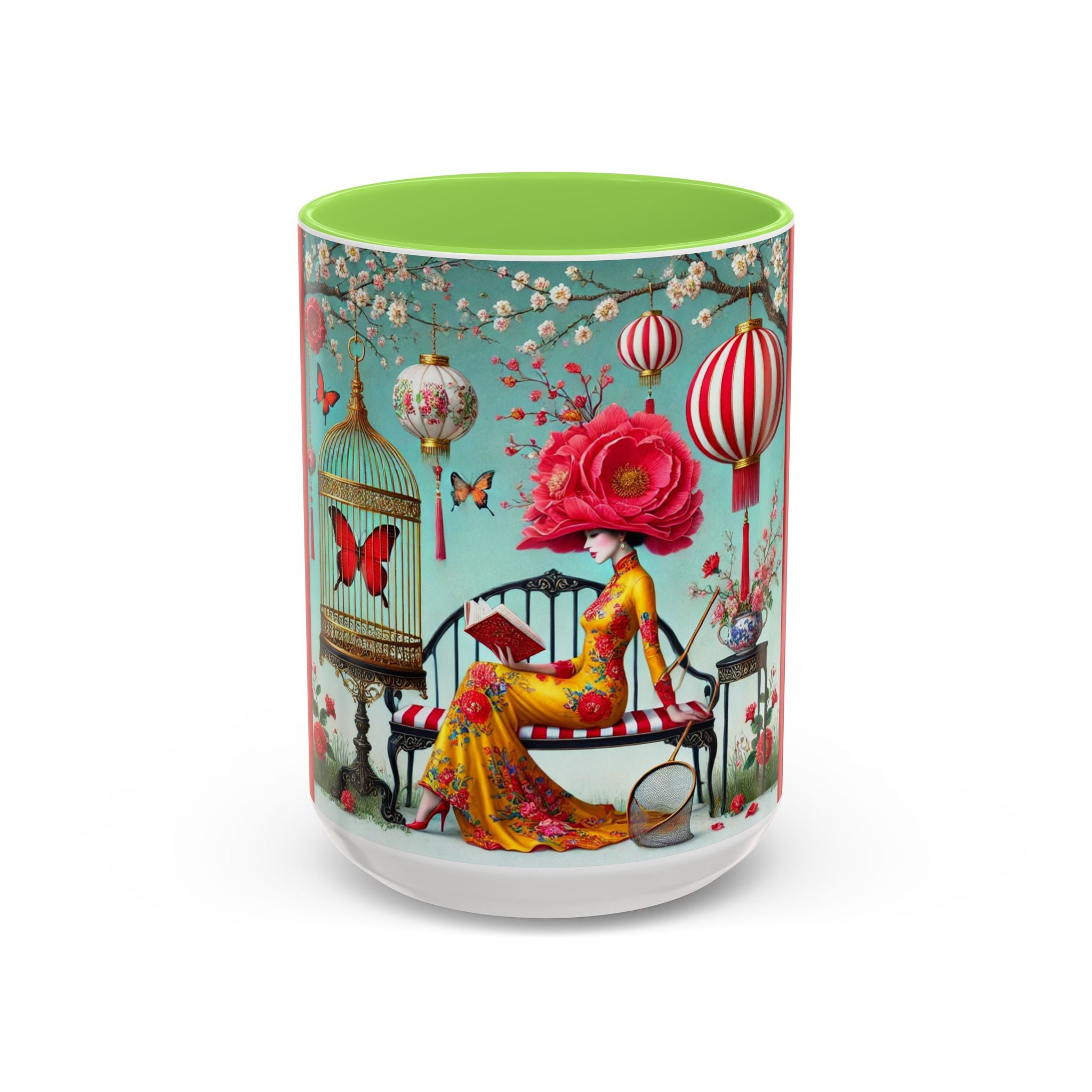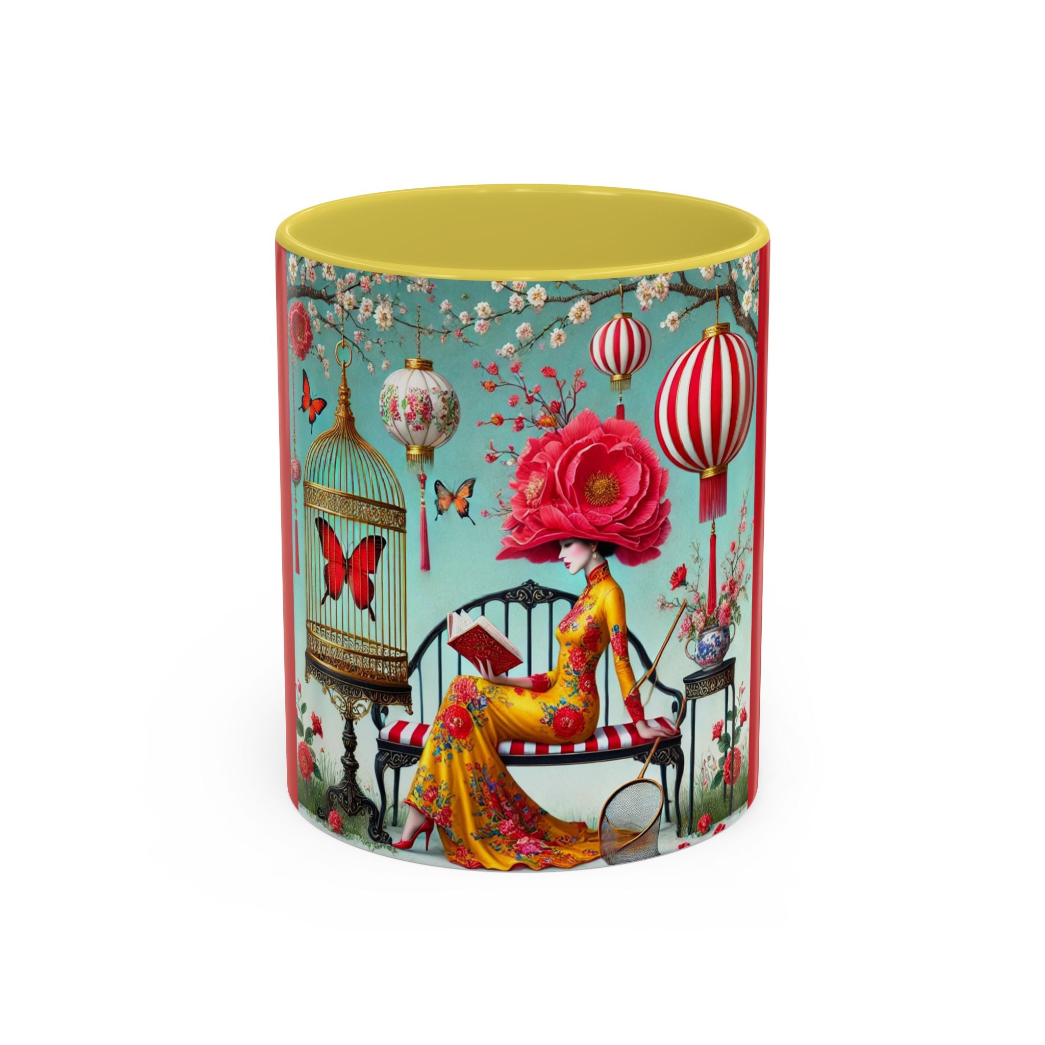 Reading in a Painted Garden turns every sip into a quiet, beautiful pause—featuring a graceful figure lost in a book beneath blooming branches, floating lanterns, and drifting butterflies. Turquoise skies, warm florals, and delicate gold-toned details create a serene, storybook atmosphere that feels curated and calm. With 12 accent colors to choose from and two generous sizes, this glossy ceramic mug is a cheerful everyday staple that also makes a thoughtful gift for readers, art lovers, and anyone who enjoys a peaceful moment.