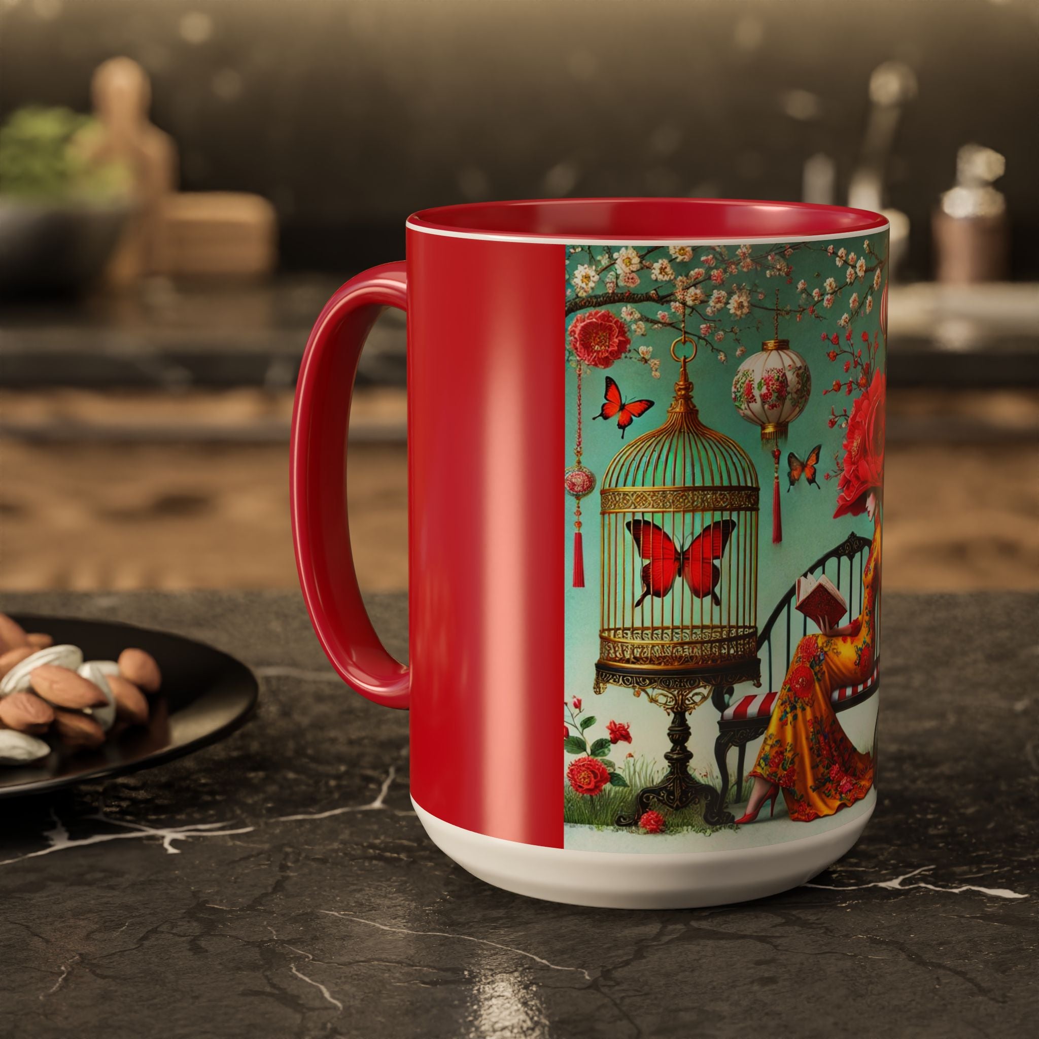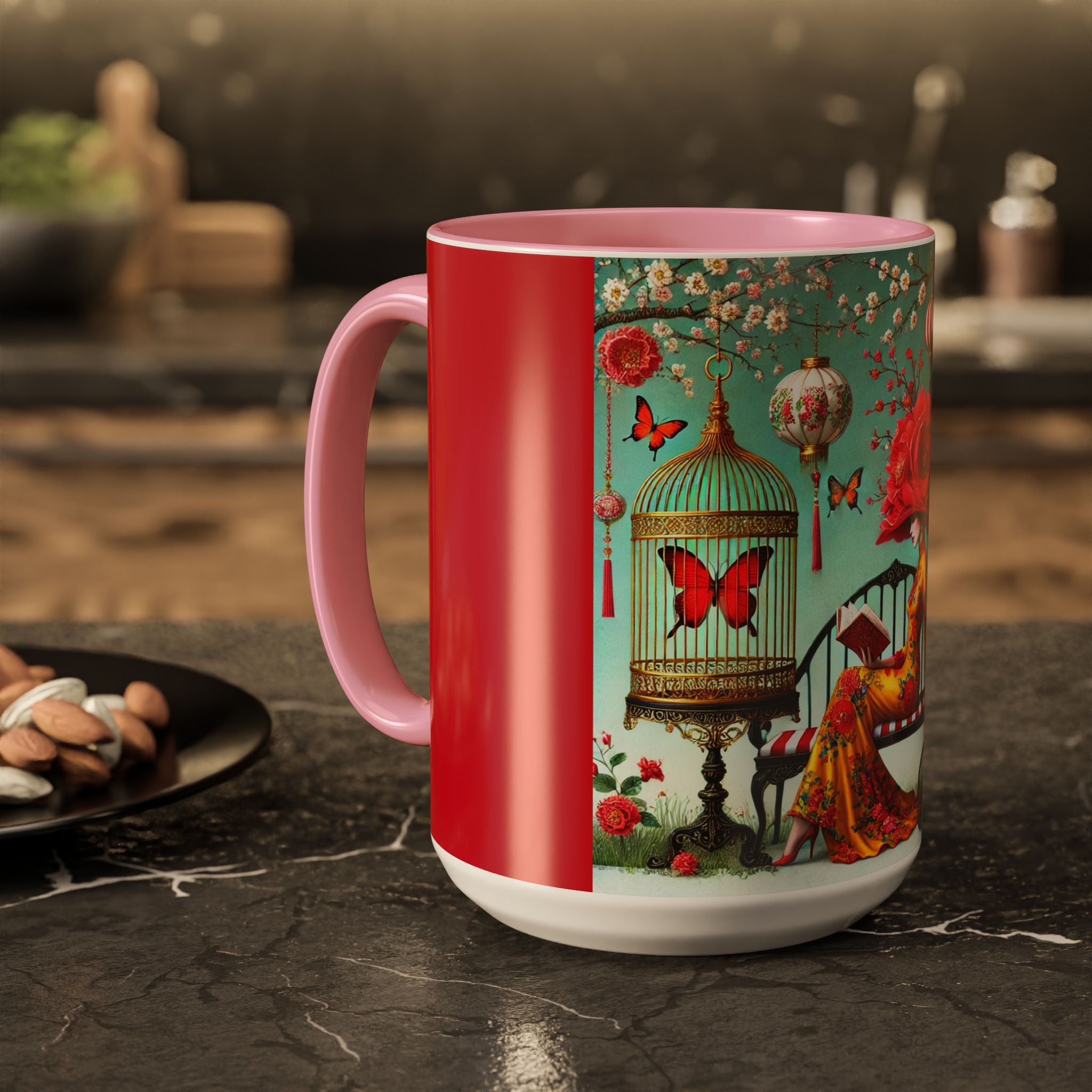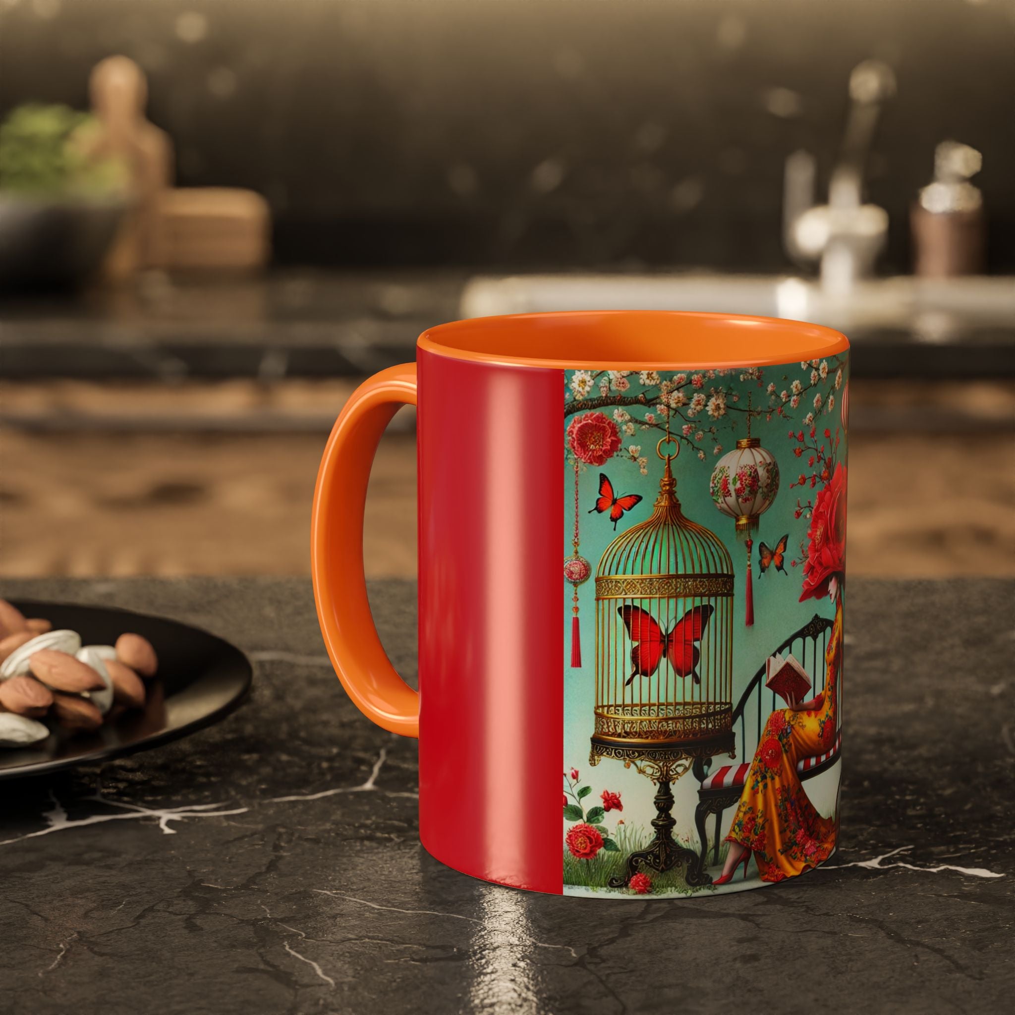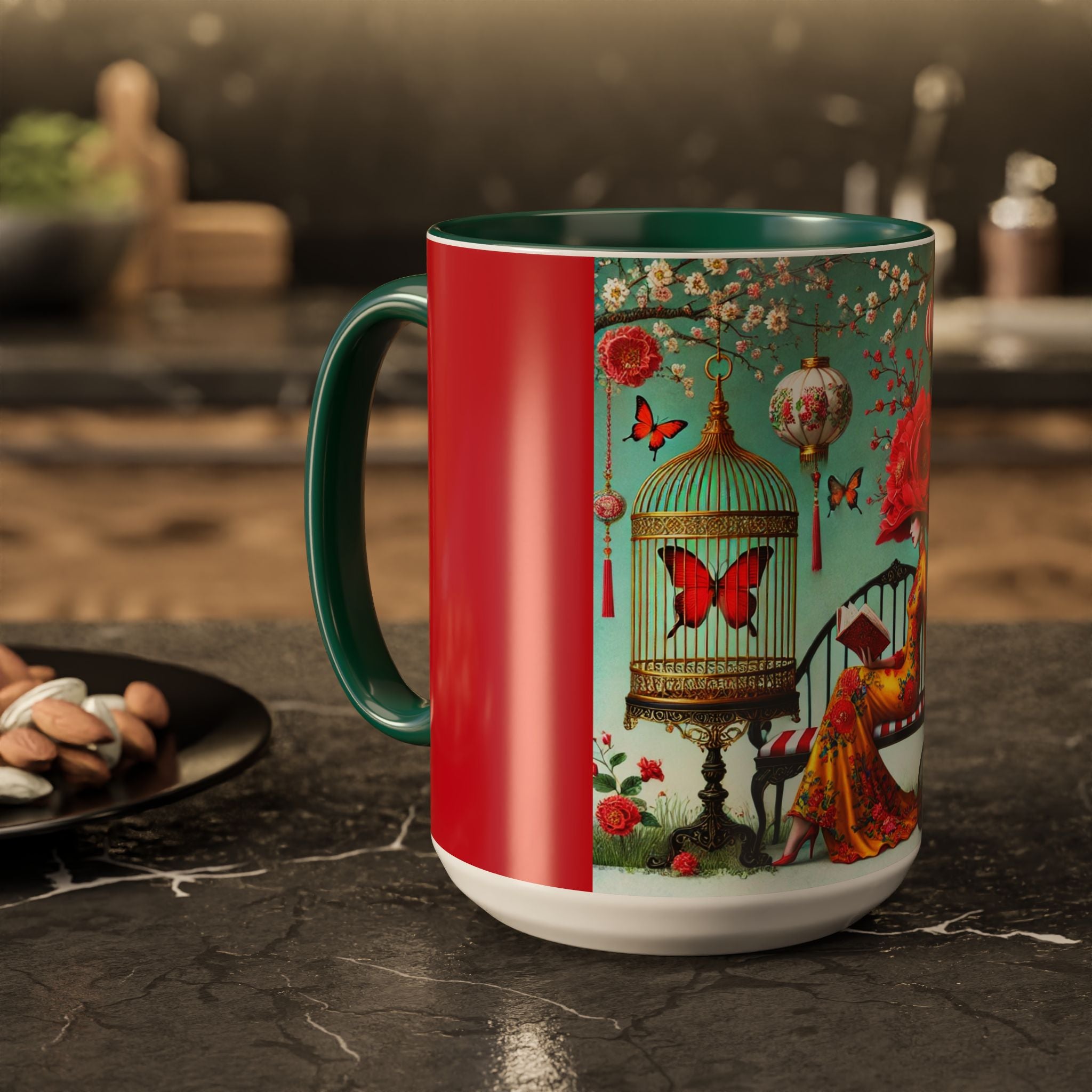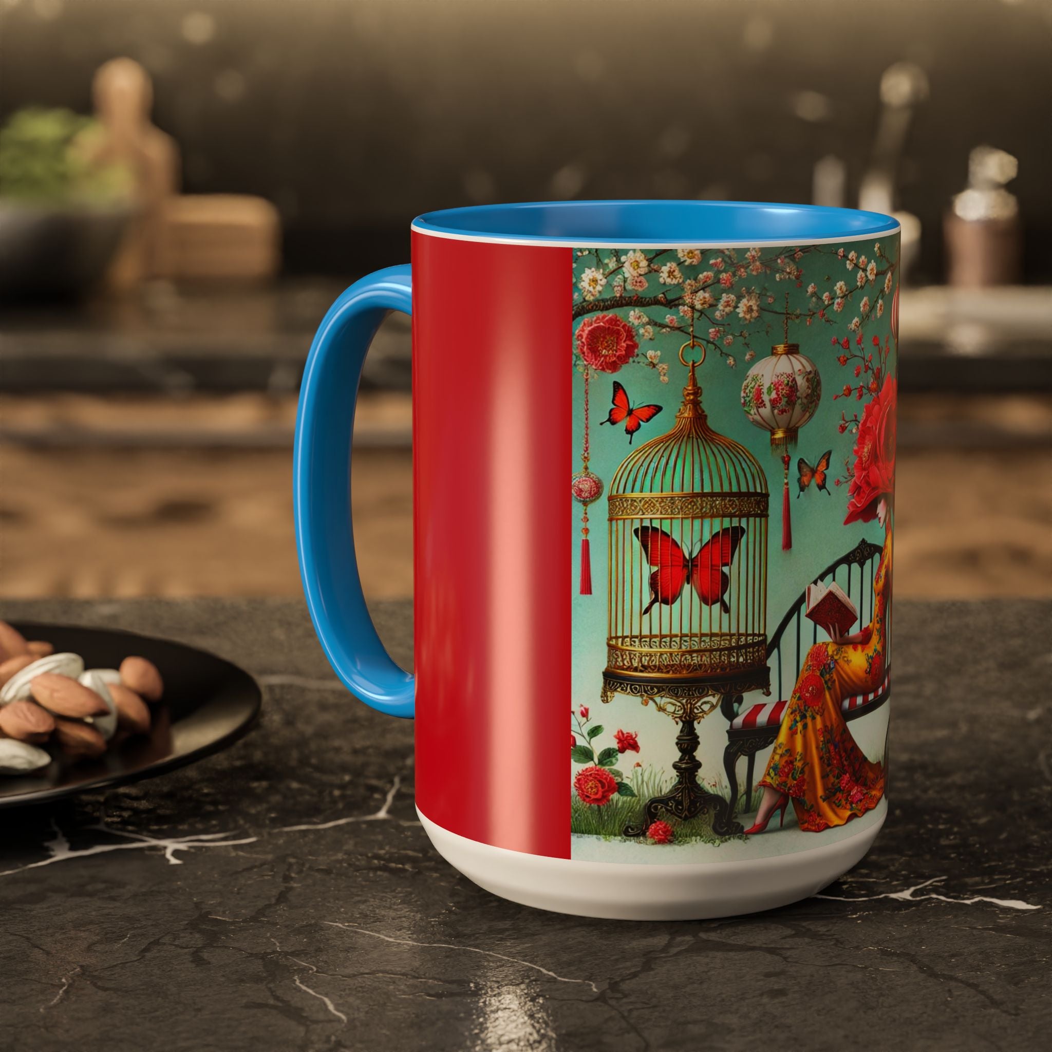 Reading in a Painted Garden turns every sip into a quiet, beautiful pause—featuring a graceful figure lost in a book beneath blooming branches, floating lanterns, and drifting butterflies. Turquoise skies, warm florals, and delicate gold-toned details create a serene, storybook atmosphere that feels curated and calm. With 12 accent colors to choose from and two generous sizes, this glossy ceramic mug is a cheerful everyday staple that also makes a thoughtful gift for readers, art lovers, and anyone who enjoys a peaceful moment.
