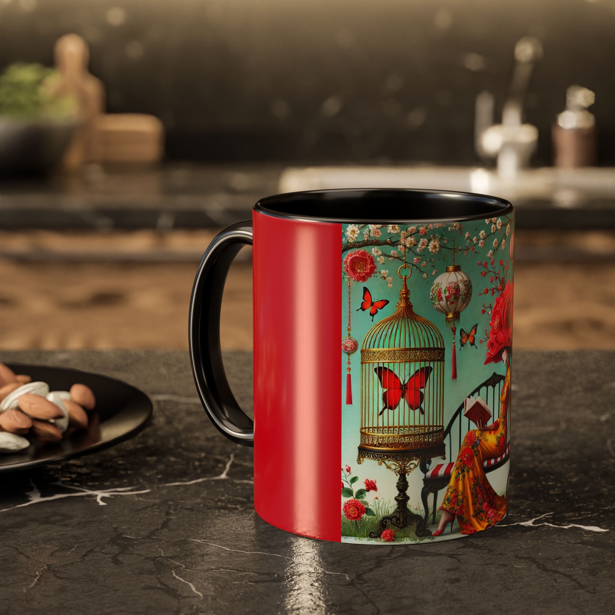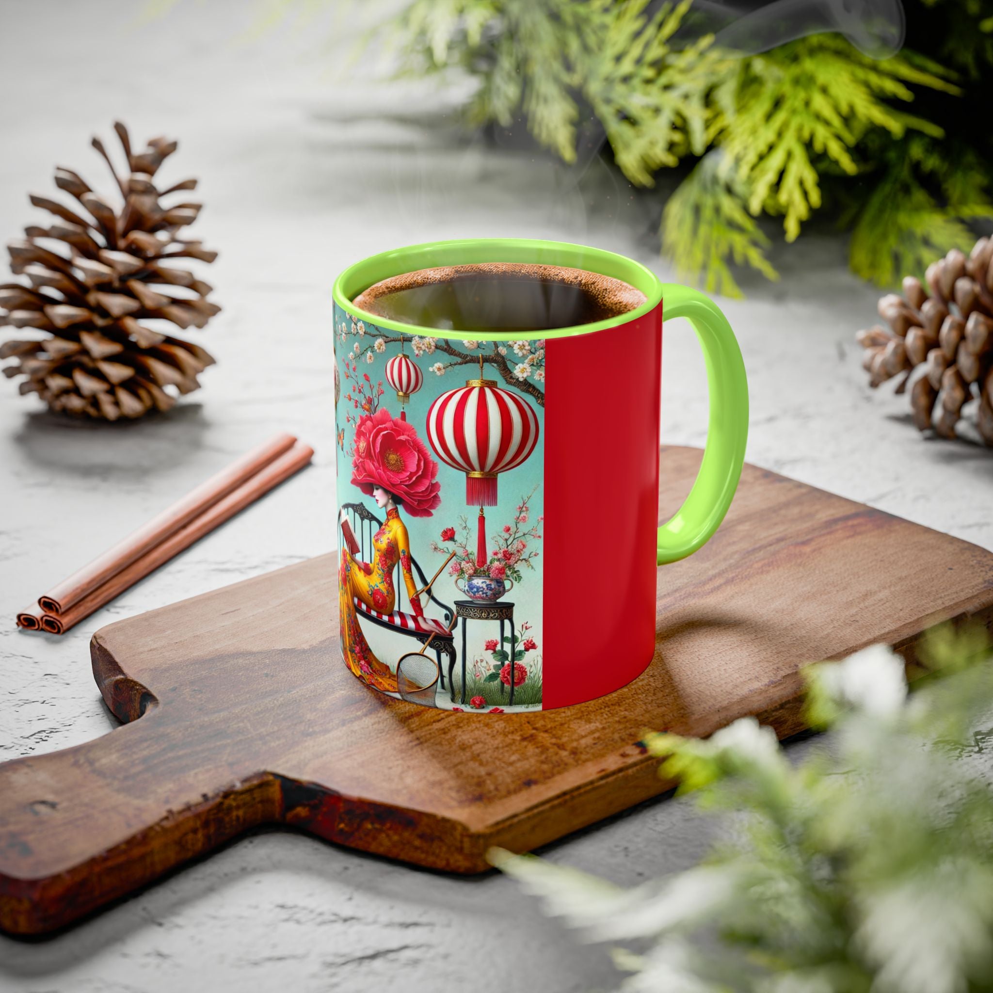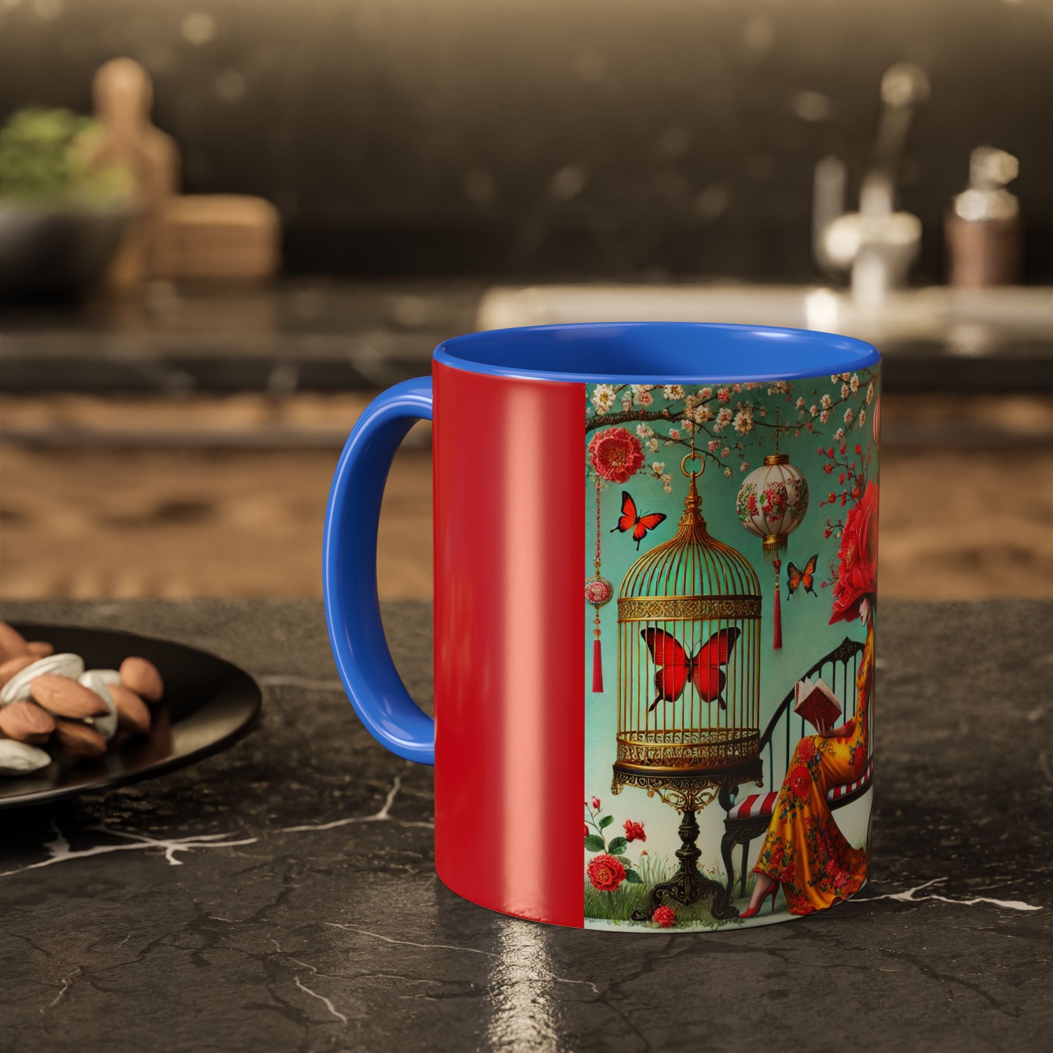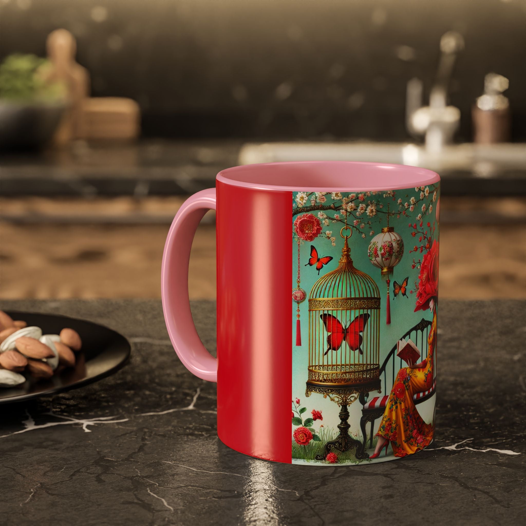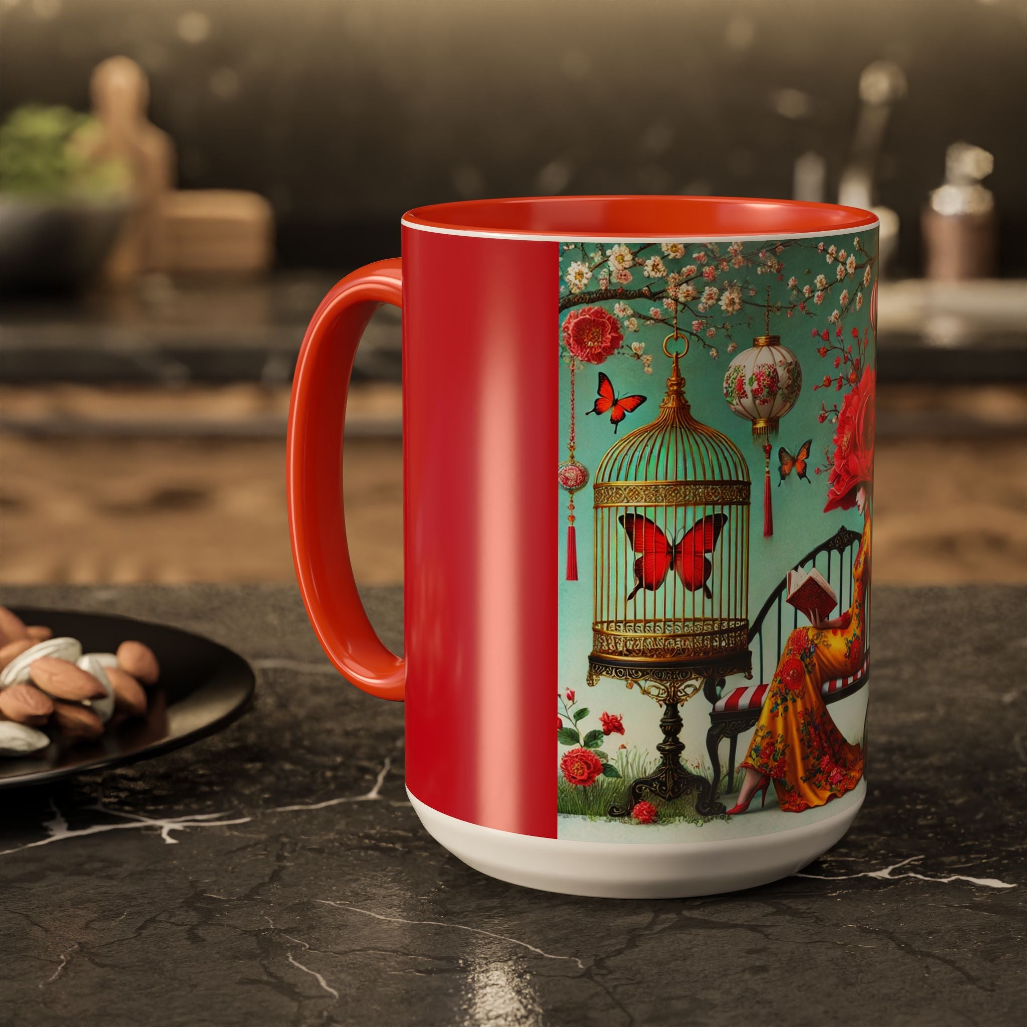 Reading in a Painted Garden turns every sip into a quiet, beautiful pause—featuring a graceful figure lost in a book beneath blooming branches, floating lanterns, and drifting butterflies. Turquoise skies, warm florals, and delicate gold-toned details create a serene, storybook atmosphere that feels curated and calm. With 12 accent colors to choose from and two generous sizes, this glossy ceramic mug is a cheerful everyday staple that also makes a thoughtful gift for readers, art lovers, and anyone who enjoys a peaceful moment.