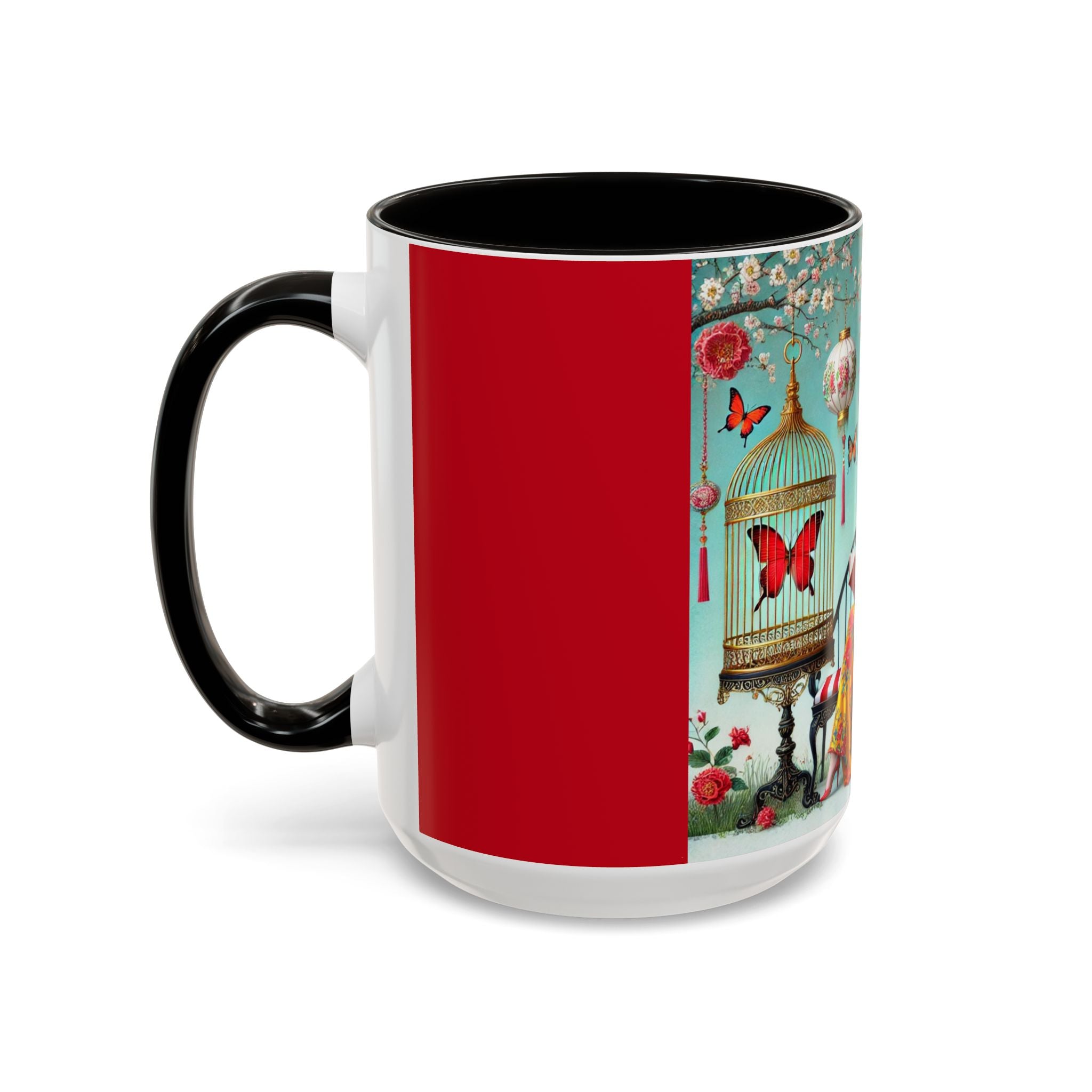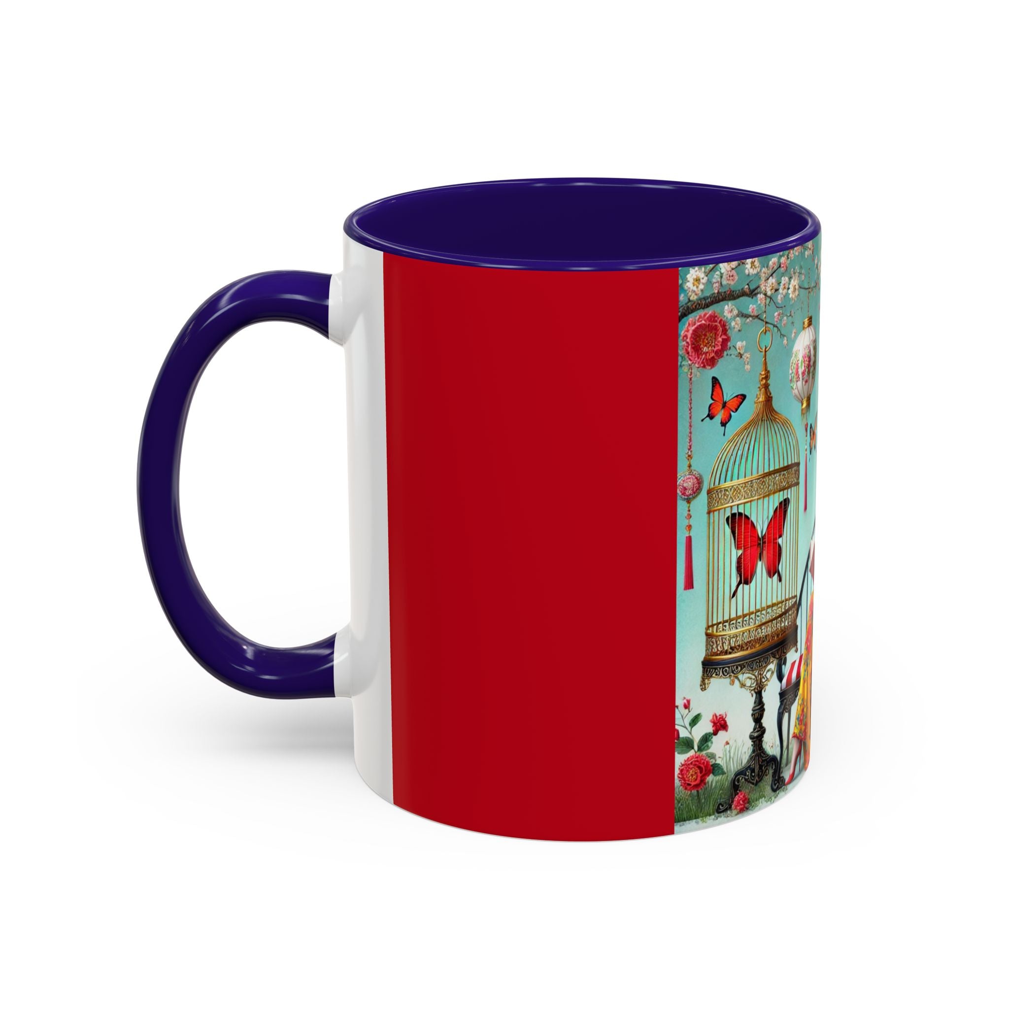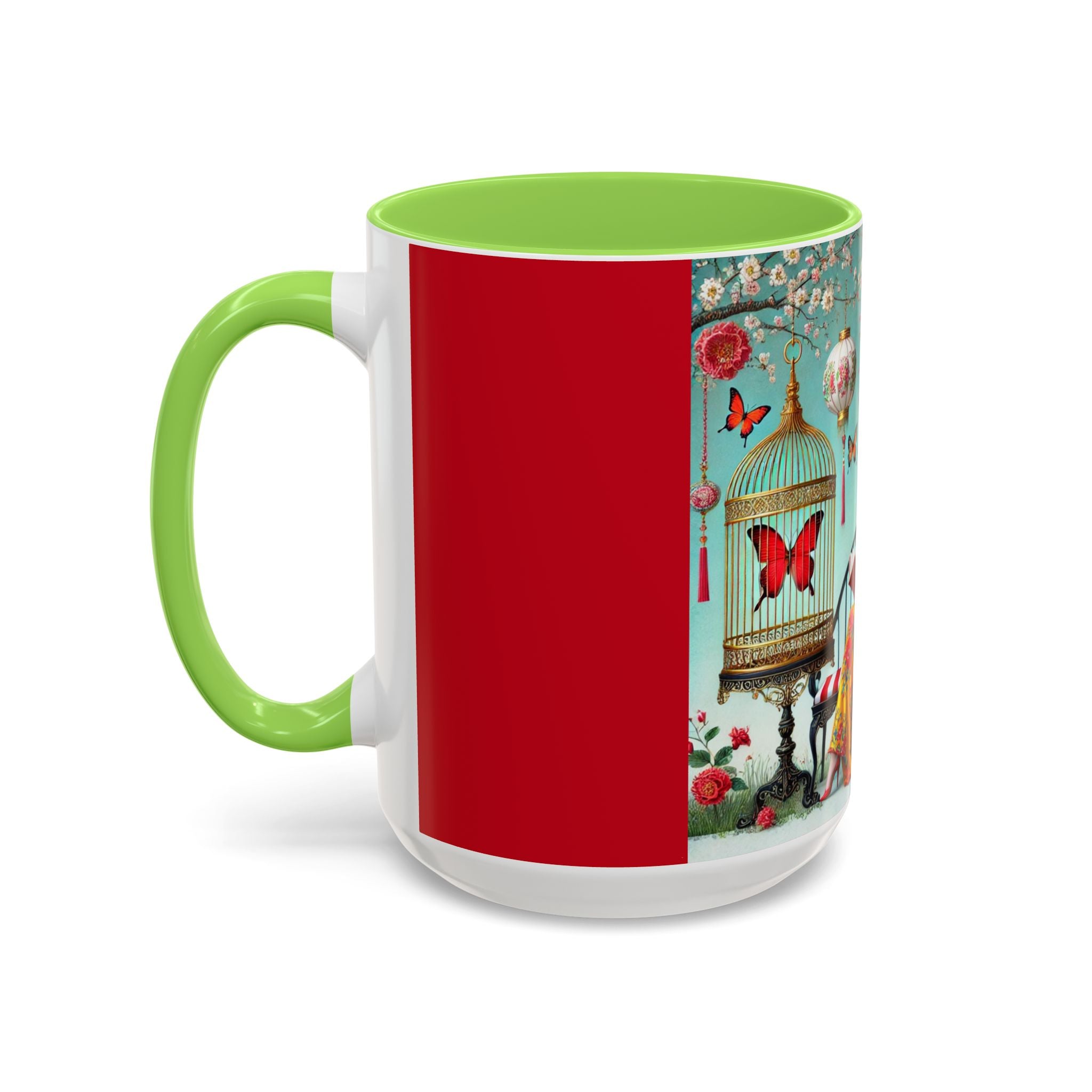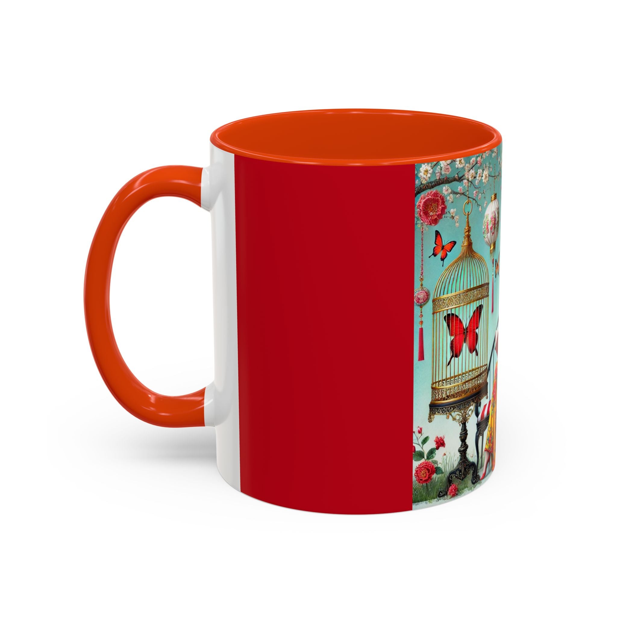 Reading in a Painted Garden turns every sip into a quiet, beautiful pause—featuring a graceful figure lost in a book beneath blooming branches, floating lanterns, and drifting butterflies. Turquoise skies, warm florals, and delicate gold-toned details create a serene, storybook atmosphere that feels curated and calm. With 12 accent colors to choose from and two generous sizes, this glossy ceramic mug is a cheerful everyday staple that also makes a thoughtful gift for readers, art lovers, and anyone who enjoys a peaceful moment.