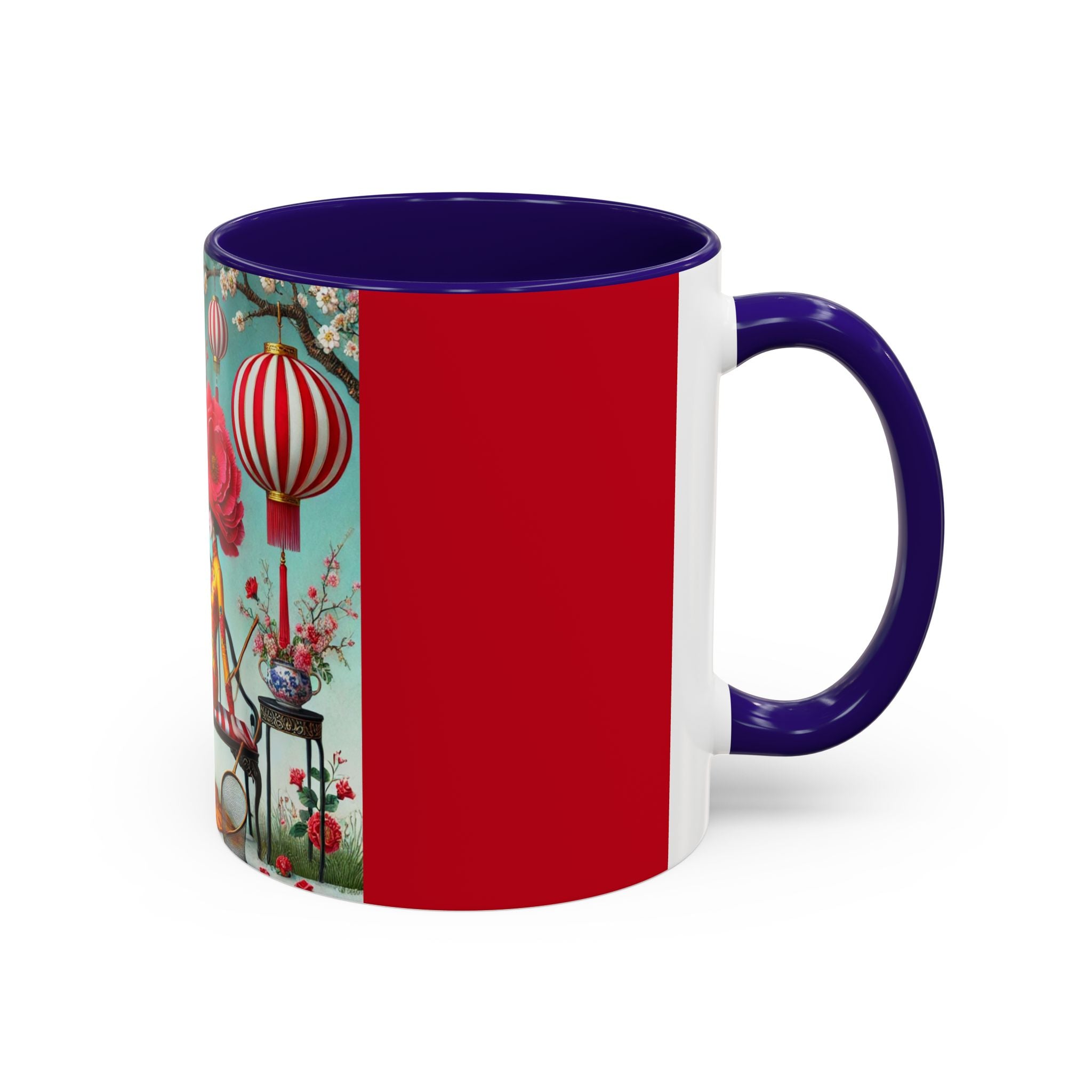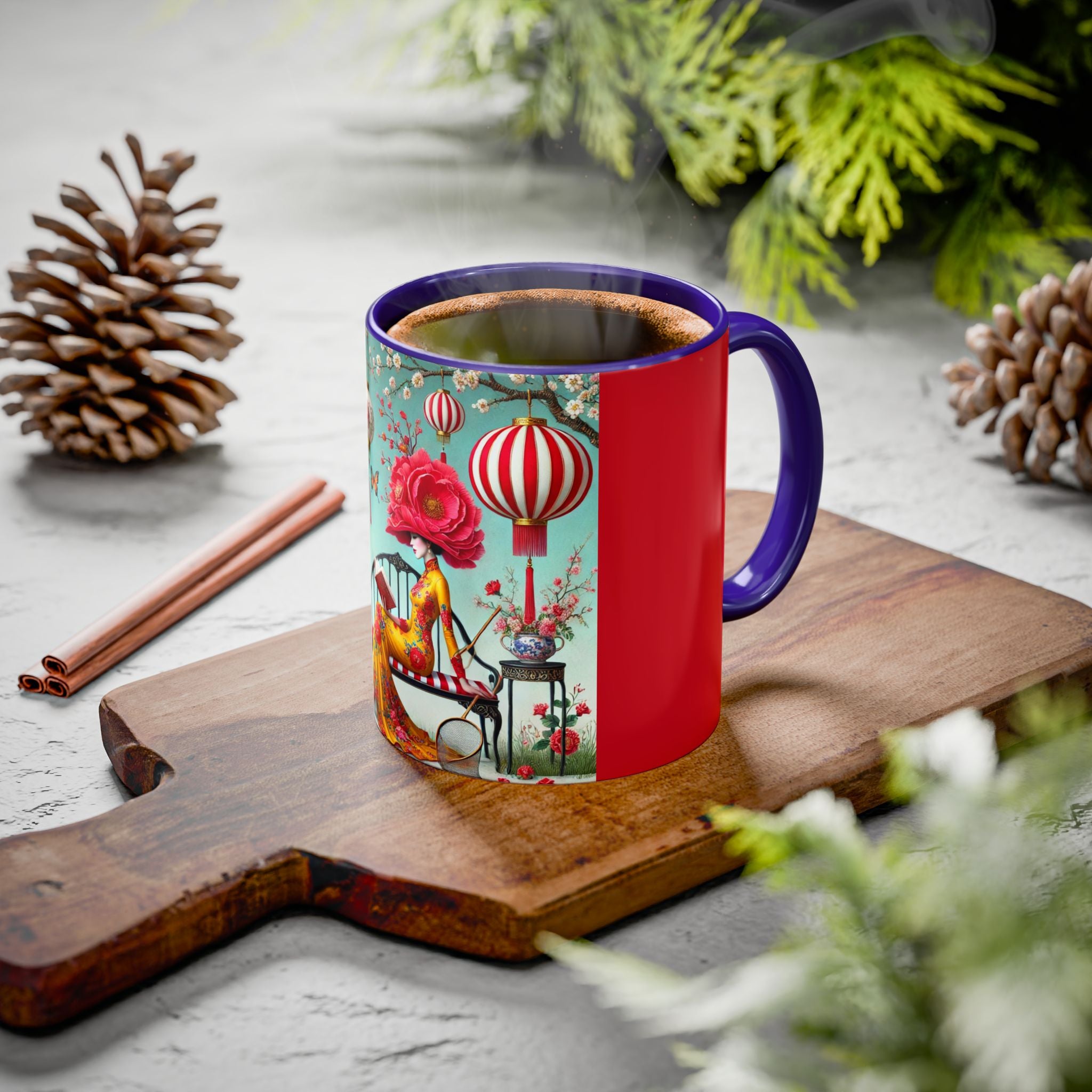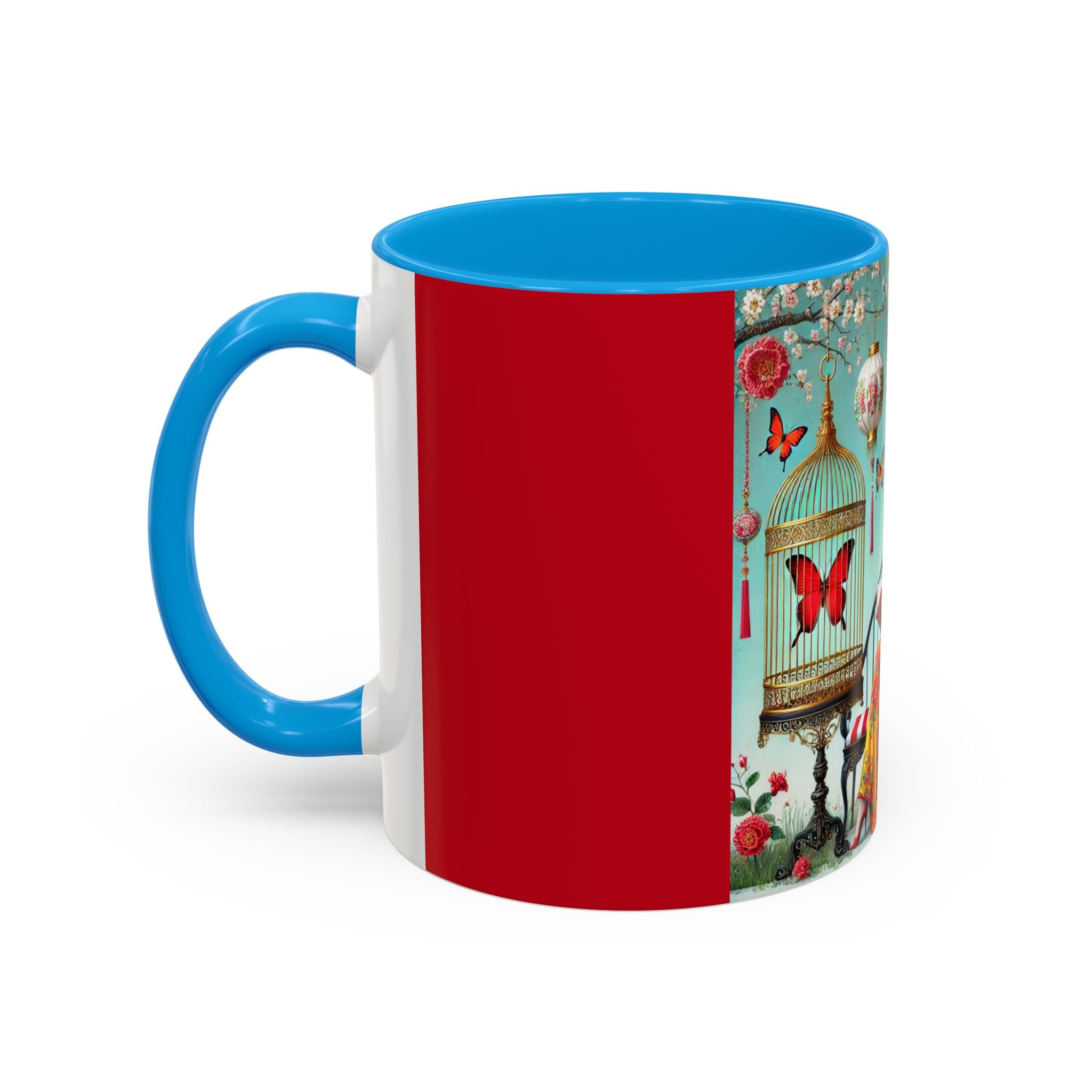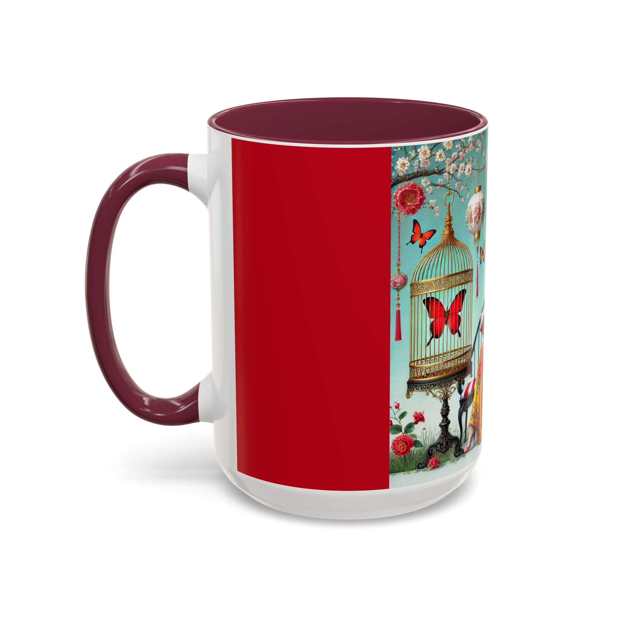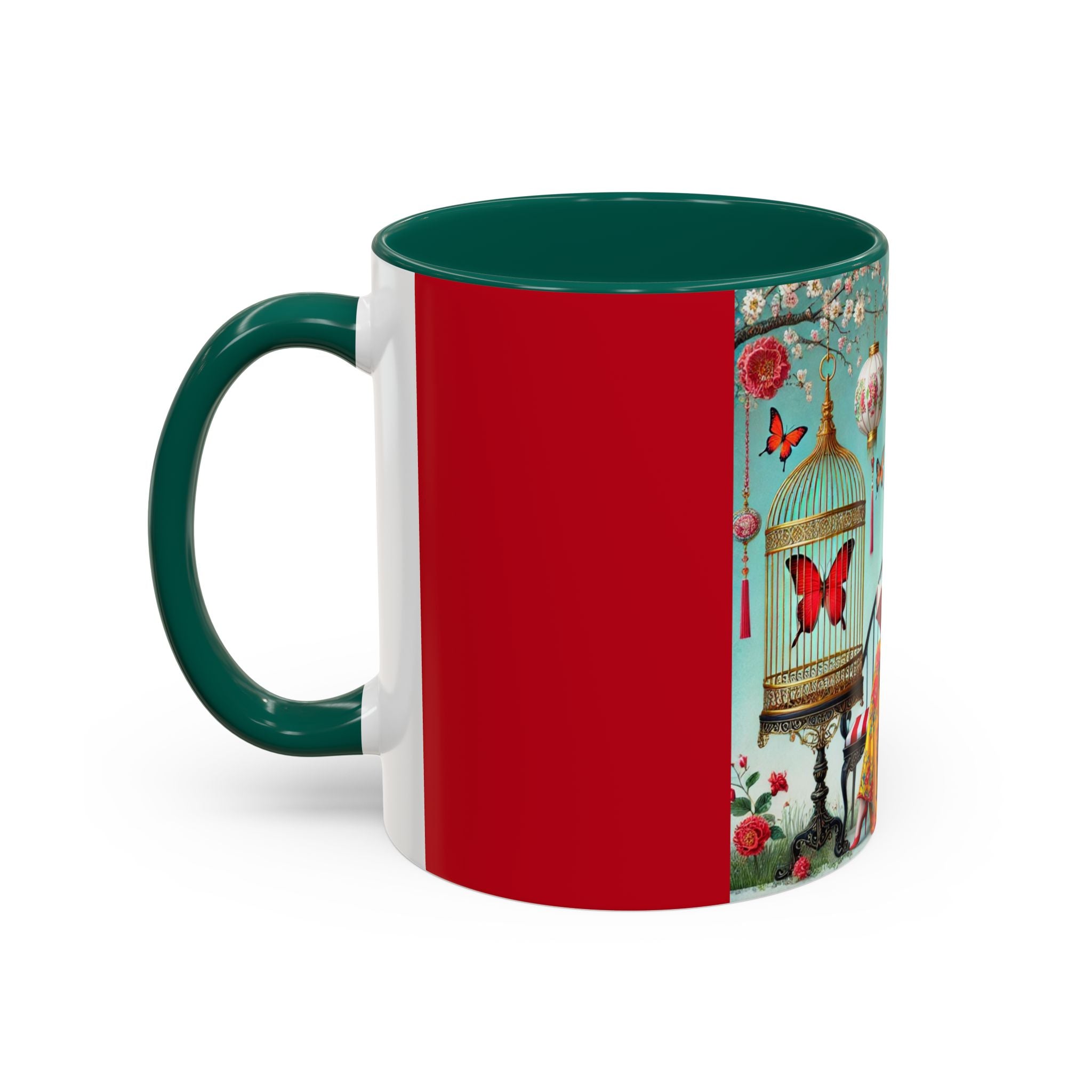 Reading in a Painted Garden turns every sip into a quiet, beautiful pause—featuring a graceful figure lost in a book beneath blooming branches, floating lanterns, and drifting butterflies. Turquoise skies, warm florals, and delicate gold-toned details create a serene, storybook atmosphere that feels curated and calm. With 12 accent colors to choose from and two generous sizes, this glossy ceramic mug is a cheerful everyday staple that also makes a thoughtful gift for readers, art lovers, and anyone who enjoys a peaceful moment.