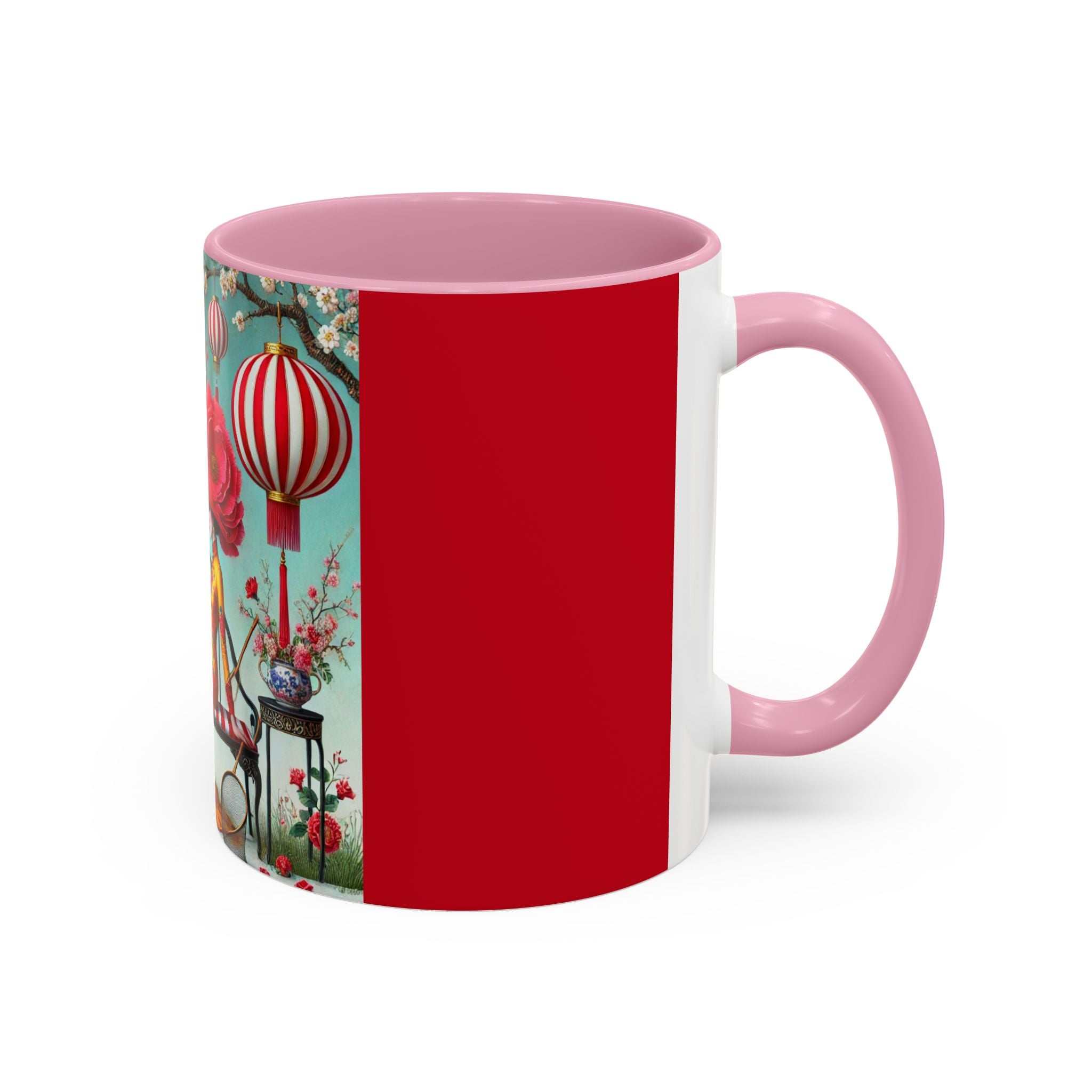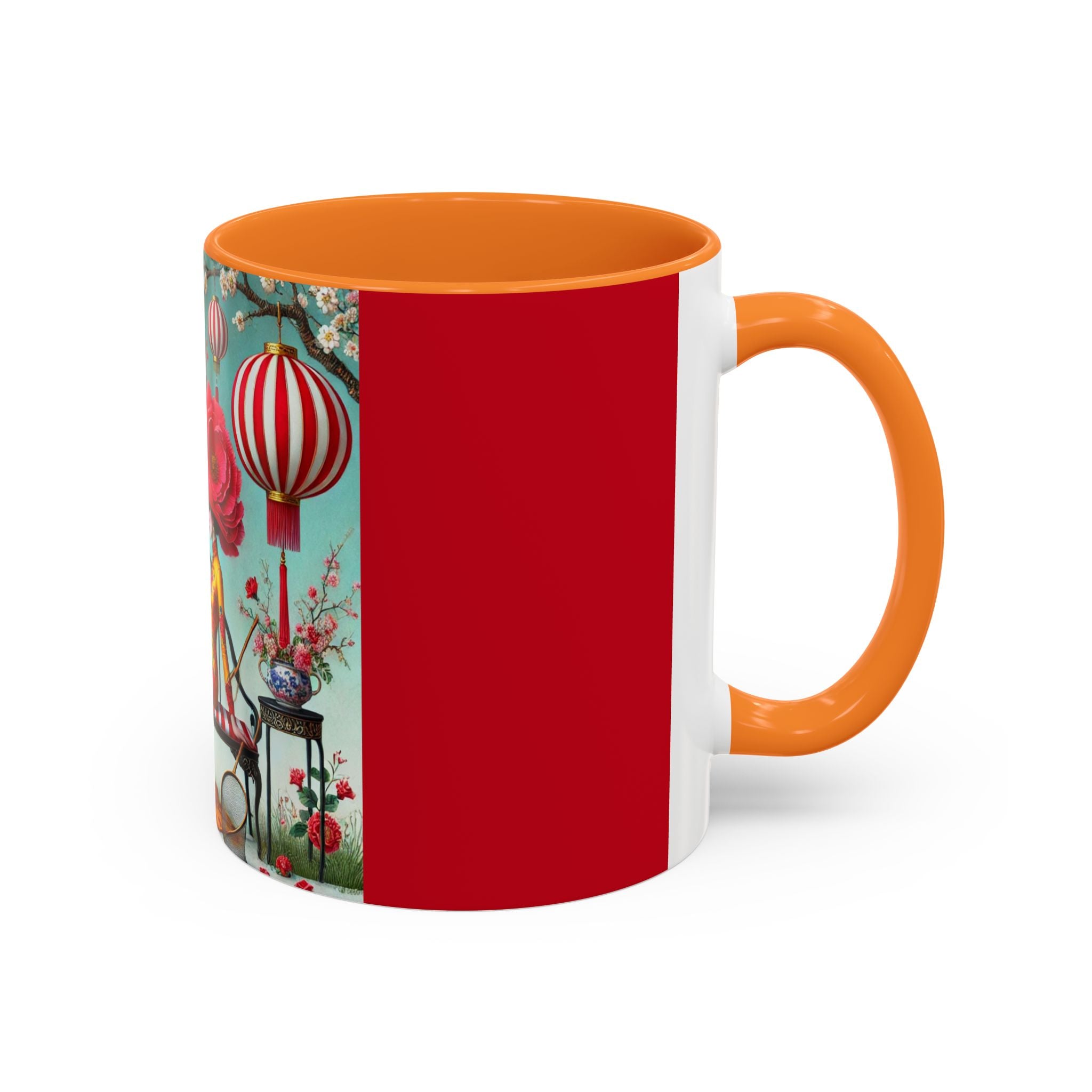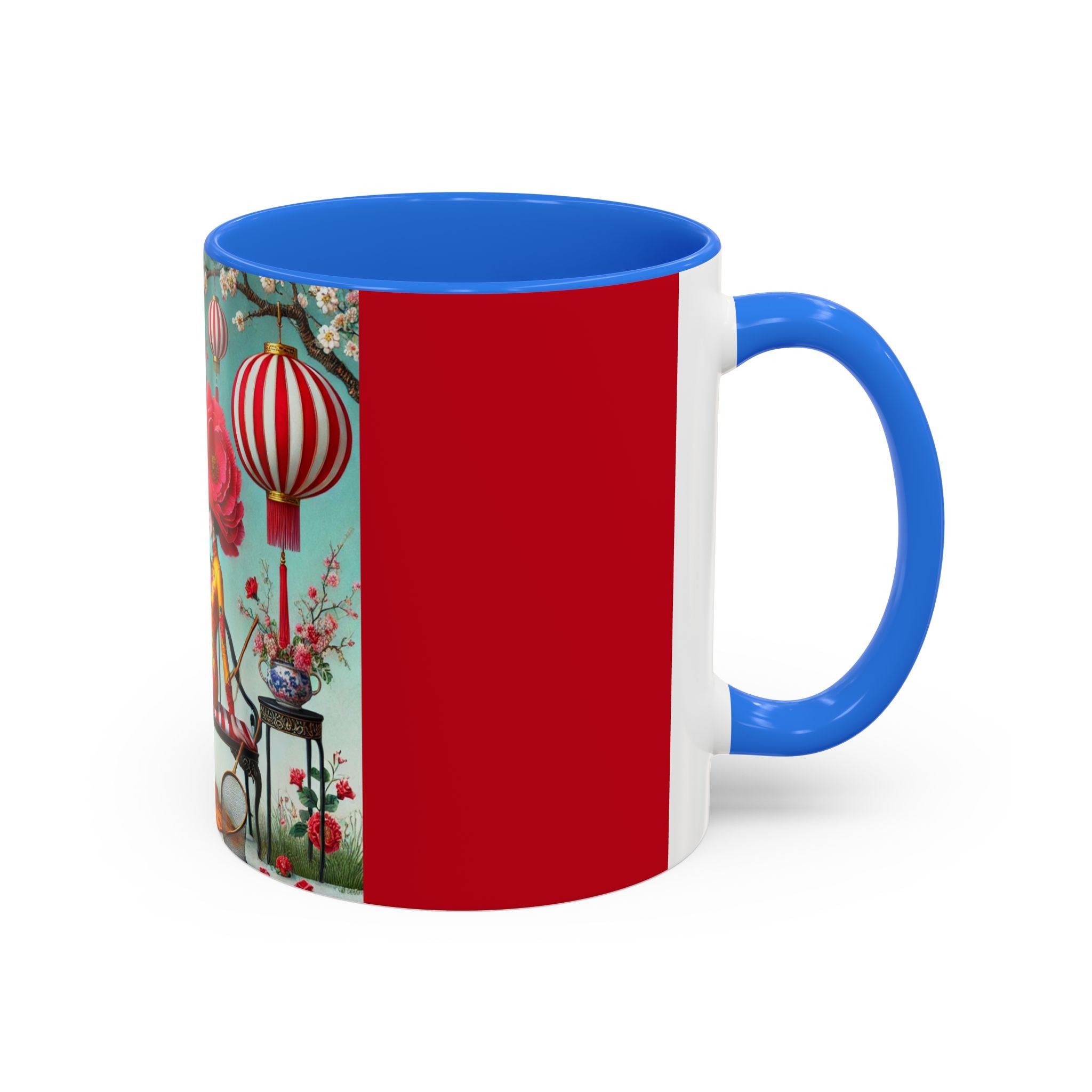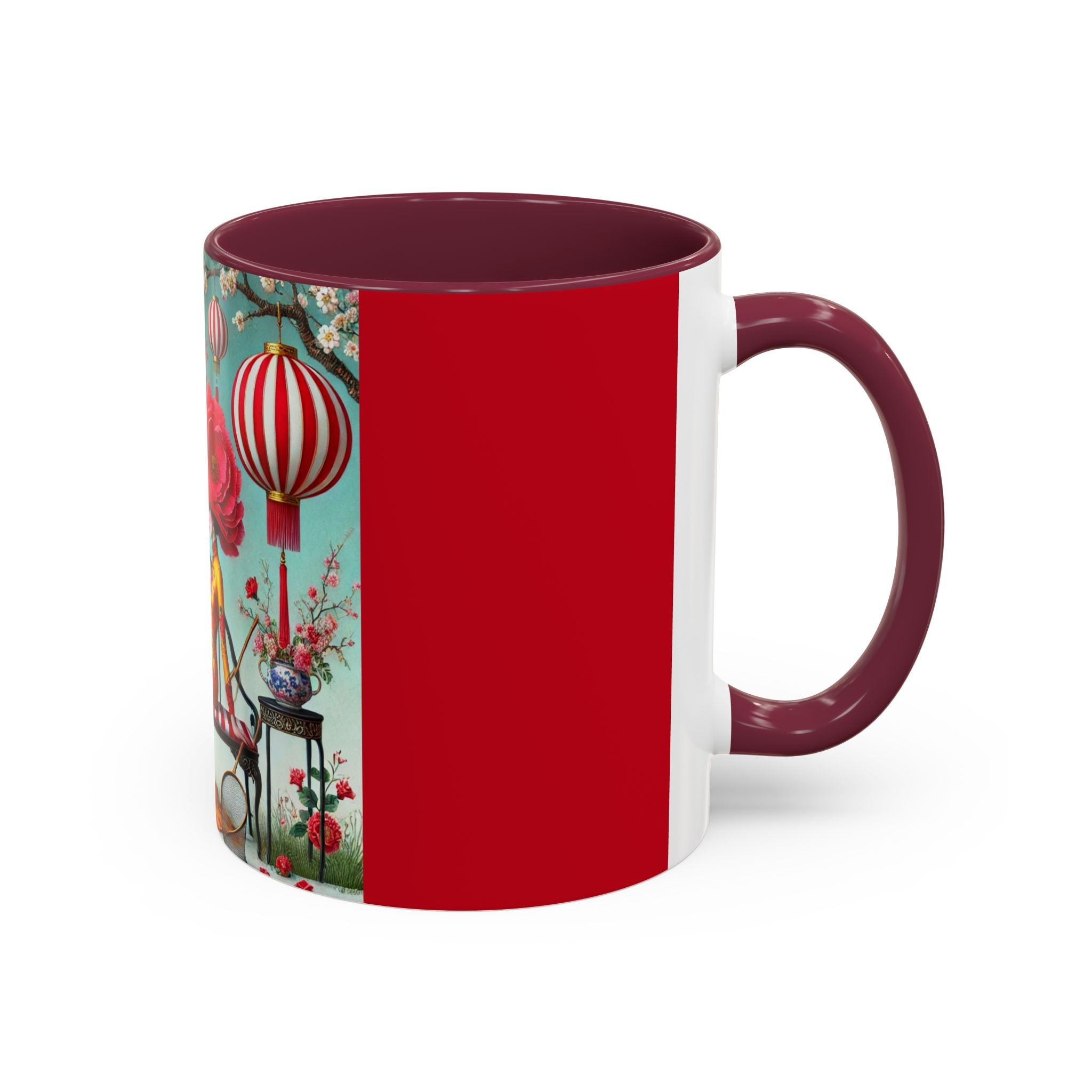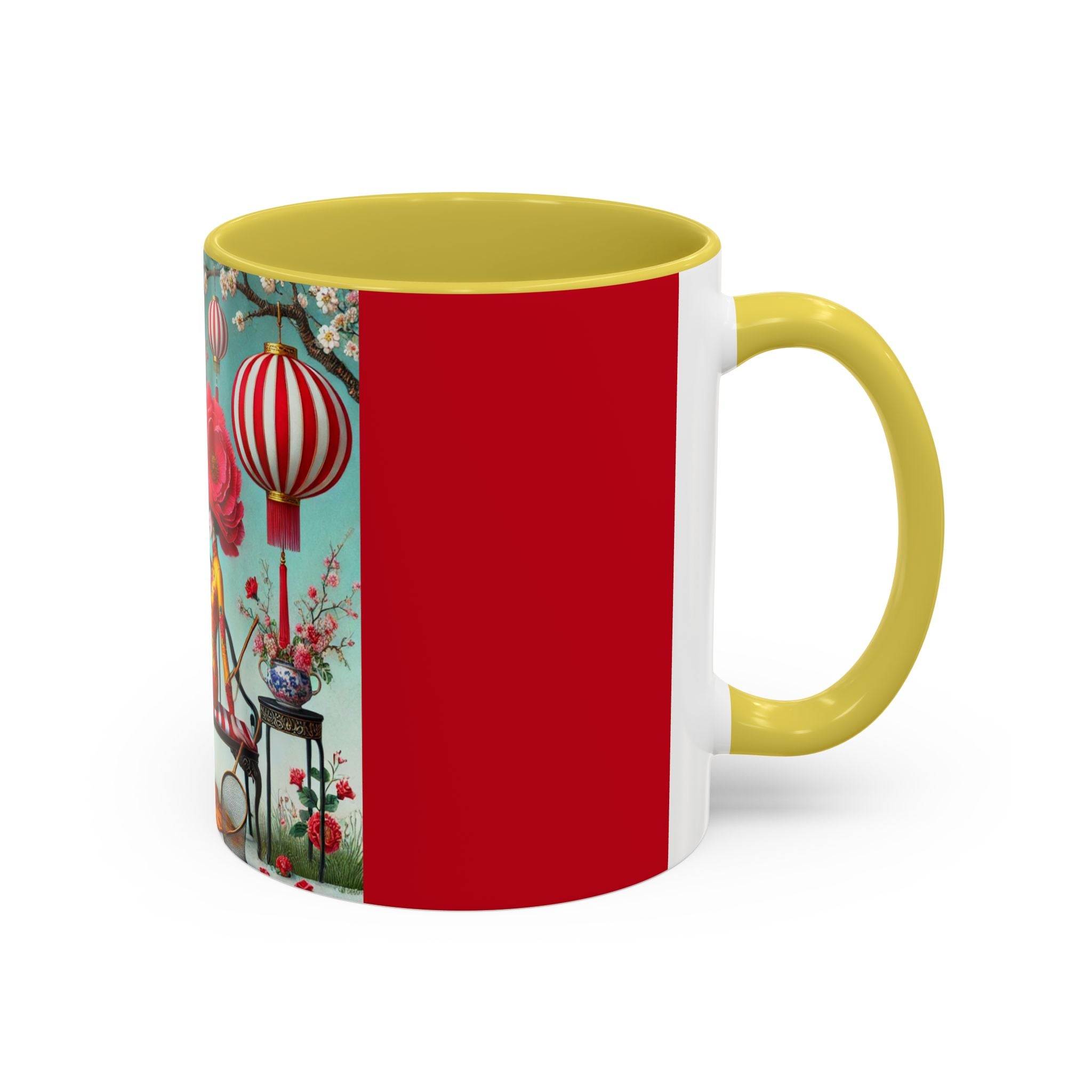 Reading in a Painted Garden turns every sip into a quiet, beautiful pause—featuring a graceful figure lost in a book beneath blooming branches, floating lanterns, and drifting butterflies. Turquoise skies, warm florals, and delicate gold-toned details create a serene, storybook atmosphere that feels curated and calm. With 12 accent colors to choose from and two generous sizes, this glossy ceramic mug is a cheerful everyday staple that also makes a thoughtful gift for readers, art lovers, and anyone who enjoys a peaceful moment.